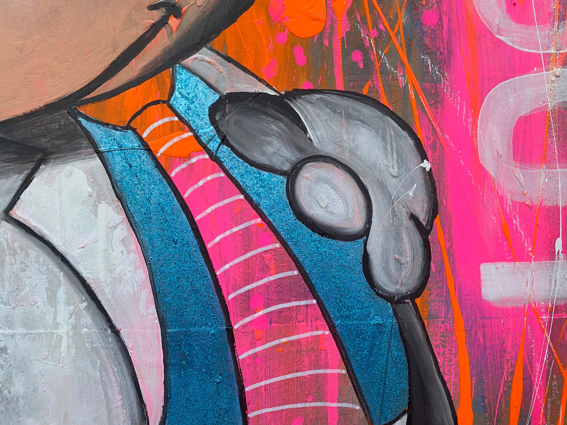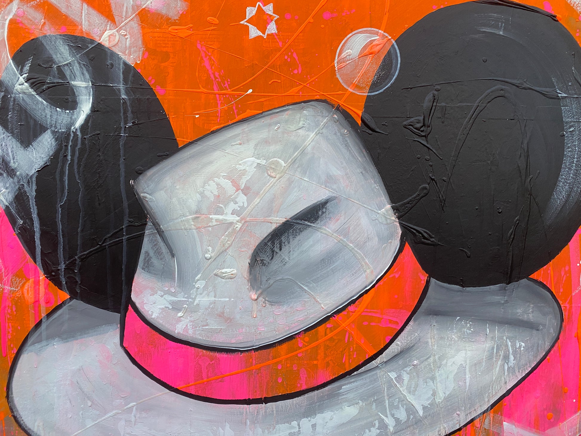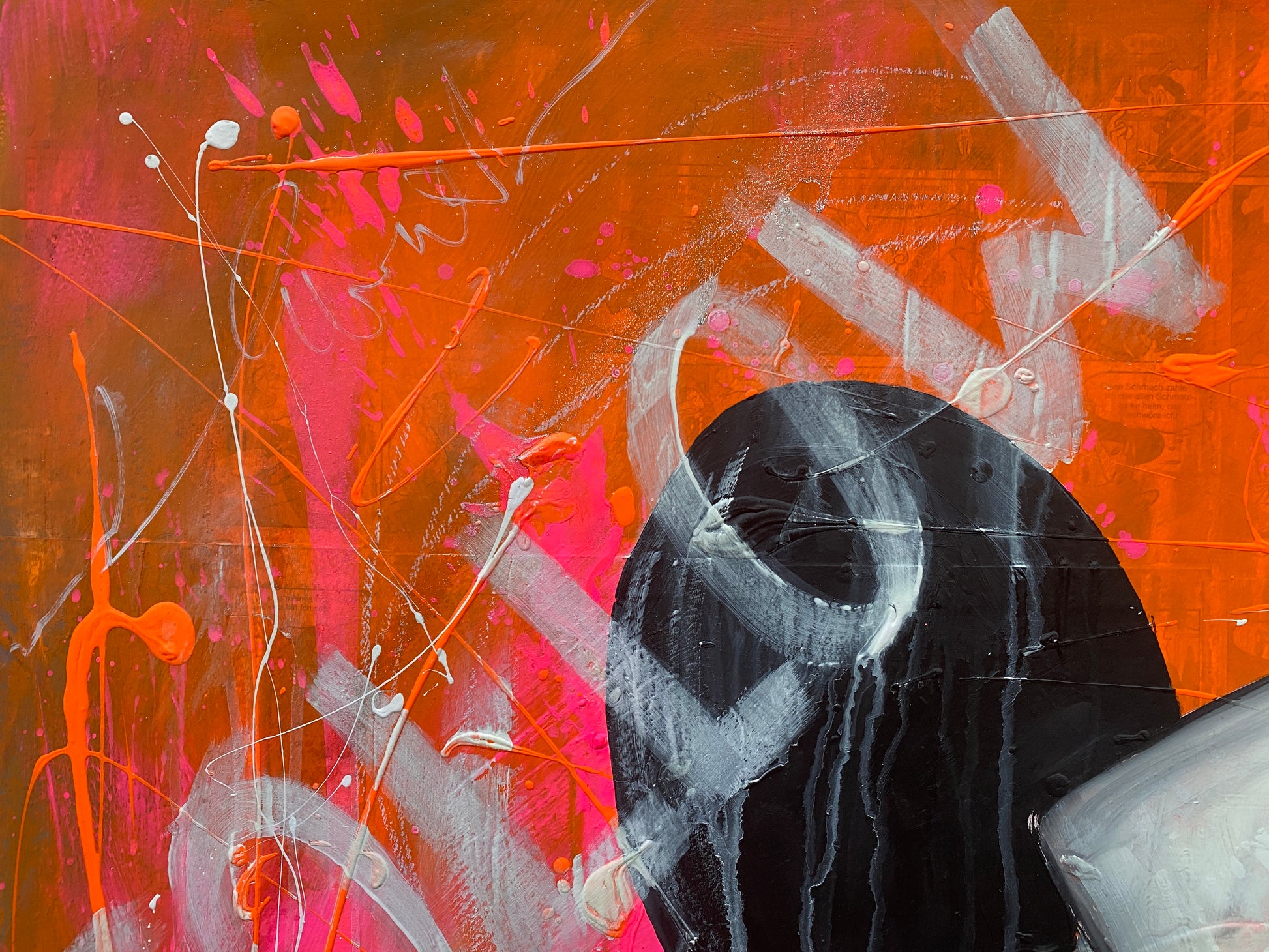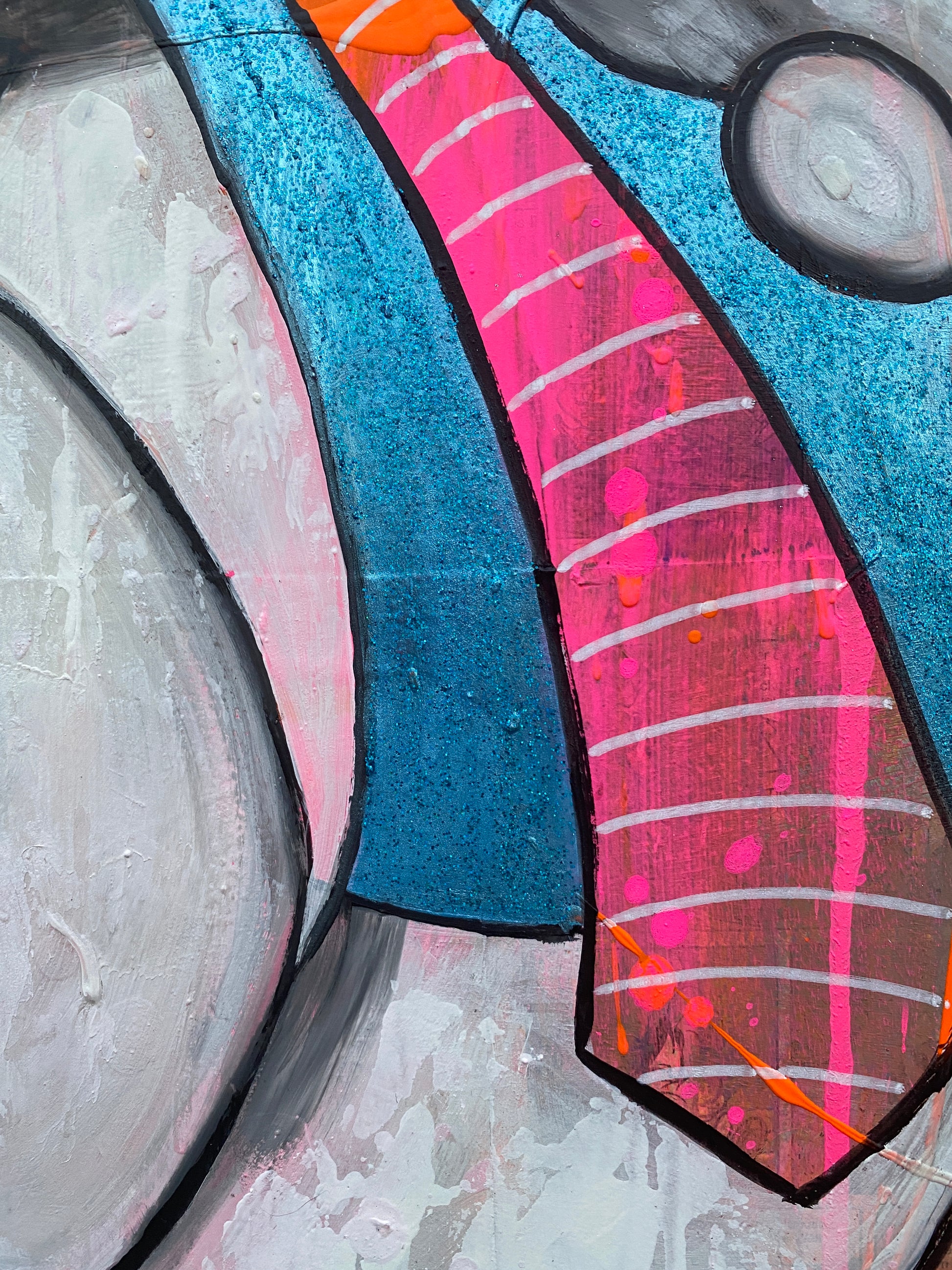 Die Leinwand wurde mit einzelnen Seiten eines Comic-Buches versehen. So entstand ein interessanter Untergrund, denn die einzelnen Comicseiten sind zum Teil gut zu sehen oder schimmern noch etwas durch. Durch die zum Teil welligen Seiten entstand zusätzlich eine interessante Struktur, der Pop-Art Stil in seinen grellen Farben rundet das Ganze ab.