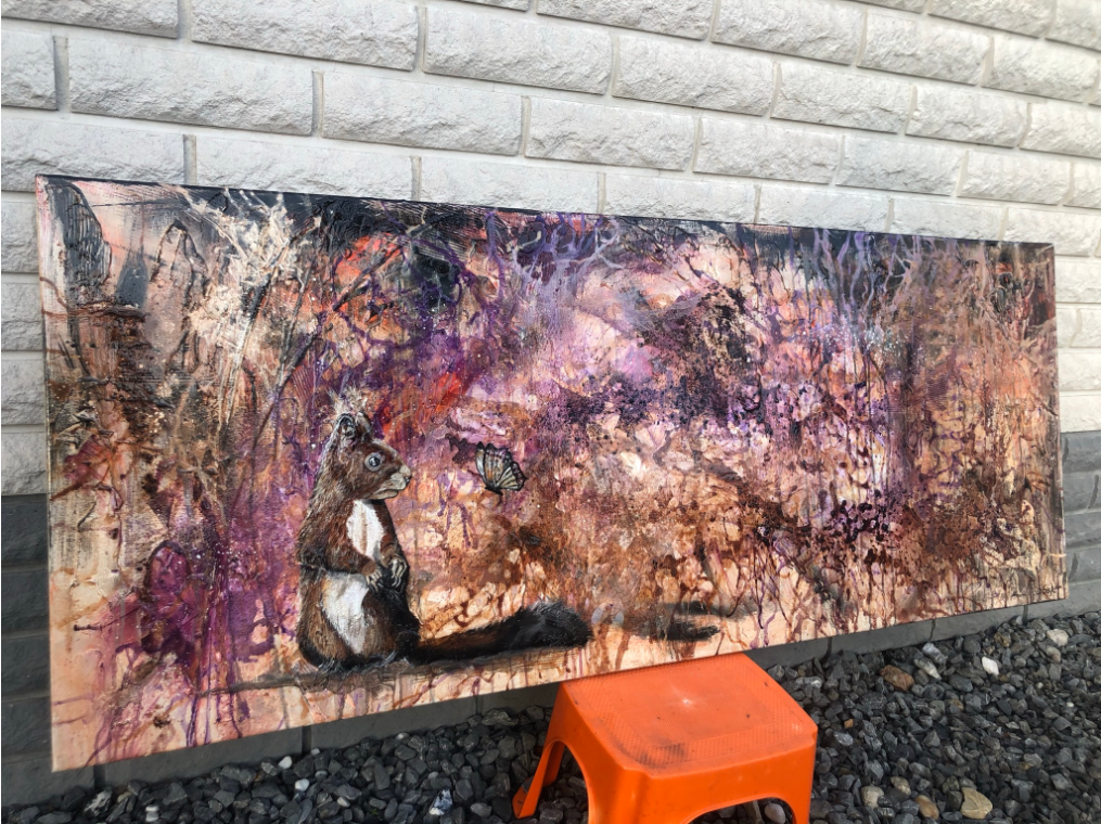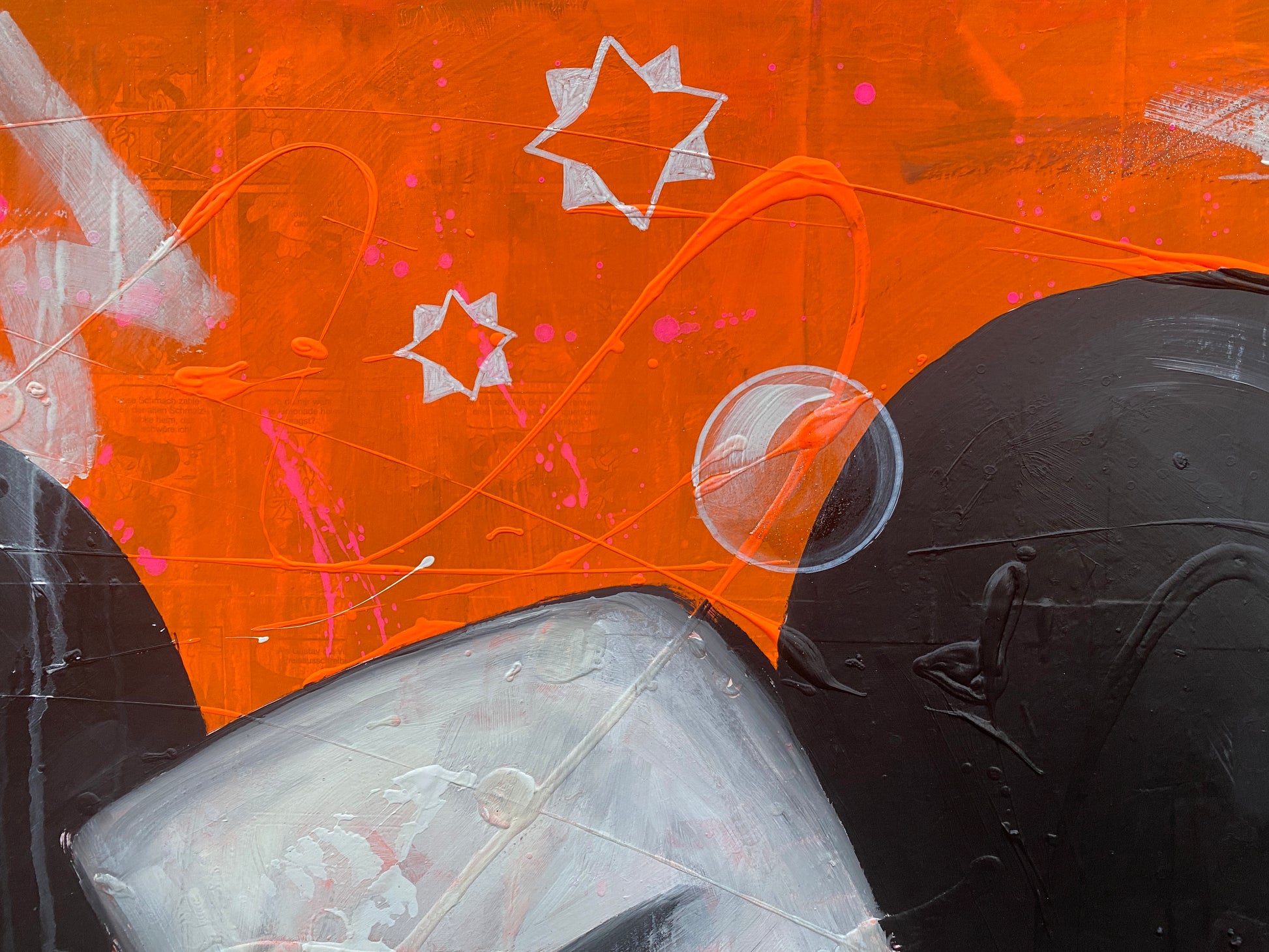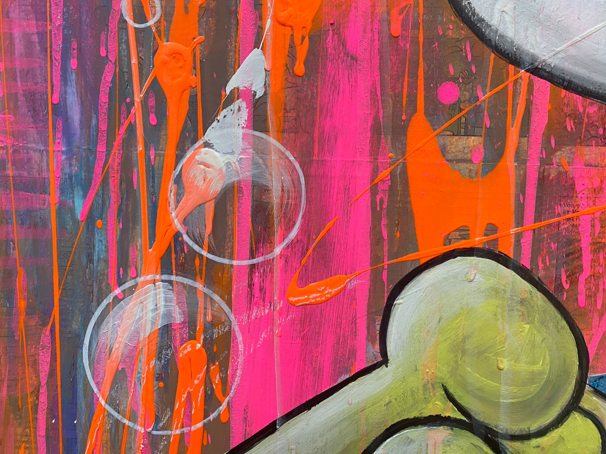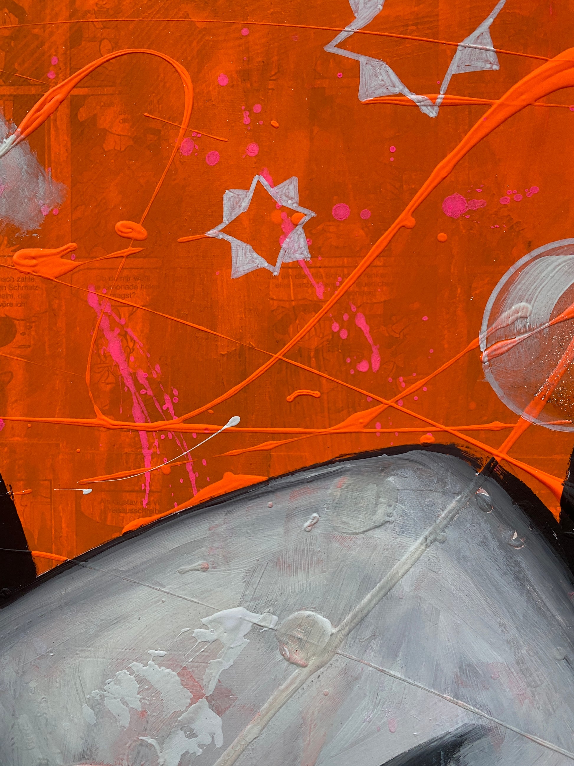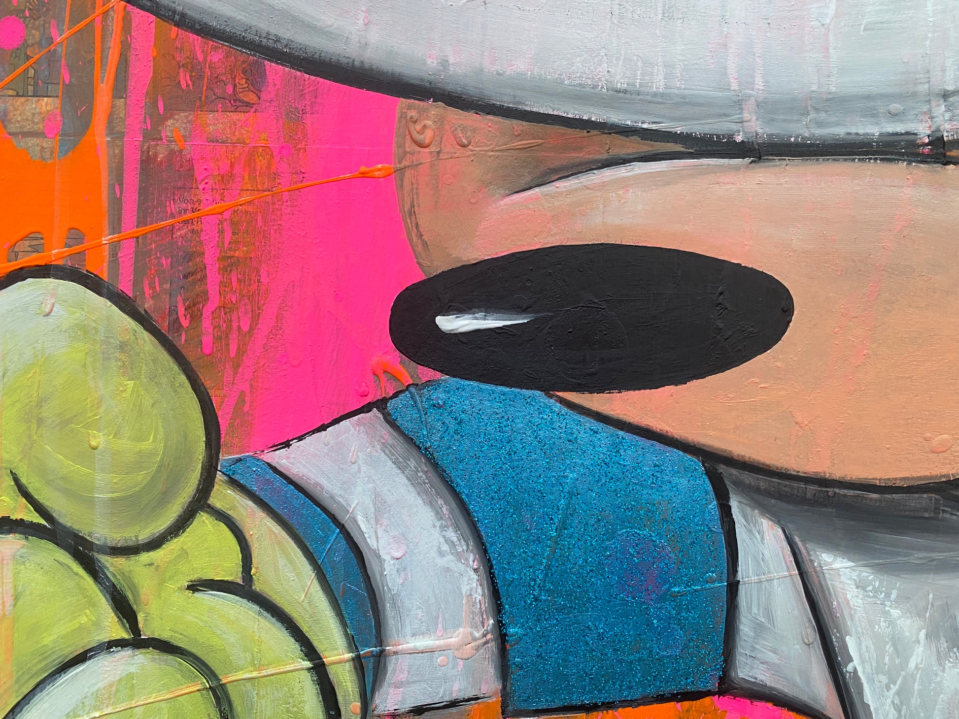 Die Leinwand wurde mit einzelnen Seiten eines Comic-Buches versehen. So entstand ein interessanter Untergrund, denn die einzelnen Comicseiten sind zum Teil gut zu sehen oder schimmern noch etwas durch. Durch die zum Teil welligen Seiten entstand zusätzlich eine interessante Struktur, der Pop-Art Stil in seinen grellen Farben rundet das Ganze ab.