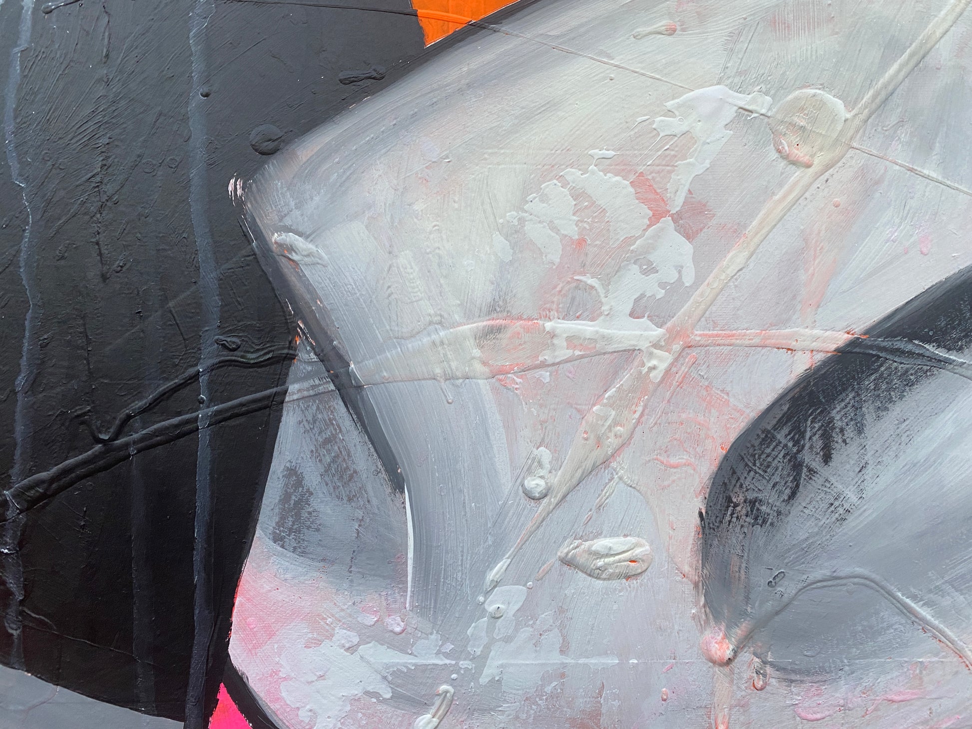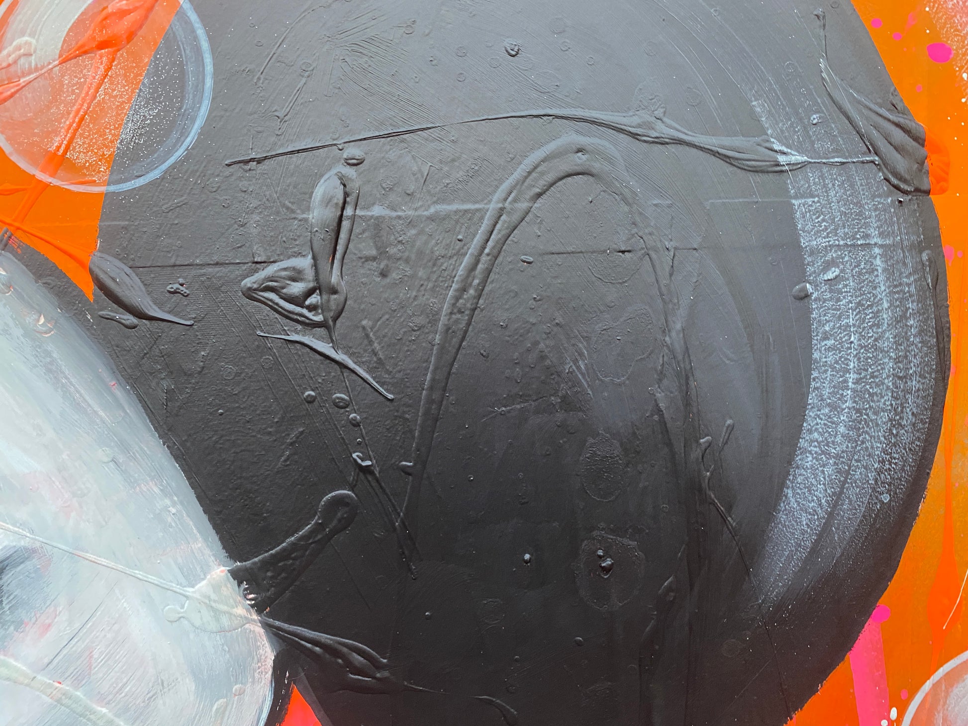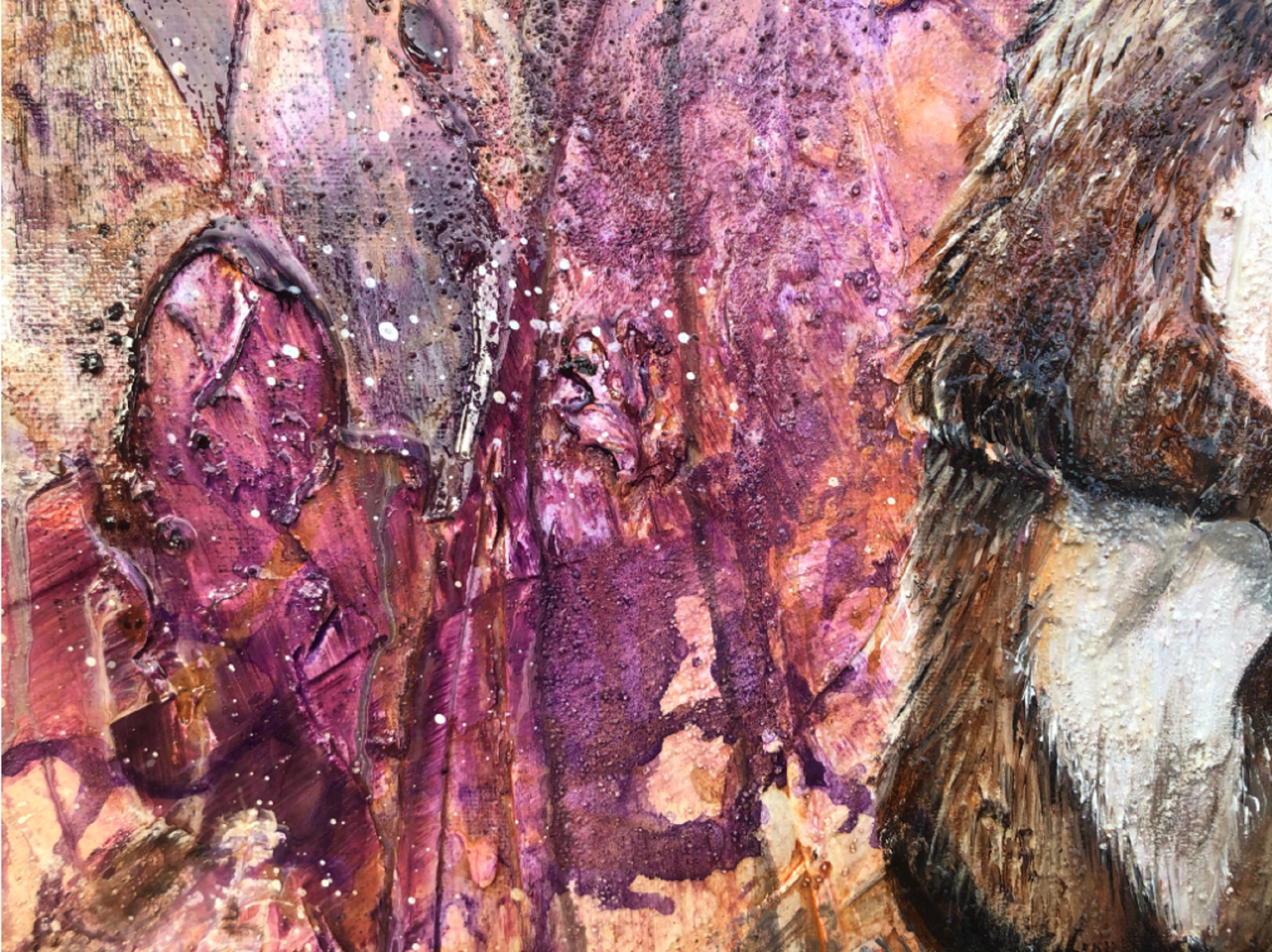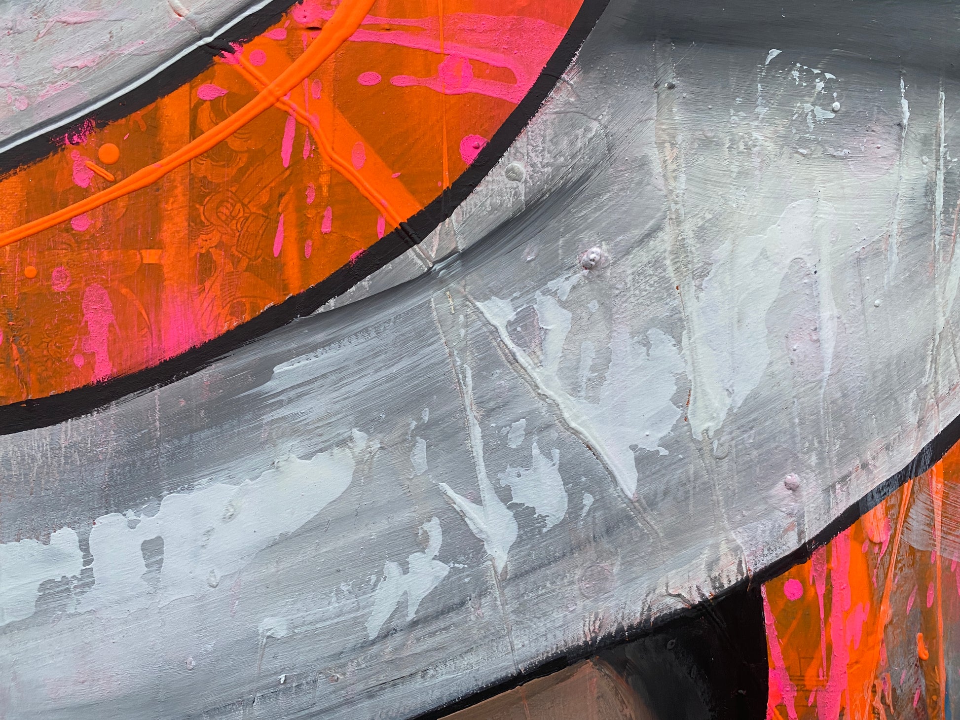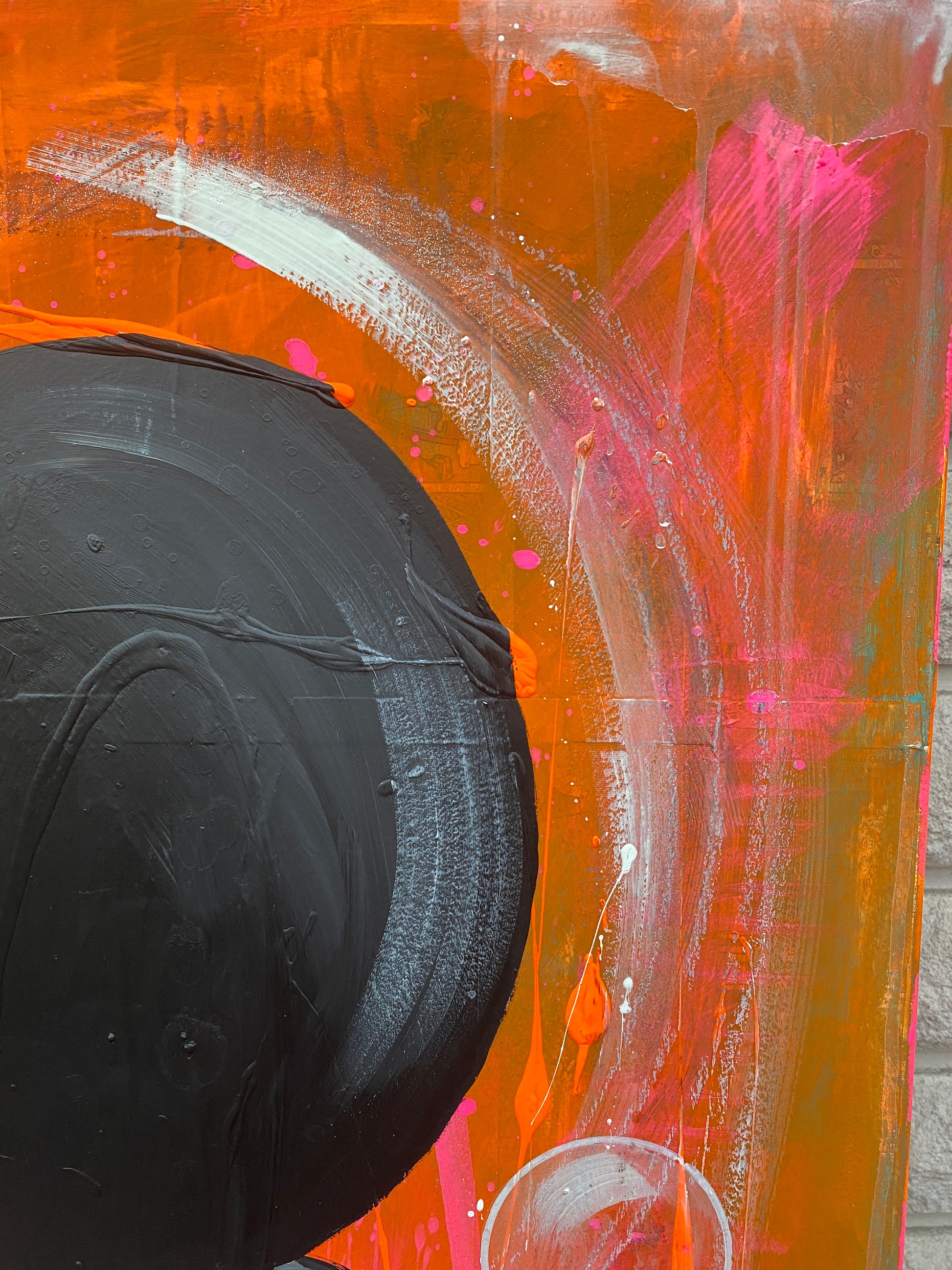 Die Leinwand wurde mit einzelnen Seiten eines Comic-Buches versehen. So entstand ein interessanter Untergrund, denn die einzelnen Comicseiten sind zum Teil gut zu sehen oder schimmern noch etwas durch. Durch die zum Teil welligen Seiten entstand zusätzlich eine interessante Struktur, der Pop-Art Stil in seinen grellen Farben rundet das Ganze ab.