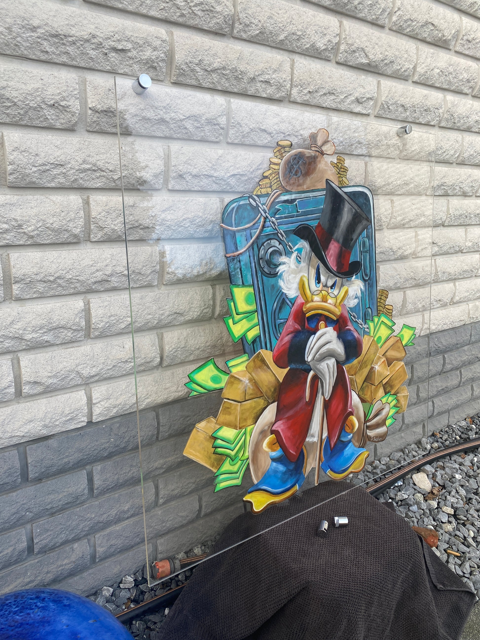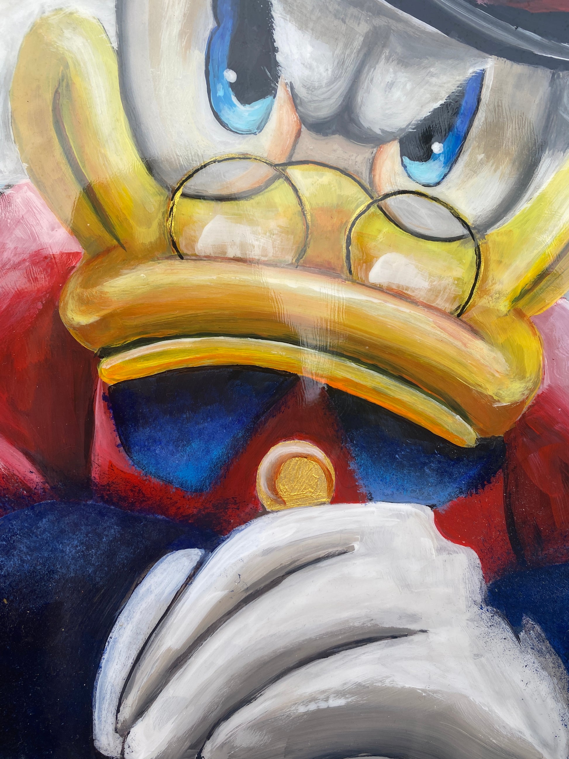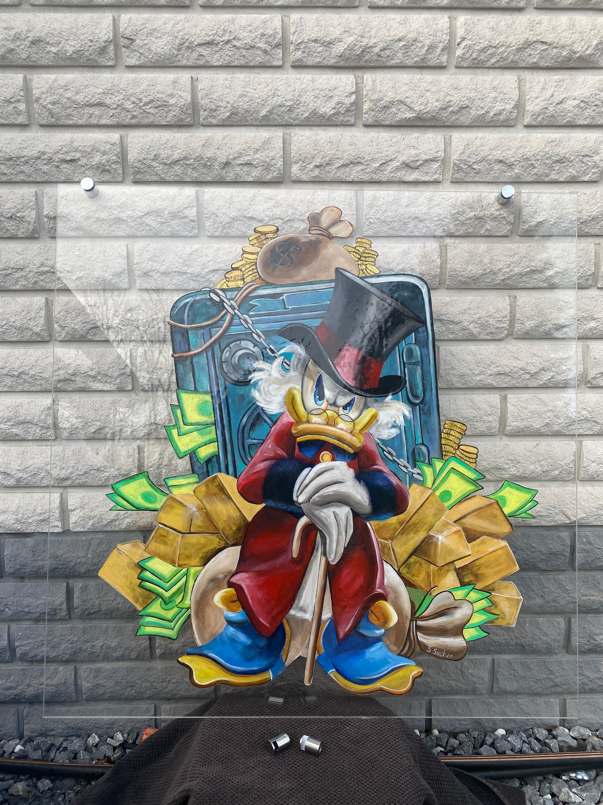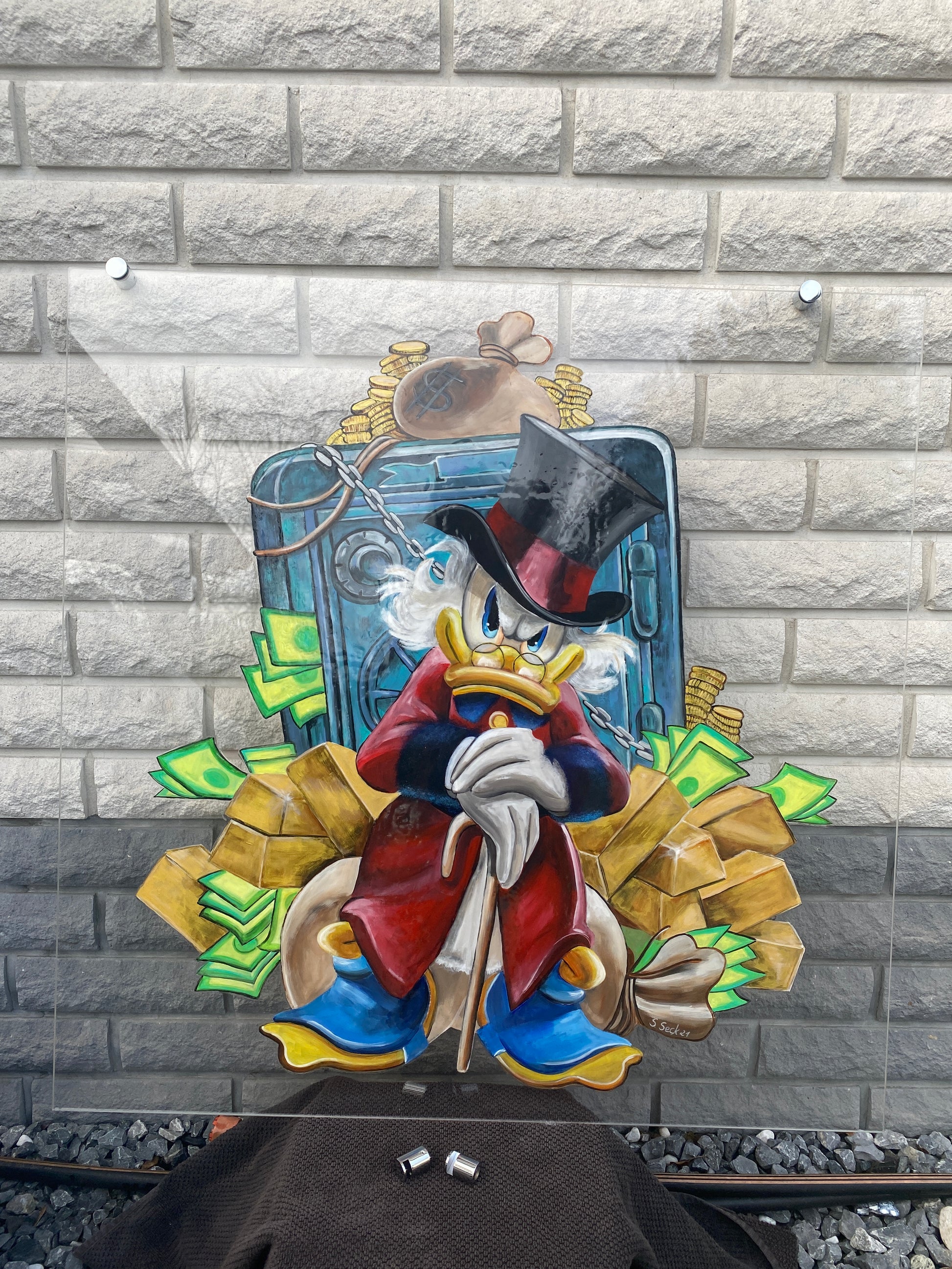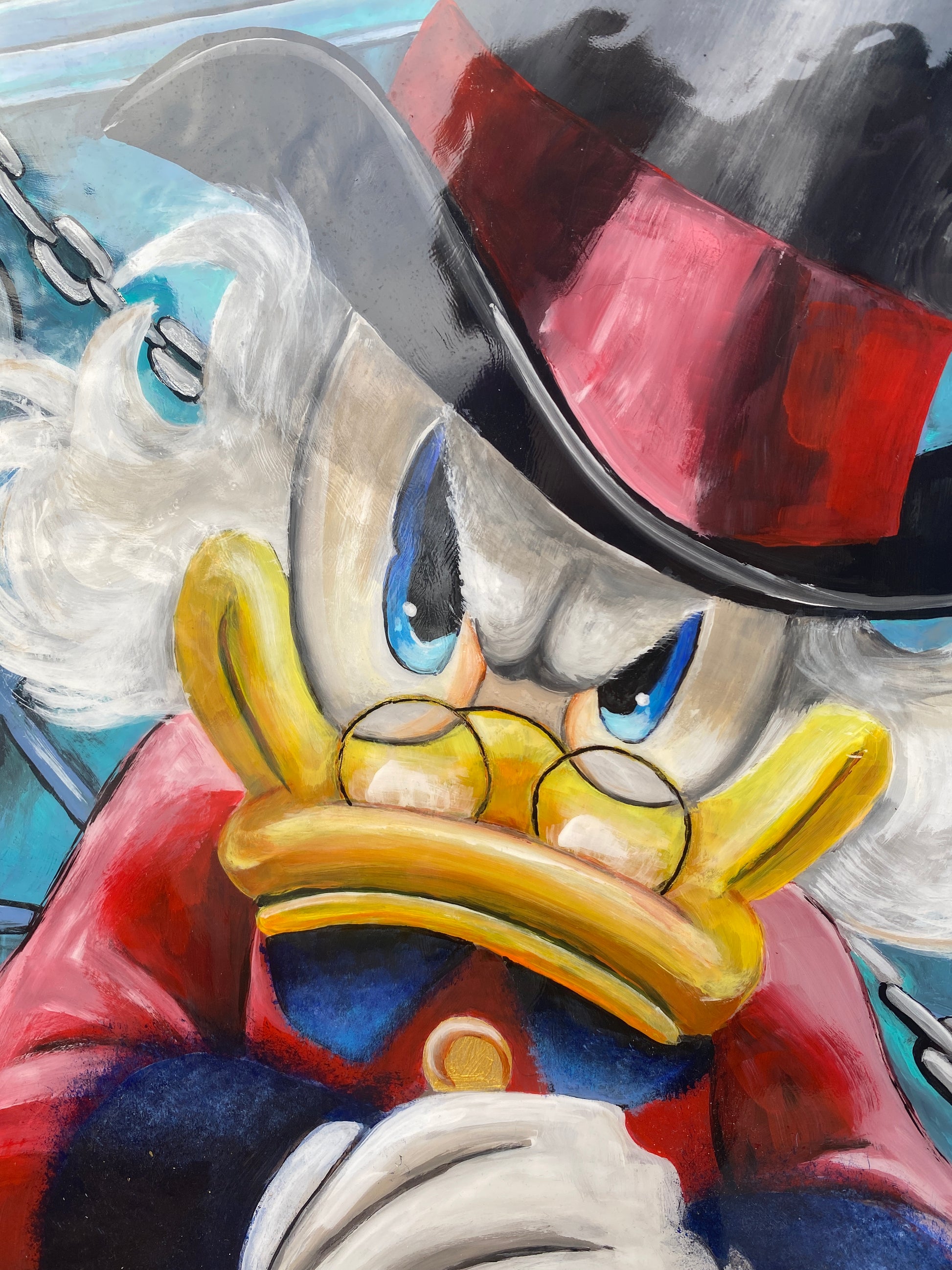 Gearbeitet wurde hier mit Acryl auf einer 0,5 mm starken, verzugsfreien und UV-beständigen Acrylglasplatte. Das Motiv wurde mehrfach mit Harz fixiert. Der Hintergrund ist durchsichtig, so wirkt die geizige Ente an jeder Wand anders. Aufgehangen wird sie mit Abstandshaltern (Klemmbefestigungen Messing poliert) mittels Schrauben an der Wand (sind inbegriffen).