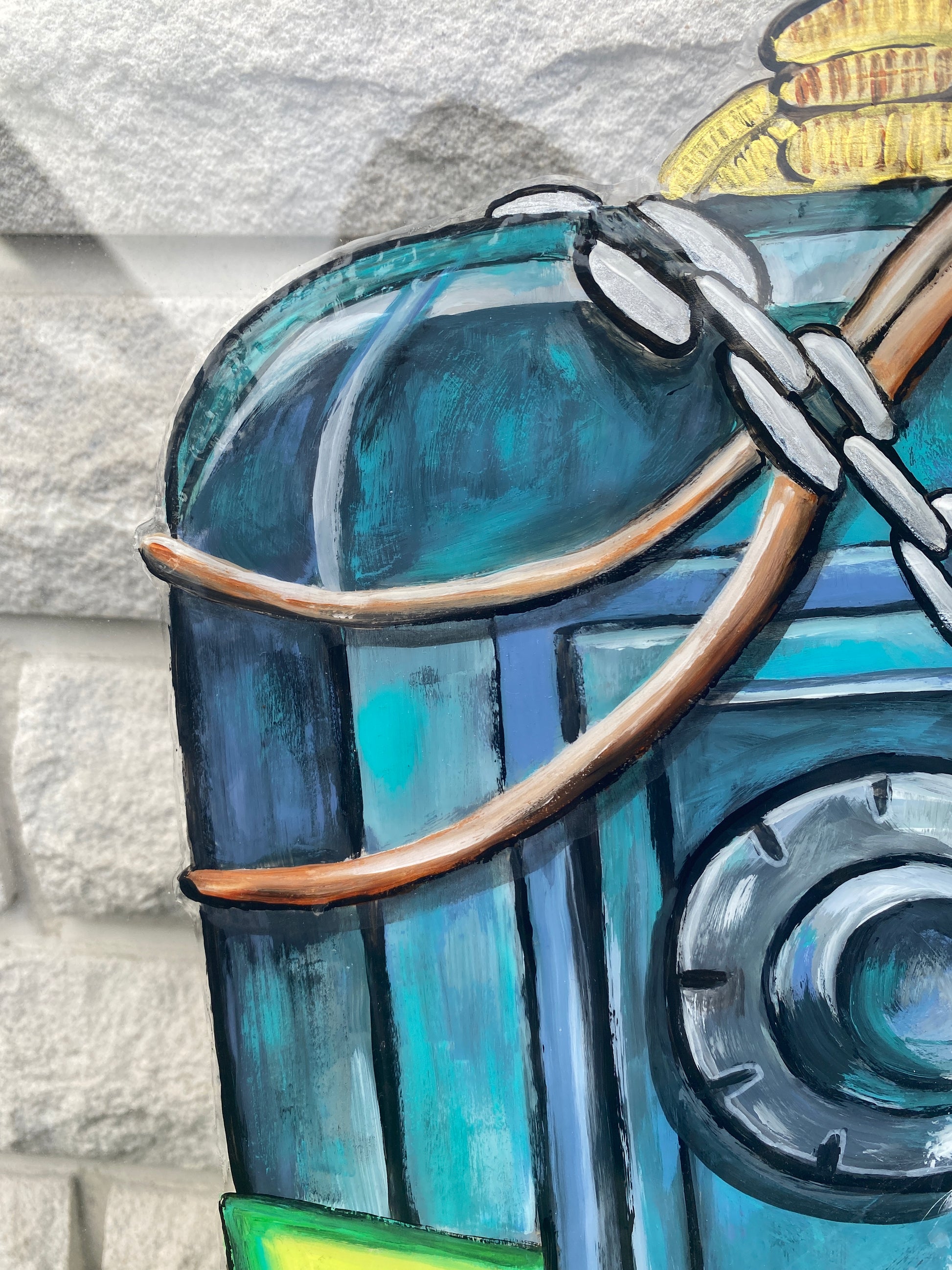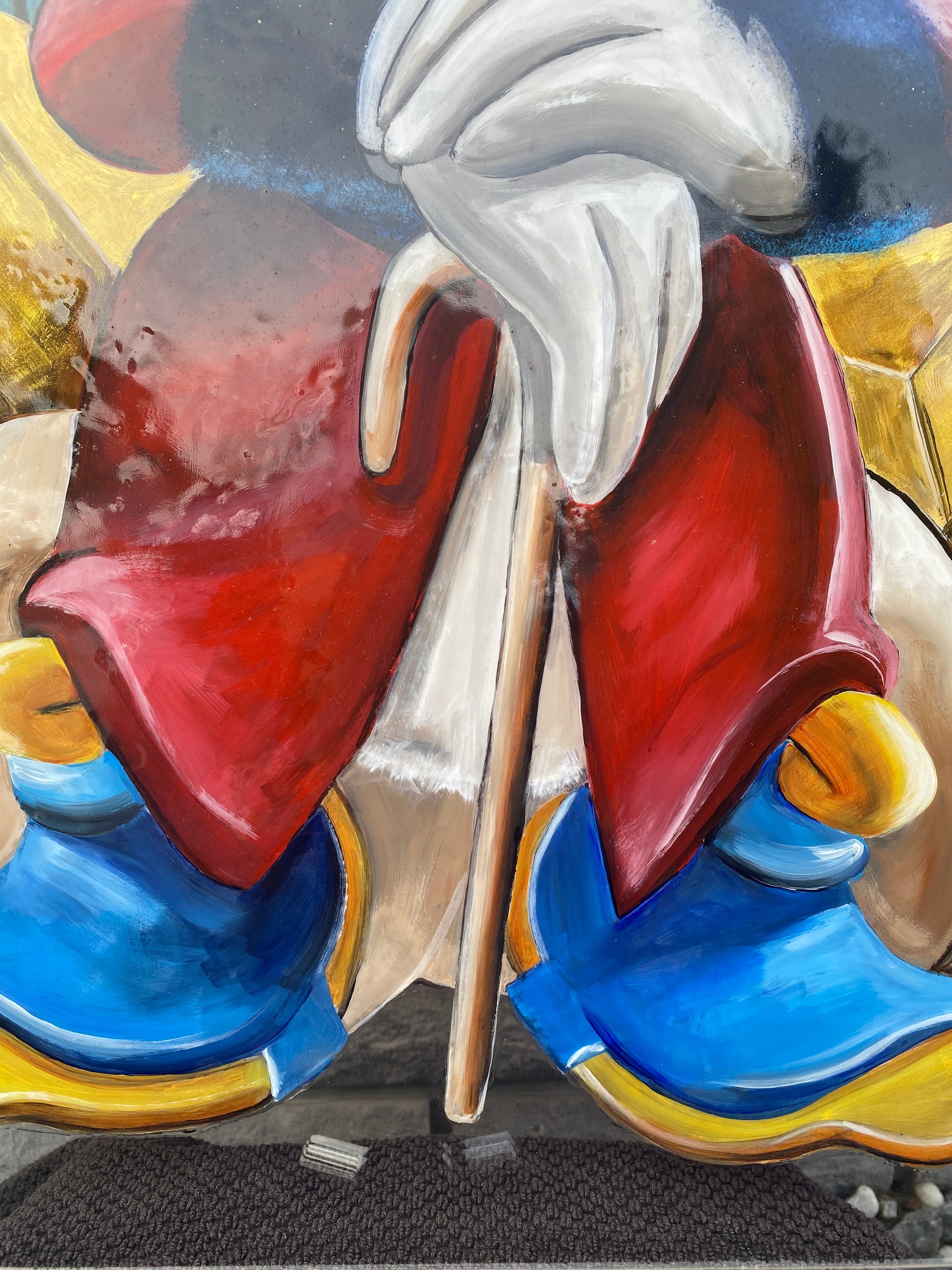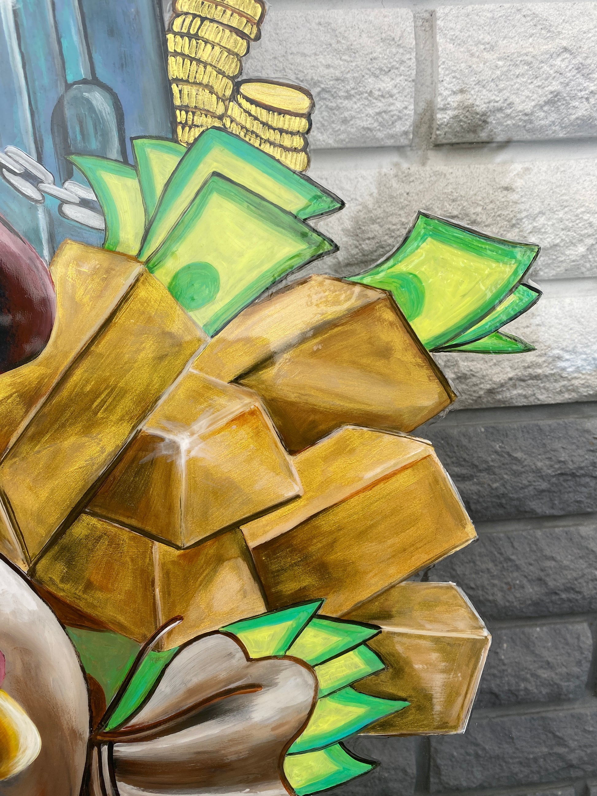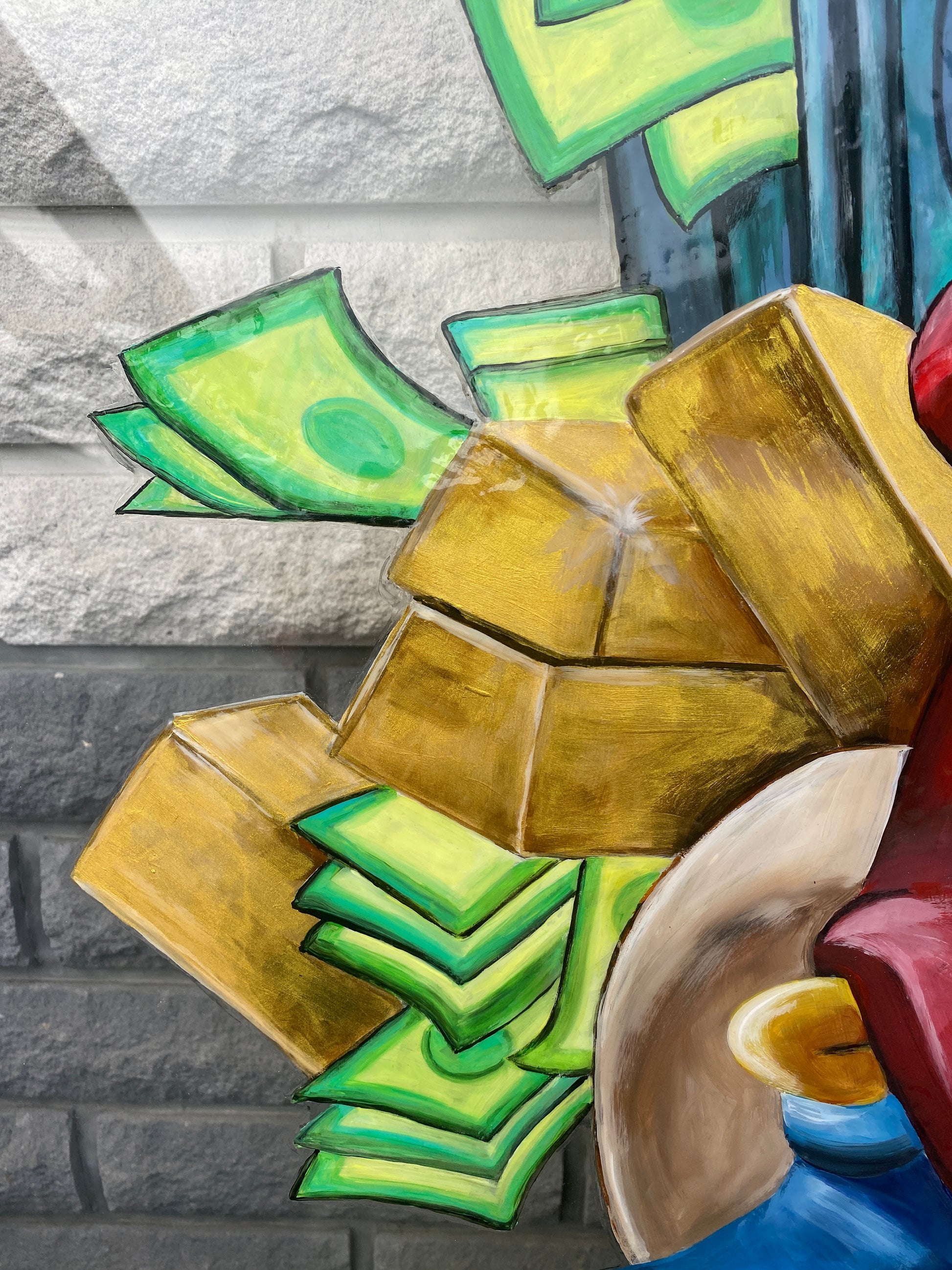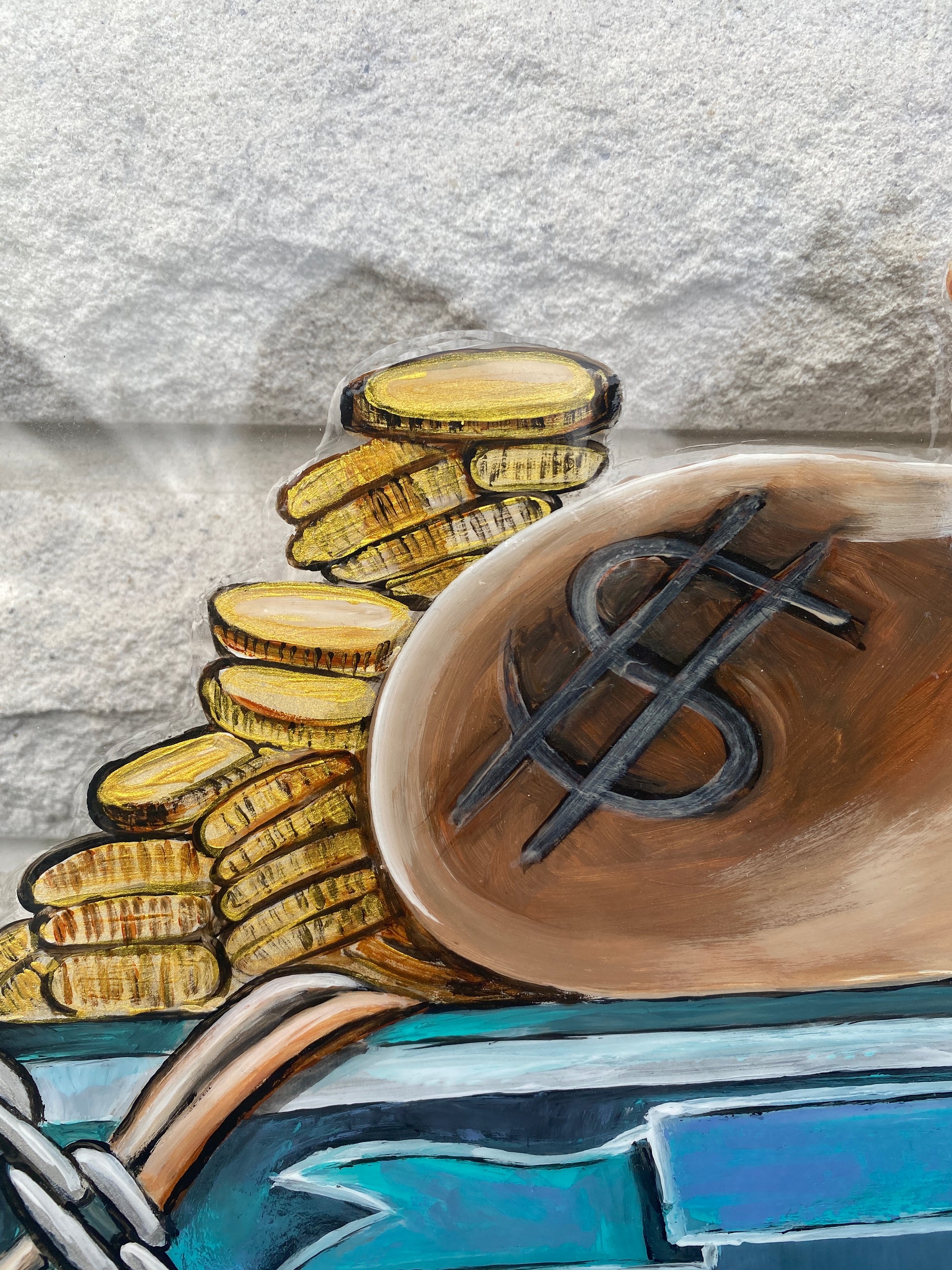Gearbeitet wurde hier mit Acryl auf einer 0,5 mm starken, verzugsfreien und UV-beständigen Acrylglasplatte. Das Motiv wurde mehrfach mit Harz fixiert. Der Hintergrund ist durchsichtig, so wirkt die geizige Ente an jeder Wand anders. Aufgehangen wird sie mit Abstandshaltern (Klemmbefestigungen Messing poliert) mittels Schrauben an der Wand (sind inbegriffen).