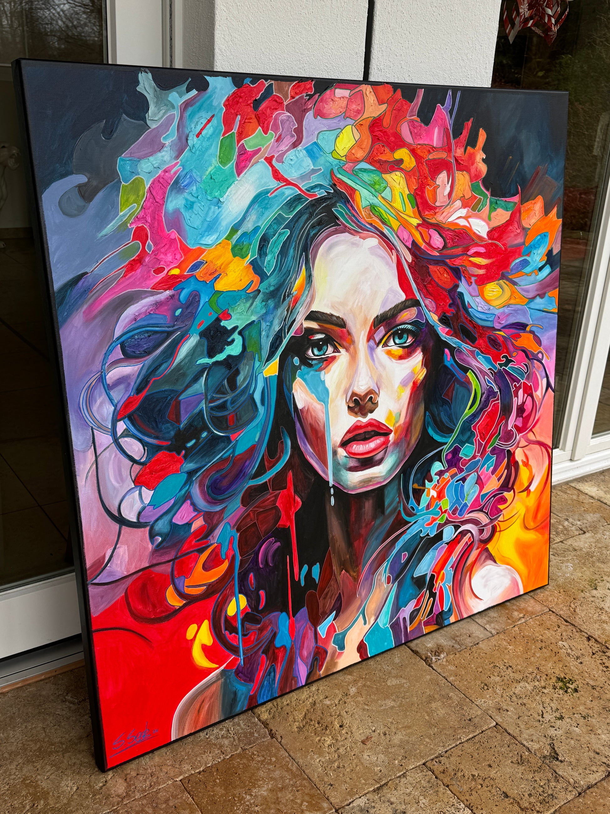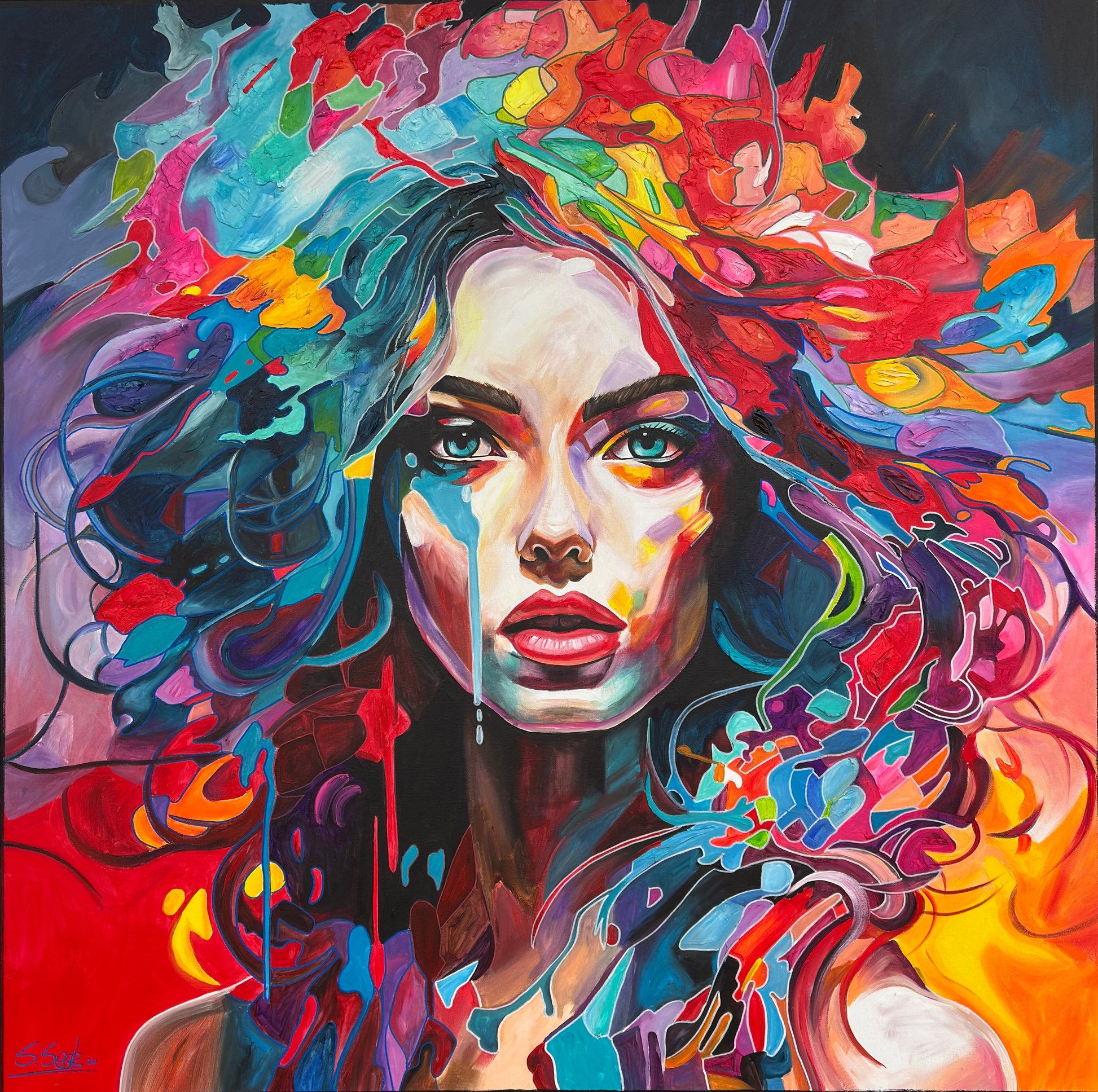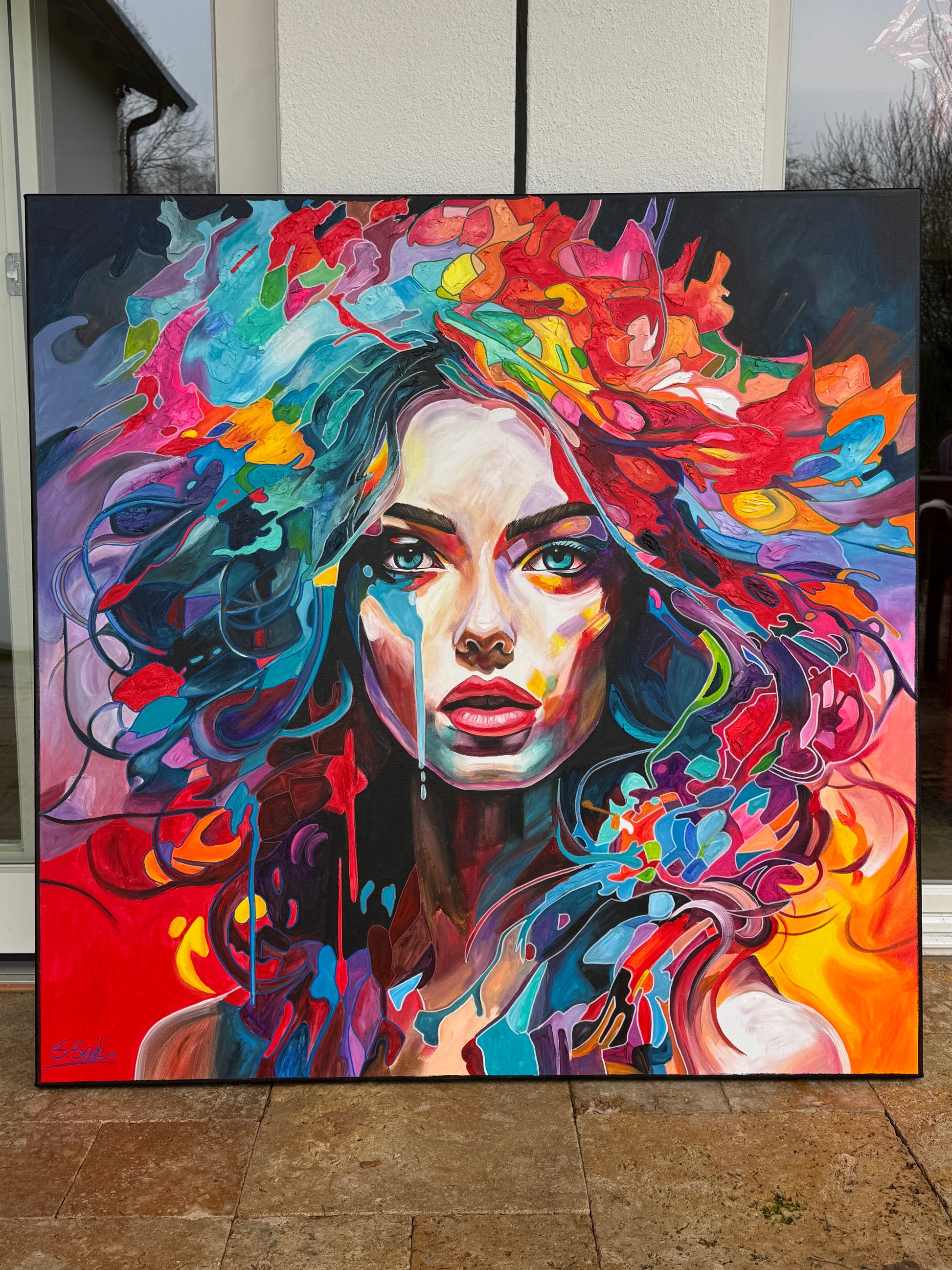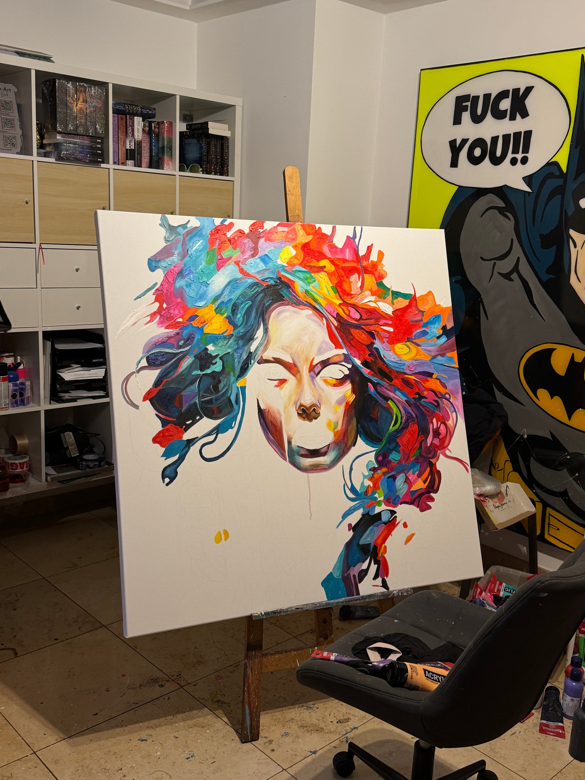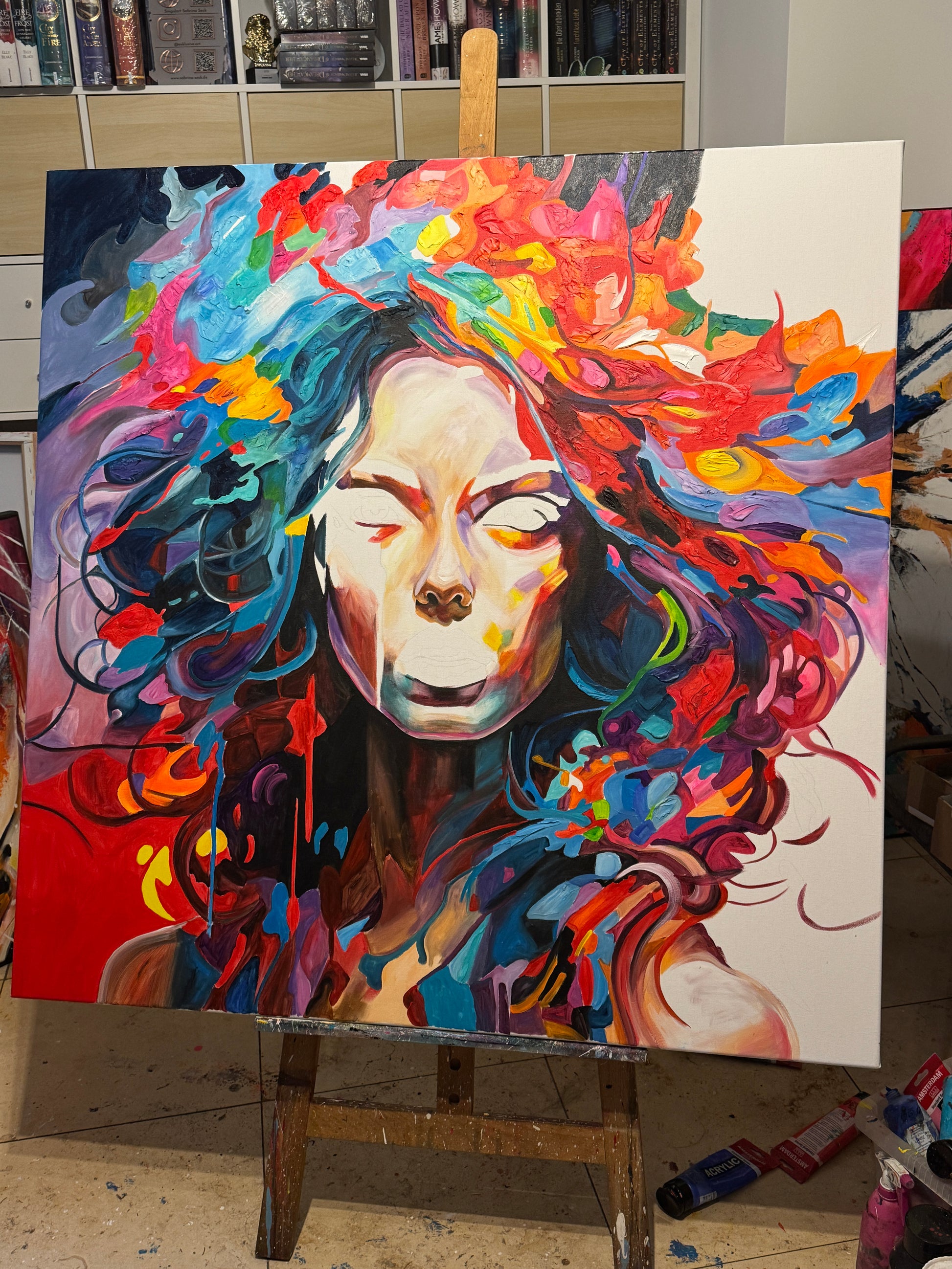 Meine Intention war es, die Dynamik und Vielseitigkeit der menschlichen Seele als Ganzes darzustellen, visualisiert durch den fließenden Übergang und die Explosion von Farben. Hydra evolution ist der Ursprung, der Beginn des menschlichen Seins. Der Anfang, an dem sich erst die Facetten manefestieren. Dieses Gemälde bringt eine energiereiche und inspirierende Atmosphäre in jeden Raum, ein Sinnbild dafür, wie aus Chaos Schönheit und Tiefe entstehen können.