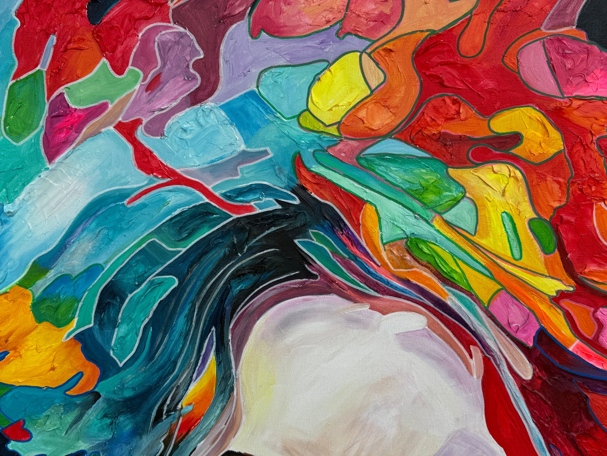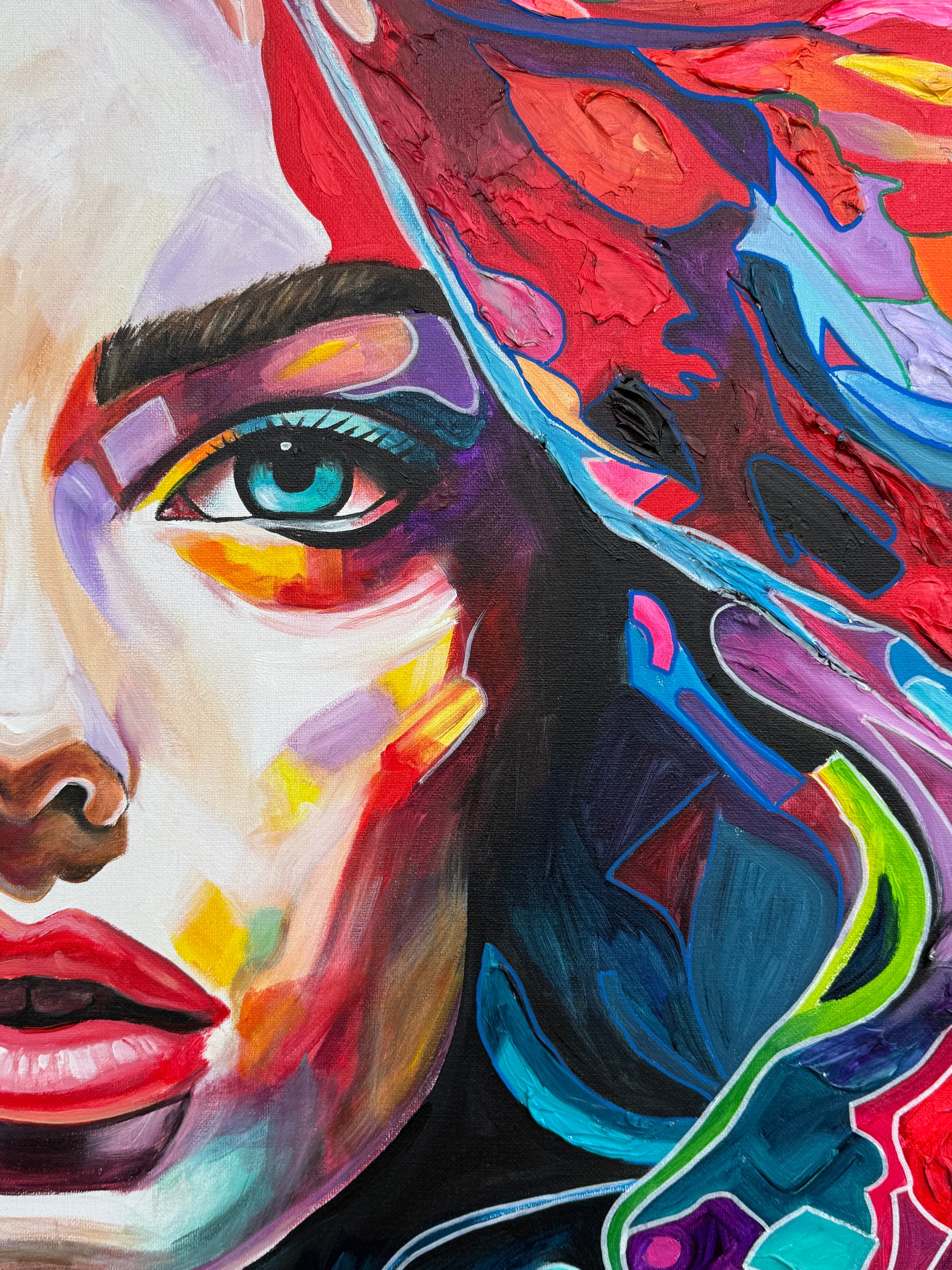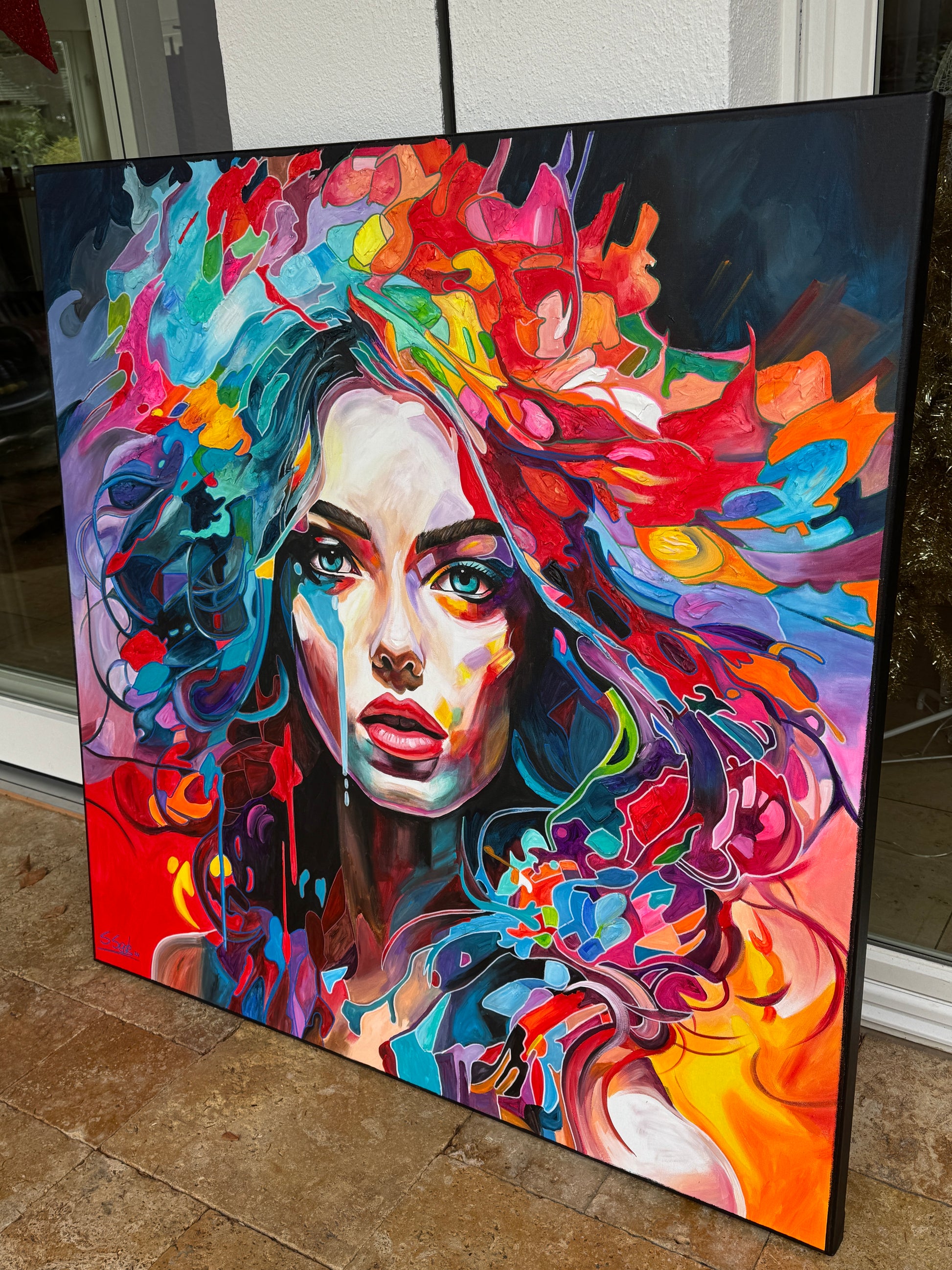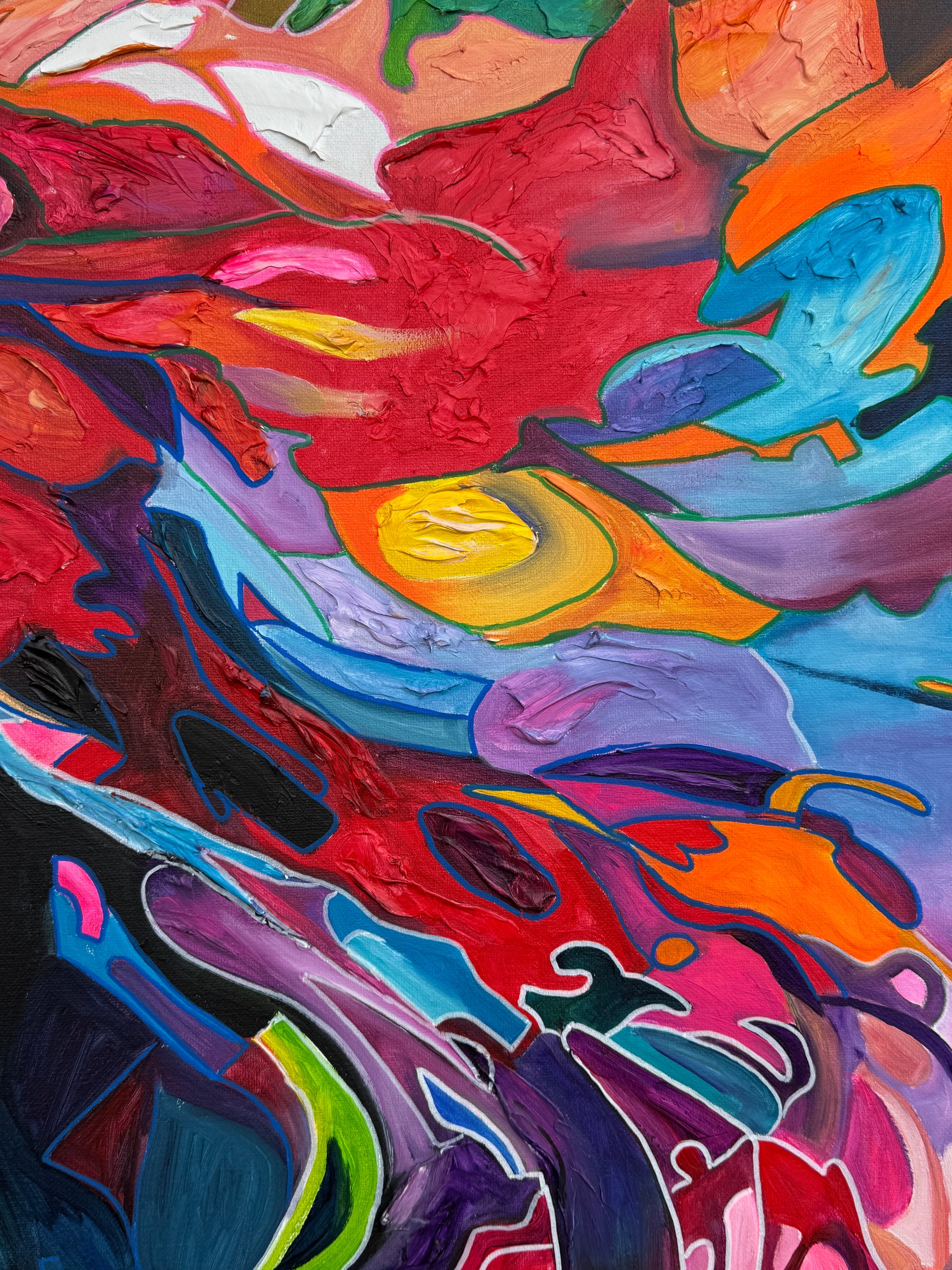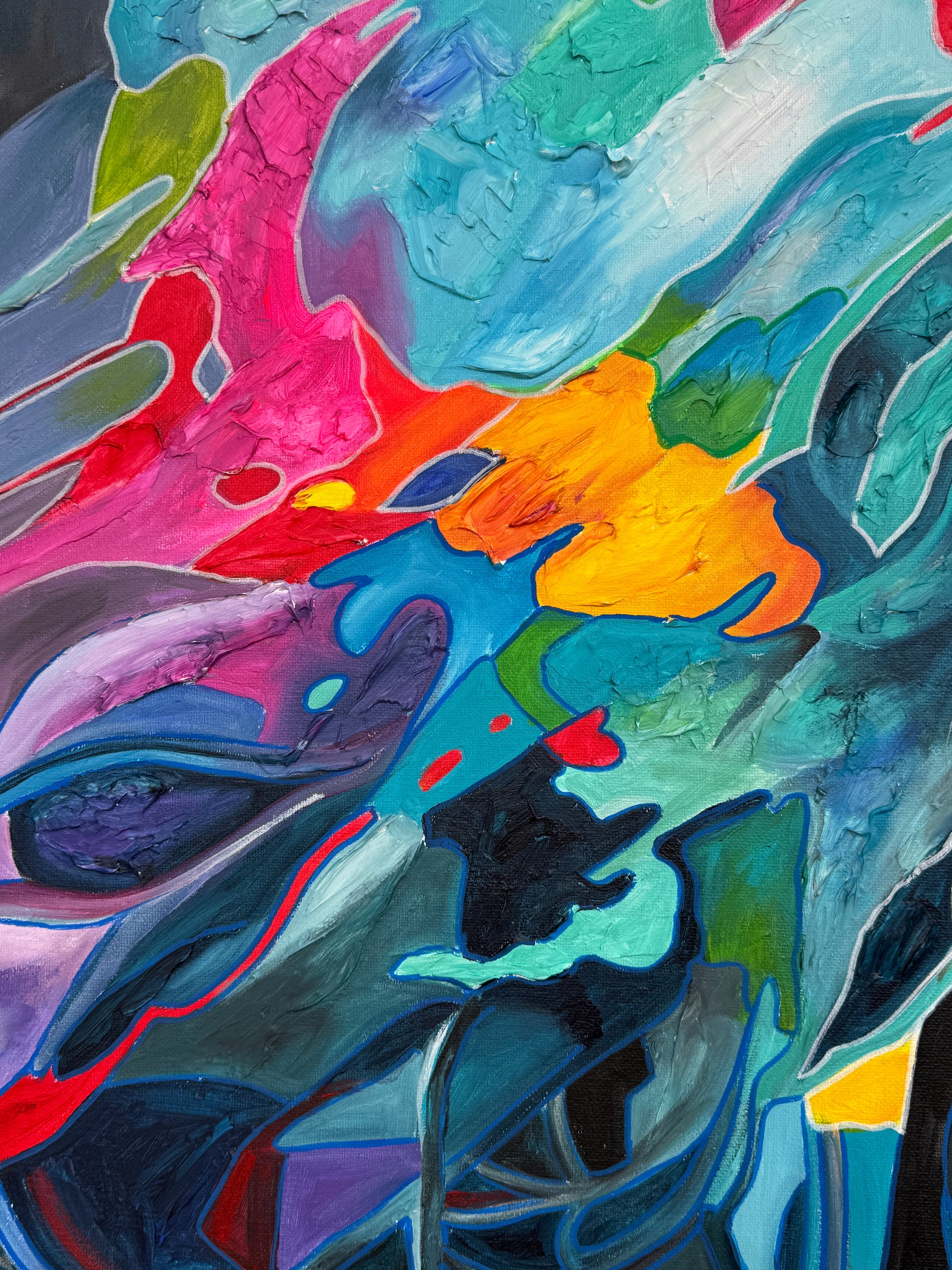 Meine Intention war es, die Dynamik und Vielseitigkeit der menschlichen Seele als Ganzes darzustellen, visualisiert durch den fließenden Übergang und die Explosion von Farben. Hydra evolution ist der Ursprung, der Beginn des menschlichen Seins. Der Anfang, an dem sich erst die Facetten manefestieren. Dieses Gemälde bringt eine energiereiche und inspirierende Atmosphäre in jeden Raum, ein Sinnbild dafür, wie aus Chaos Schönheit und Tiefe entstehen können.