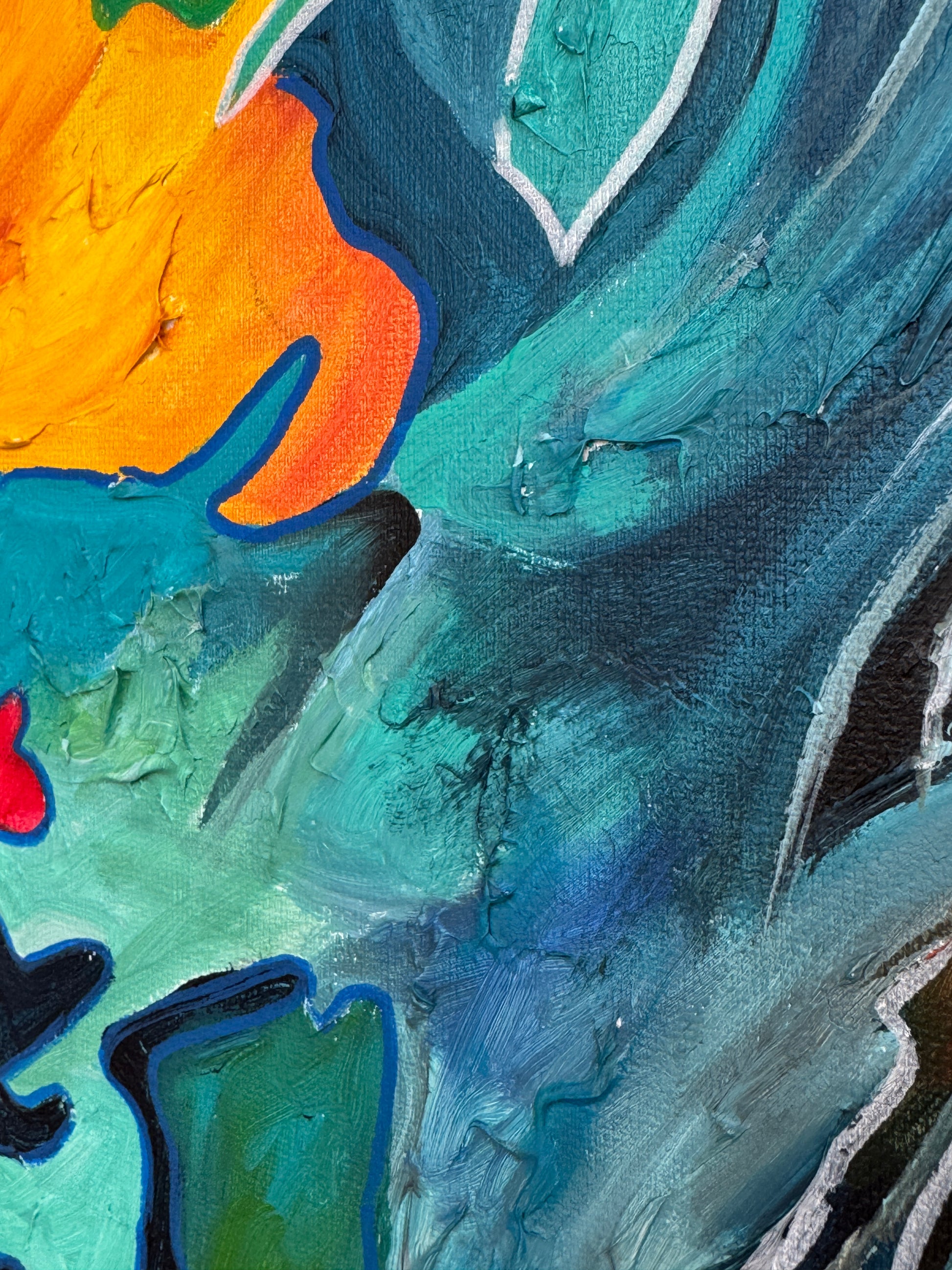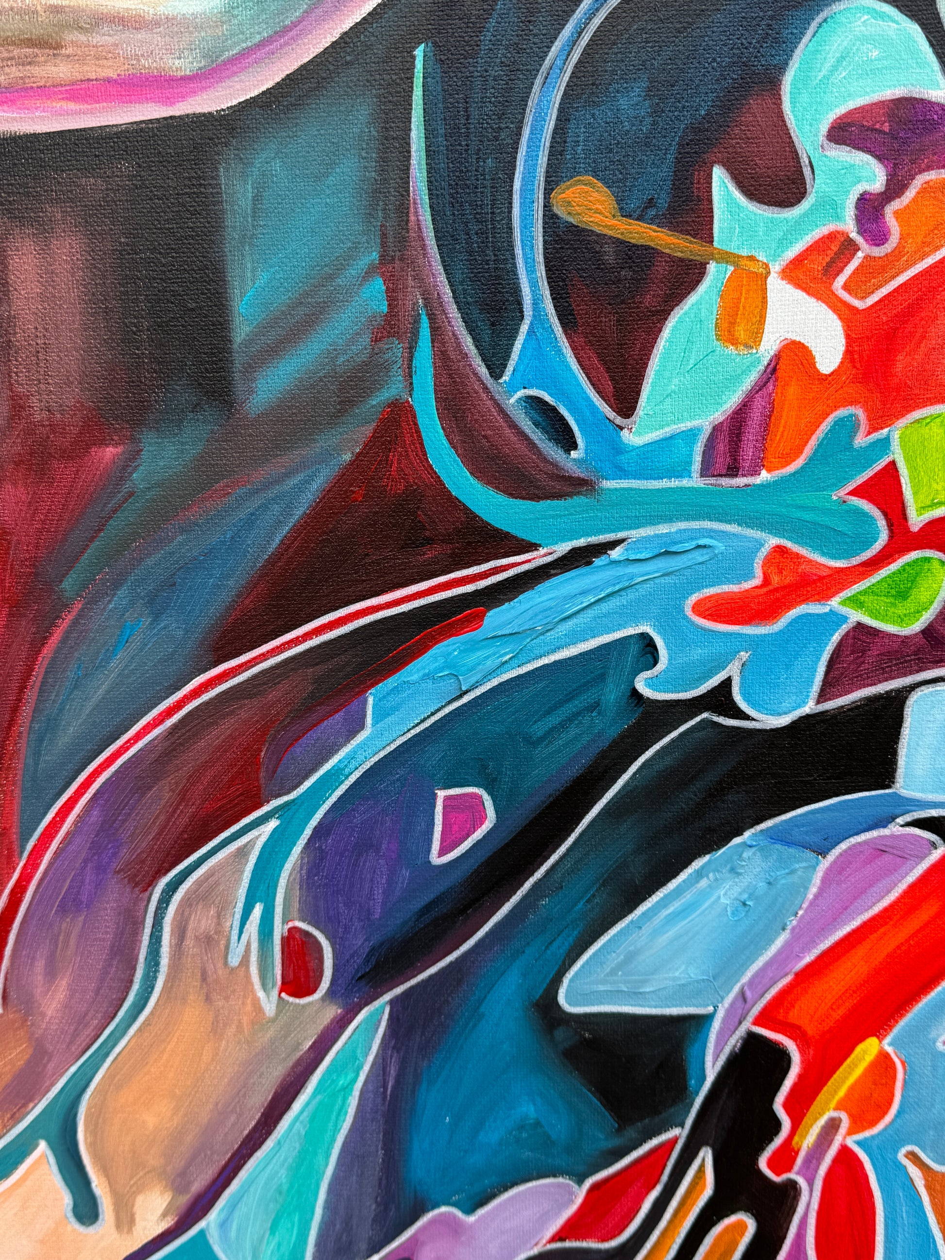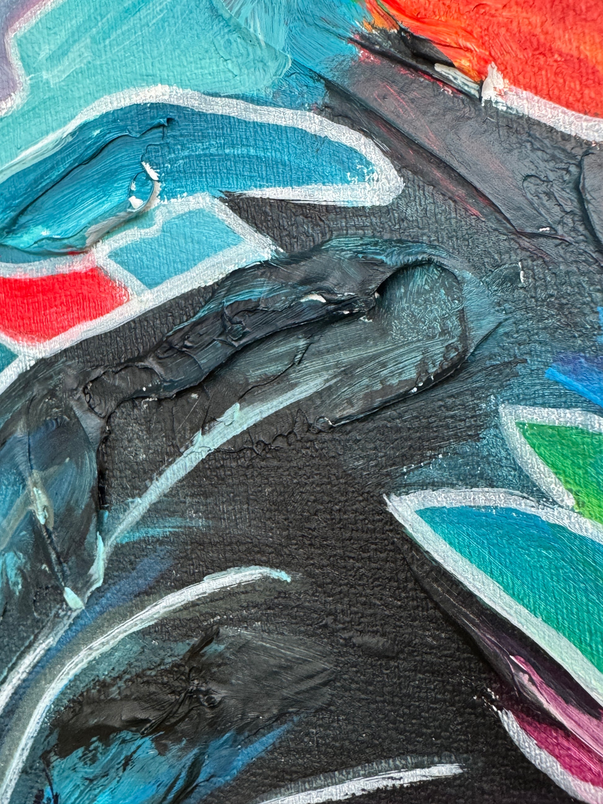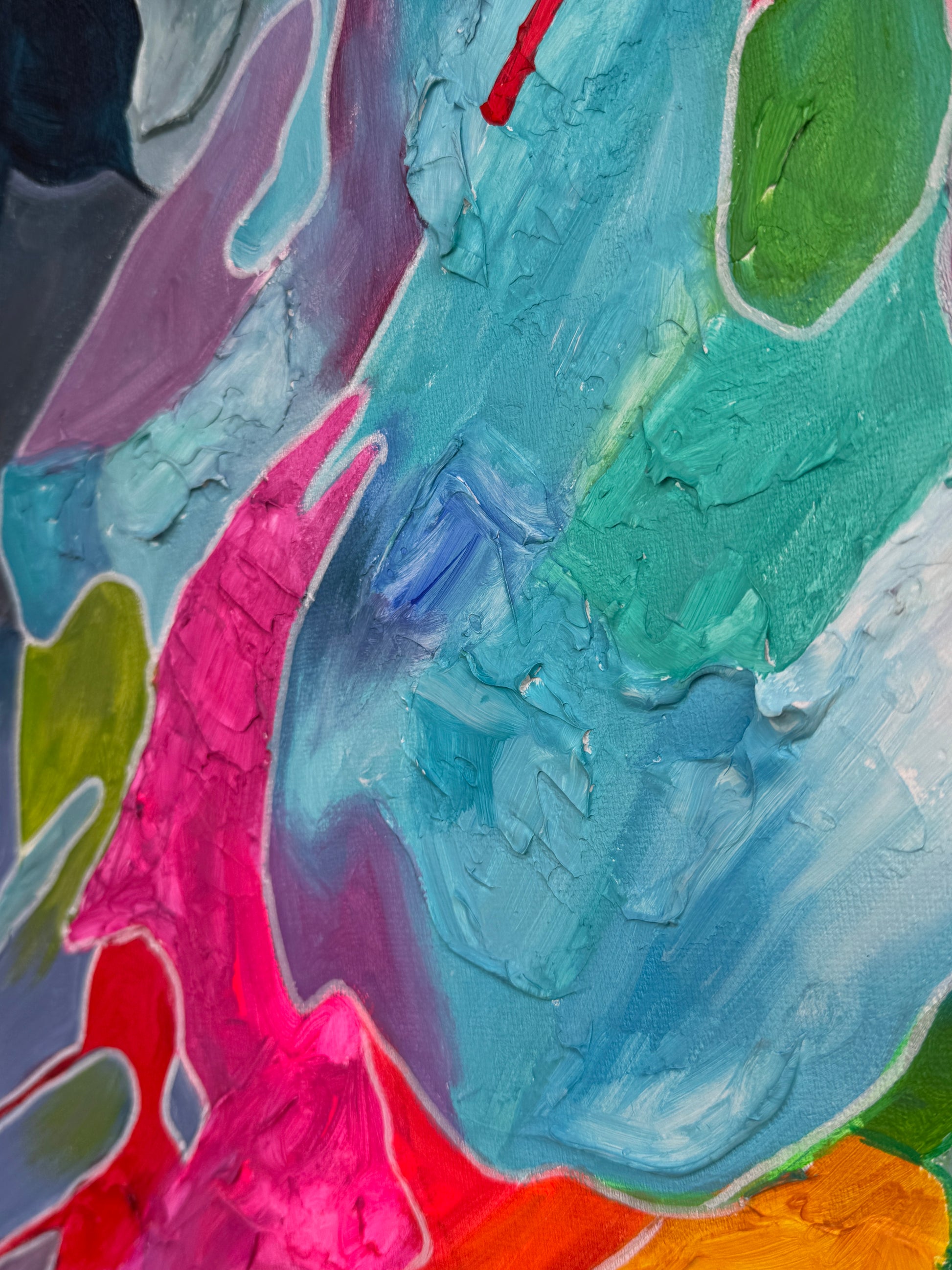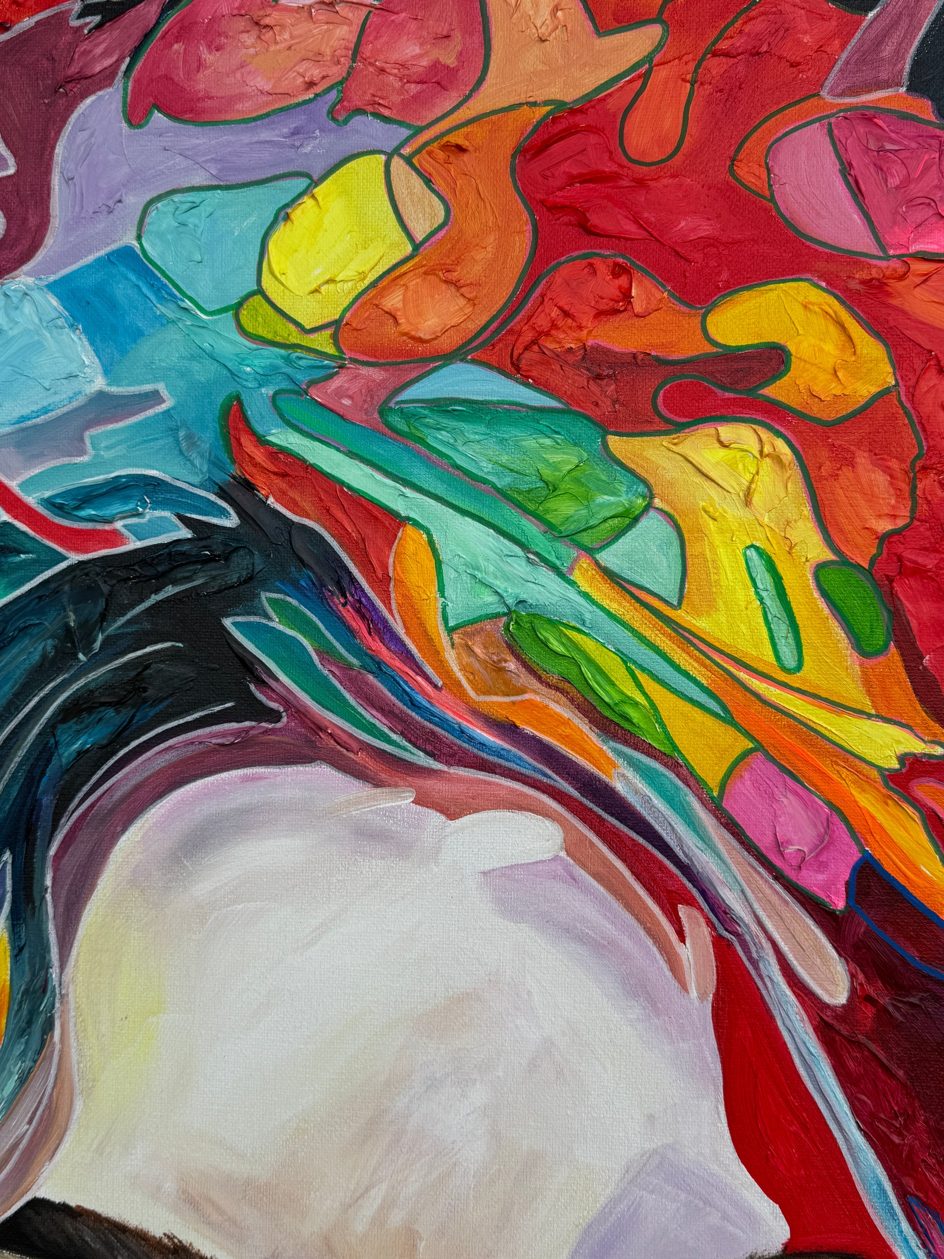 Meine Intention war es, die Dynamik und Vielseitigkeit der menschlichen Seele als Ganzes darzustellen, visualisiert durch den fließenden Übergang und die Explosion von Farben. Hydra evolution ist der Ursprung, der Beginn des menschlichen Seins. Der Anfang, an dem sich erst die Facetten manefestieren. Dieses Gemälde bringt eine energiereiche und inspirierende Atmosphäre in jeden Raum, ein Sinnbild dafür, wie aus Chaos Schönheit und Tiefe entstehen können.