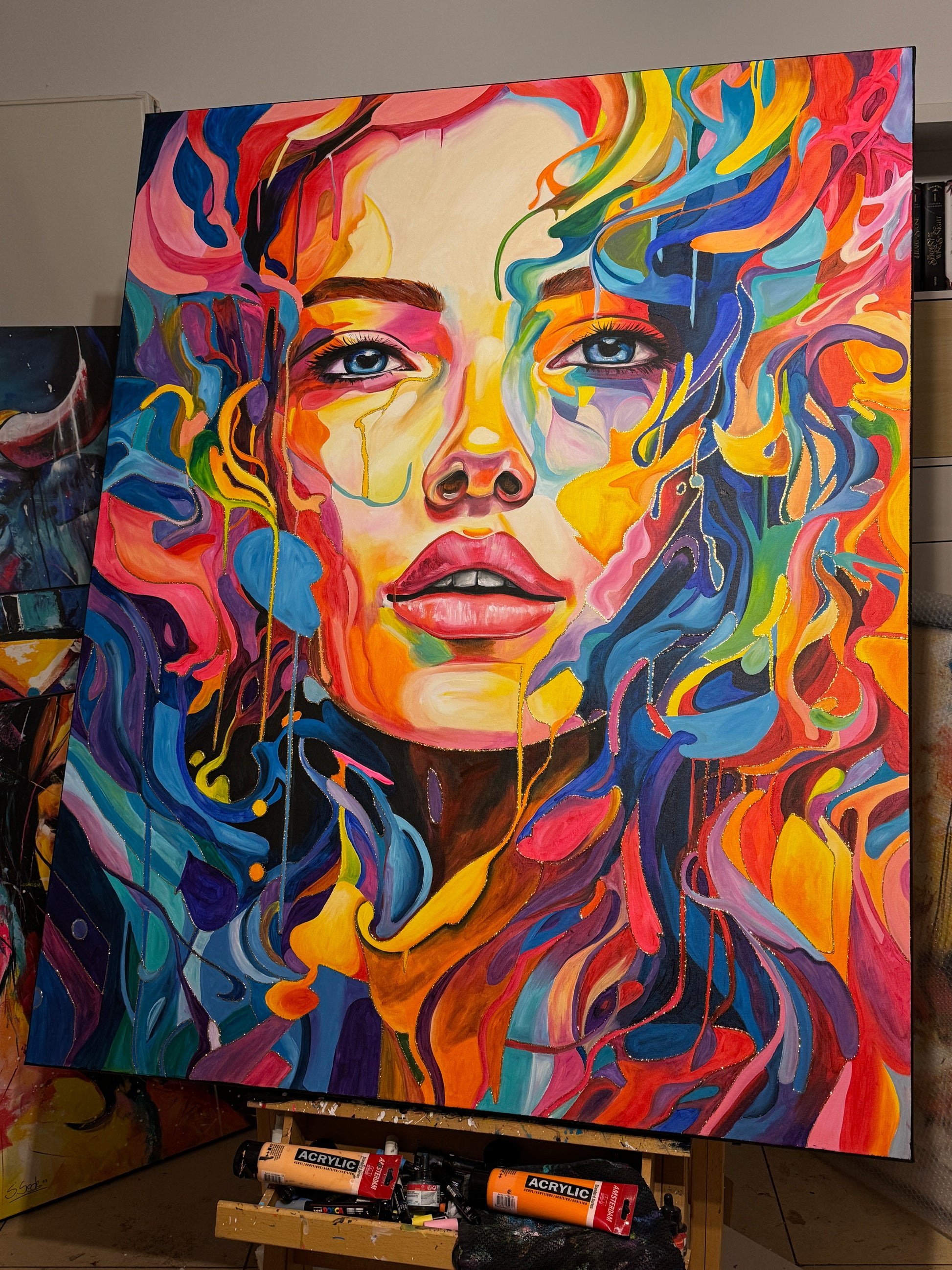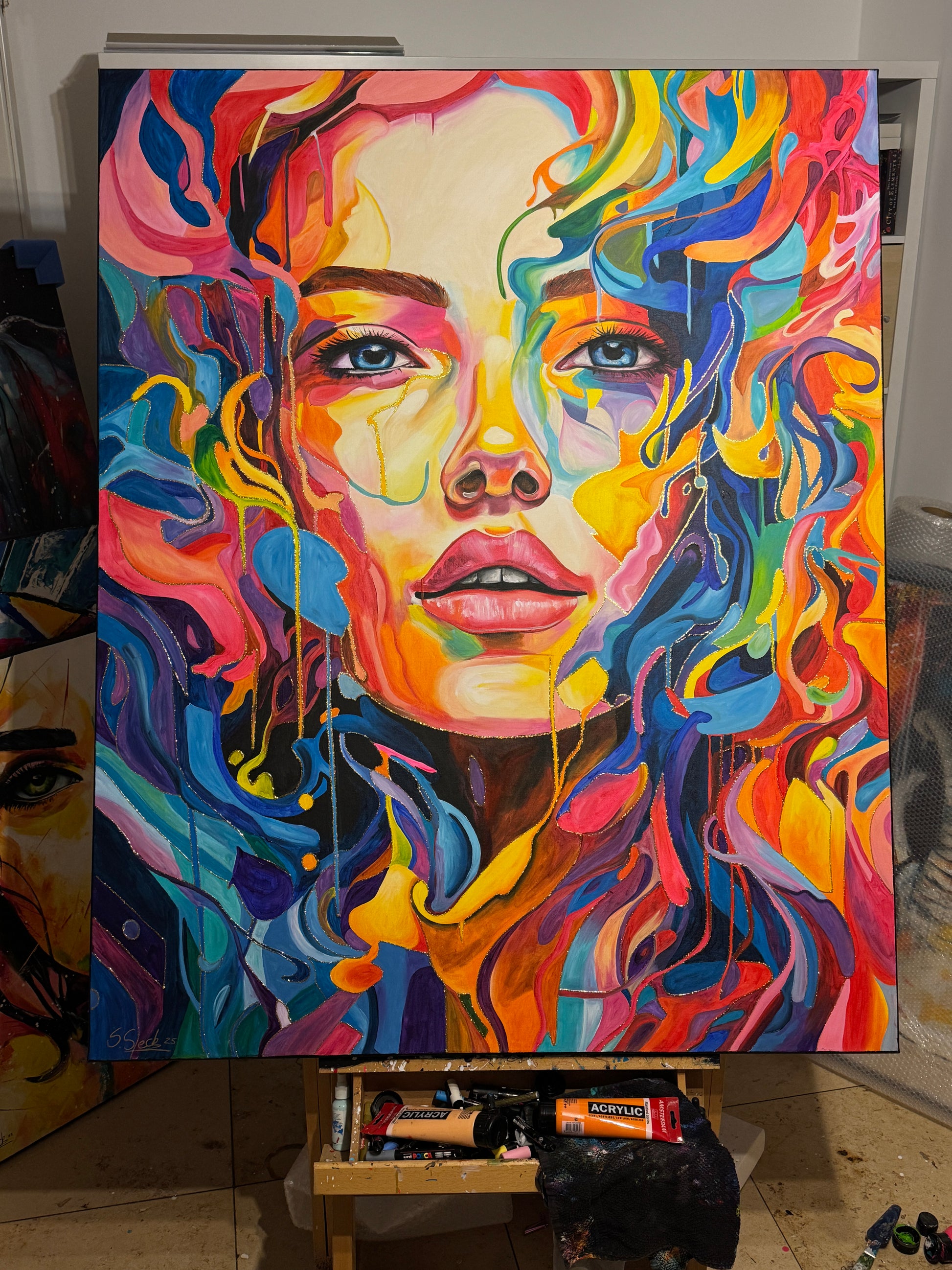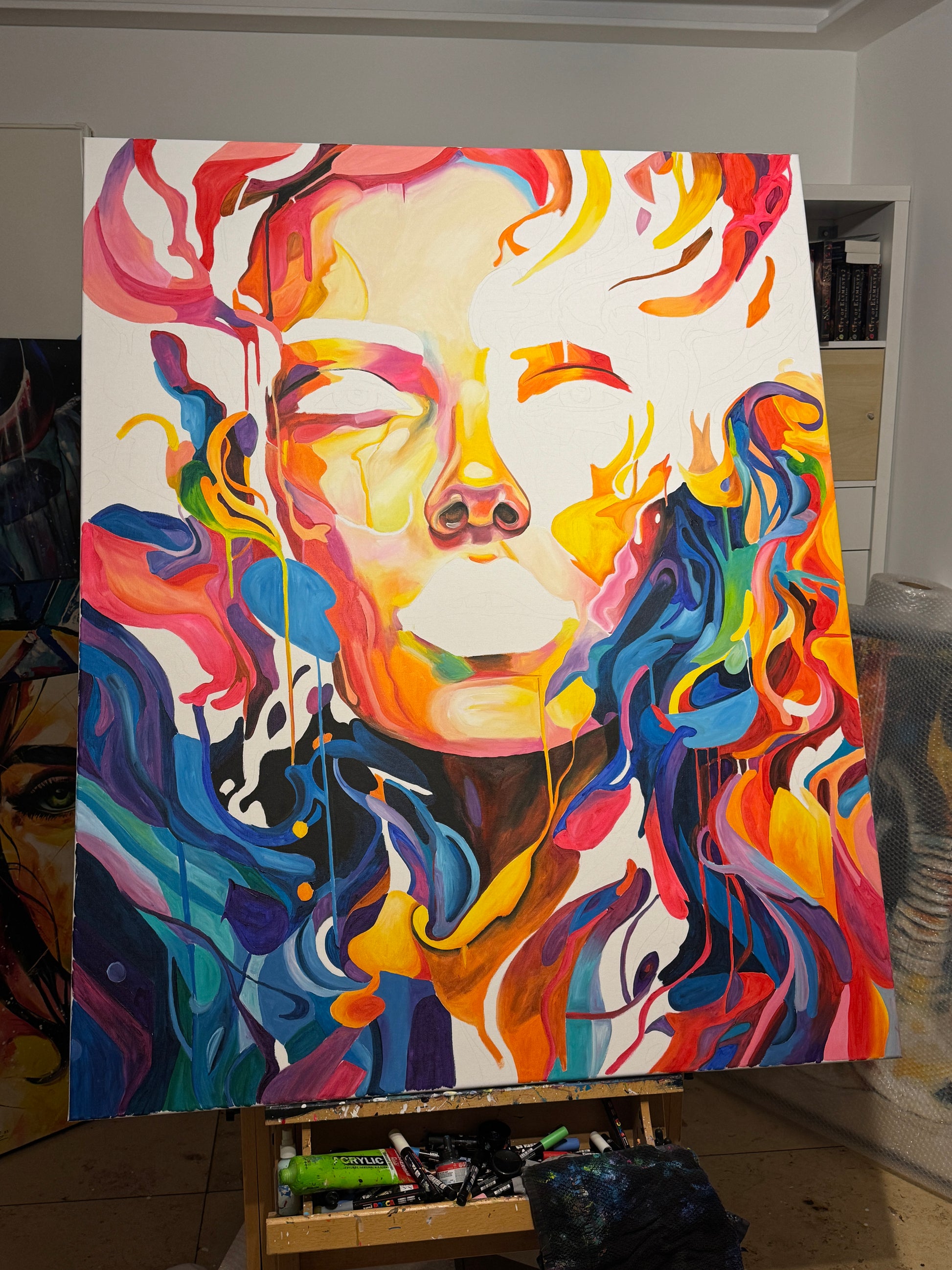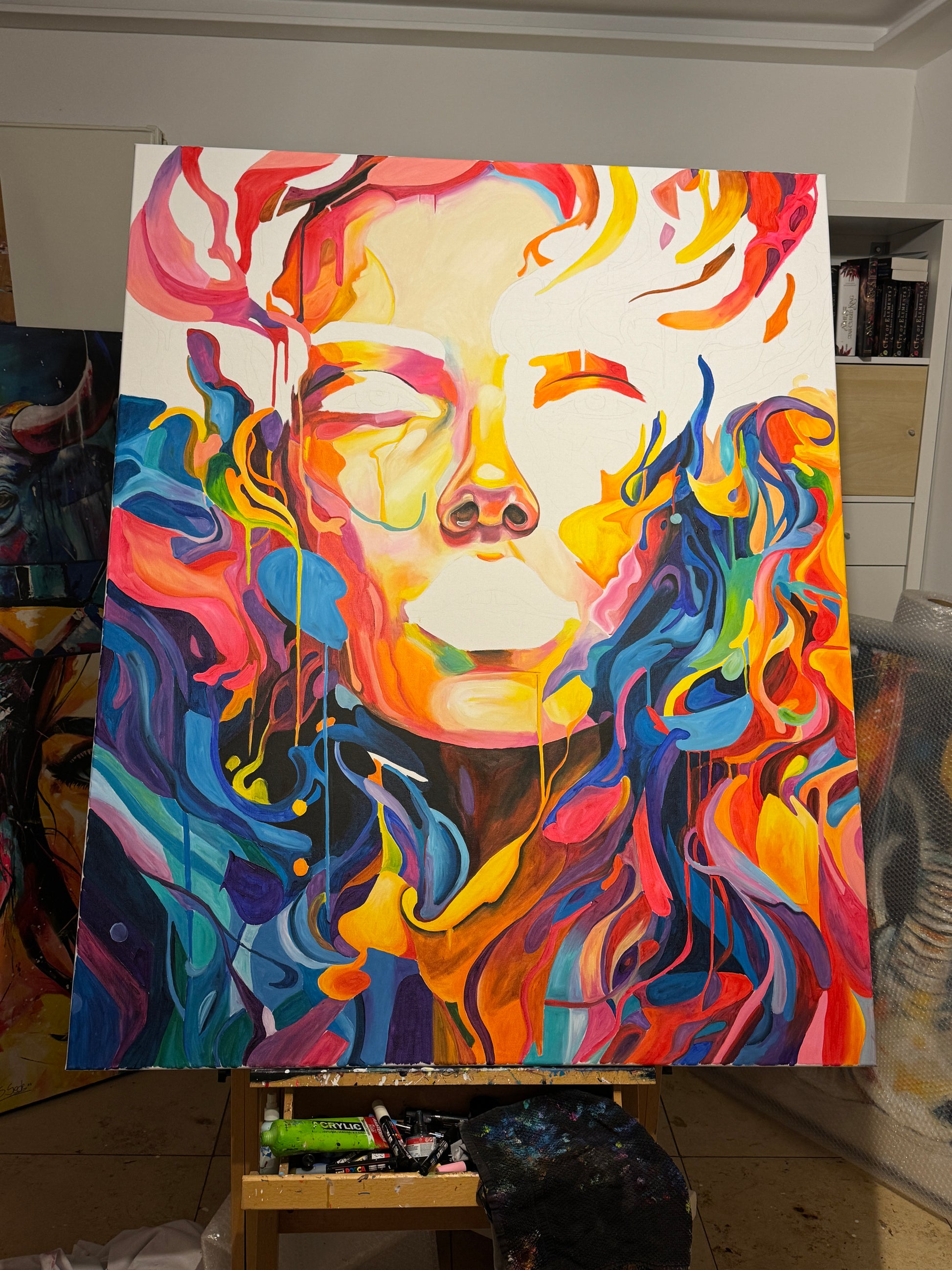 Auch hier wollte ich die kraftvolle Vielfalt der menschlichen Emotionen sichtbar machen. Jede Farbe, jede Linie erzählt von lebendiger Energie und innerer Tiefe.