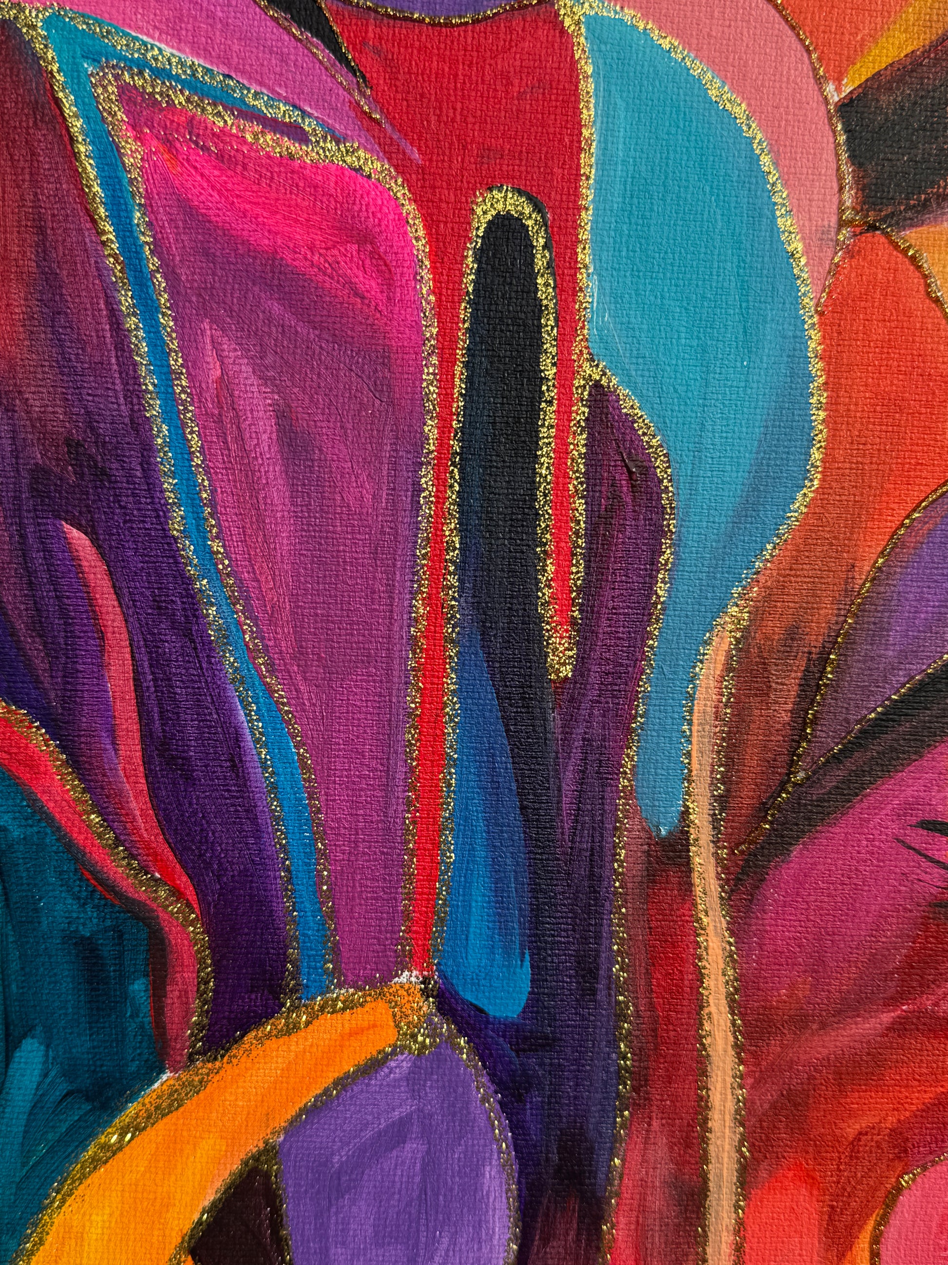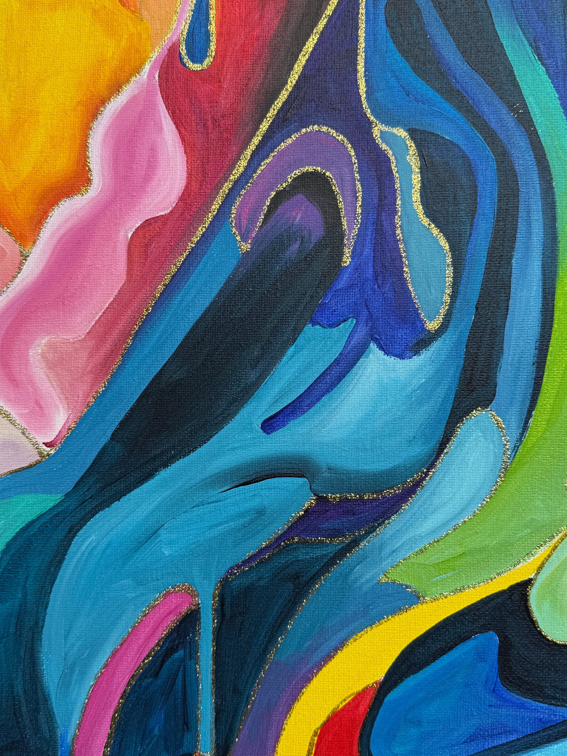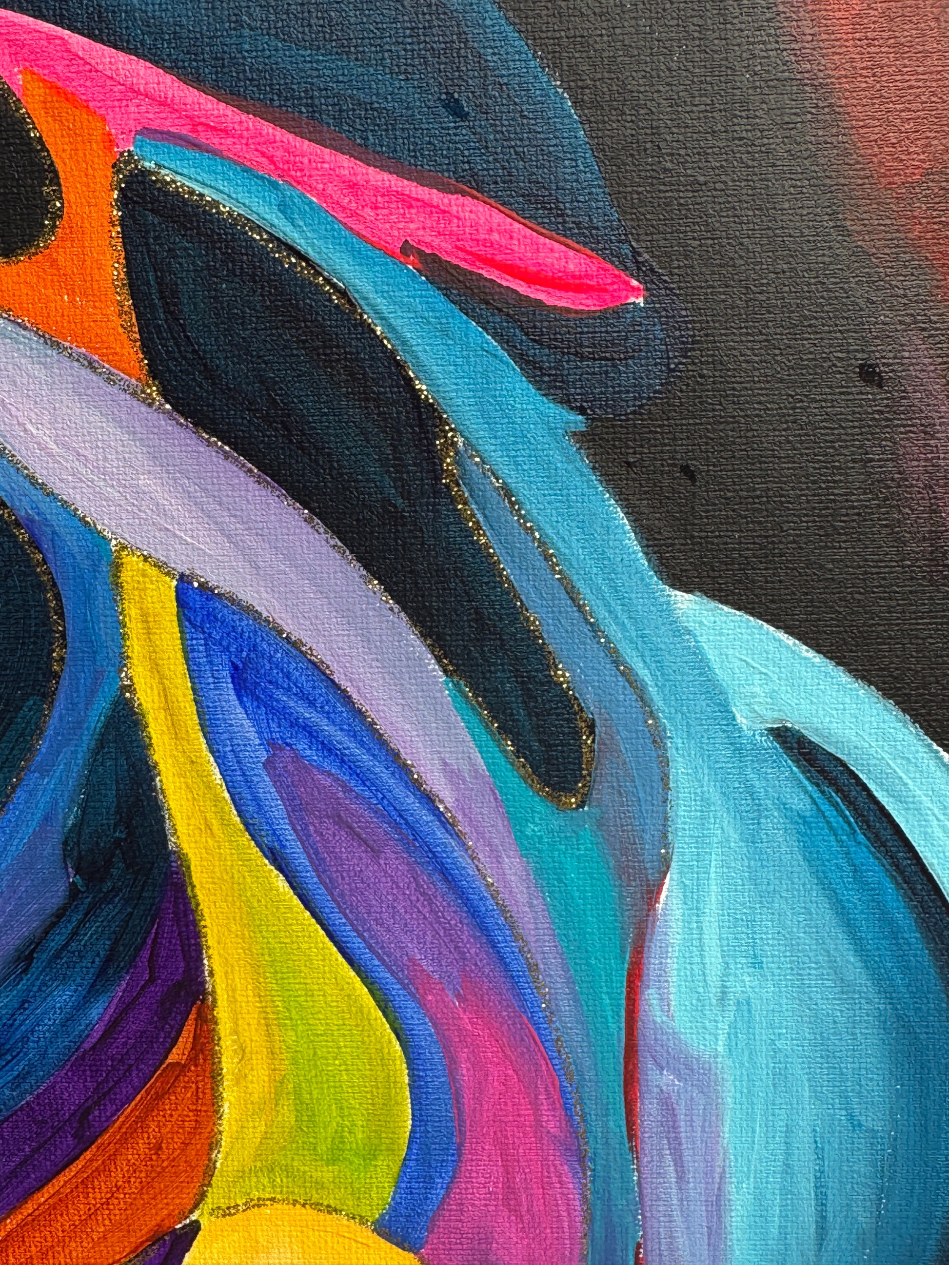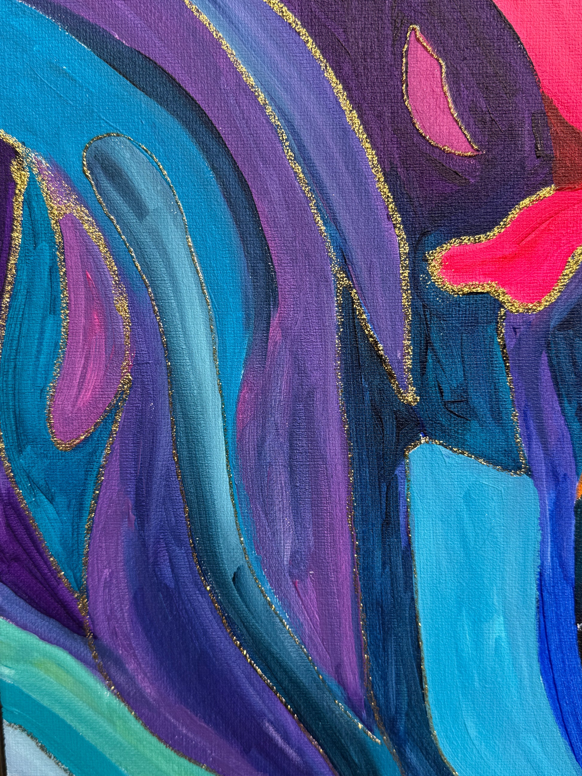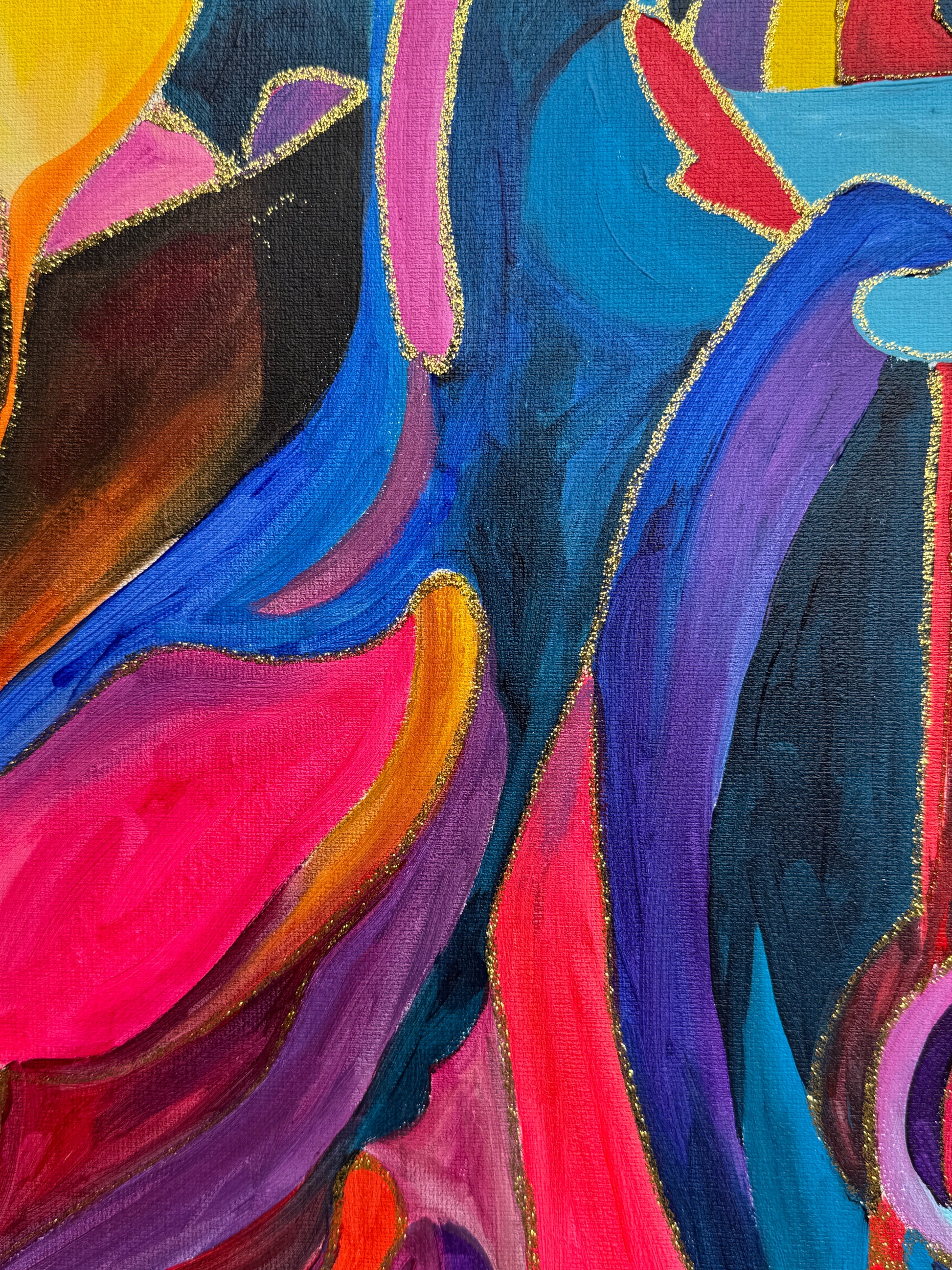 Die Mischung aus abstrakten und figurativen Elementen und nicht zuletzt die explosionsartige Farbigkeit bringt Bewegung und Ausdruckskraft in Einklang. Um die Konturen sowie die Eleganz zusätzlich herzvorzuheben, habe ich gold-glänzenden Liner benutzt