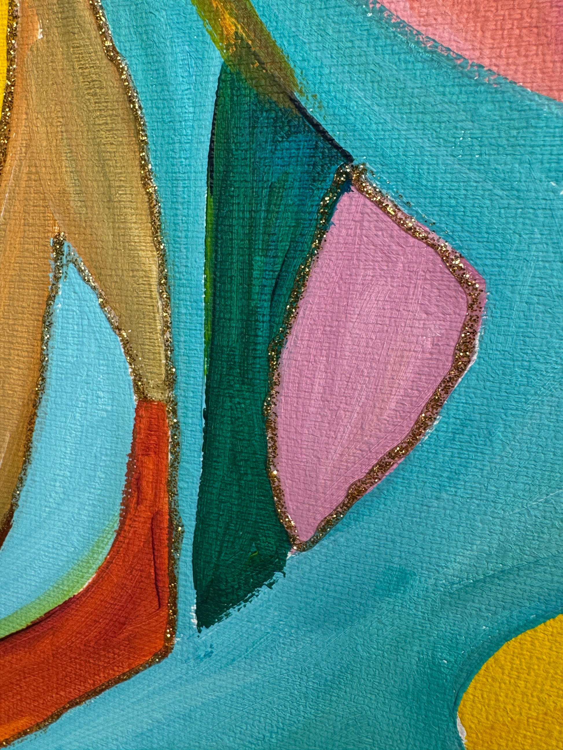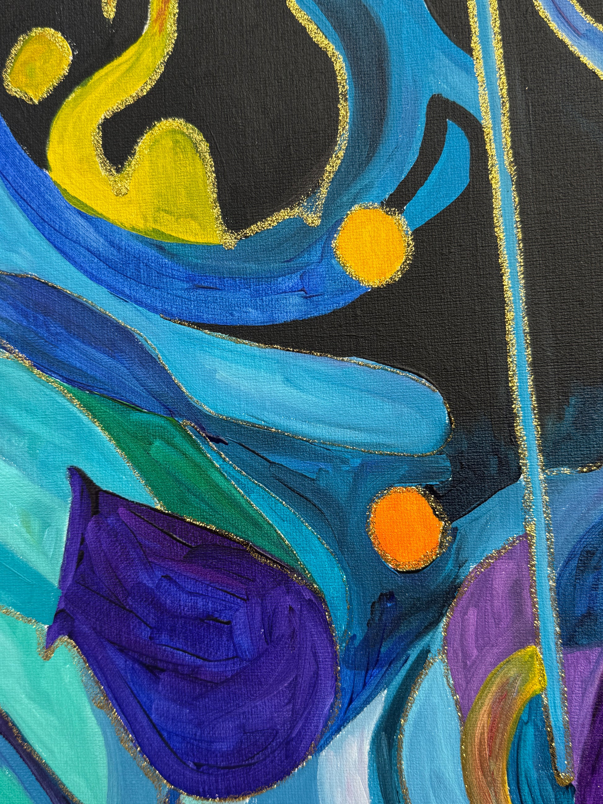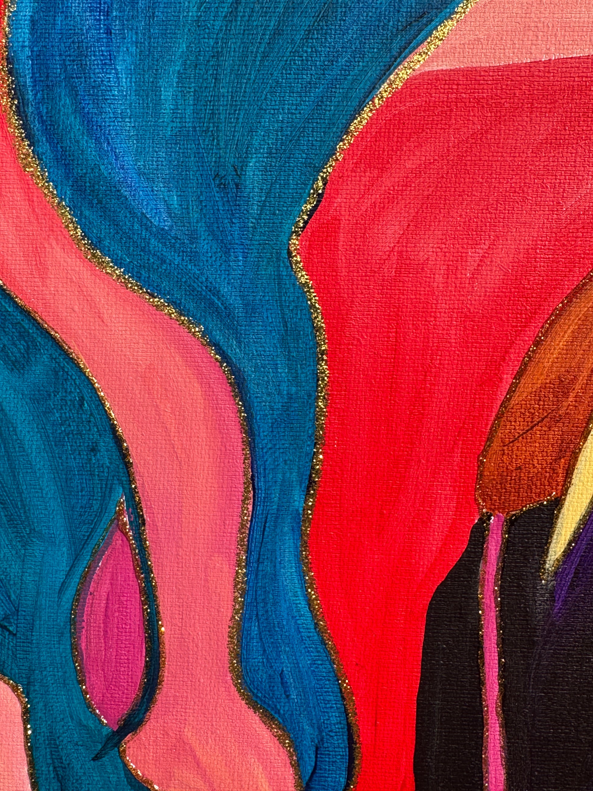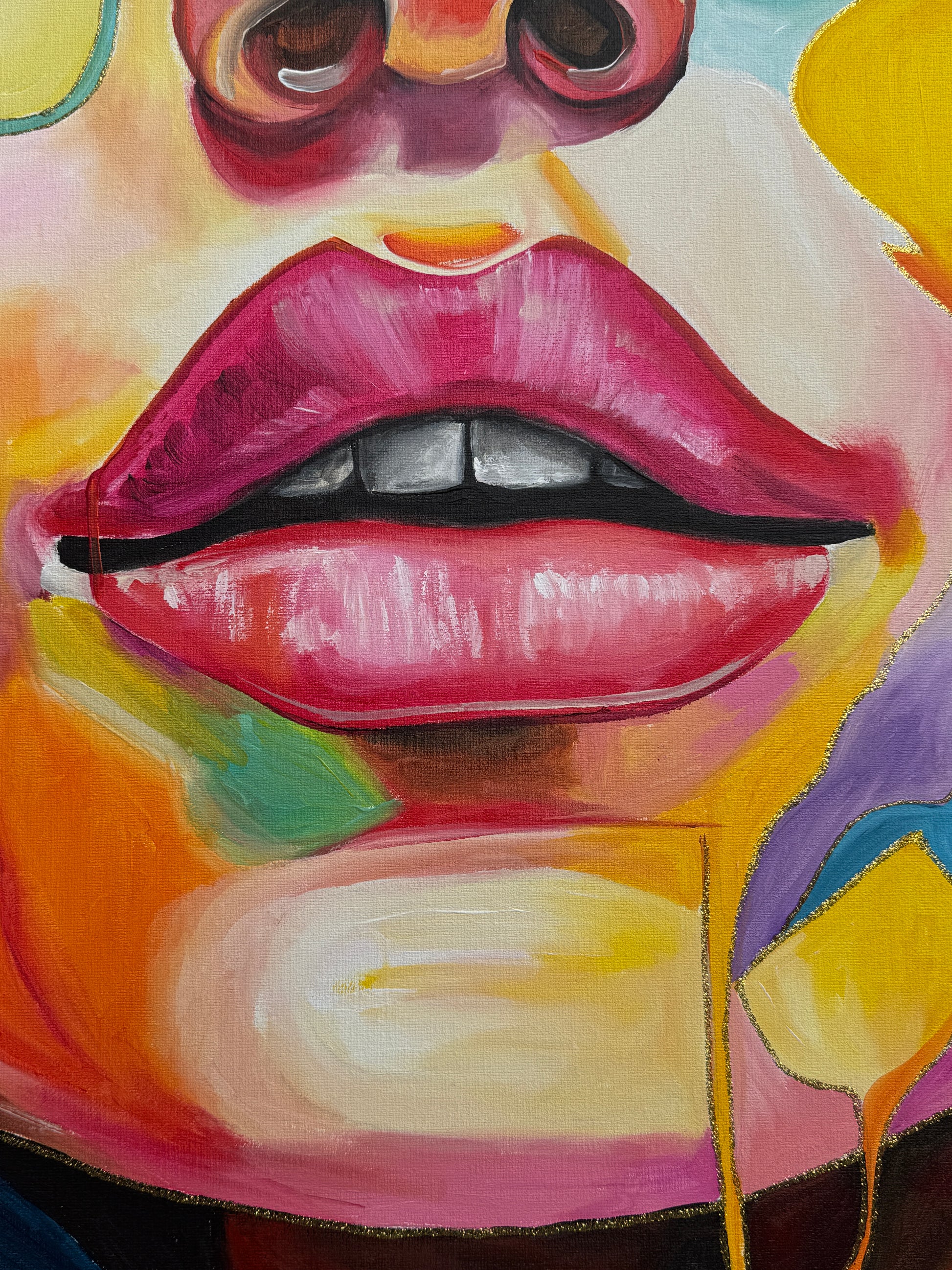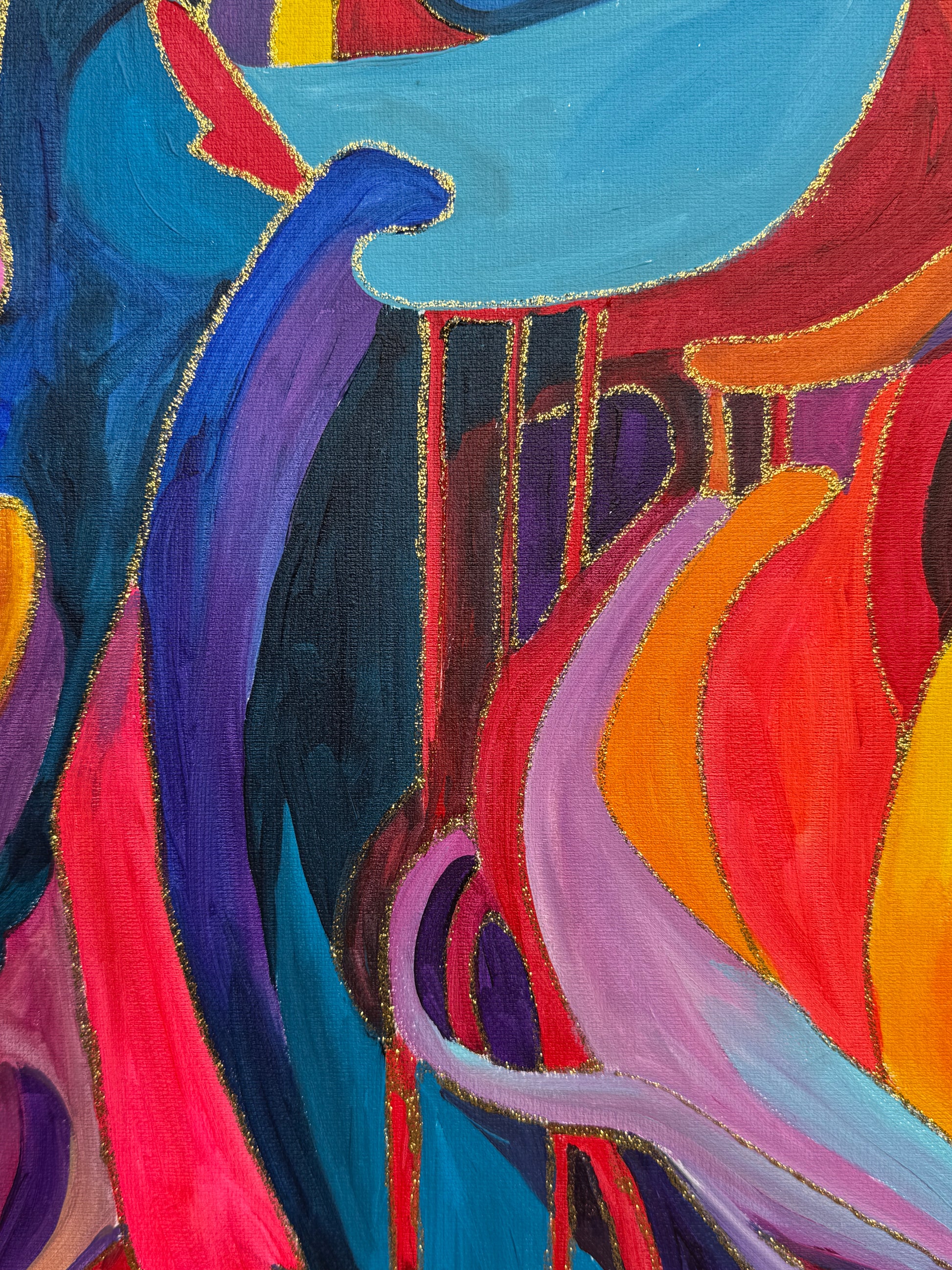 Die Mischung aus abstrakten und figurativen Elementen und nicht zuletzt die explosionsartige Farbigkeit bringt Bewegung und Ausdruckskraft in Einklang. Um die Konturen sowie die Eleganz zusätzlich herzvorzuheben, habe ich gold-glänzenden Liner benutzt