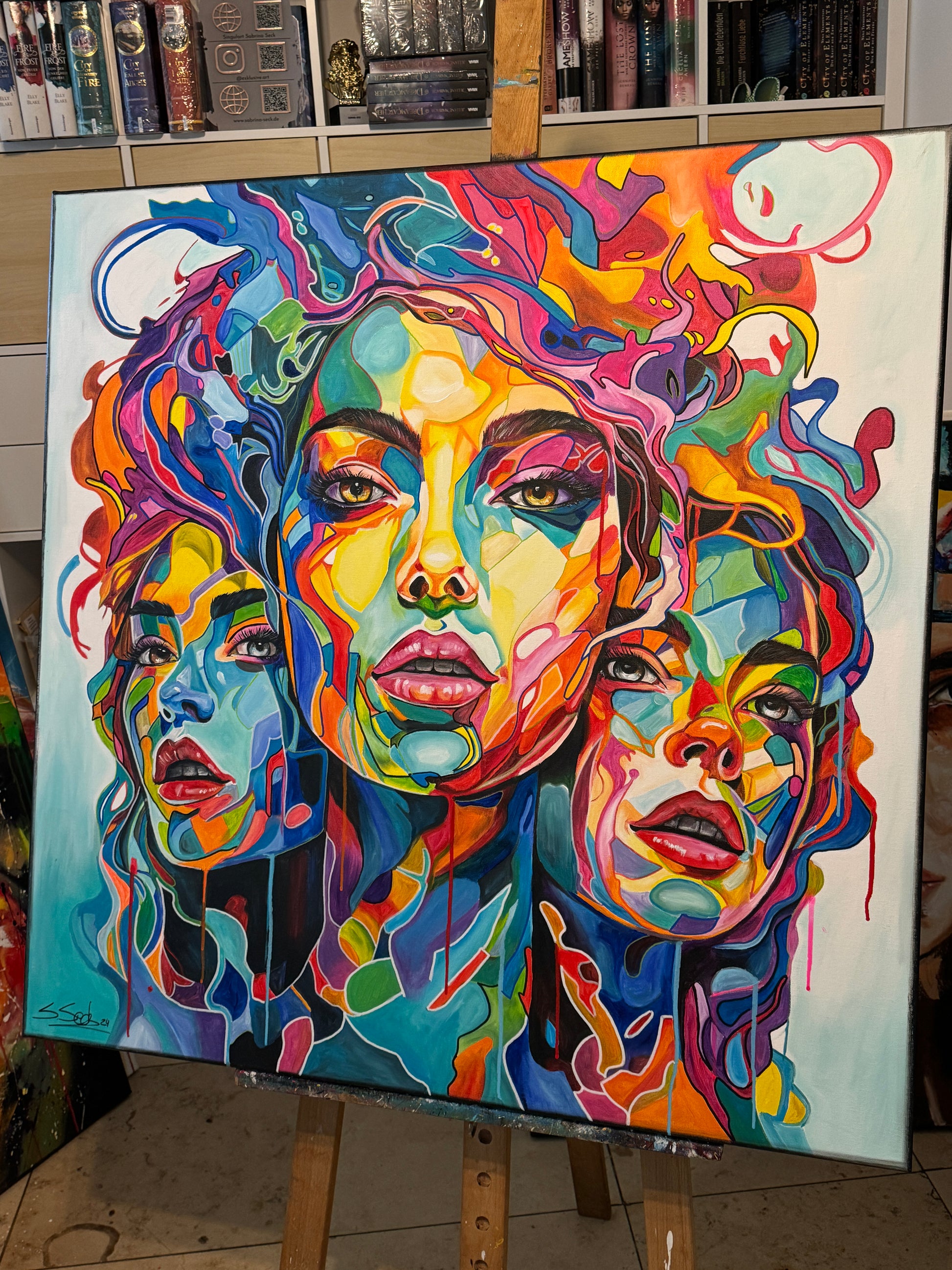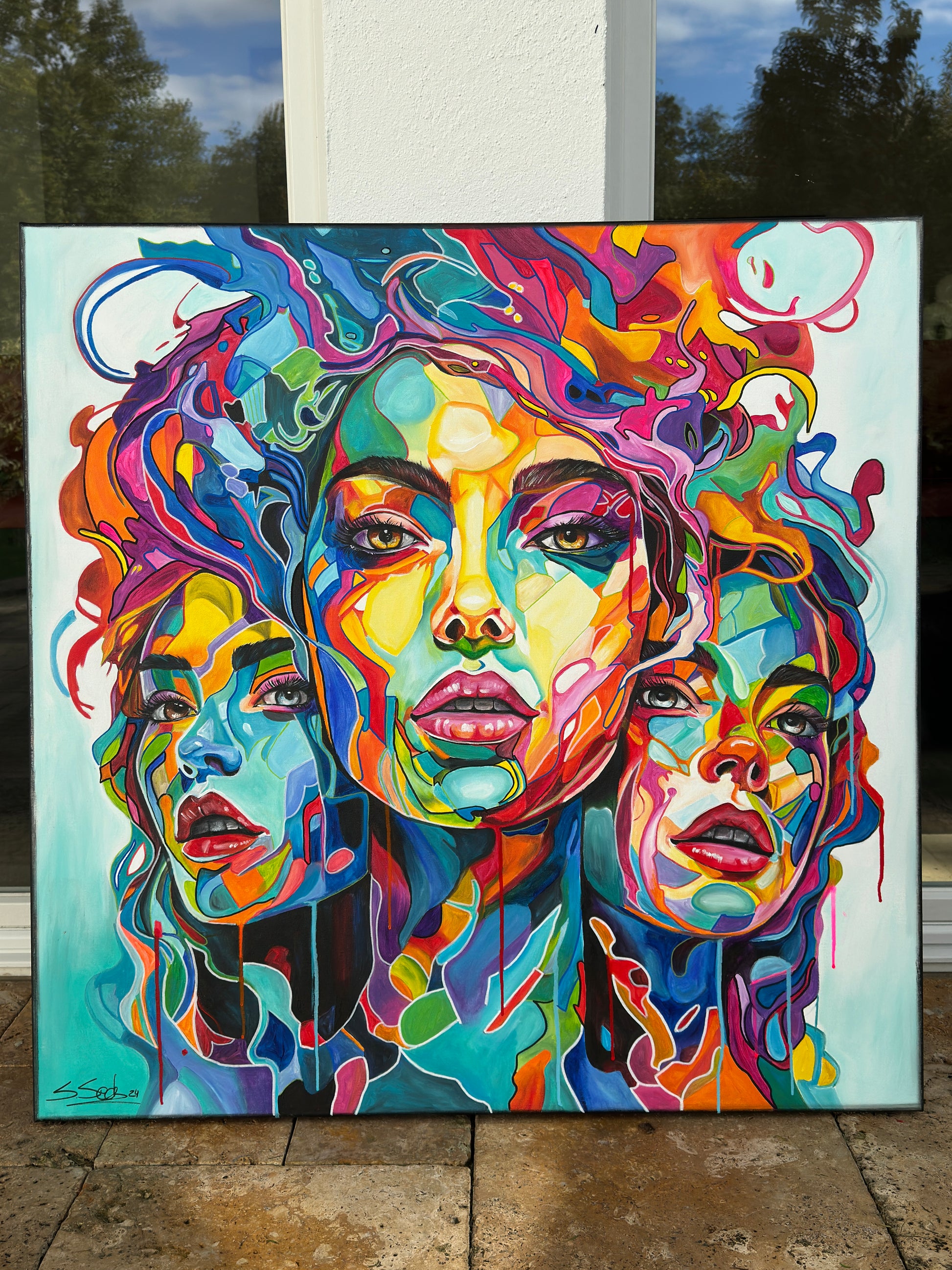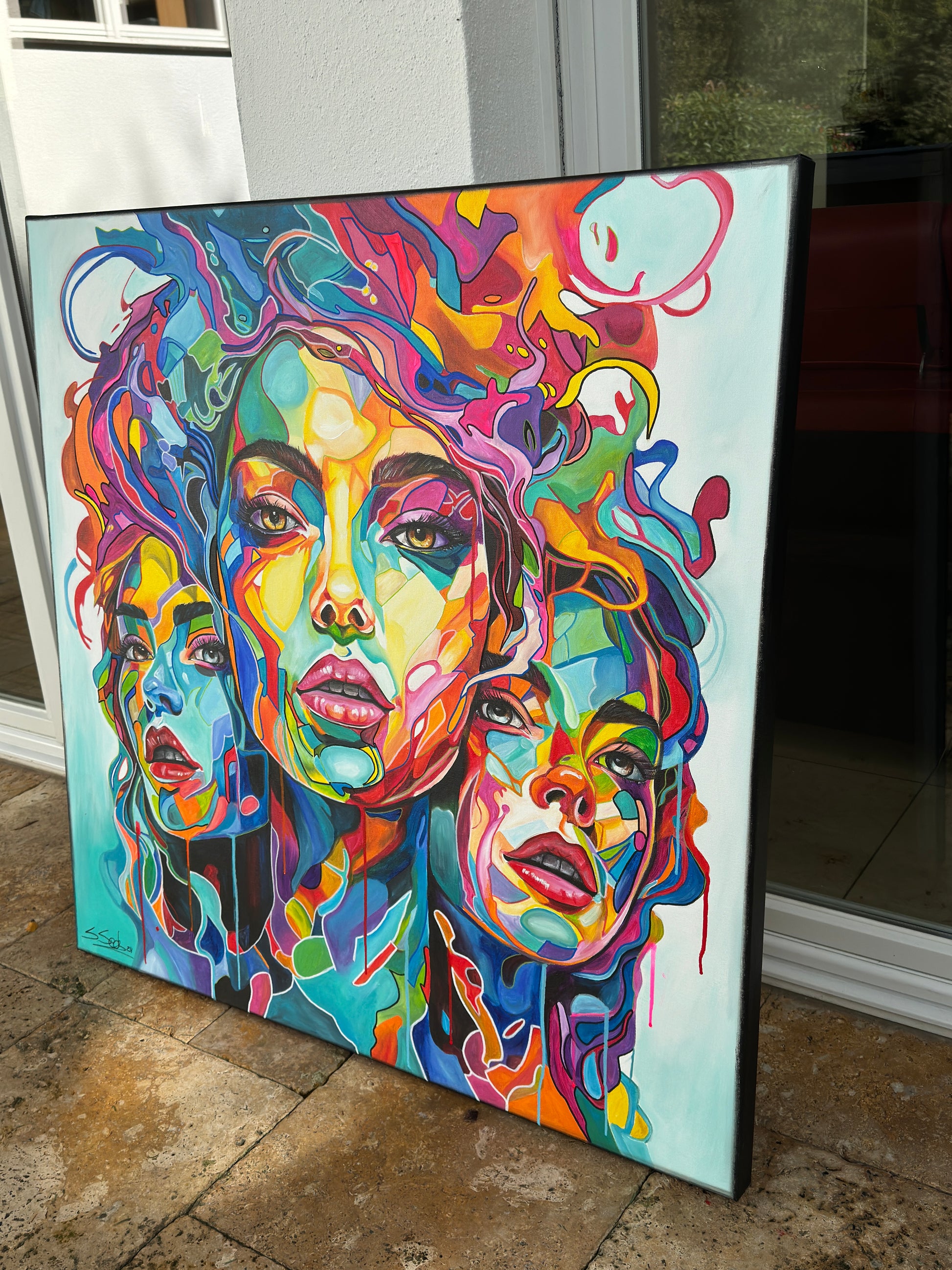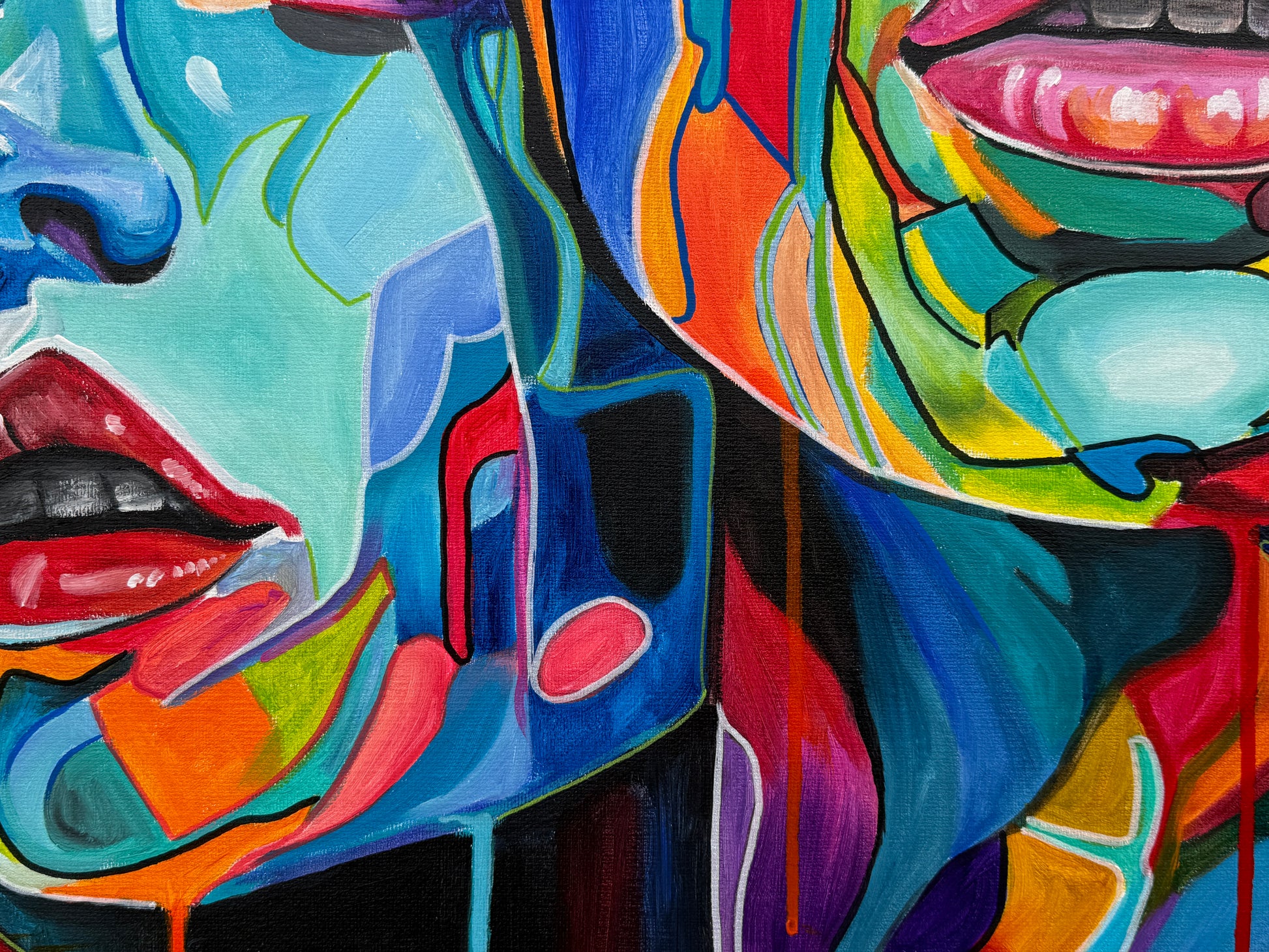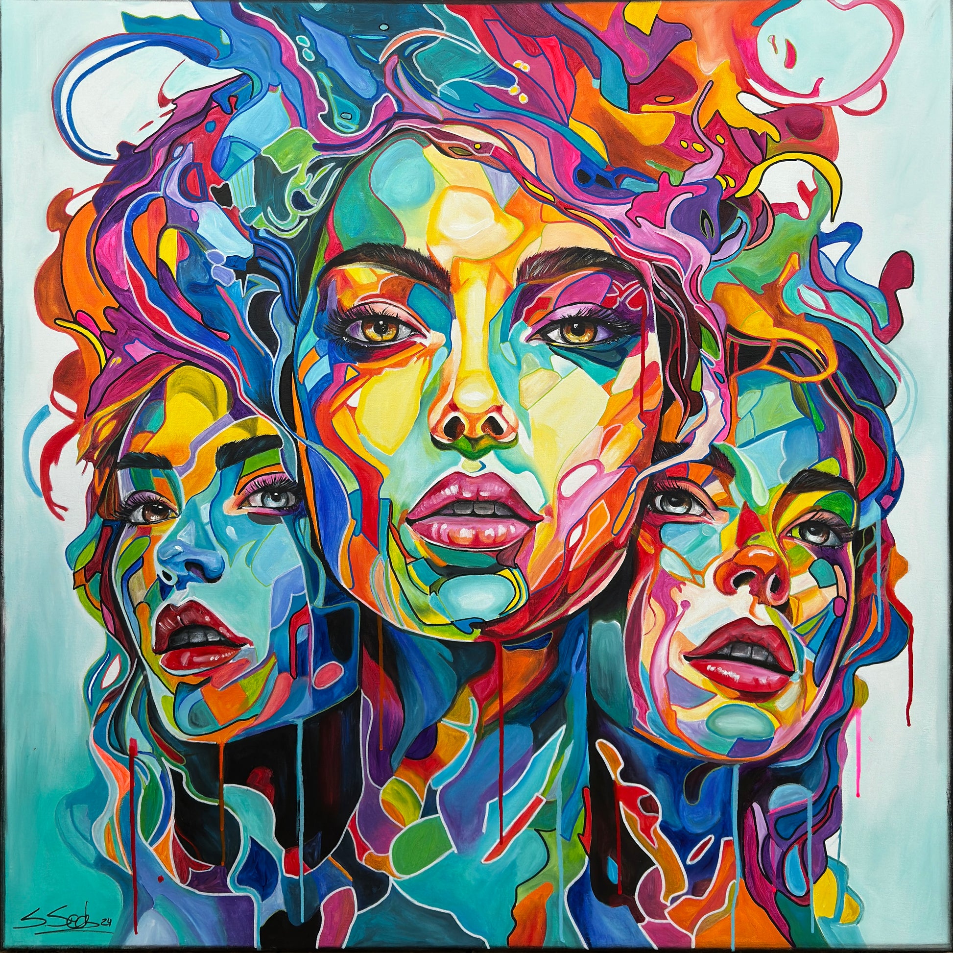 In meinem Werk verschmelzen lebendige Farben und emotionale Ausdrücke zu einer kraftvollen Darstellung menschlicher Emotionen und Beziehungen. Durch eine Kombination von Realismus und Abstraktion erforsche ich die Komplexität der menschlichen Natur und die verbundenen Gefühle. Dieses Gemälde regt zum Nachdenken an und wird eine dynamische und energiegeladene Atmosphäre in jedes Zuhause bringen.