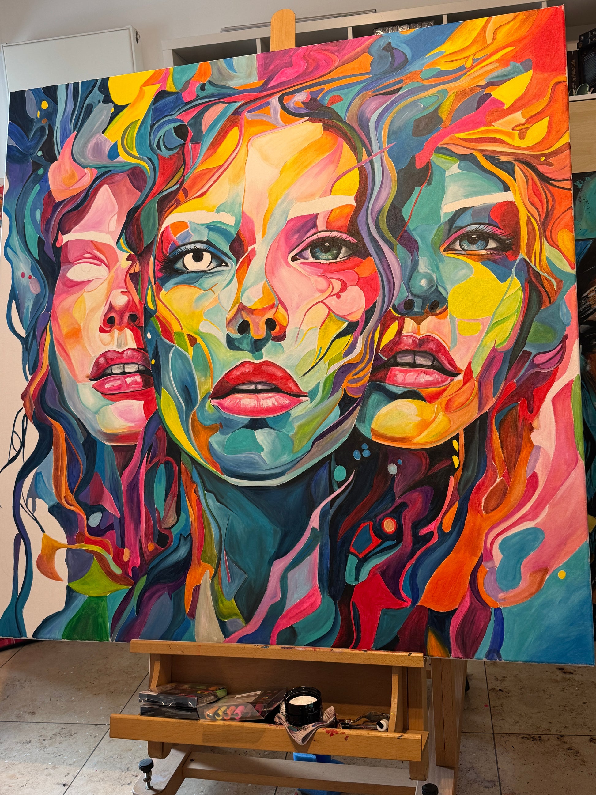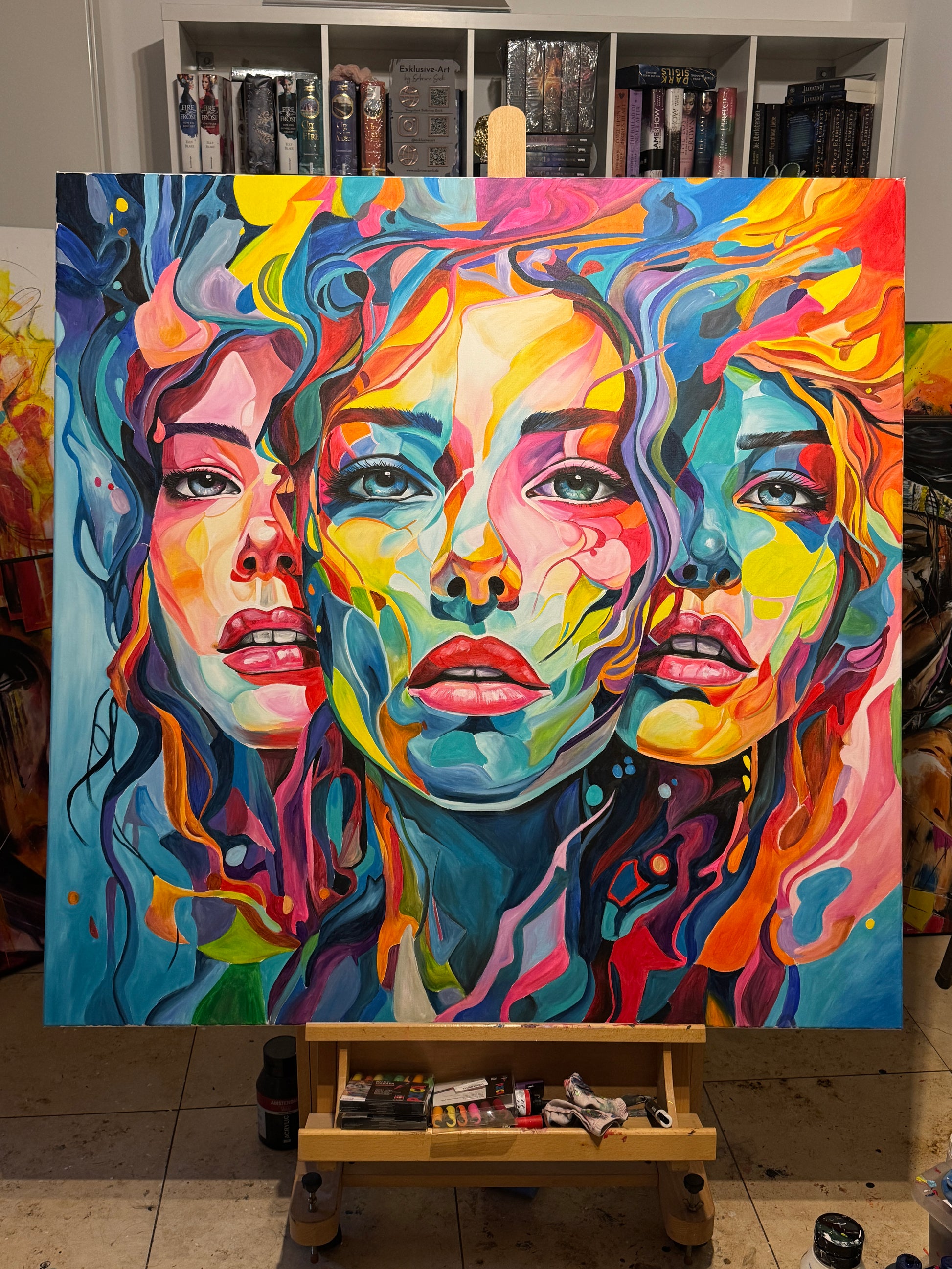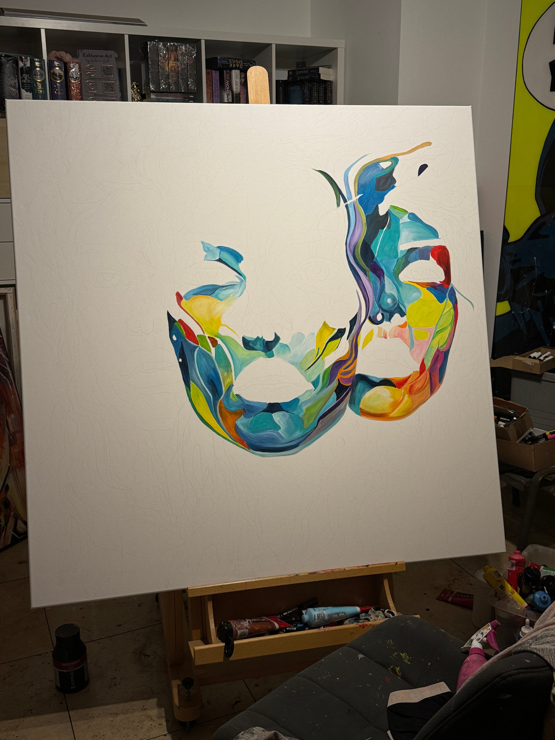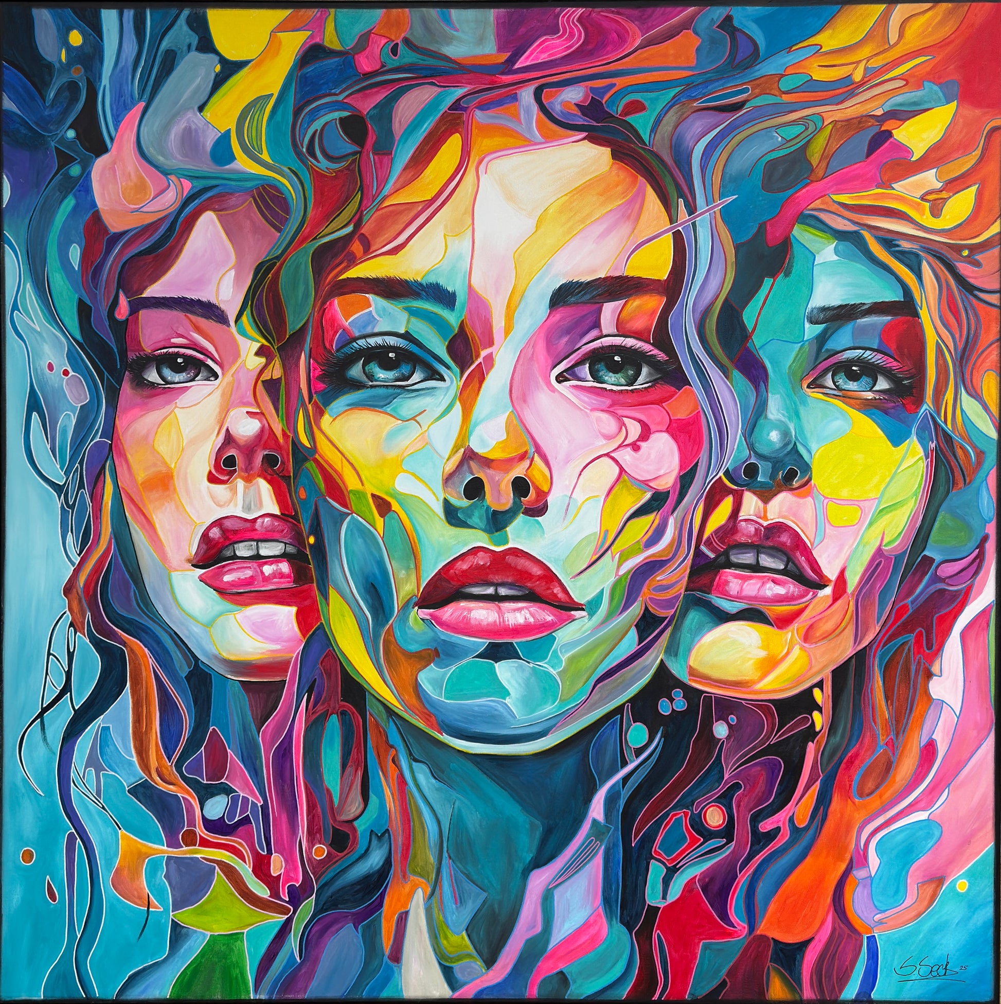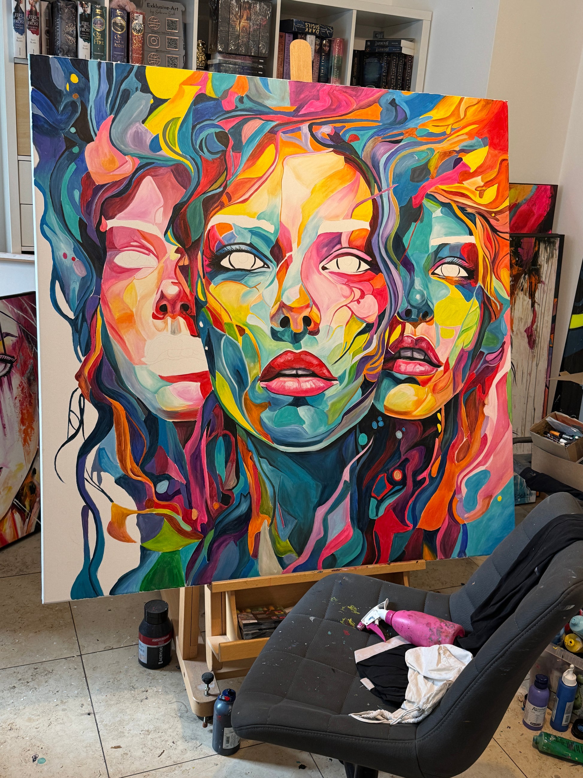 Tiefgehende Emotionen und vielschichtige Persönlichkeiten, die am Ende eine Person ergeben. Die leuchtenden Farbströmungen und die Intensität der Gesichtsausdrücke spiegeln die vielfältigen Facetten menschlicher Erfahrungen und Gefühle wieder. Jede Eigenschaft, jede Facette, jeder düstere oder fröhliche Teil des Menschen werden als weitere Gesichter dargestellt. Manche entwickeln sich noch, andere werden in den Hintergrund gestellt. Manche Menschen haben viele Gesichter, manche nur wenige. Wichtig ist, was sie mit uns machen.