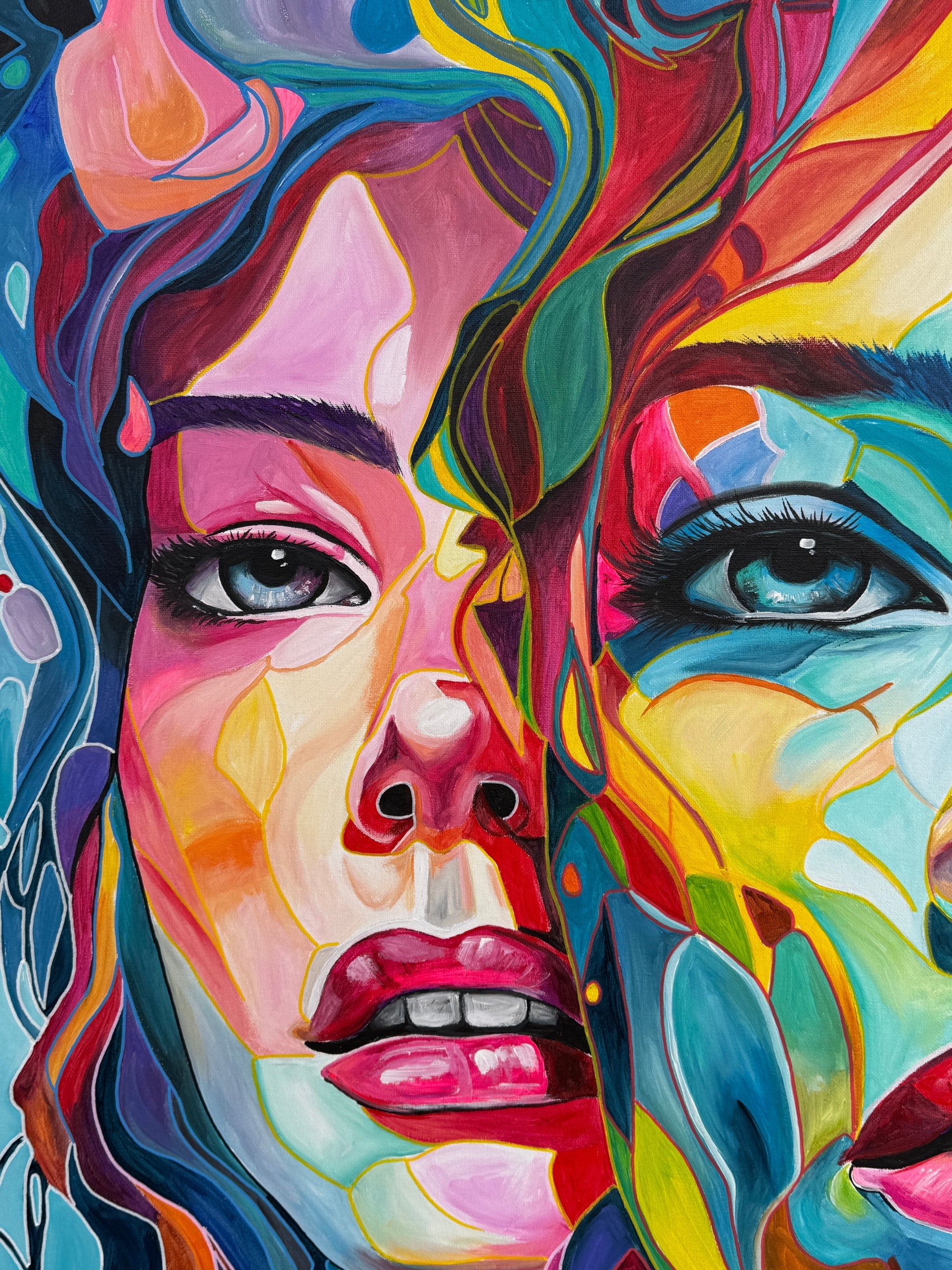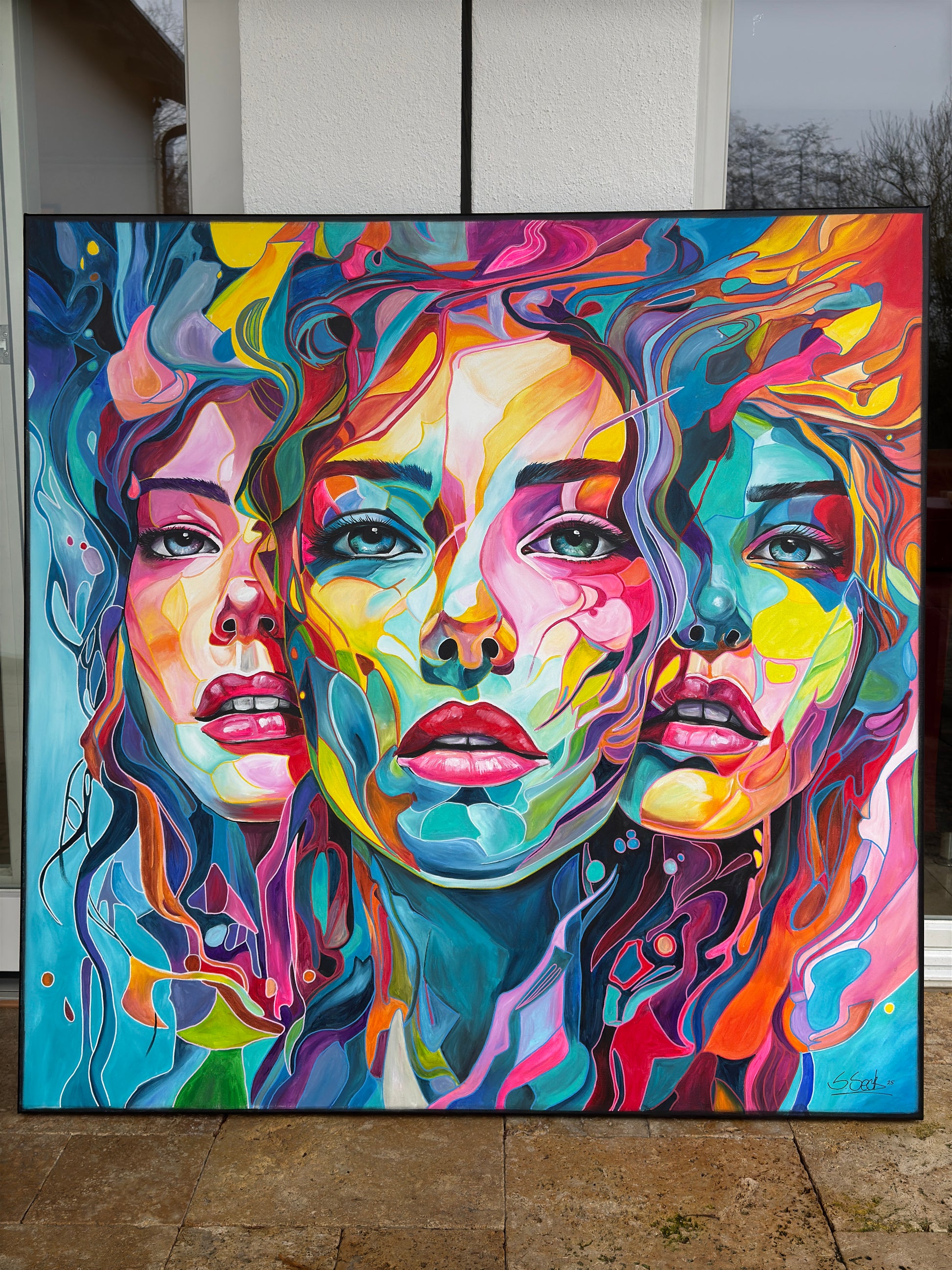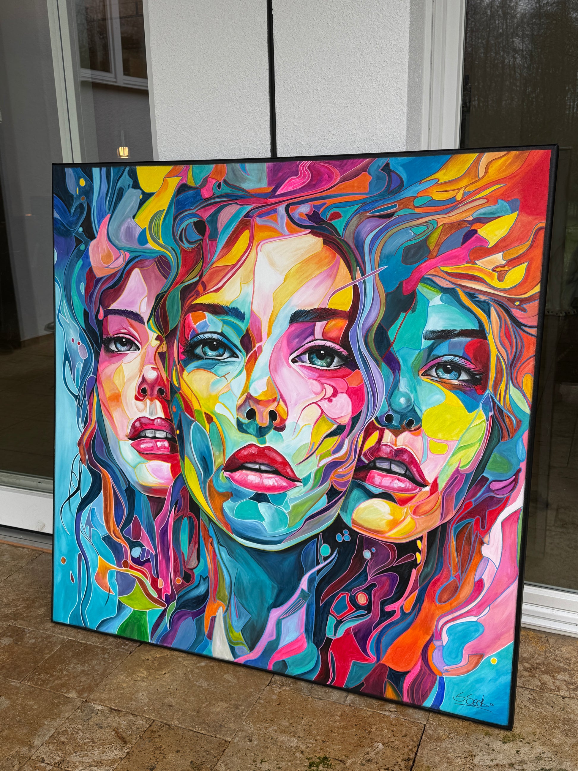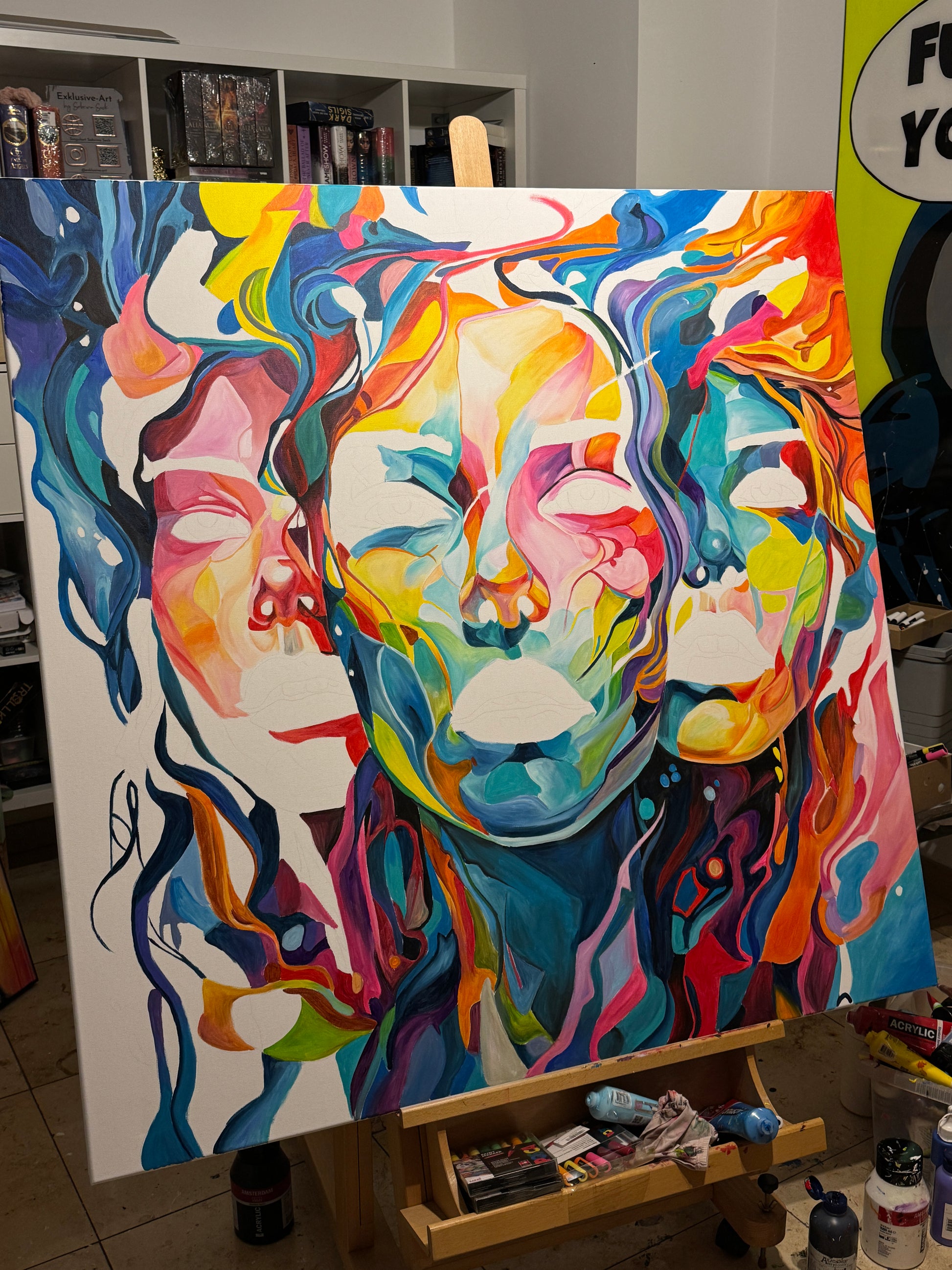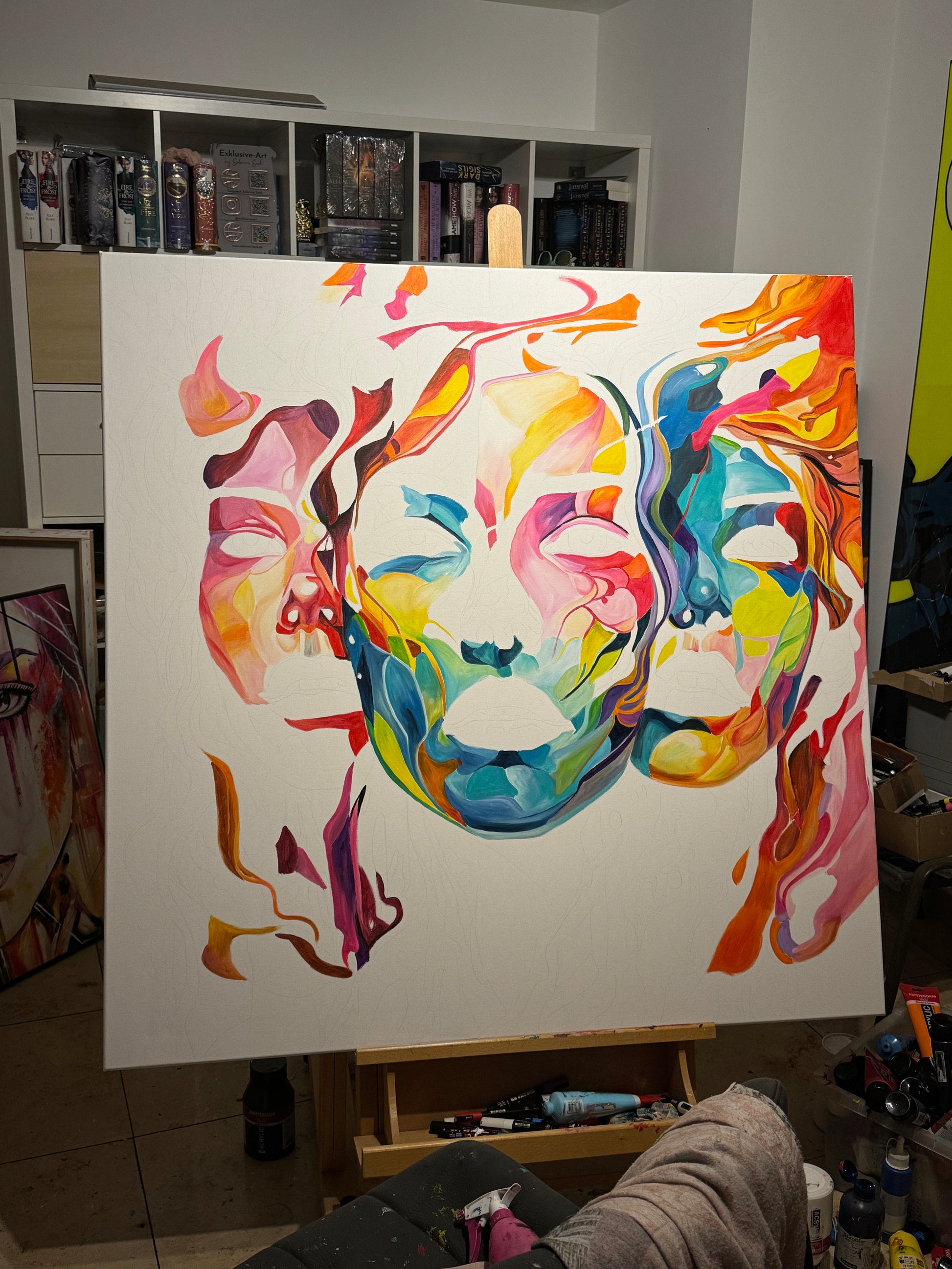 Tiefgehende Emotionen und vielschichtige Persönlichkeiten, die am Ende eine Person ergeben. Die leuchtenden Farbströmungen und die Intensität der Gesichtsausdrücke spiegeln die vielfältigen Facetten menschlicher Erfahrungen und Gefühle wieder. Jede Eigenschaft, jede Facette, jeder düstere oder fröhliche Teil des Menschen werden als weitere Gesichter dargestellt. Manche entwickeln sich noch, andere werden in den Hintergrund gestellt. Manche Menschen haben viele Gesichter, manche nur wenige. Wichtig ist, was sie mit uns machen.