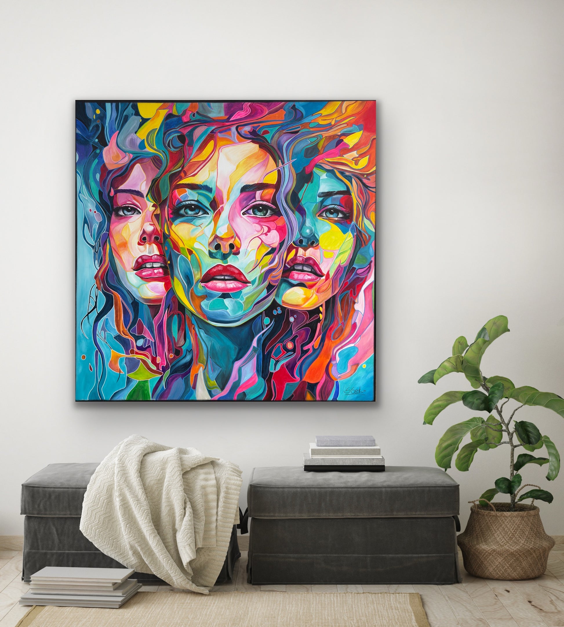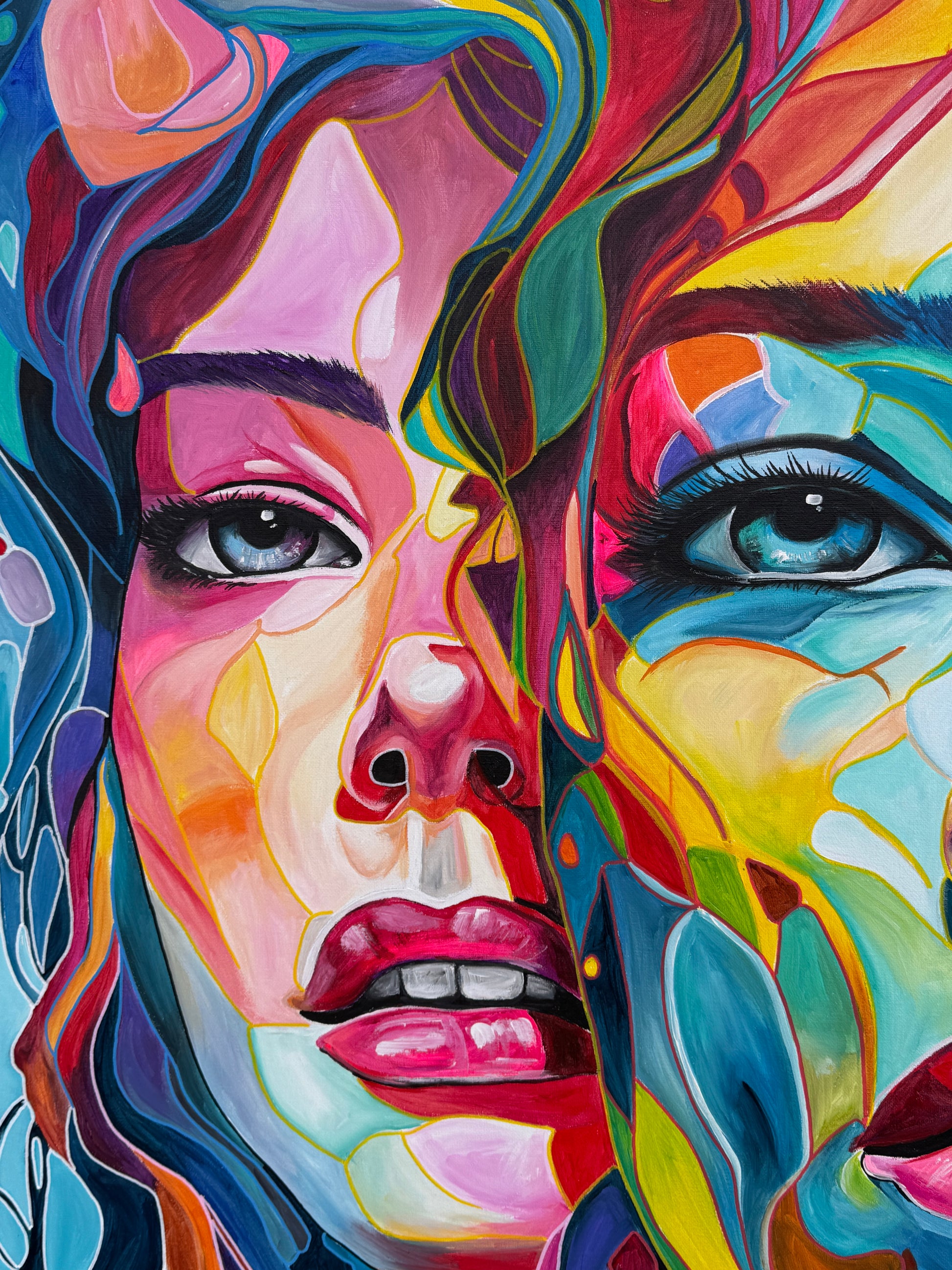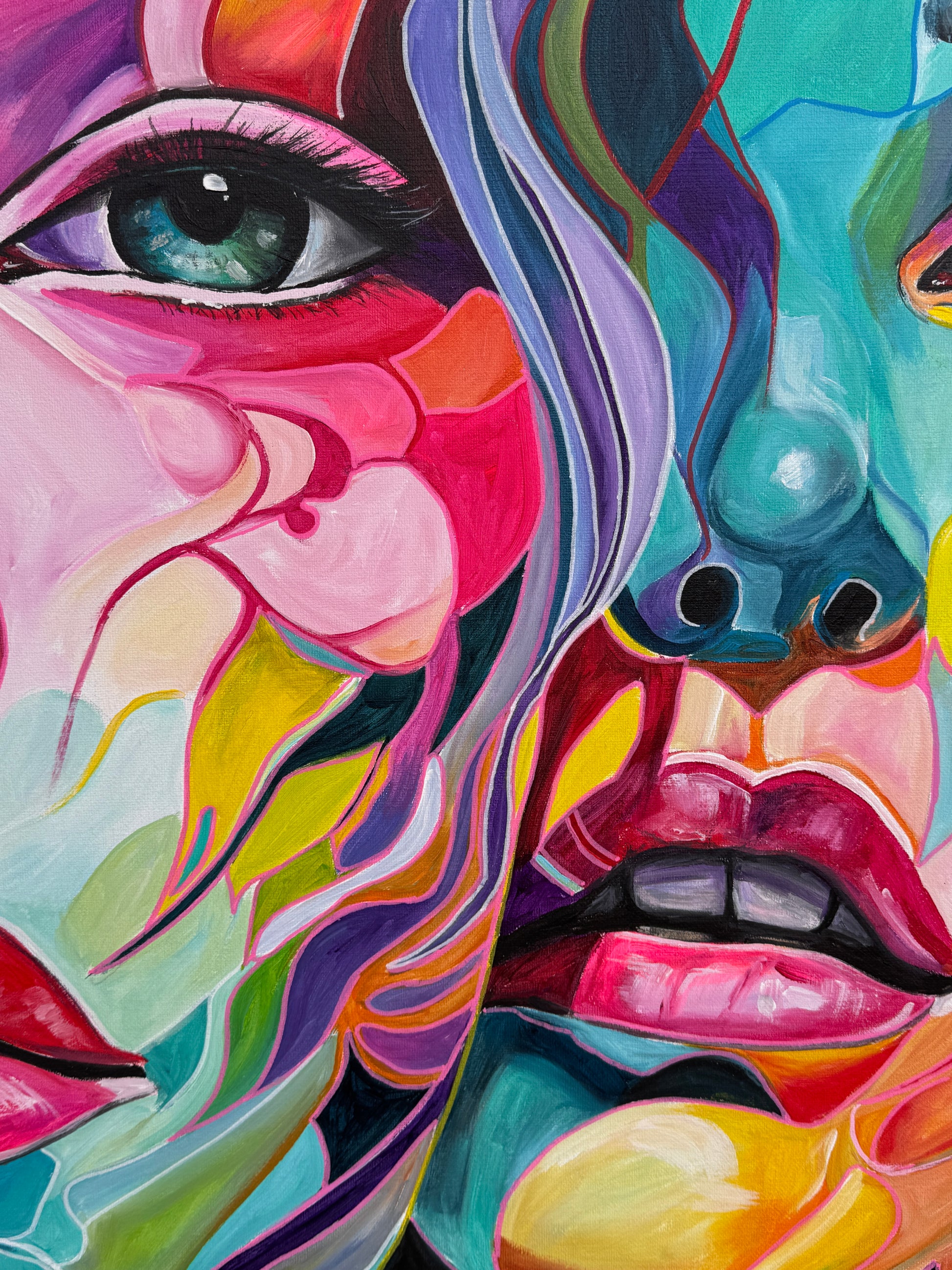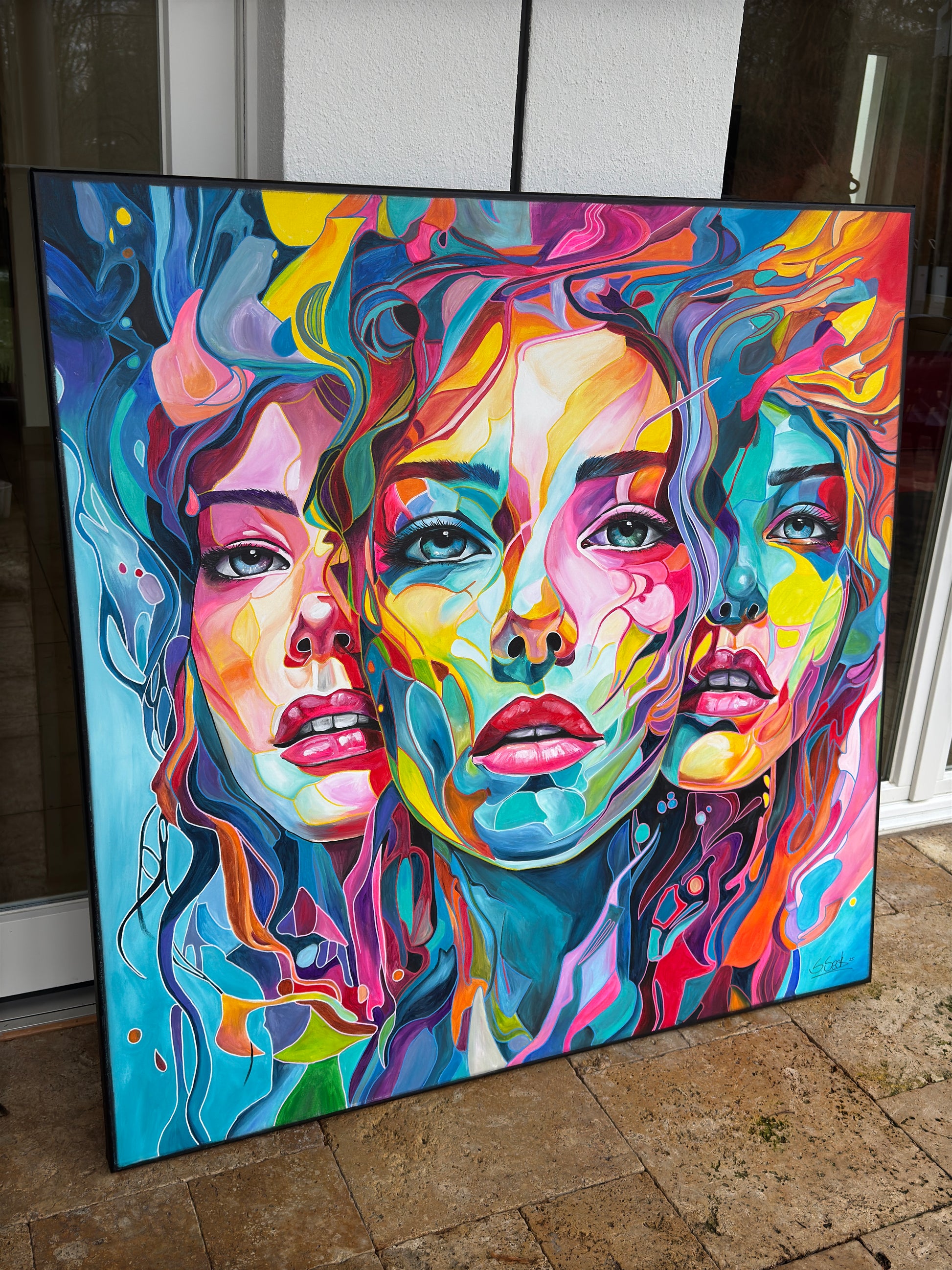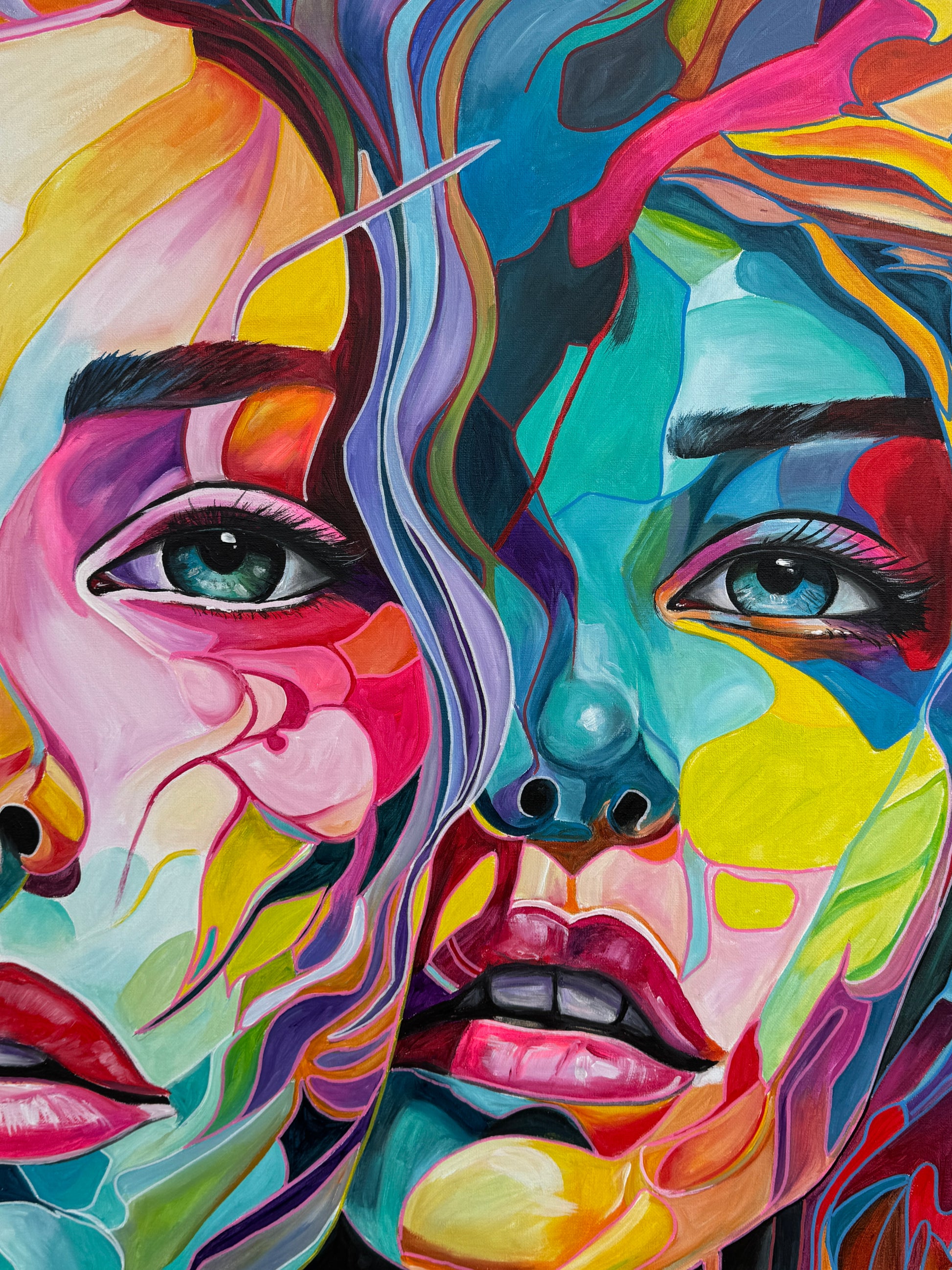Tiefgehende Emotionen und vielschichtige Persönlichkeiten, die am Ende eine Person ergeben. Die leuchtenden Farbströmungen und die Intensität der Gesichtsausdrücke spiegeln die vielfältigen Facetten menschlicher Erfahrungen und Gefühle wieder. Jede Eigenschaft, jede Facette, jeder düstere oder fröhliche Teil des Menschen werden als weitere Gesichter dargestellt. Manche entwickeln sich noch, andere werden in den Hintergrund gestellt. Manche Menschen haben viele Gesichter, manche nur wenige. Wichtig ist, was sie mit uns machen.