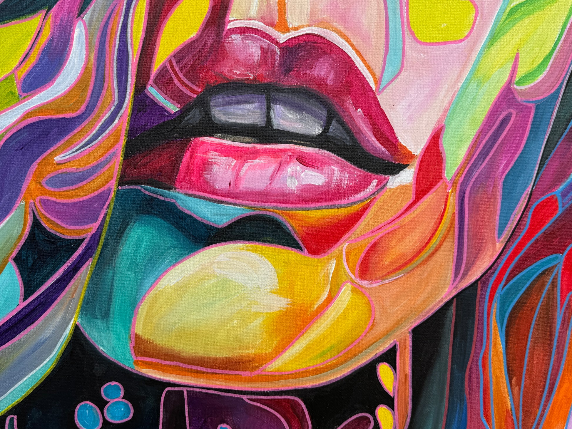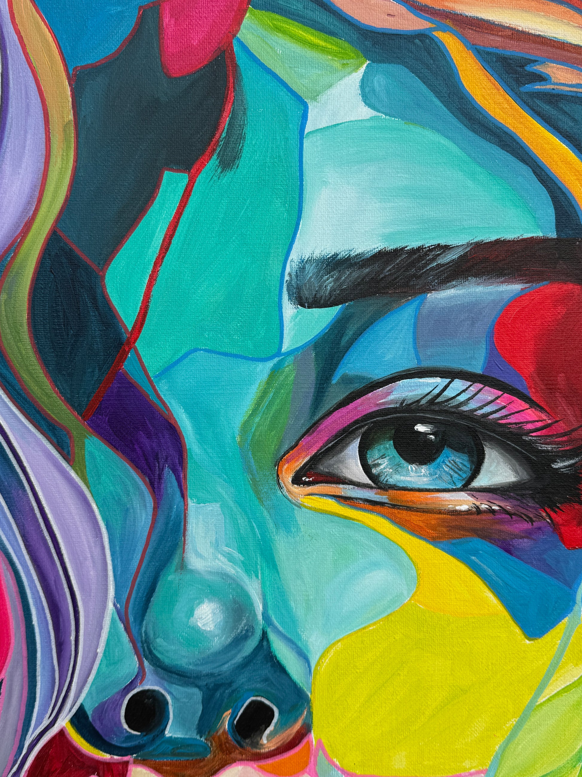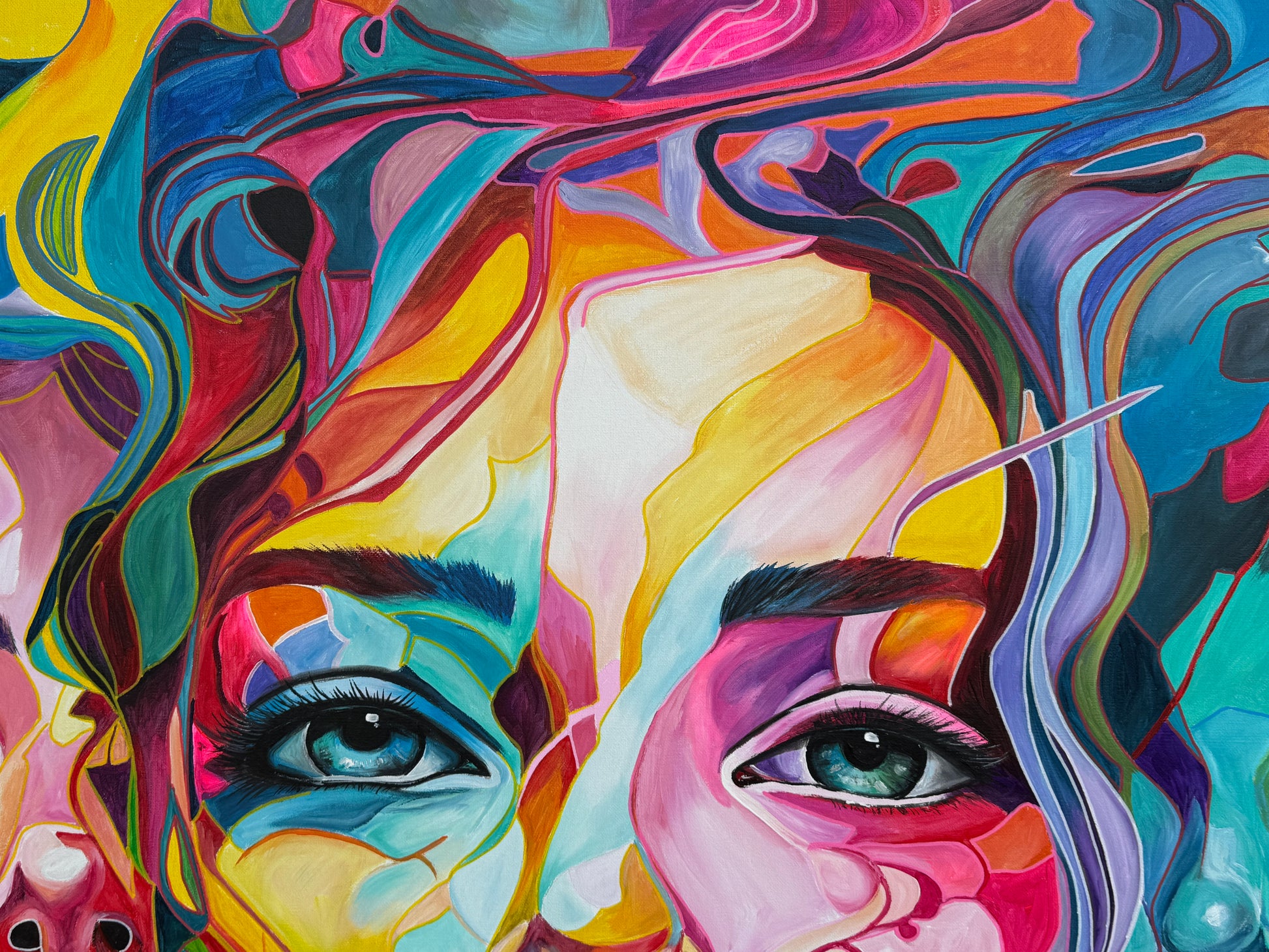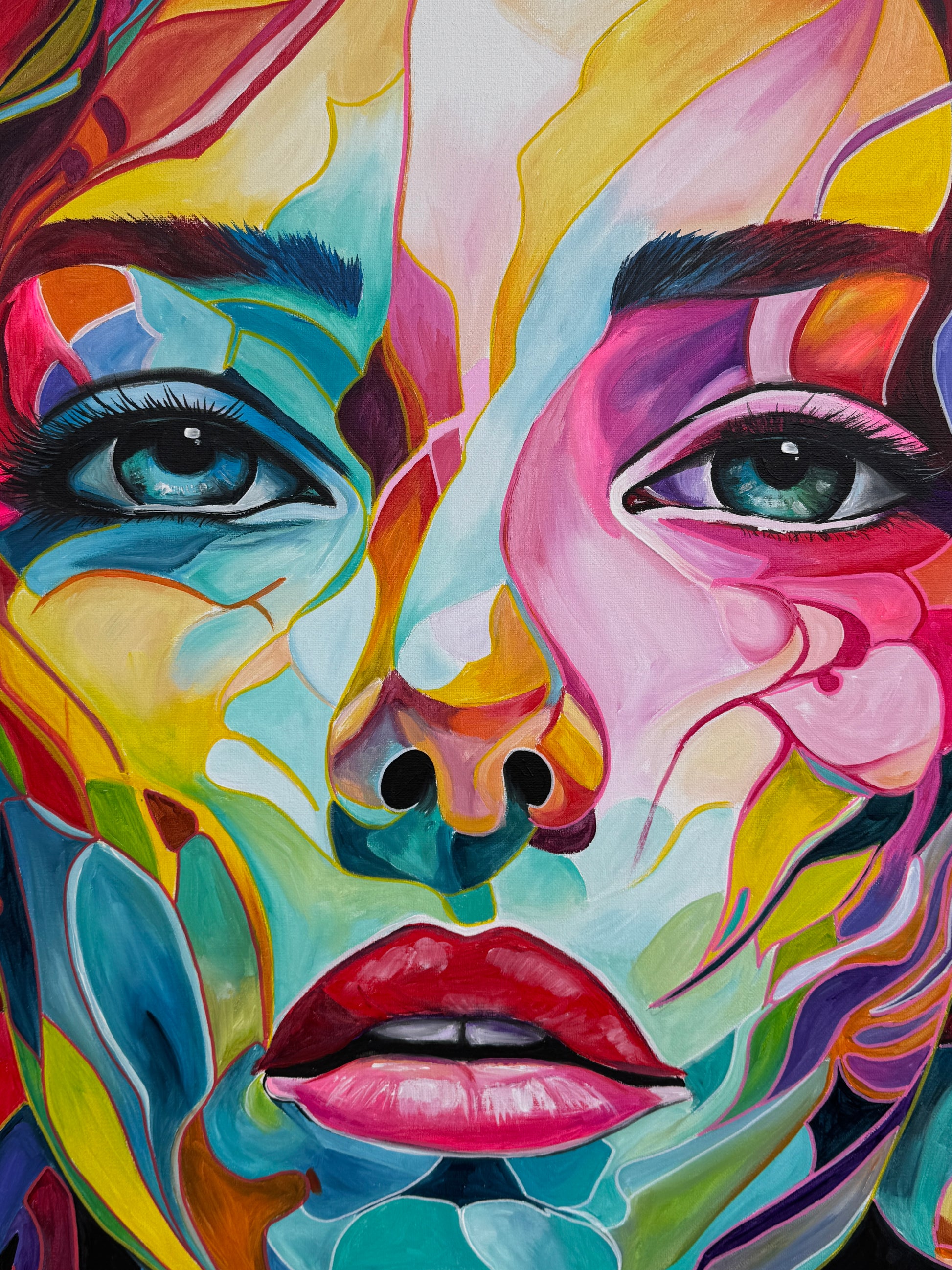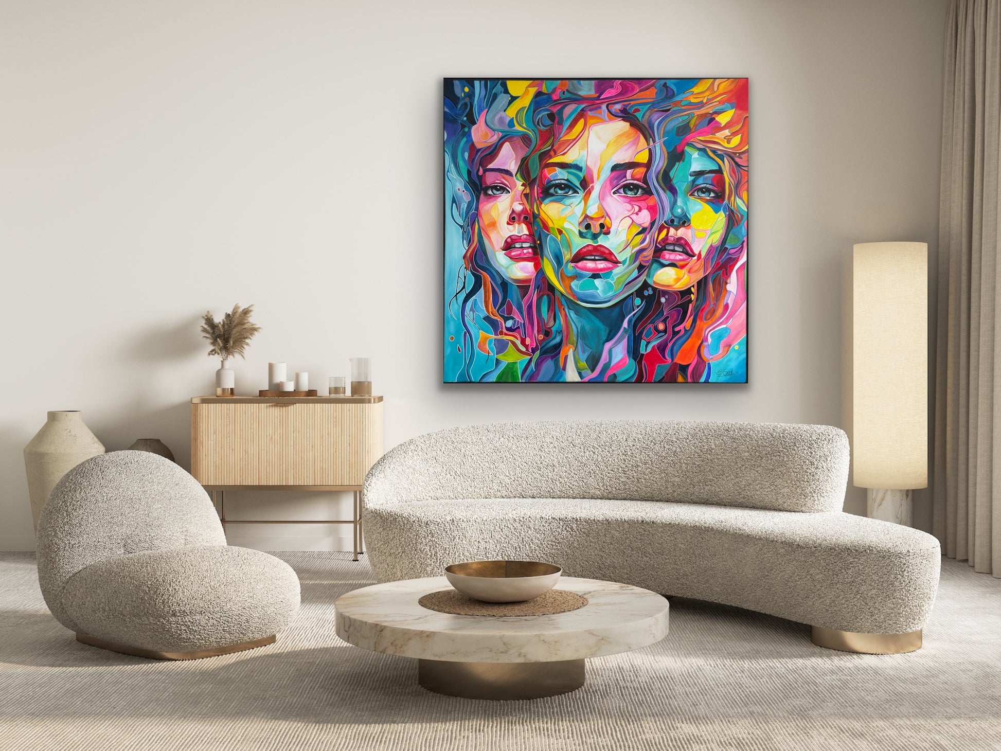 Tiefgehende Emotionen und vielschichtige Persönlichkeiten, die am Ende eine Person ergeben. Die leuchtenden Farbströmungen und die Intensität der Gesichtsausdrücke spiegeln die vielfältigen Facetten menschlicher Erfahrungen und Gefühle wieder. Jede Eigenschaft, jede Facette, jeder düstere oder fröhliche Teil des Menschen werden als weitere Gesichter dargestellt. Manche entwickeln sich noch, andere werden in den Hintergrund gestellt. Manche Menschen haben viele Gesichter, manche nur wenige. Wichtig ist, was sie mit uns machen.