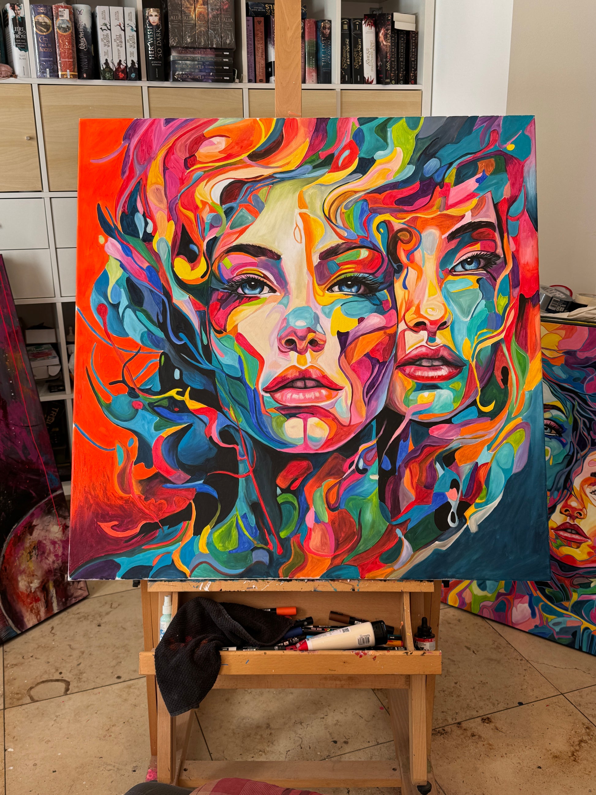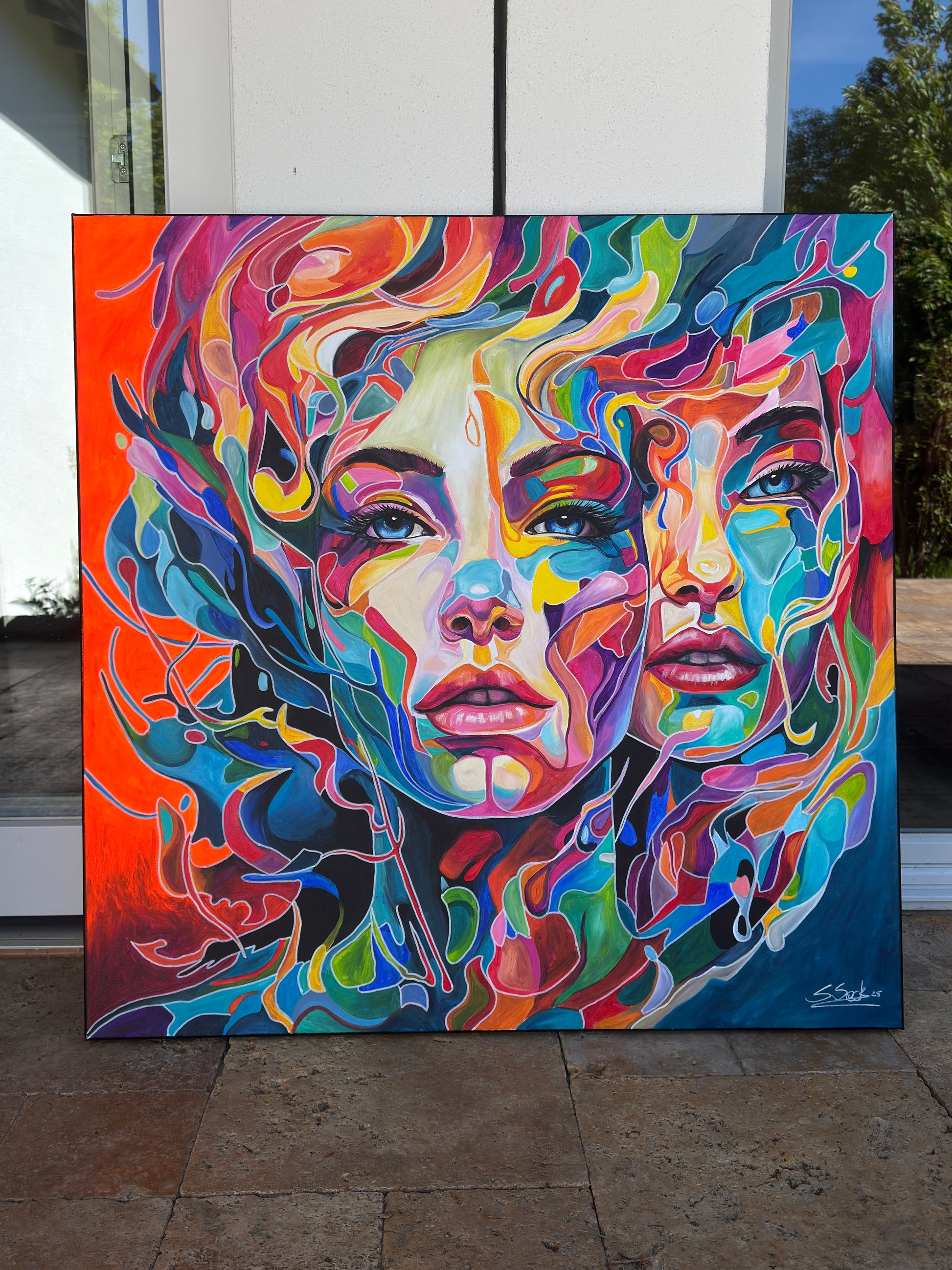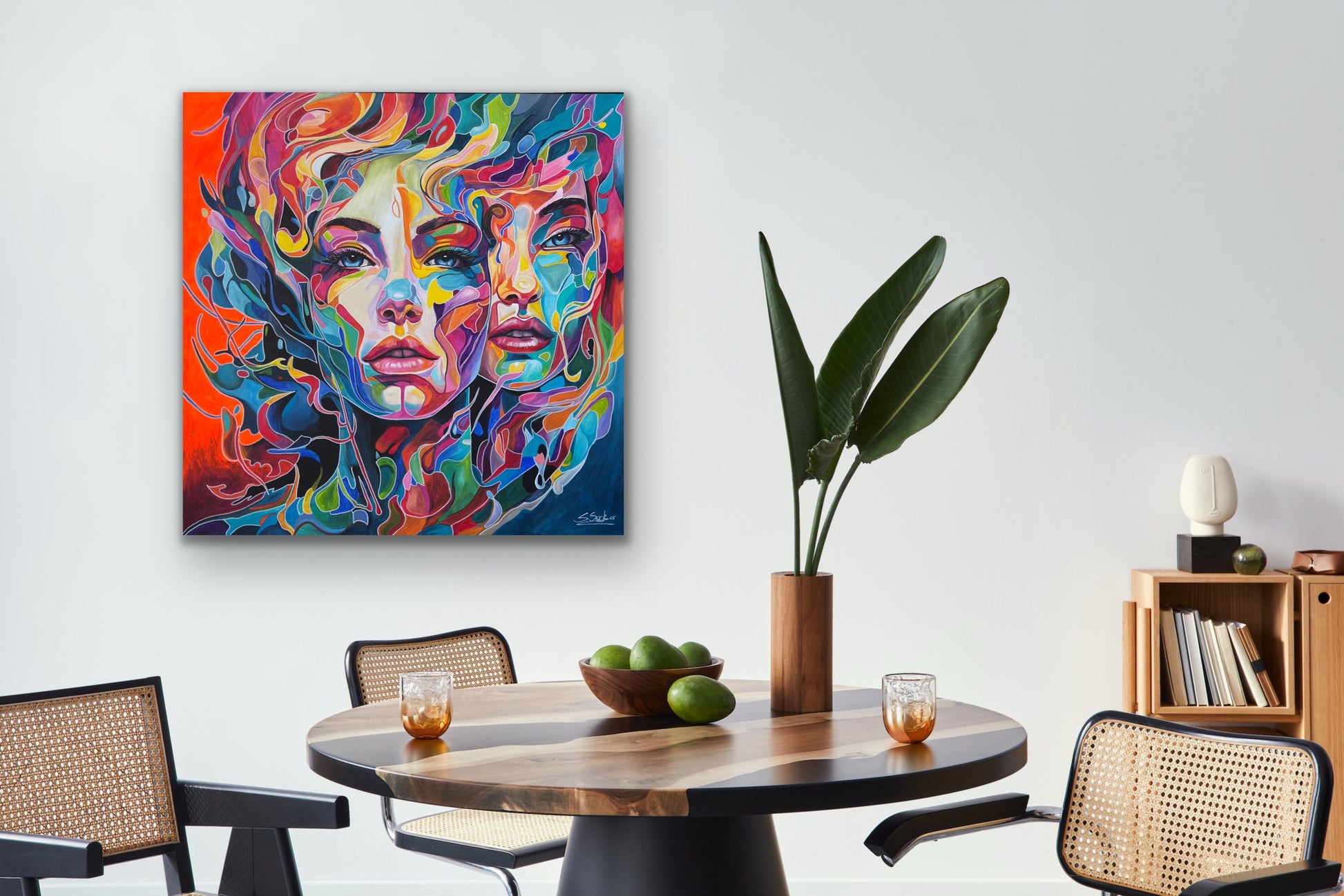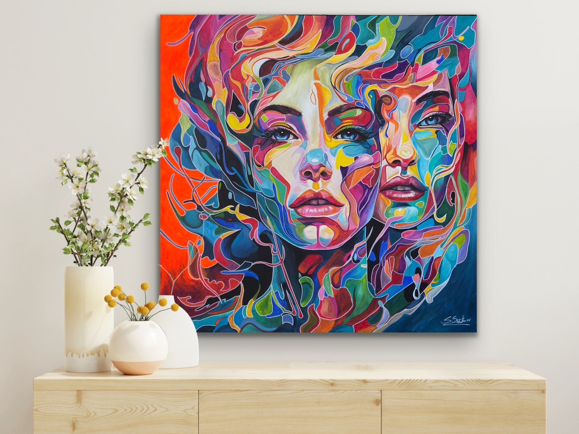 In meinem Werk verschmelzen lebhafte Farben und emotionale Ausdrücke zu einer dynamischen Darstellung menschlicher Verbundenheit und Vielschichtigkeit. Die intensiven, fließenden Linien und kühnen Farbtöne in Acryl betonen die Tiefen und Nuancen der menschlichen Psyche, eingefangen in einem Moment der Reflexion und des inneren Dialogs. Dieses Bild soll die Betrachter dazu anregen, die Farbenpracht der individuellen Gedankenwelten zu erkunden und die Kraft der künstlerischen Selbstexpression zu feiern. Es bringt Energie und Inspiration in jedes Zuhause, indem es täglich zum Nachdenken und Fühlen anregt.