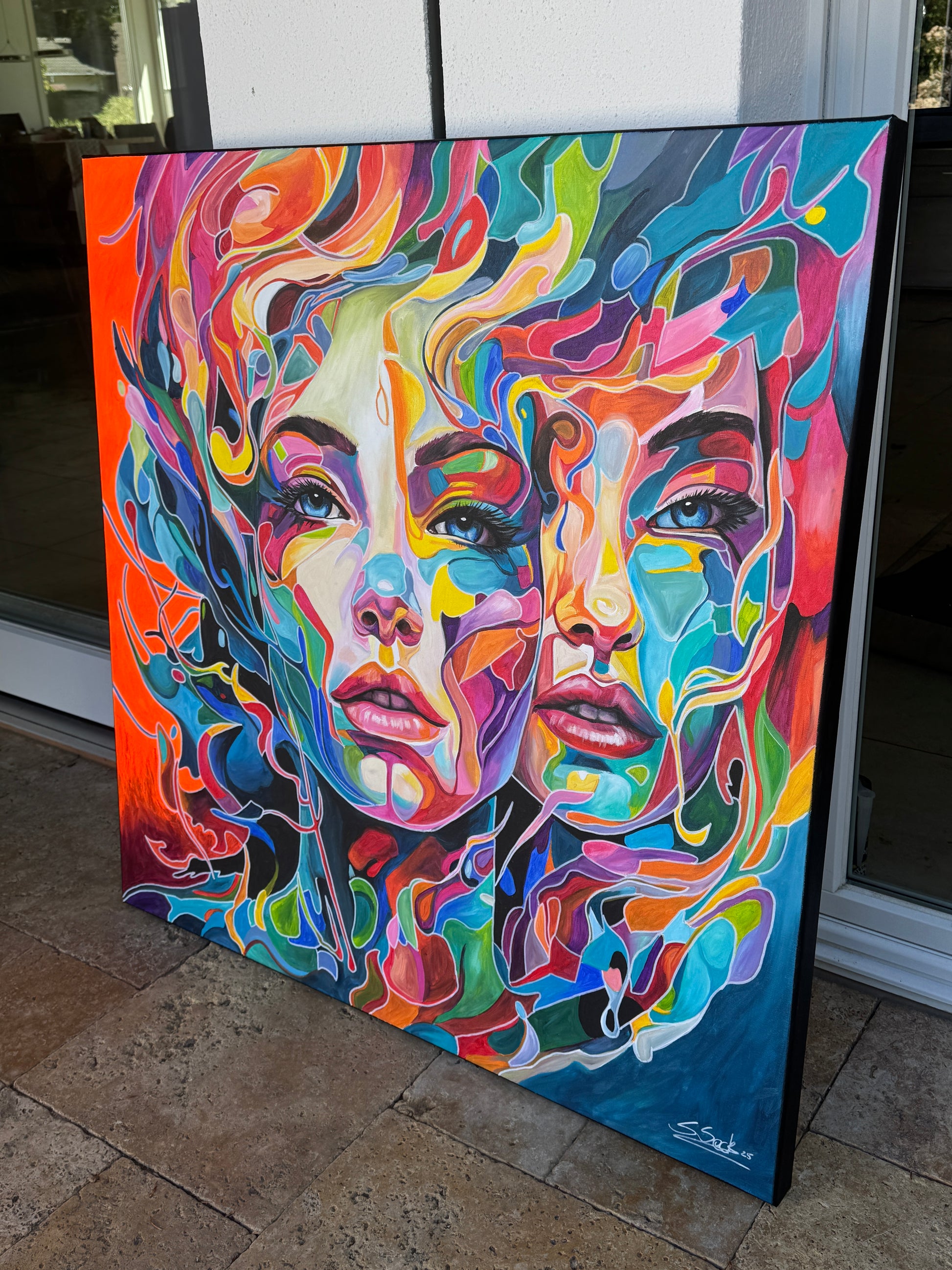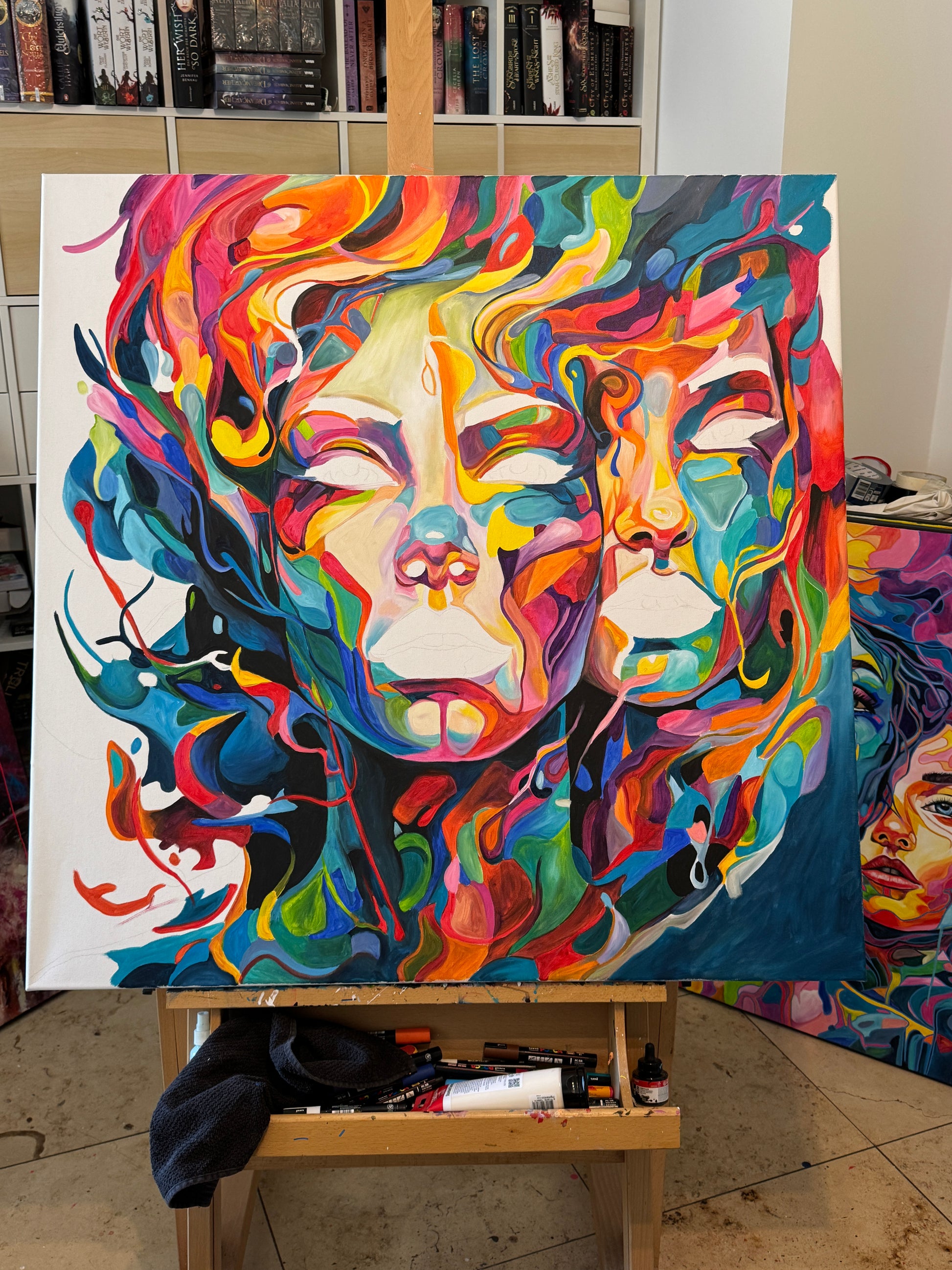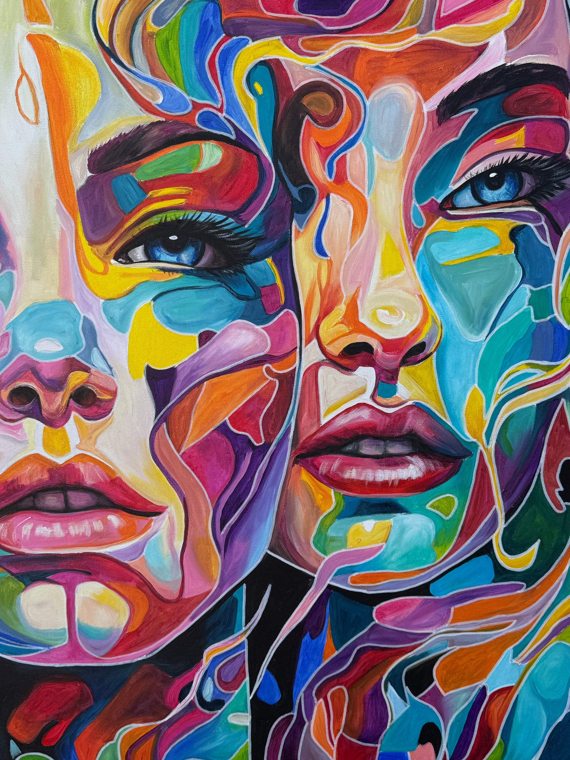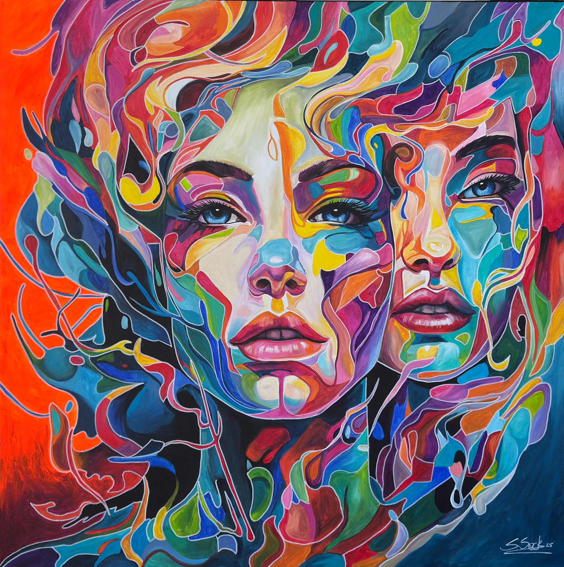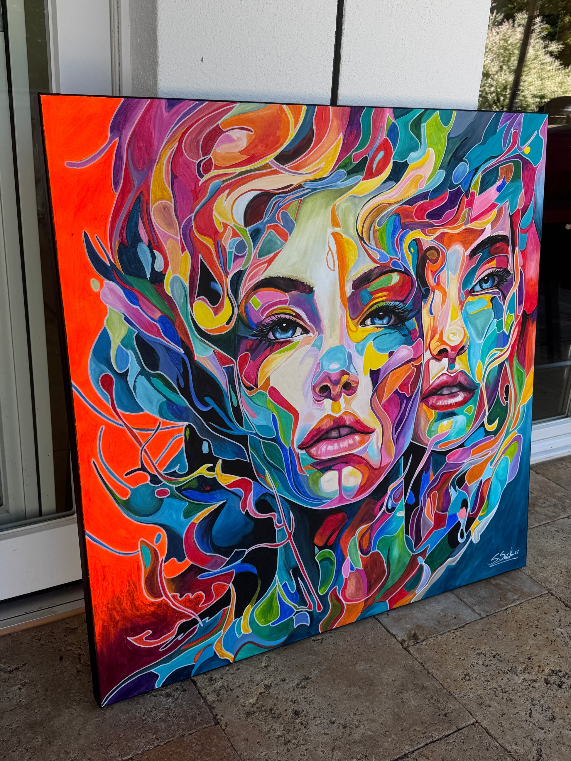 In meinem Werk verschmelzen lebhafte Farben und emotionale Ausdrücke zu einer dynamischen Darstellung menschlicher Verbundenheit und Vielschichtigkeit. Die intensiven, fließenden Linien und kühnen Farbtöne in Acryl betonen die Tiefen und Nuancen der menschlichen Psyche, eingefangen in einem Moment der Reflexion und des inneren Dialogs. Dieses Bild soll die Betrachter dazu anregen, die Farbenpracht der individuellen Gedankenwelten zu erkunden und die Kraft der künstlerischen Selbstexpression zu feiern. Es bringt Energie und Inspiration in jedes Zuhause, indem es täglich zum Nachdenken und Fühlen anregt.