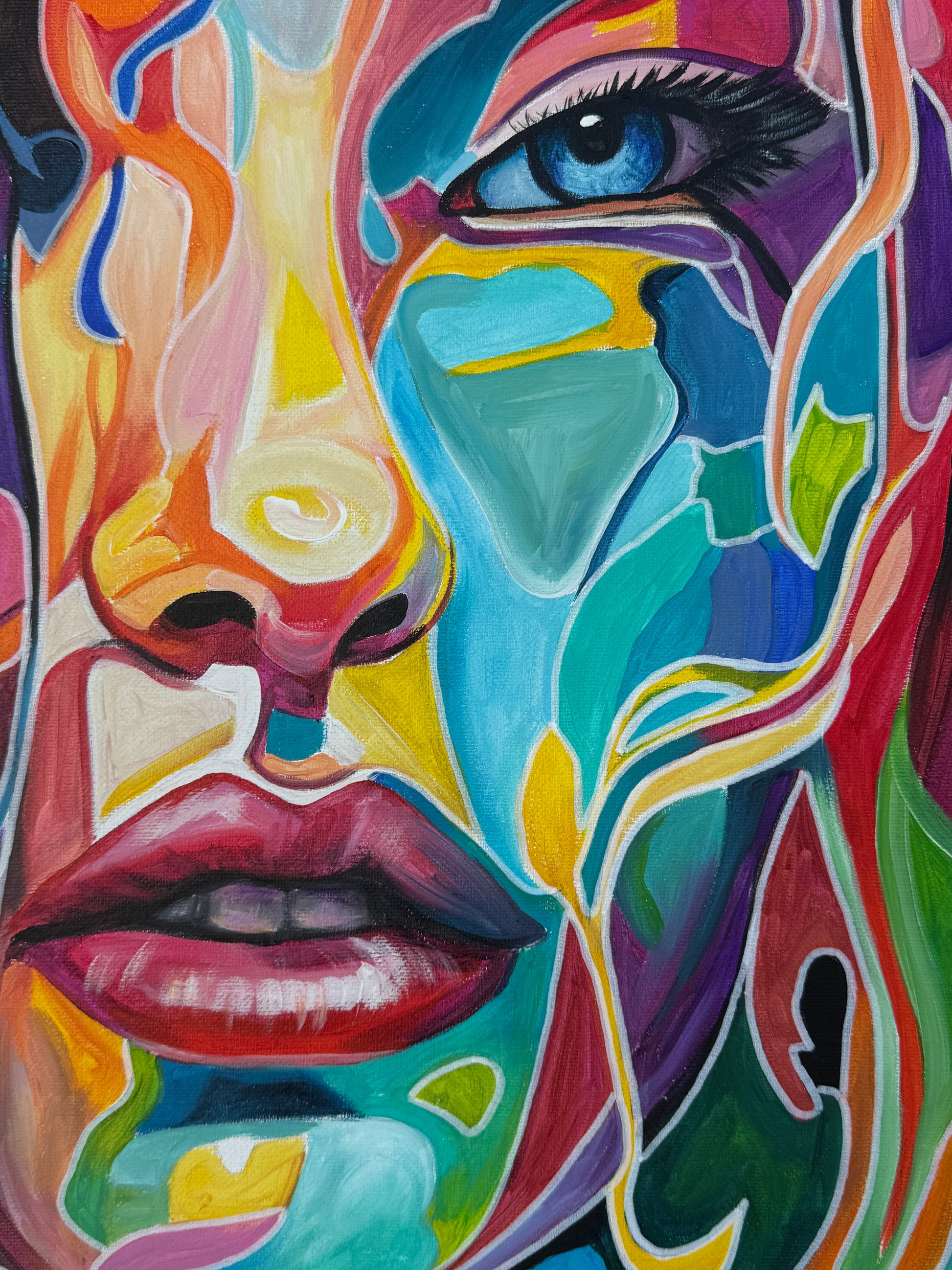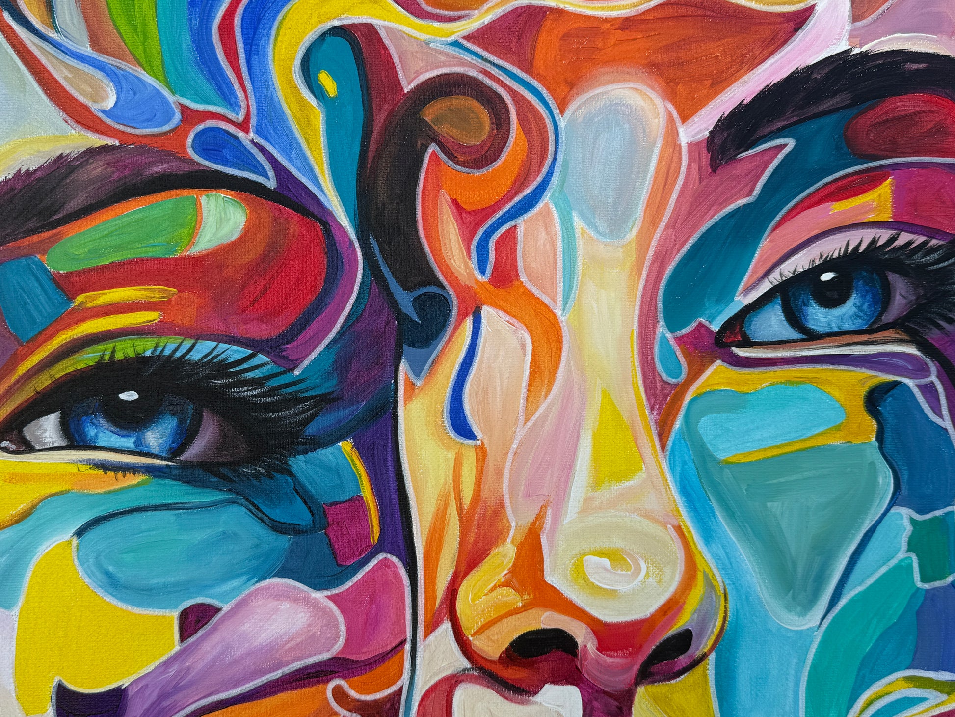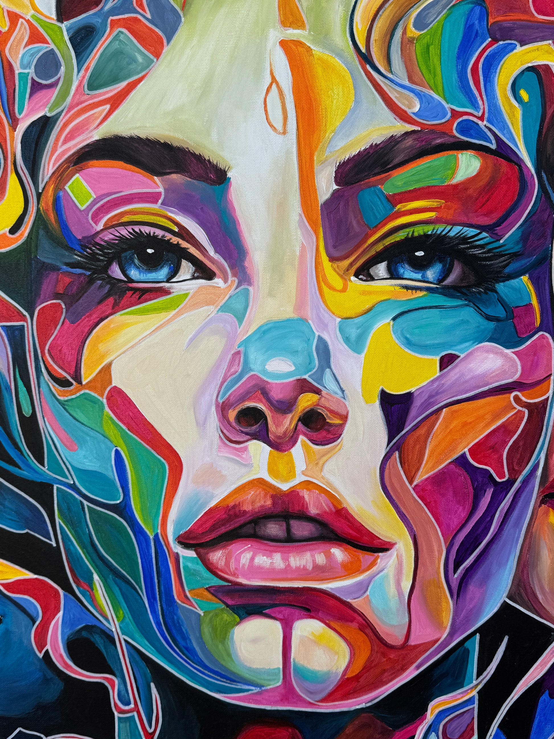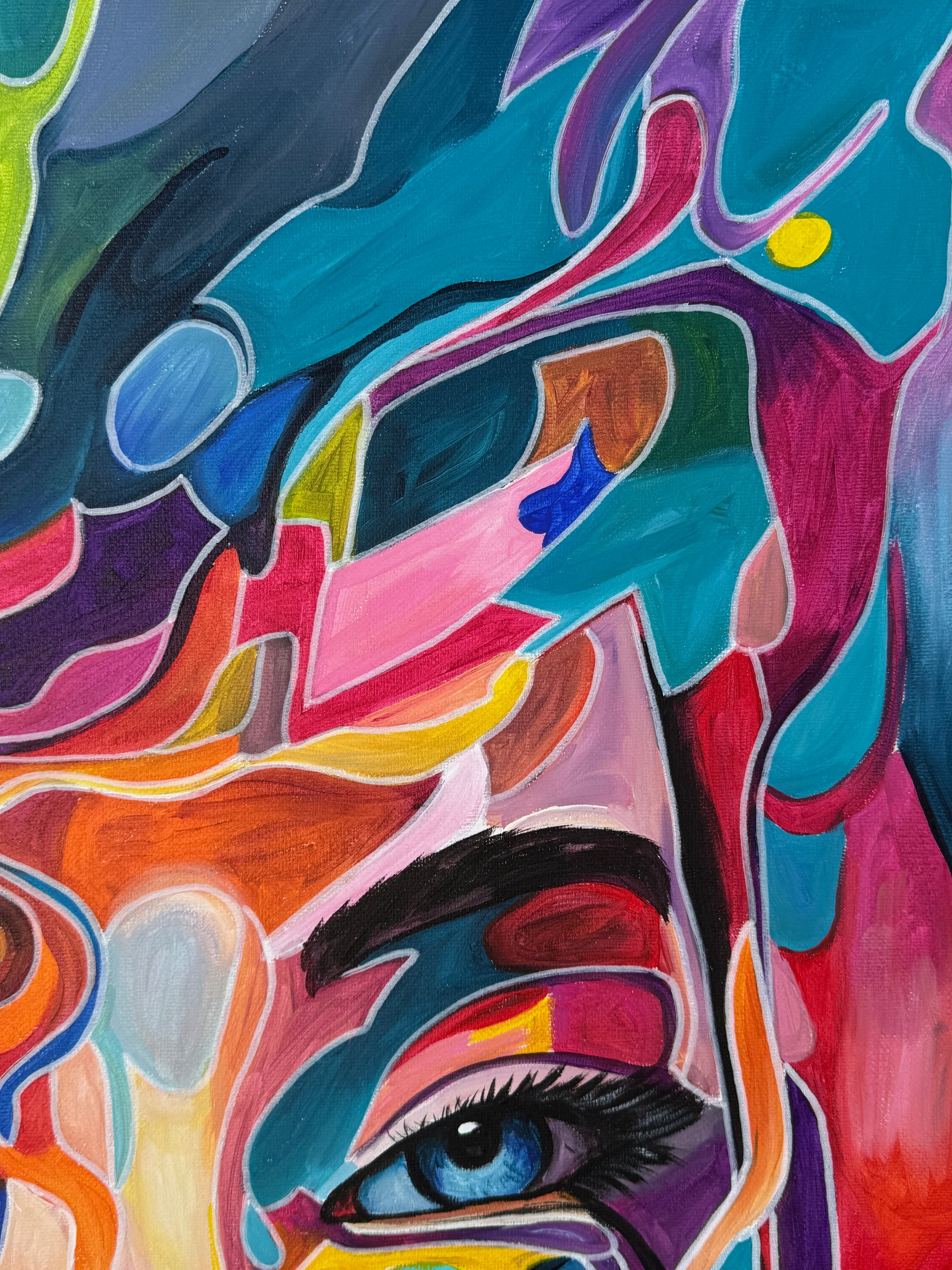 In meinem Werk verschmelzen lebhafte Farben und emotionale Ausdrücke zu einer dynamischen Darstellung menschlicher Verbundenheit und Vielschichtigkeit. Die intensiven, fließenden Linien und kühnen Farbtöne in Acryl betonen die Tiefen und Nuancen der menschlichen Psyche, eingefangen in einem Moment der Reflexion und des inneren Dialogs. Dieses Bild soll die Betrachter dazu anregen, die Farbenpracht der individuellen Gedankenwelten zu erkunden und die Kraft der künstlerischen Selbstexpression zu feiern. Es bringt Energie und Inspiration in jedes Zuhause, indem es täglich zum Nachdenken und Fühlen anregt.