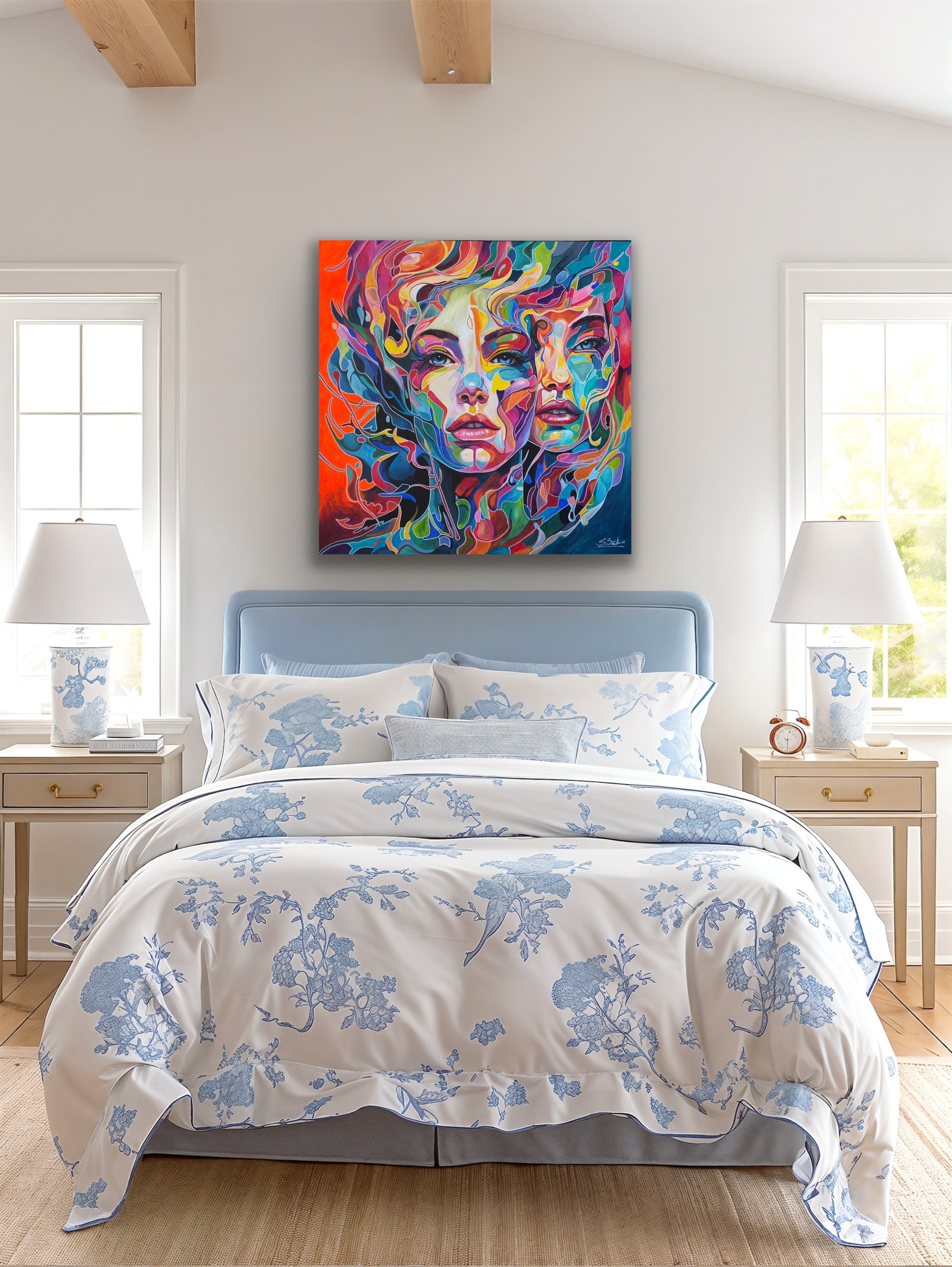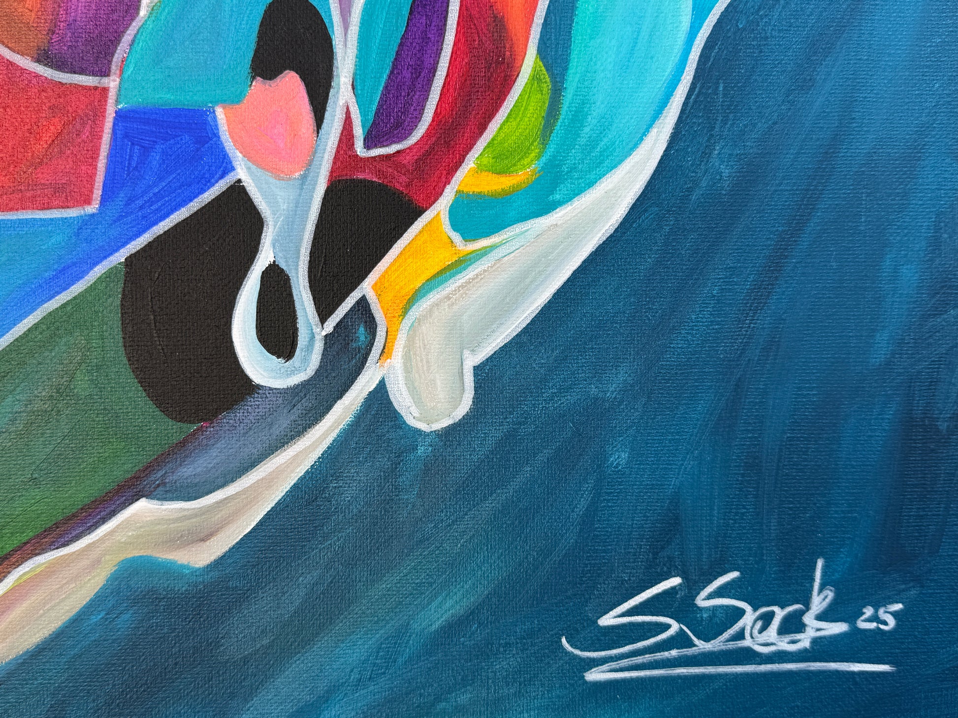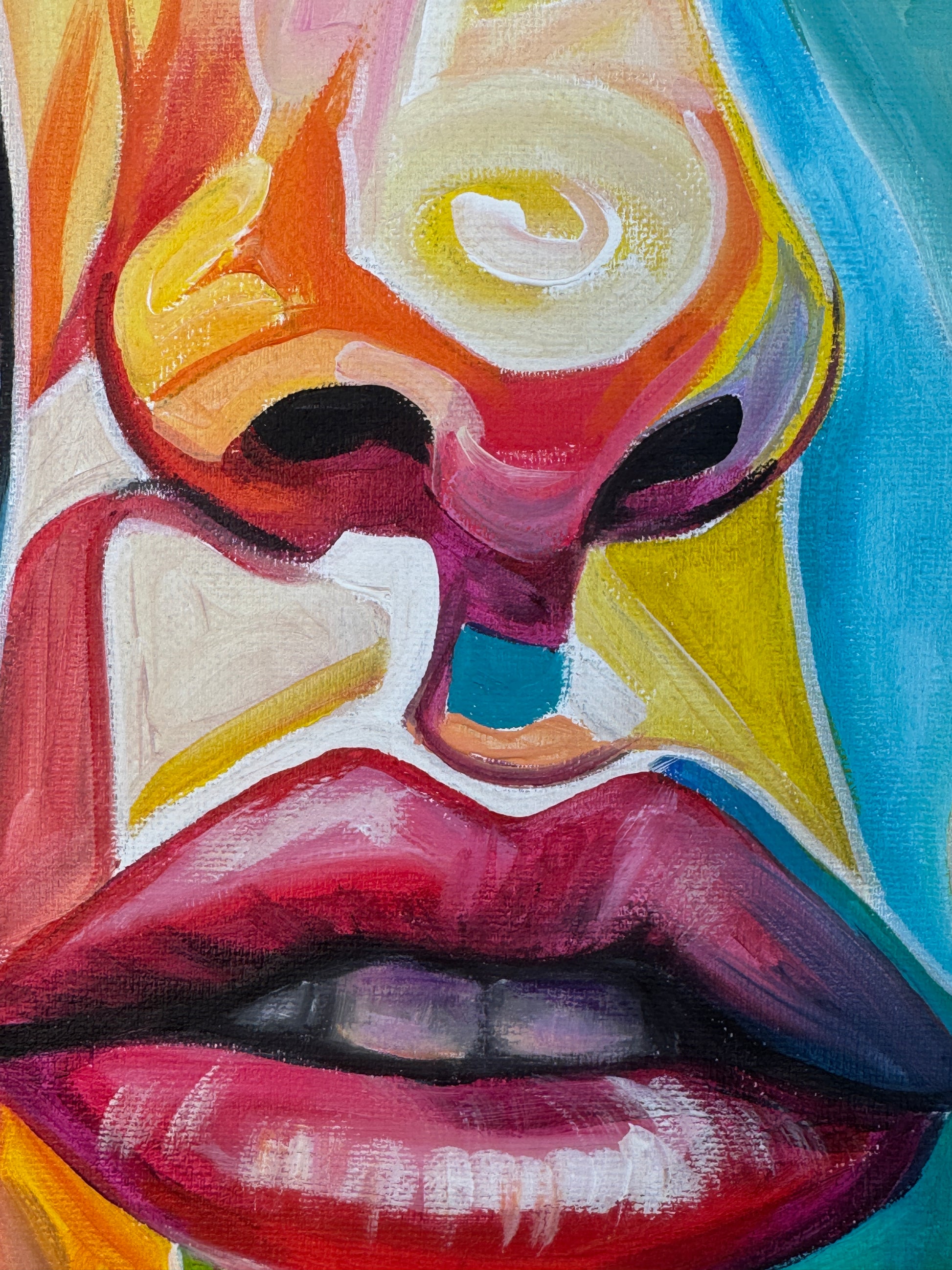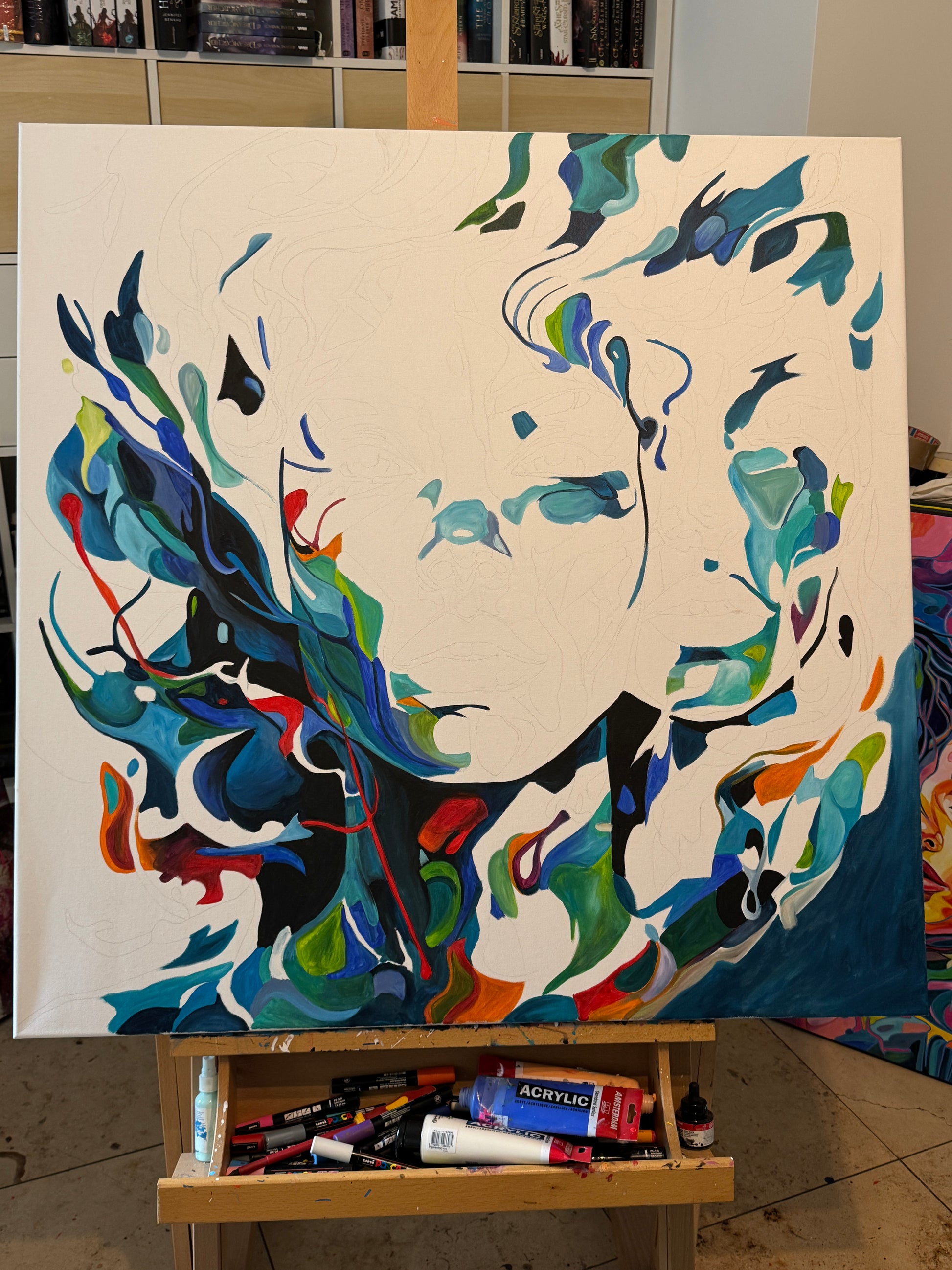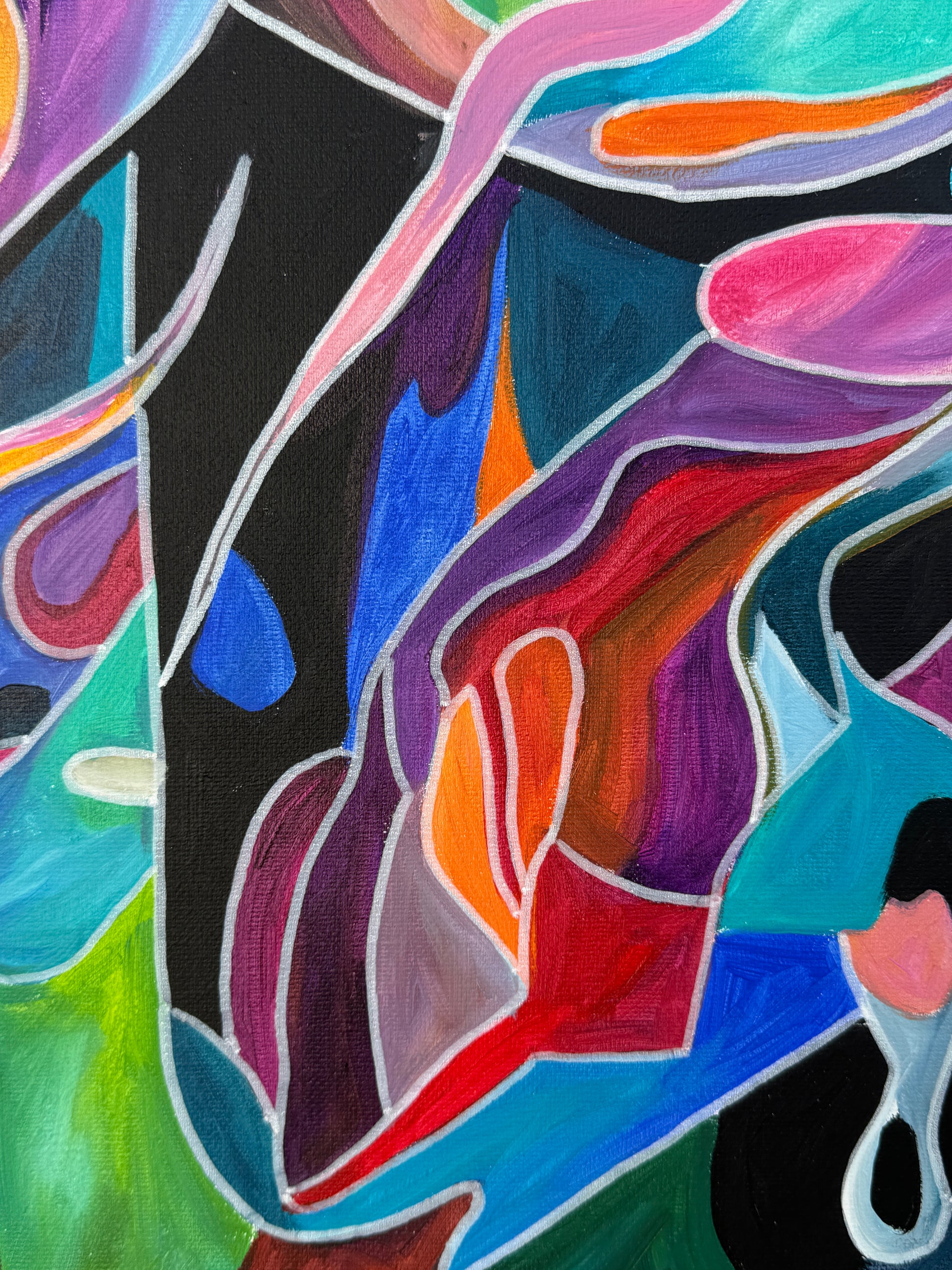 In meinem Werk verschmelzen lebhafte Farben und emotionale Ausdrücke zu einer dynamischen Darstellung menschlicher Verbundenheit und Vielschichtigkeit. Die intensiven, fließenden Linien und kühnen Farbtöne in Acryl betonen die Tiefen und Nuancen der menschlichen Psyche, eingefangen in einem Moment der Reflexion und des inneren Dialogs. Dieses Bild soll die Betrachter dazu anregen, die Farbenpracht der individuellen Gedankenwelten zu erkunden und die Kraft der künstlerischen Selbstexpression zu feiern. Es bringt Energie und Inspiration in jedes Zuhause, indem es täglich zum Nachdenken und Fühlen anregt.
