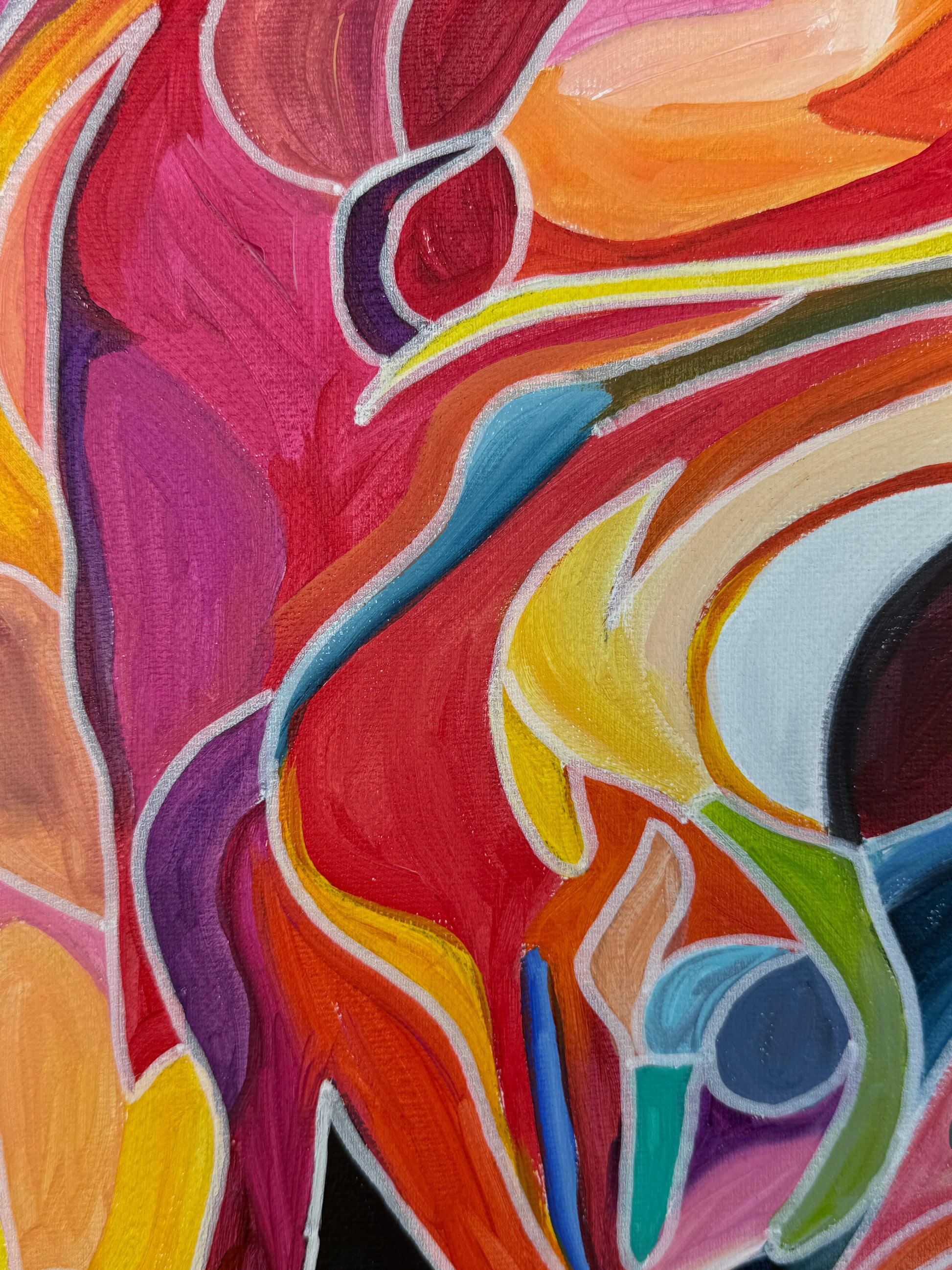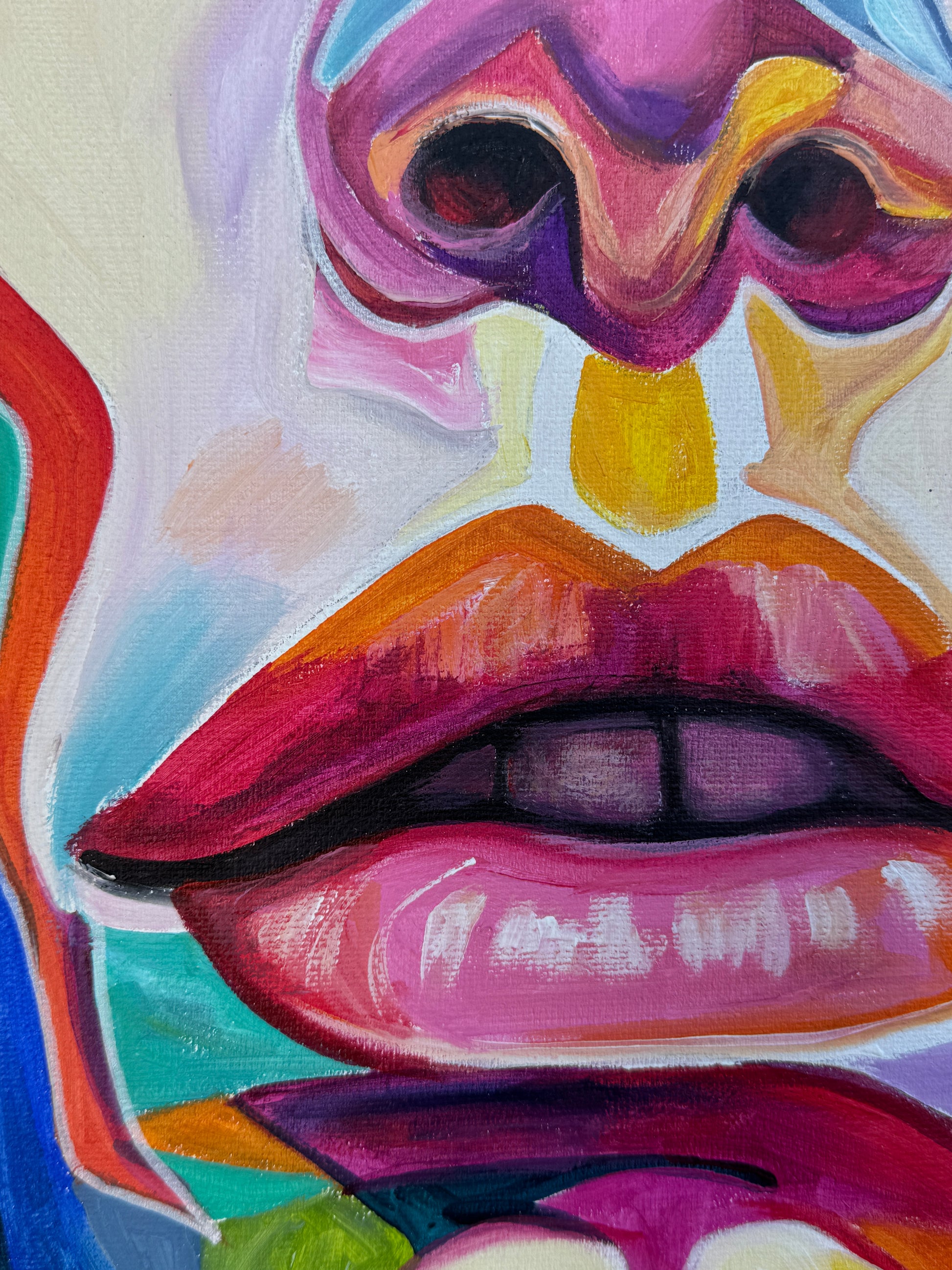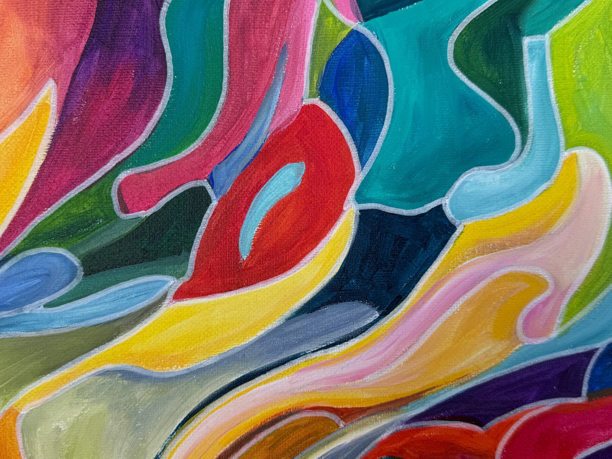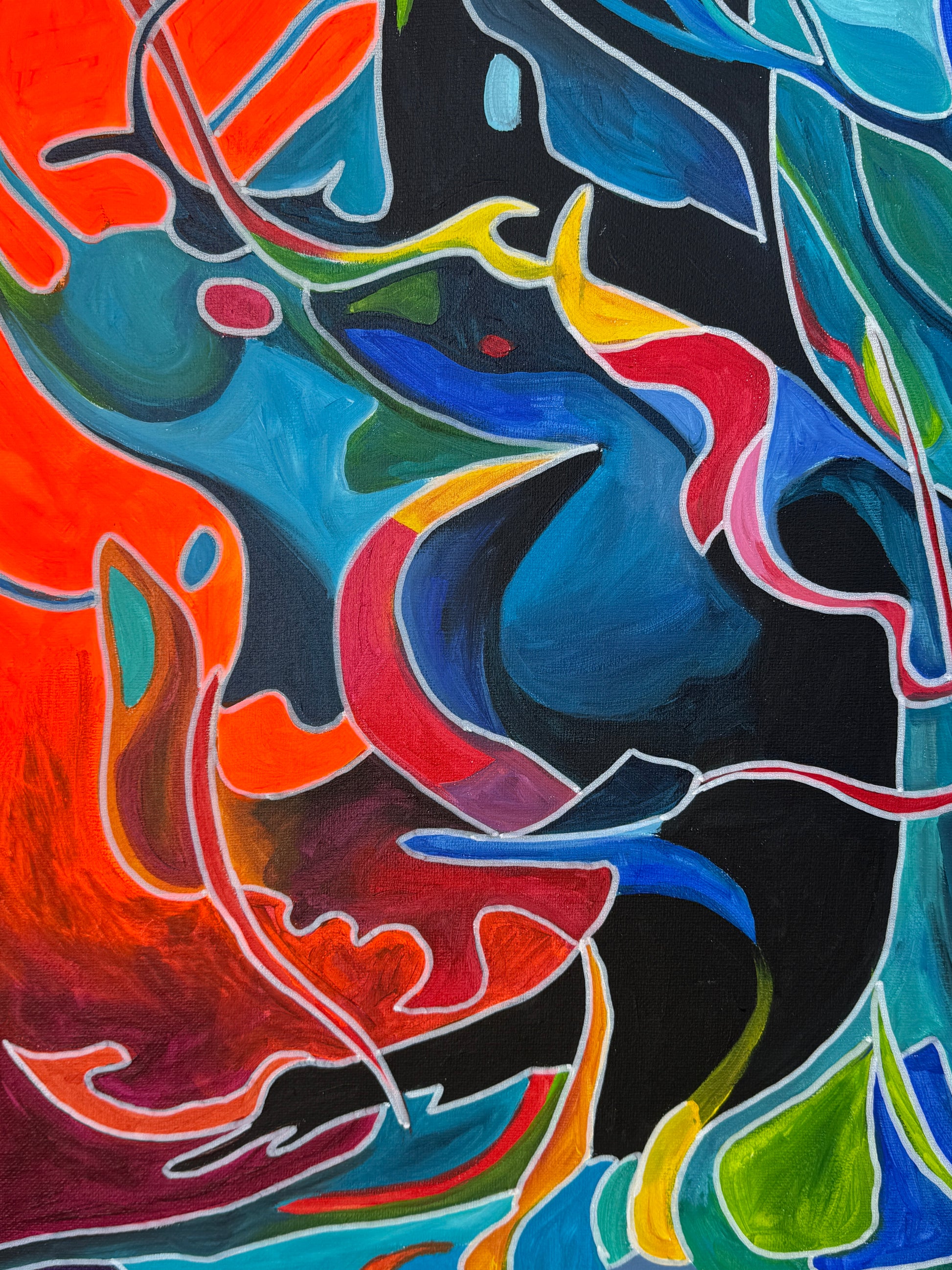 In meinem Werk verschmelzen lebhafte Farben und emotionale Ausdrücke zu einer dynamischen Darstellung menschlicher Verbundenheit und Vielschichtigkeit. Die intensiven, fließenden Linien und kühnen Farbtöne in Acryl betonen die Tiefen und Nuancen der menschlichen Psyche, eingefangen in einem Moment der Reflexion und des inneren Dialogs. Dieses Bild soll die Betrachter dazu anregen, die Farbenpracht der individuellen Gedankenwelten zu erkunden und die Kraft der künstlerischen Selbstexpression zu feiern. Es bringt Energie und Inspiration in jedes Zuhause, indem es täglich zum Nachdenken und Fühlen anregt.