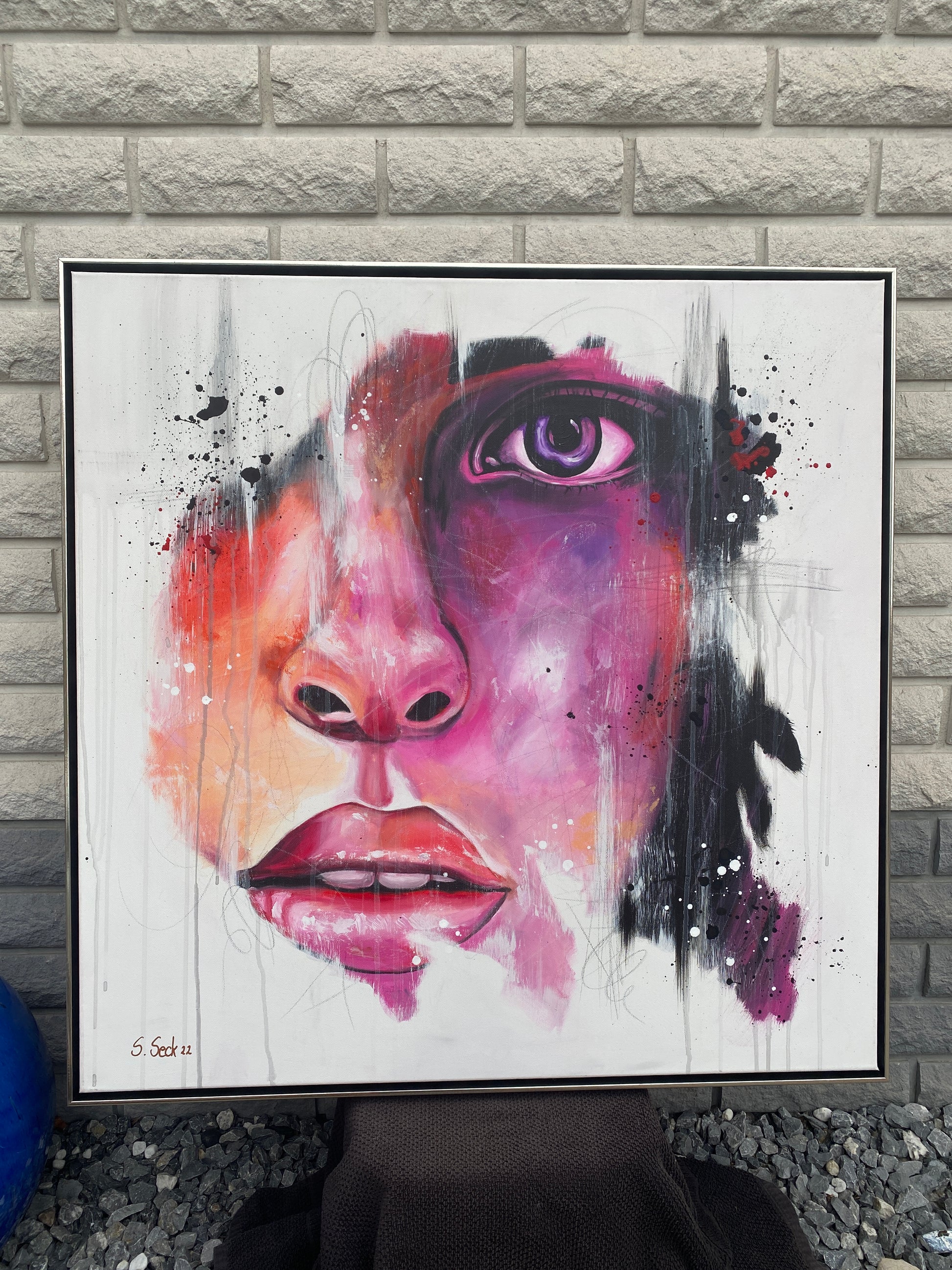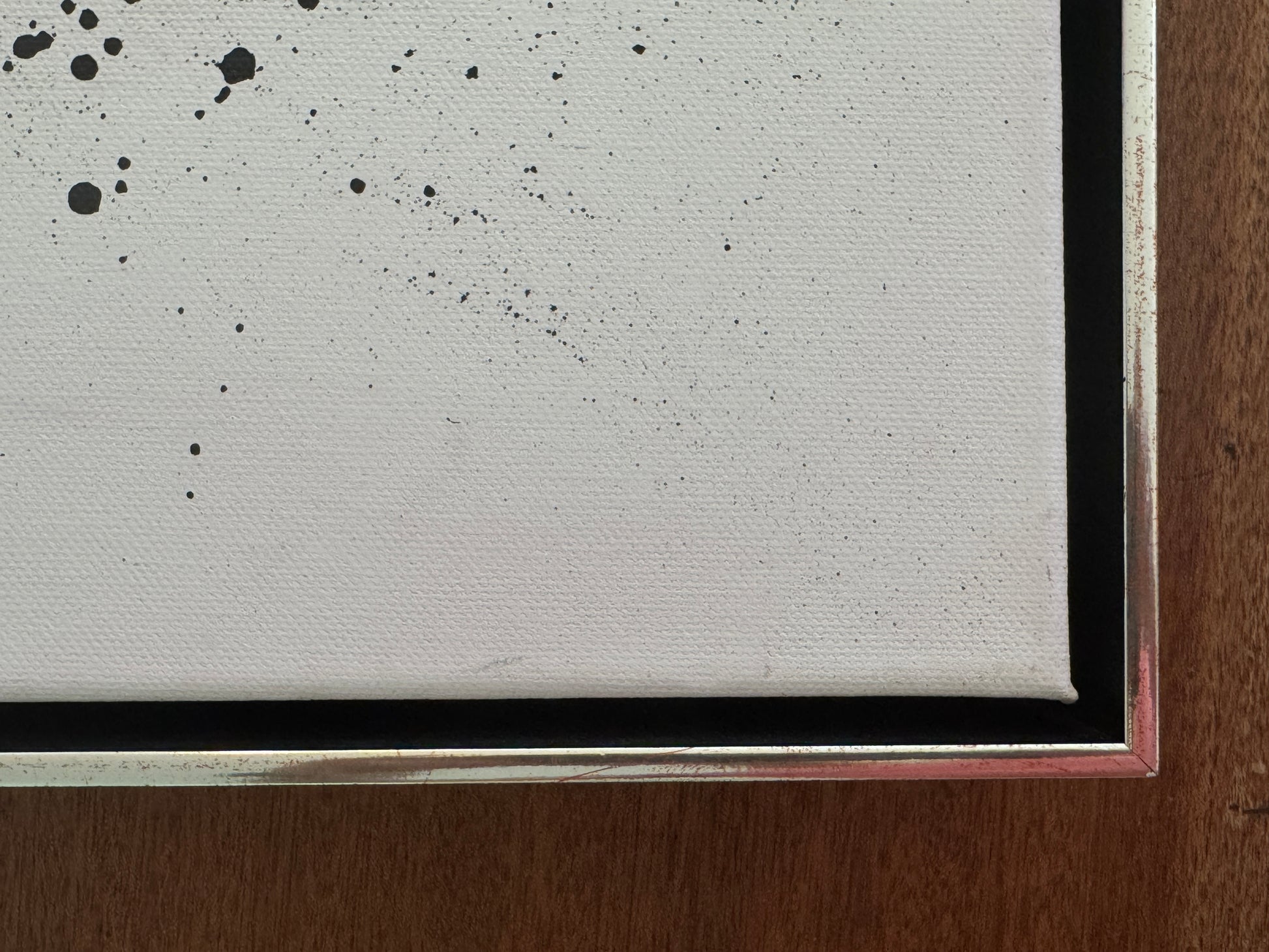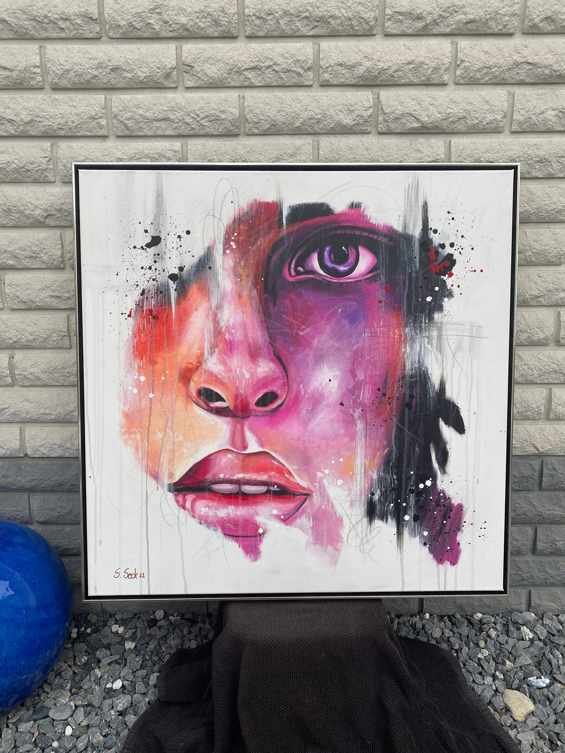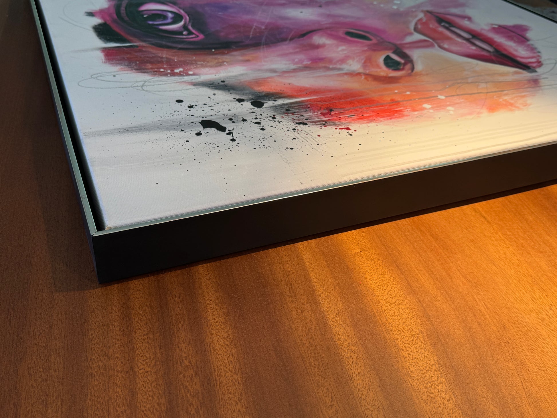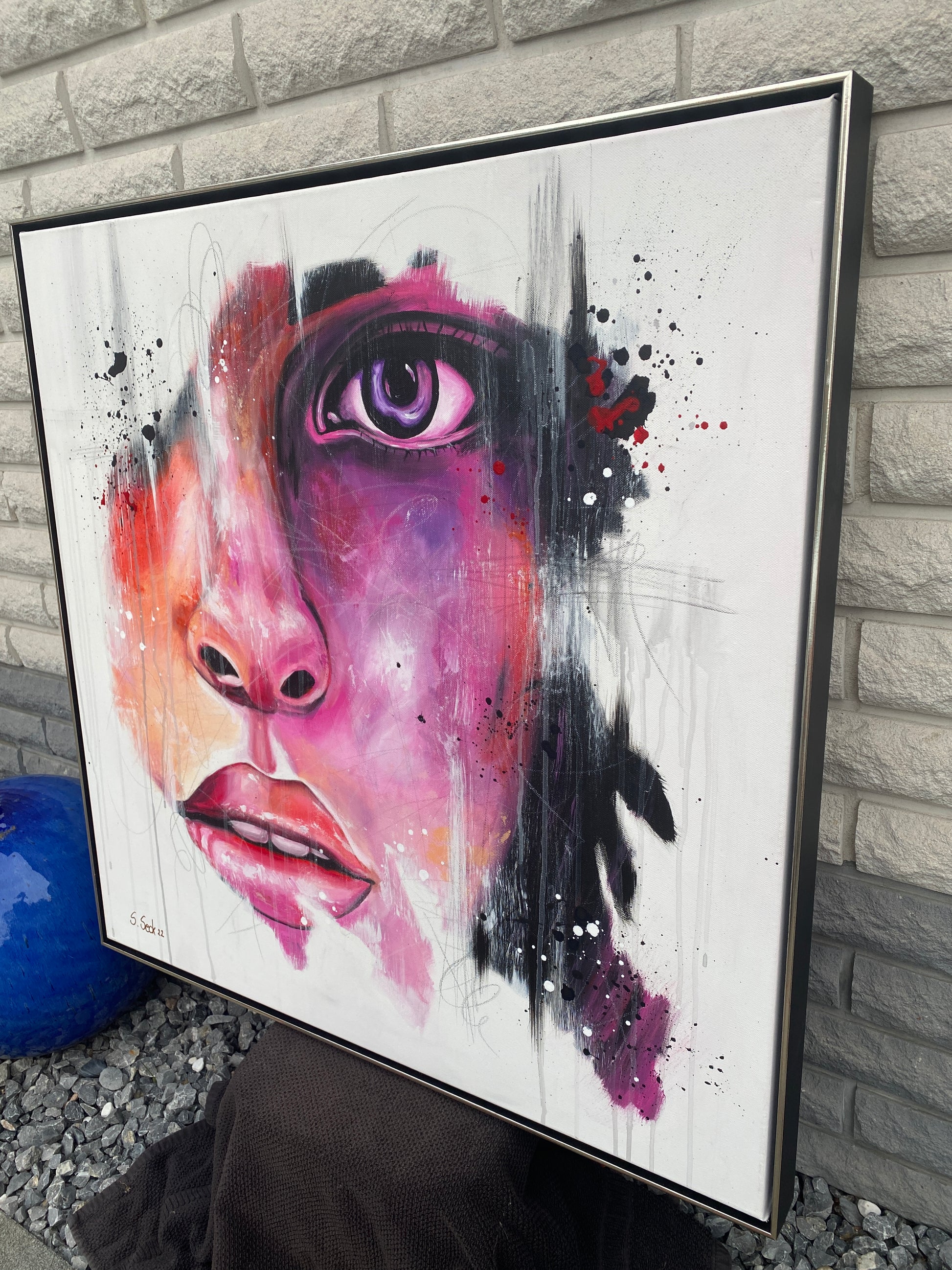 Das Werk ist mit einem schwarz/silbernen Schattenfugenrahmen gerahmt.