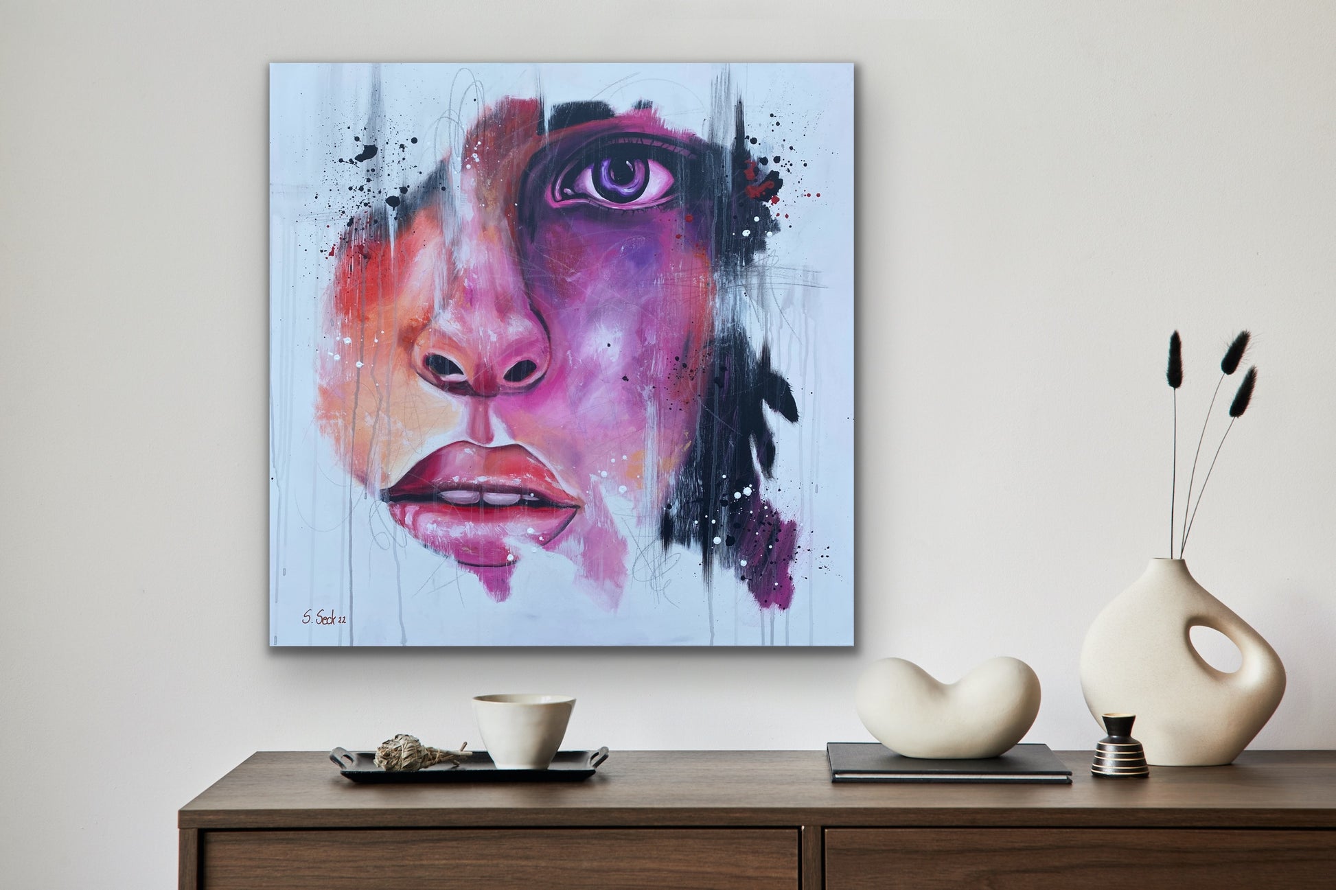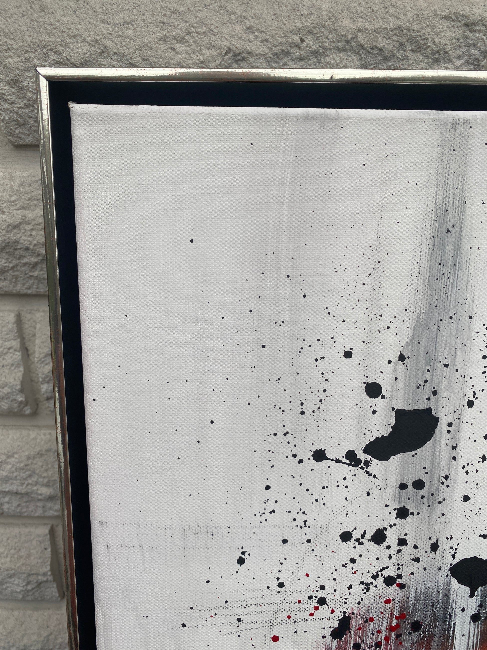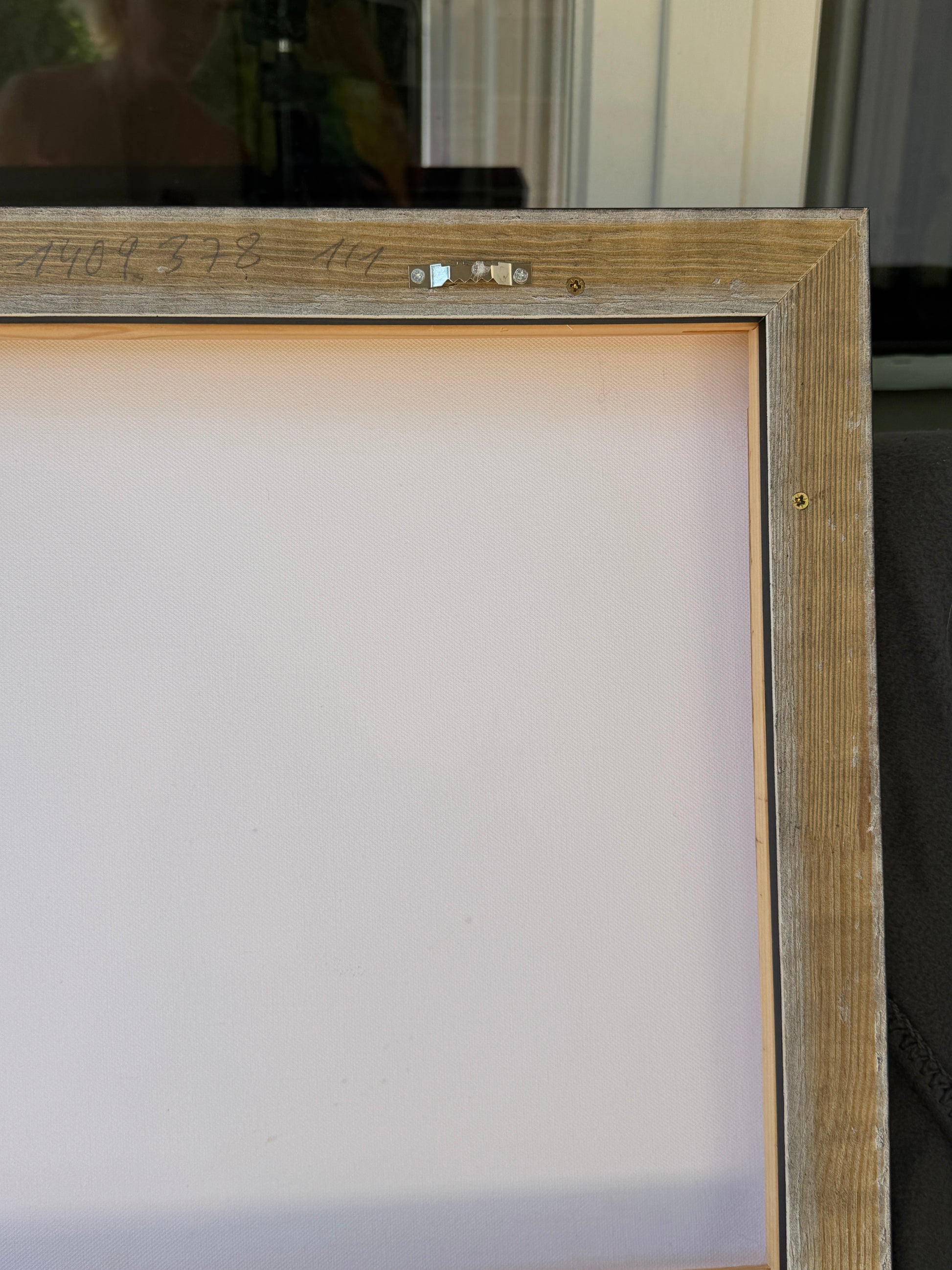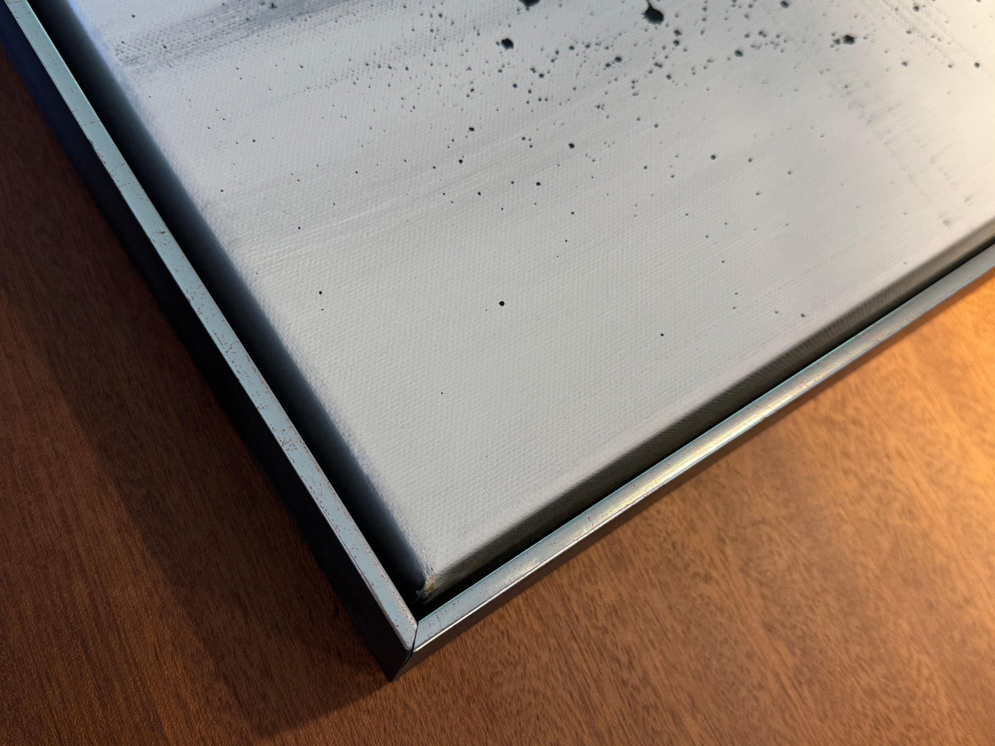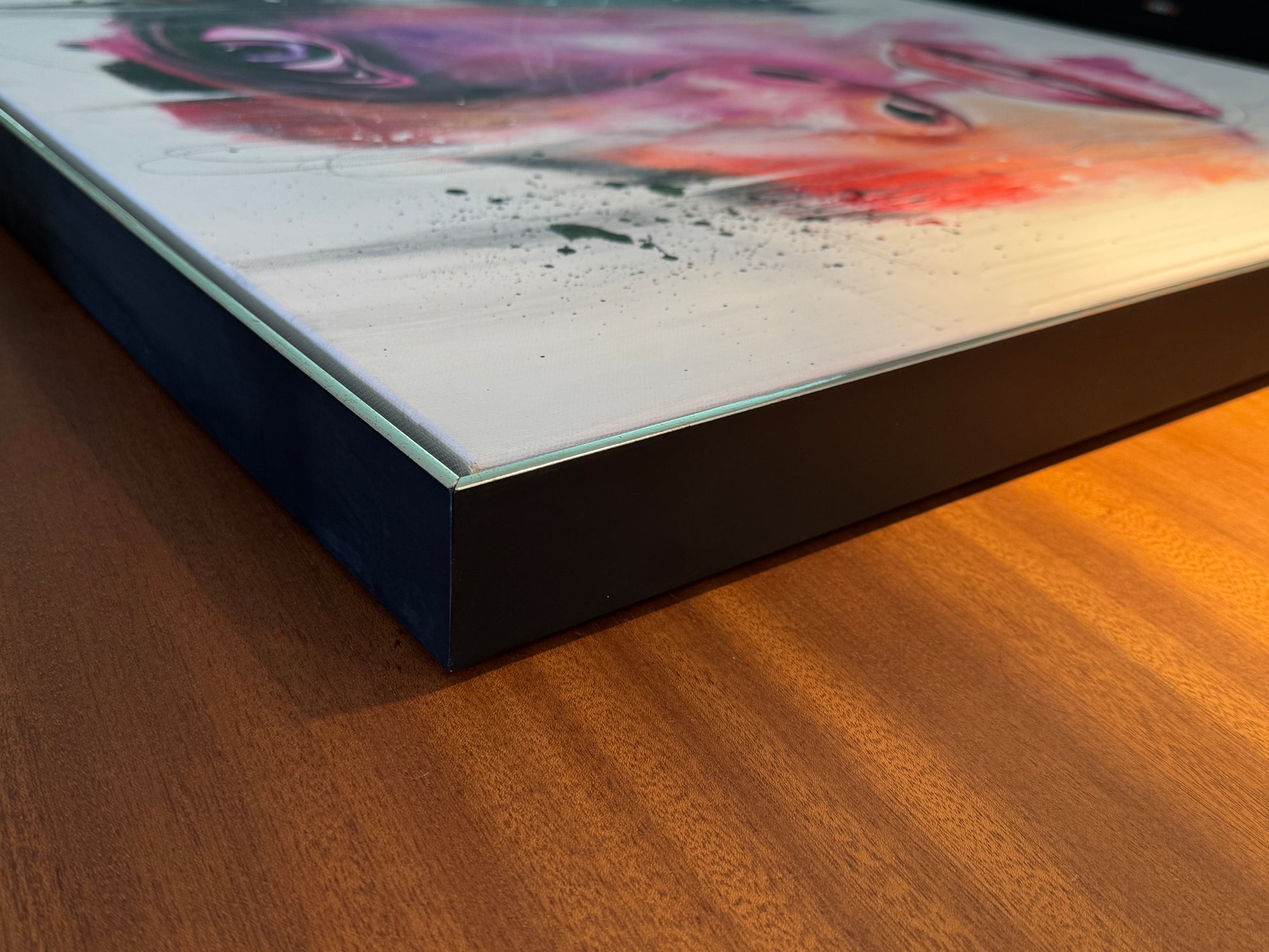 Das Werk ist mit einem schwarz/silbernen Schattenfugenrahmen gerahmt.