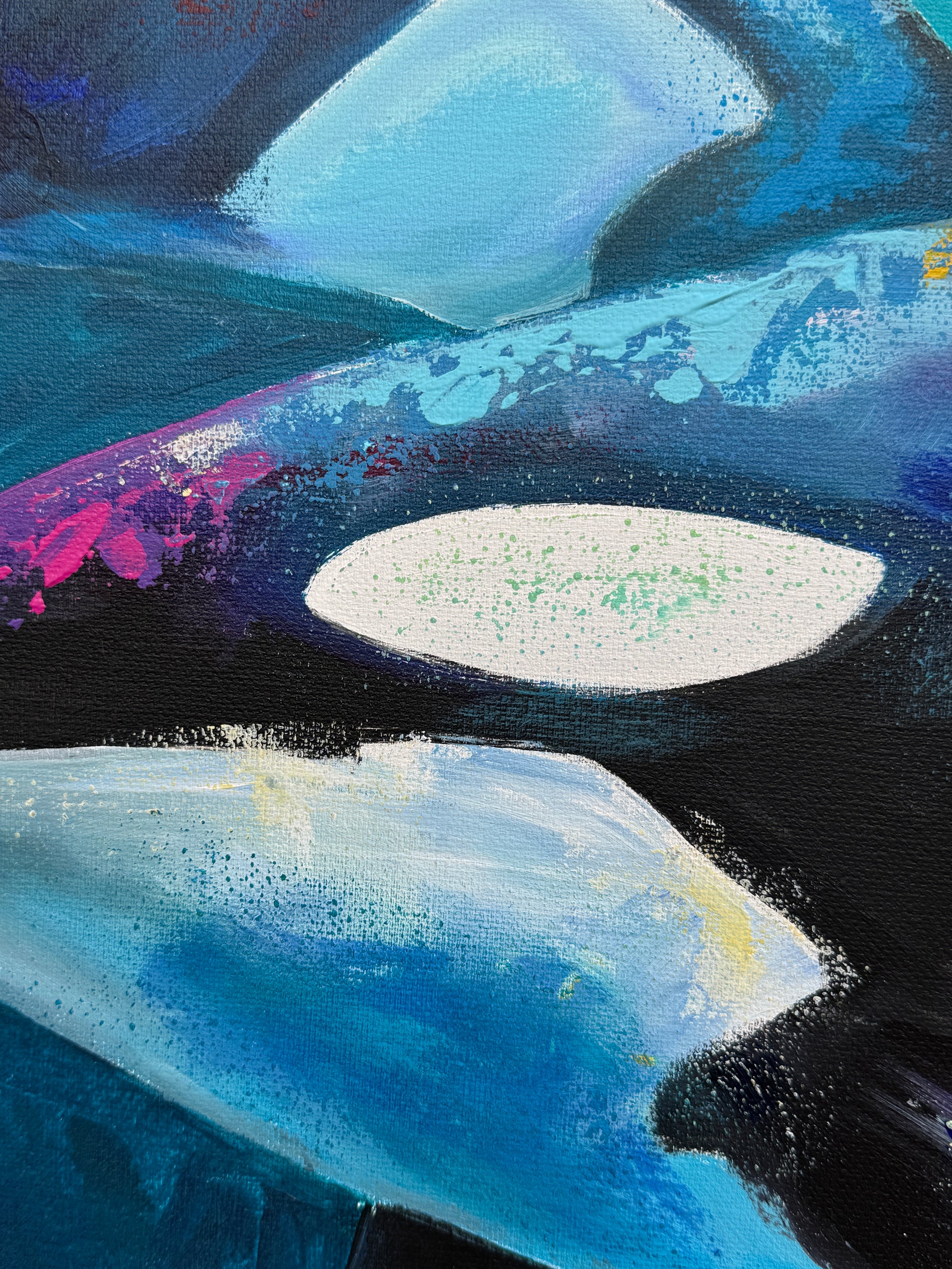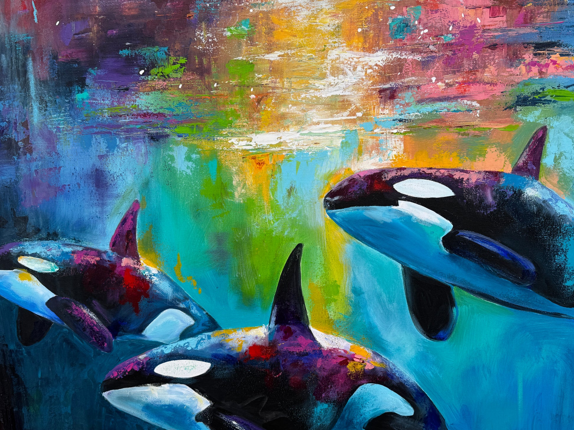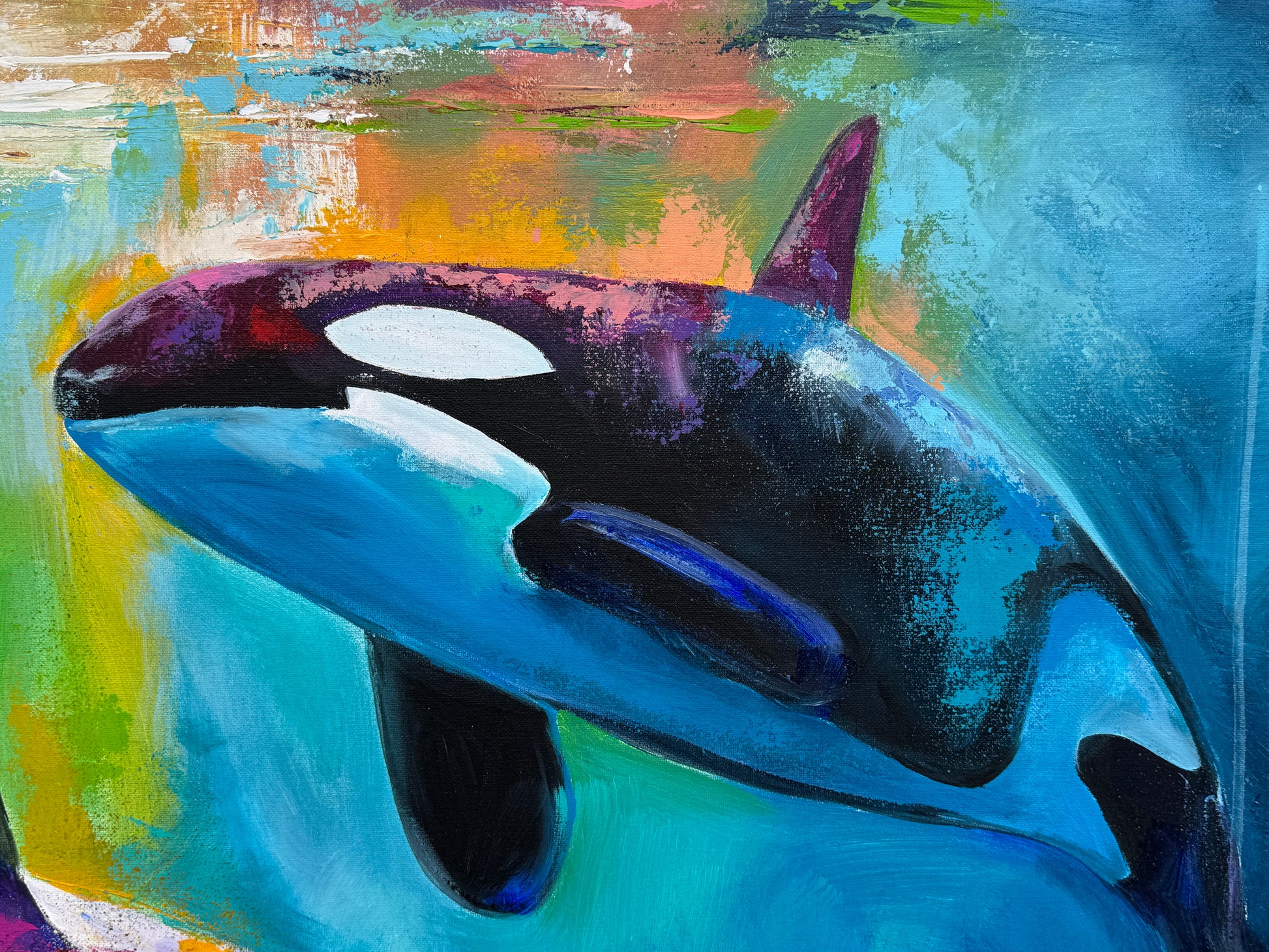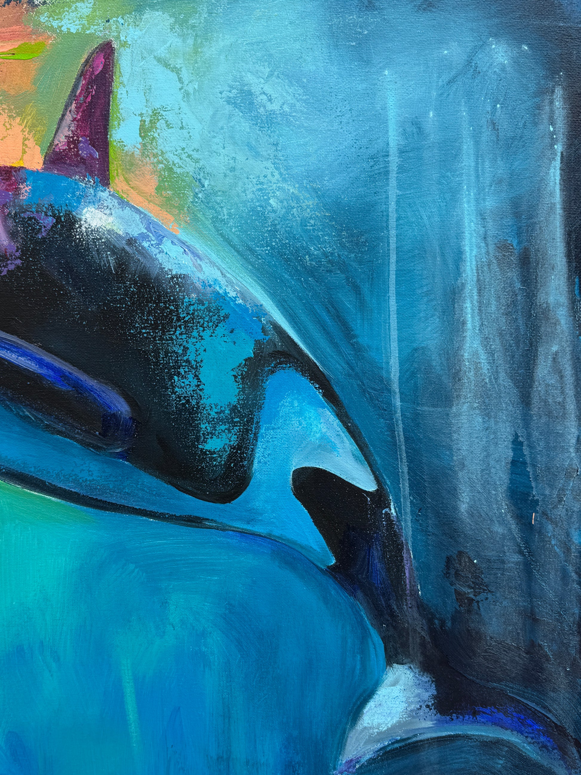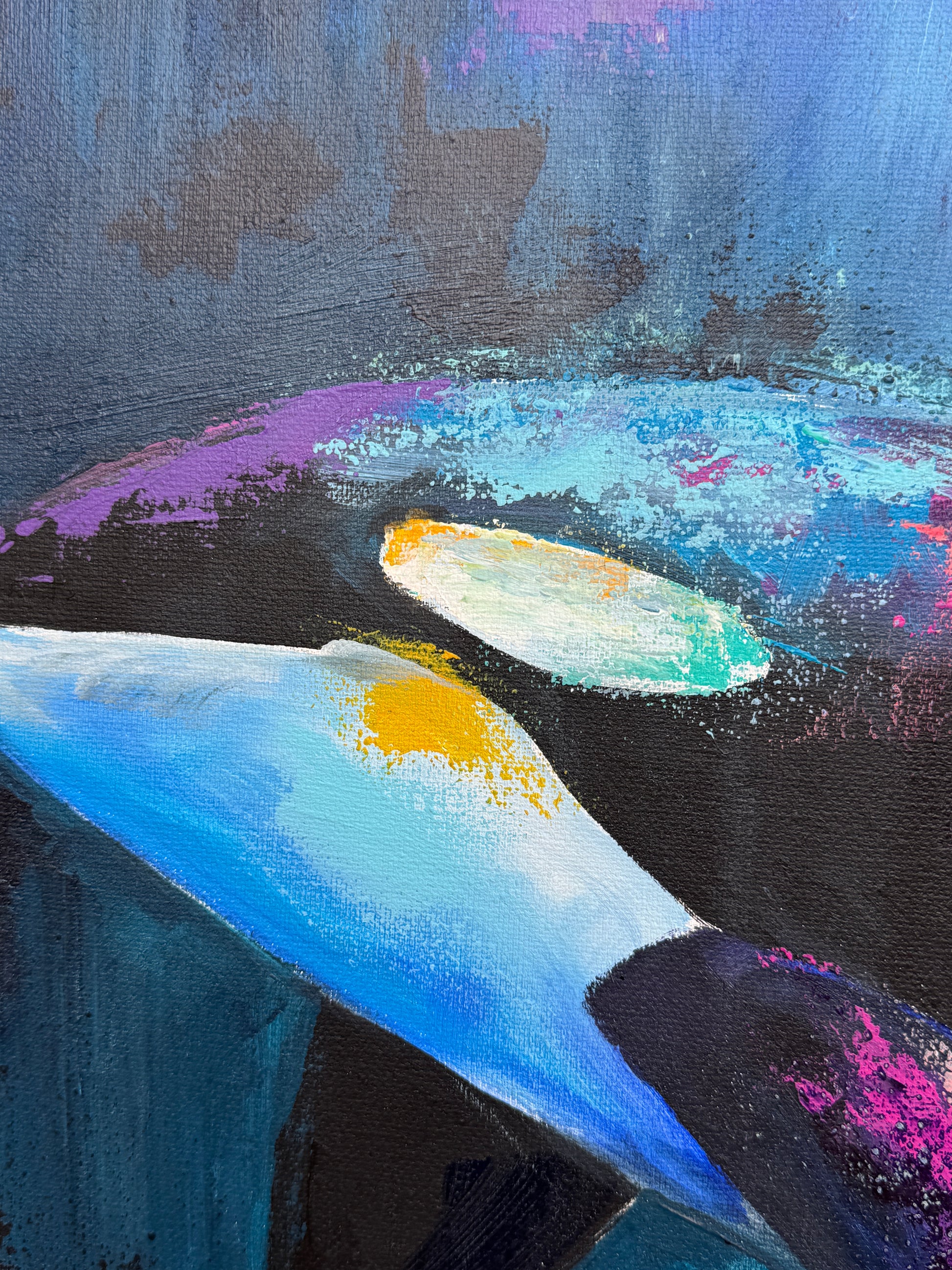 Diese Arbeit ist eine Verbindung von Freiheit und Dynamik. Mit Acrylfarben habe ich versucht, die kraftvolle Eleganz der Orcas im abstrakten, expressiven Stil zu zeigen.