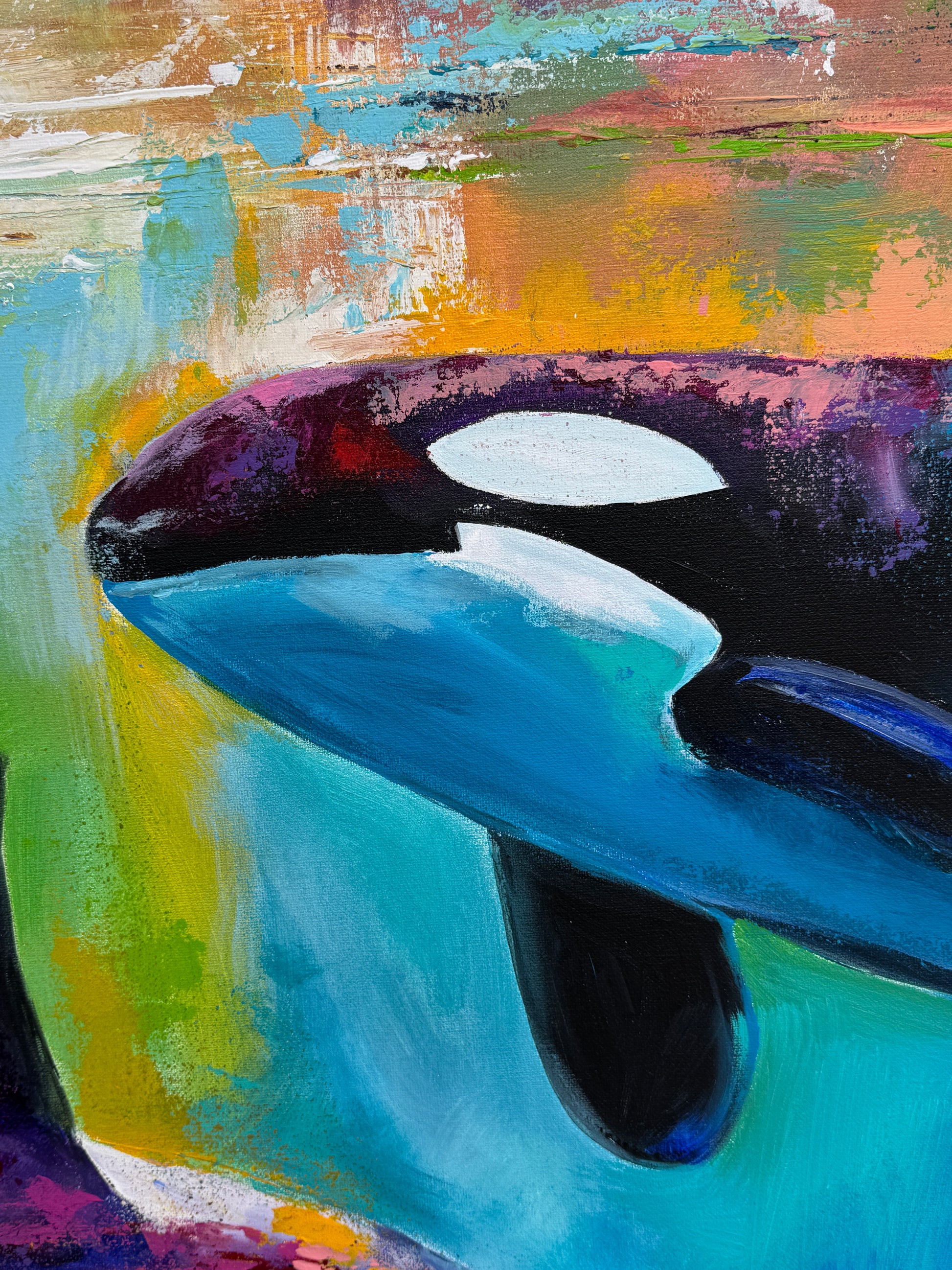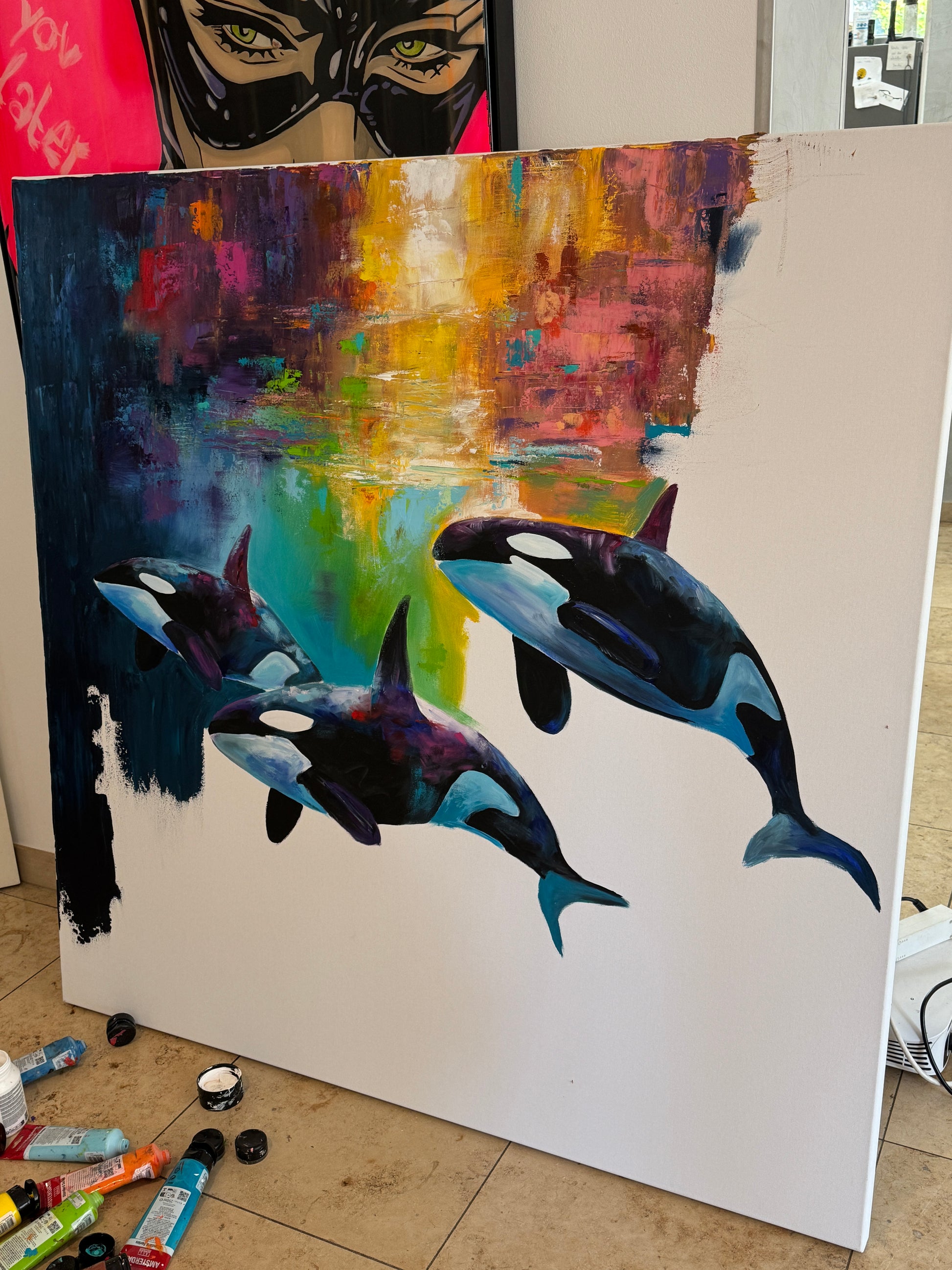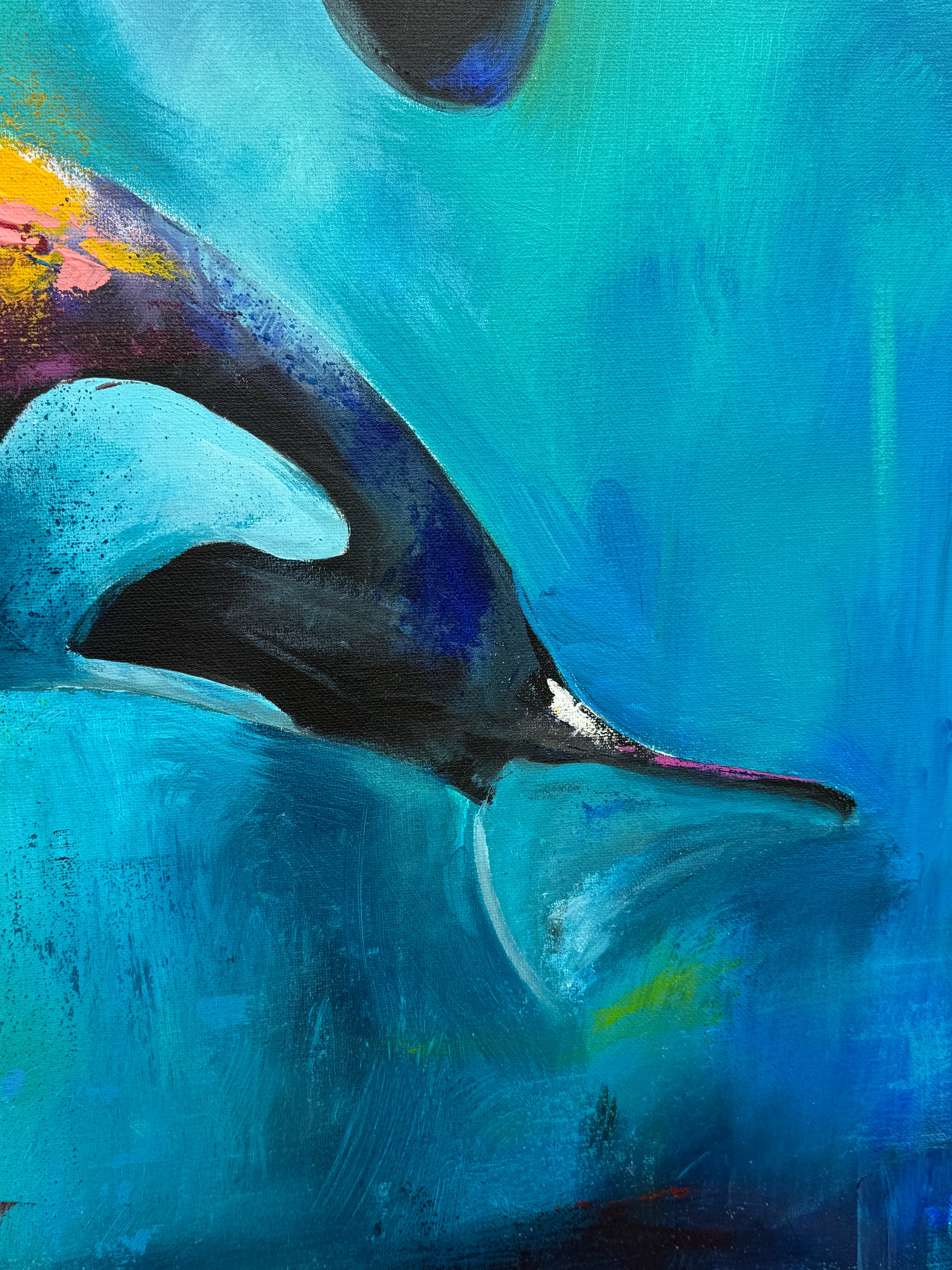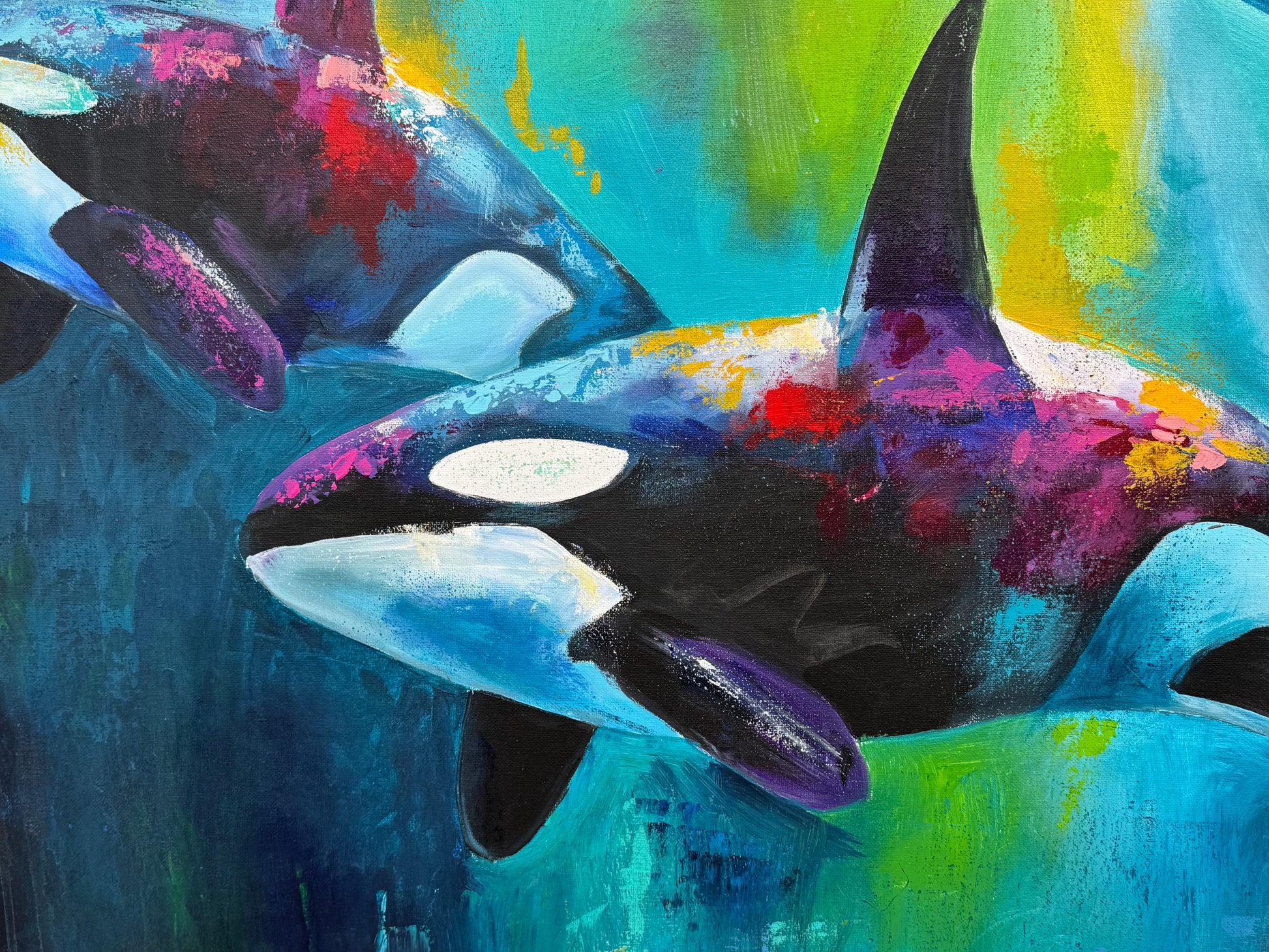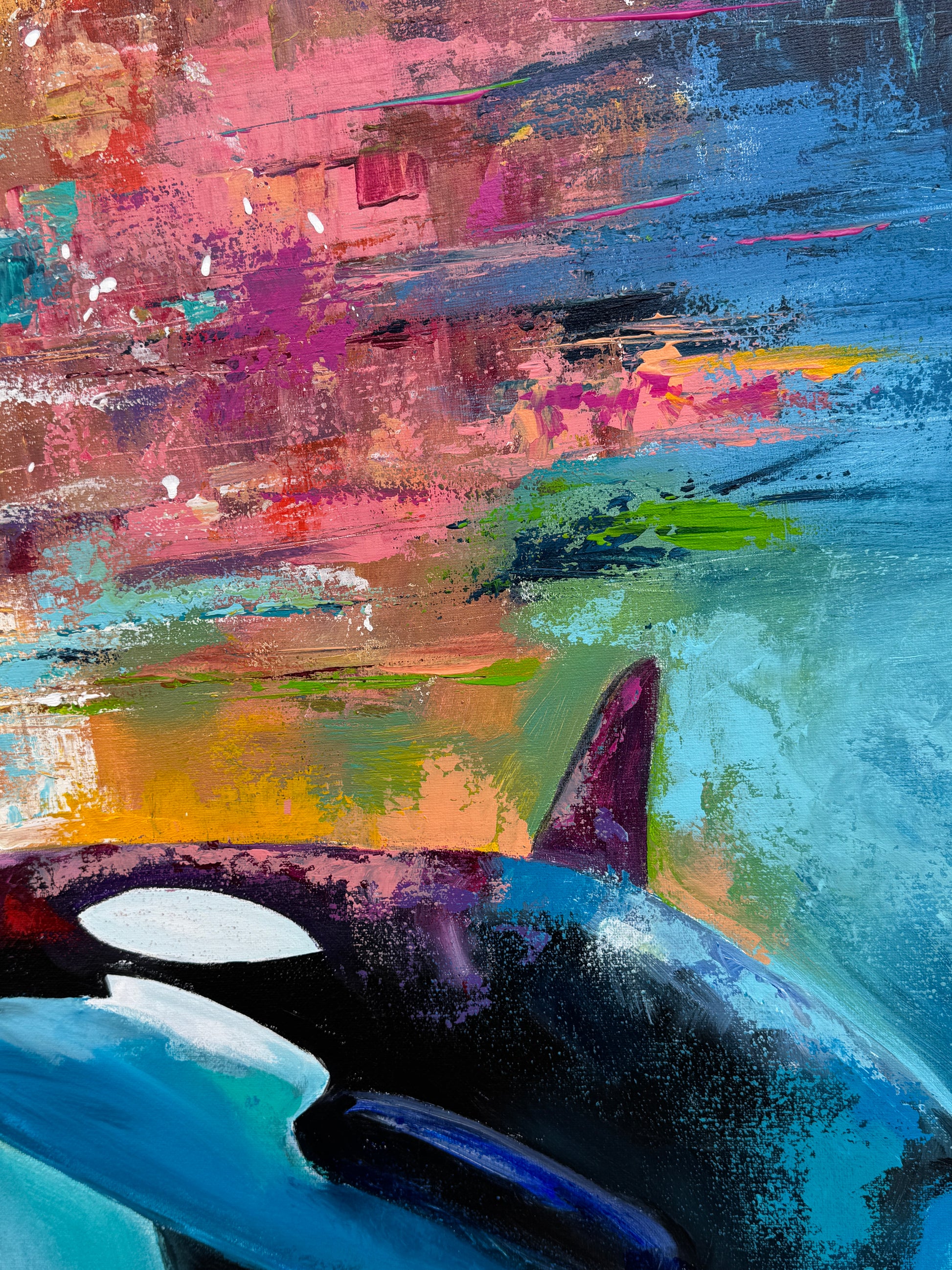 Diese Arbeit ist eine Verbindung von Freiheit und Dynamik. Mit Acrylfarben habe ich versucht, die kraftvolle Eleganz der Orcas im abstrakten, expressiven Stil zu zeigen.