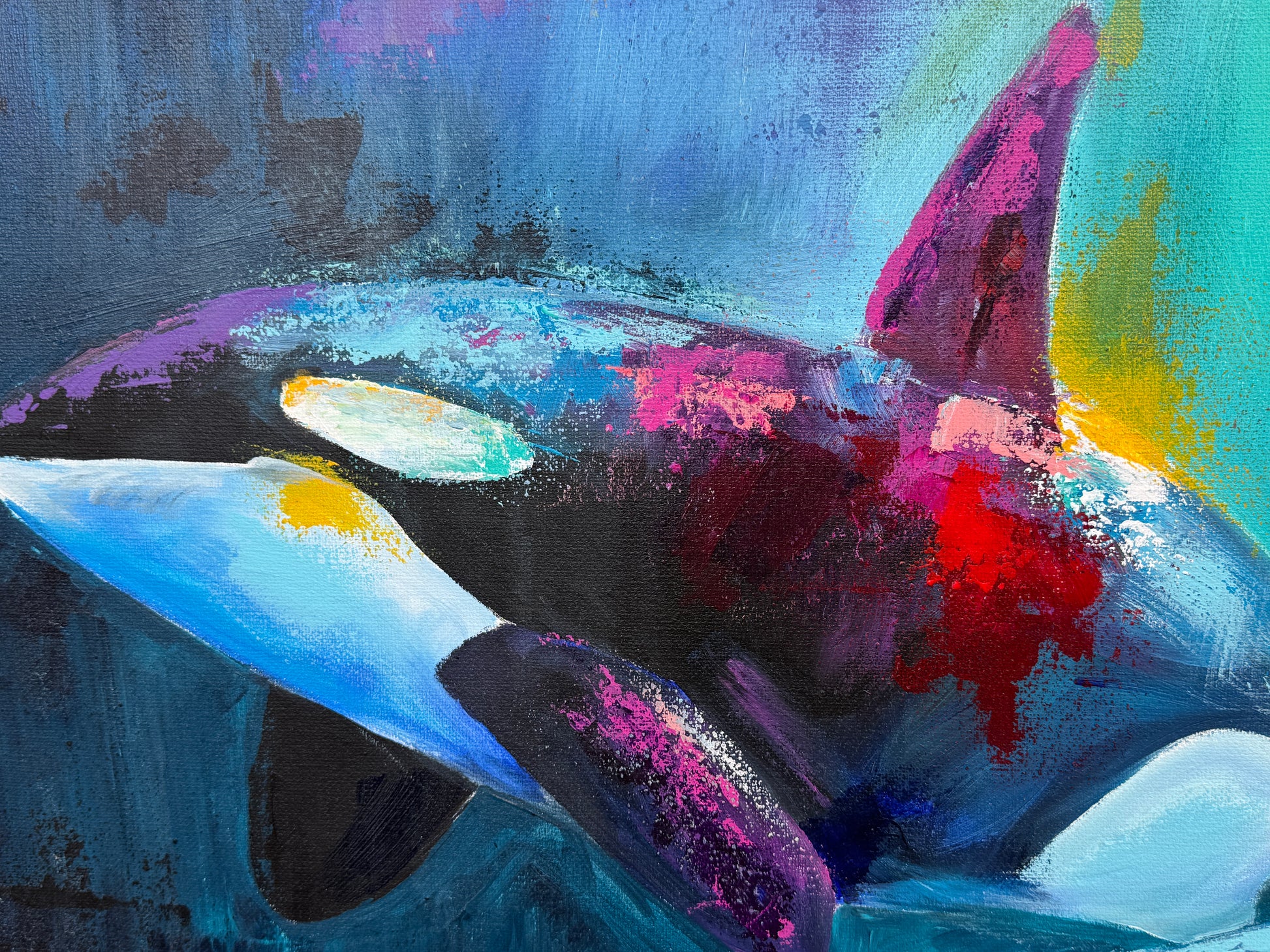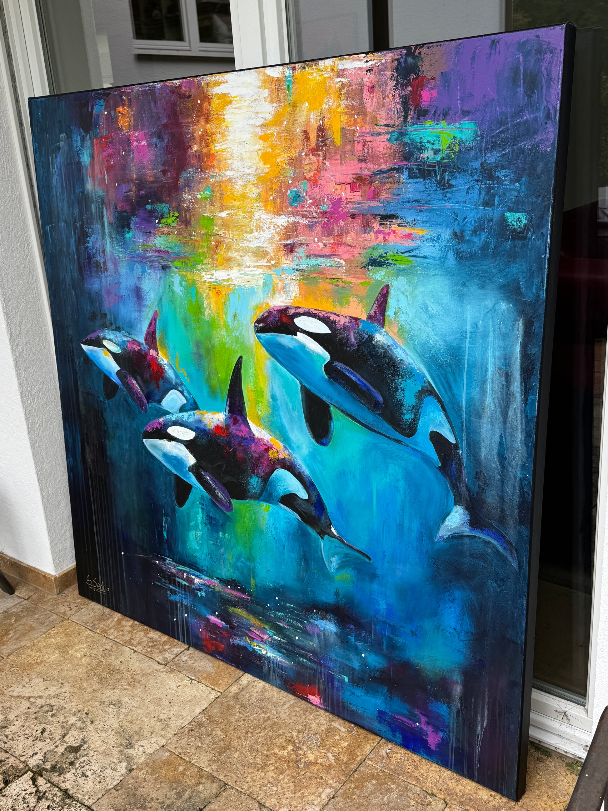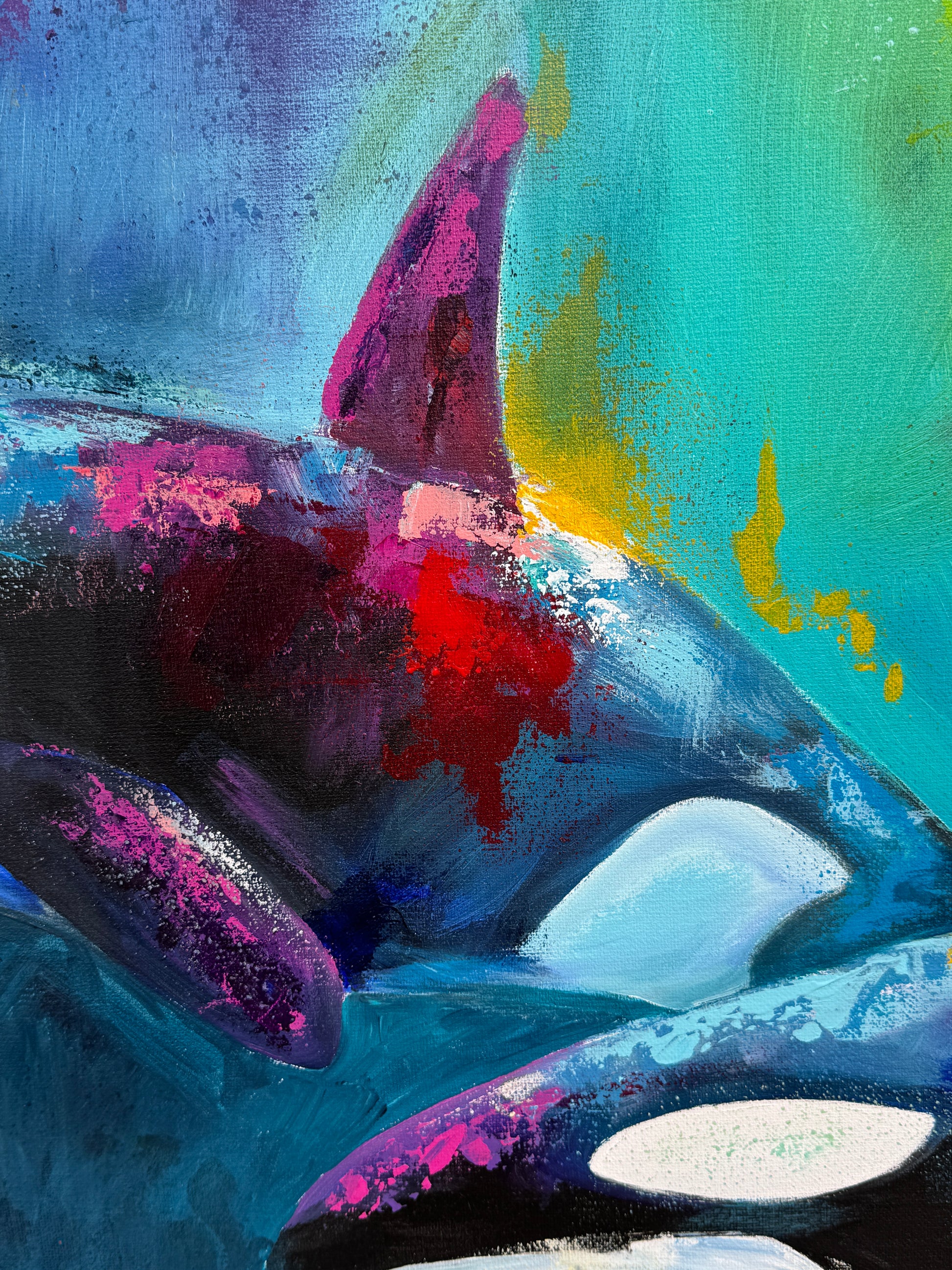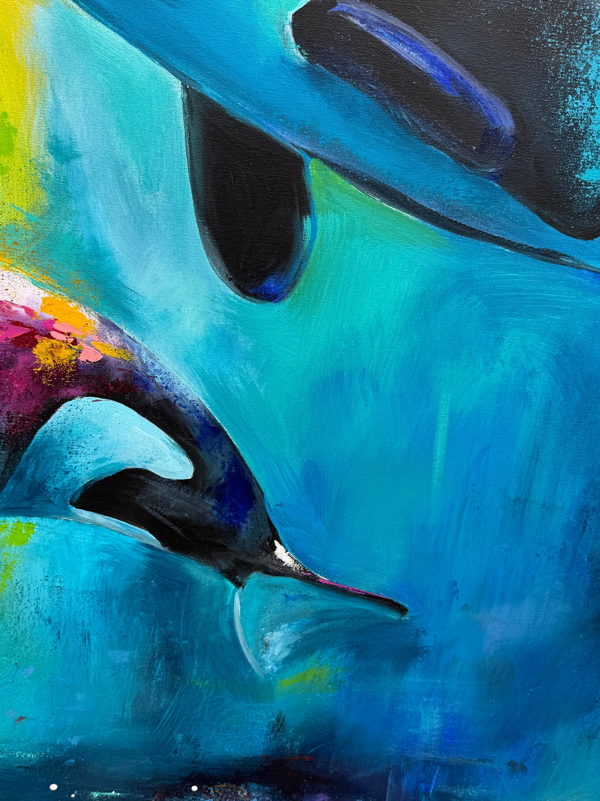 Diese Arbeit ist eine Verbindung von Freiheit und Dynamik. Mit Acrylfarben habe ich versucht, die kraftvolle Eleganz der Orcas im abstrakten, expressiven Stil zu zeigen.