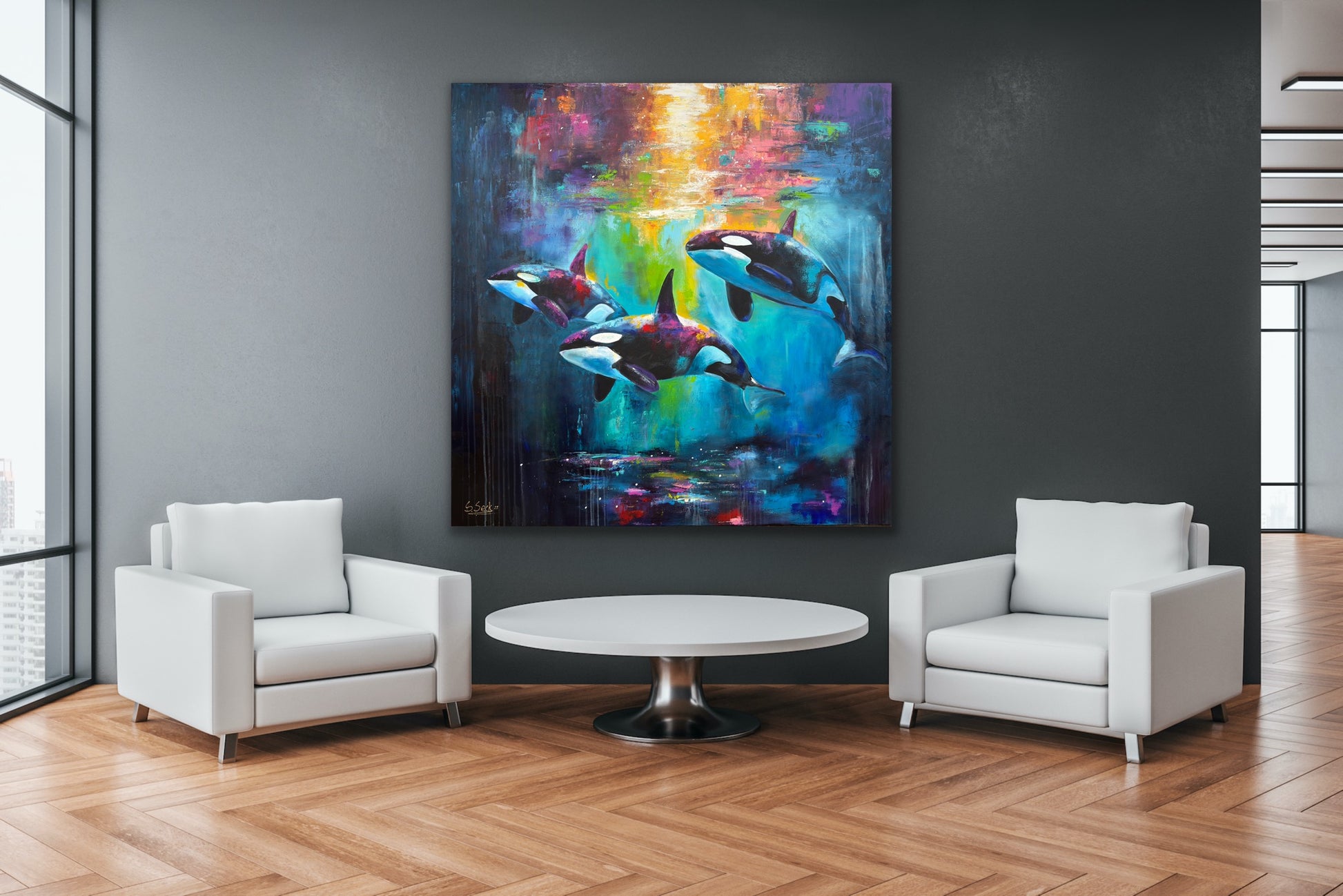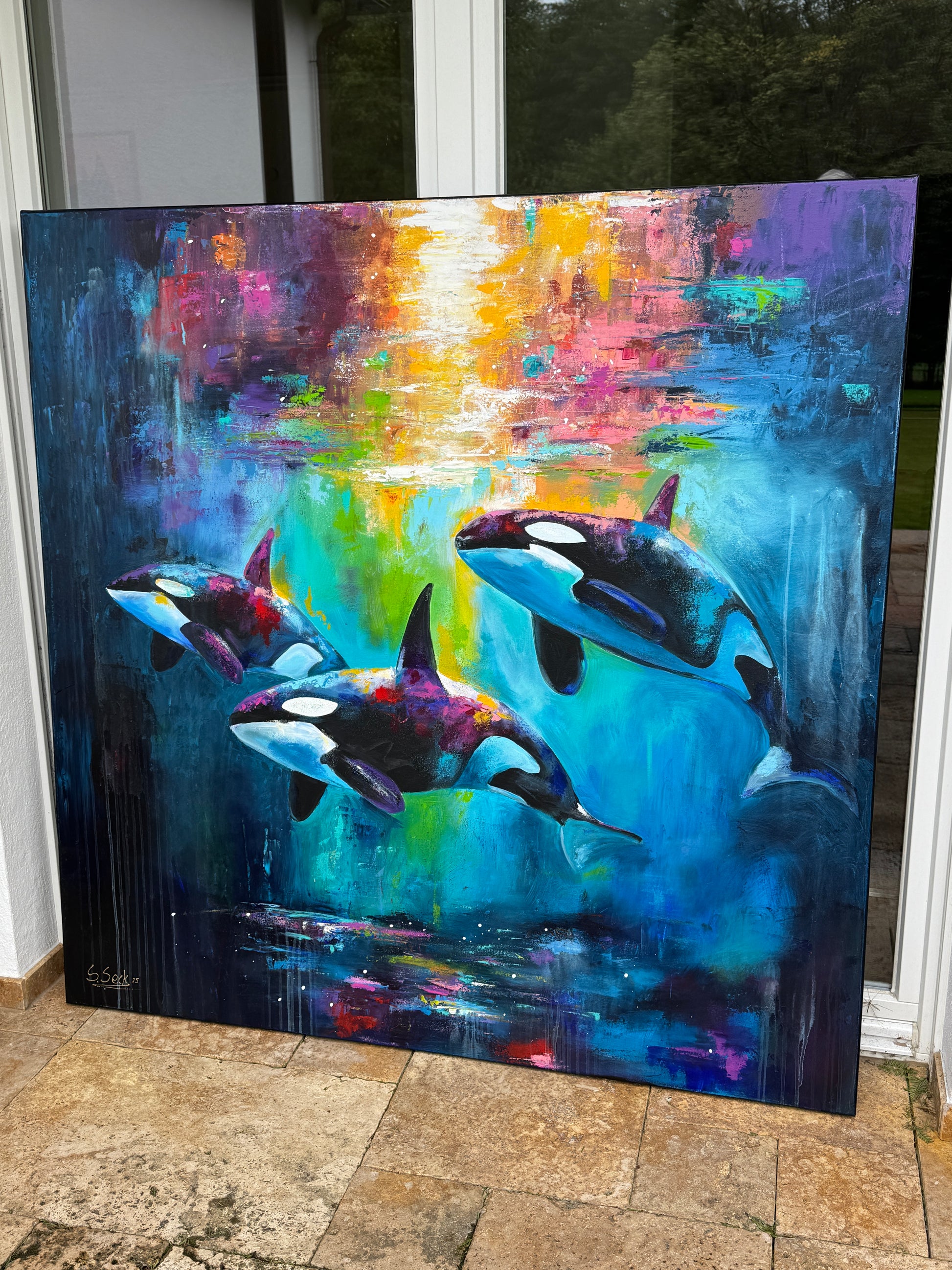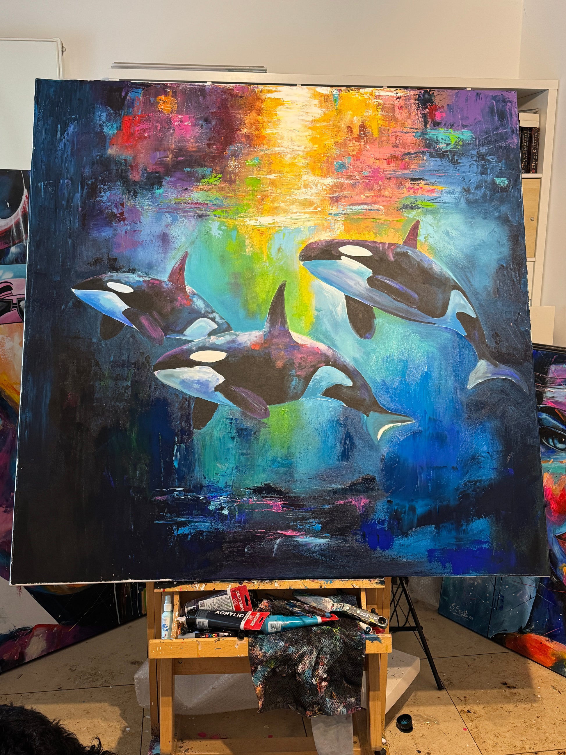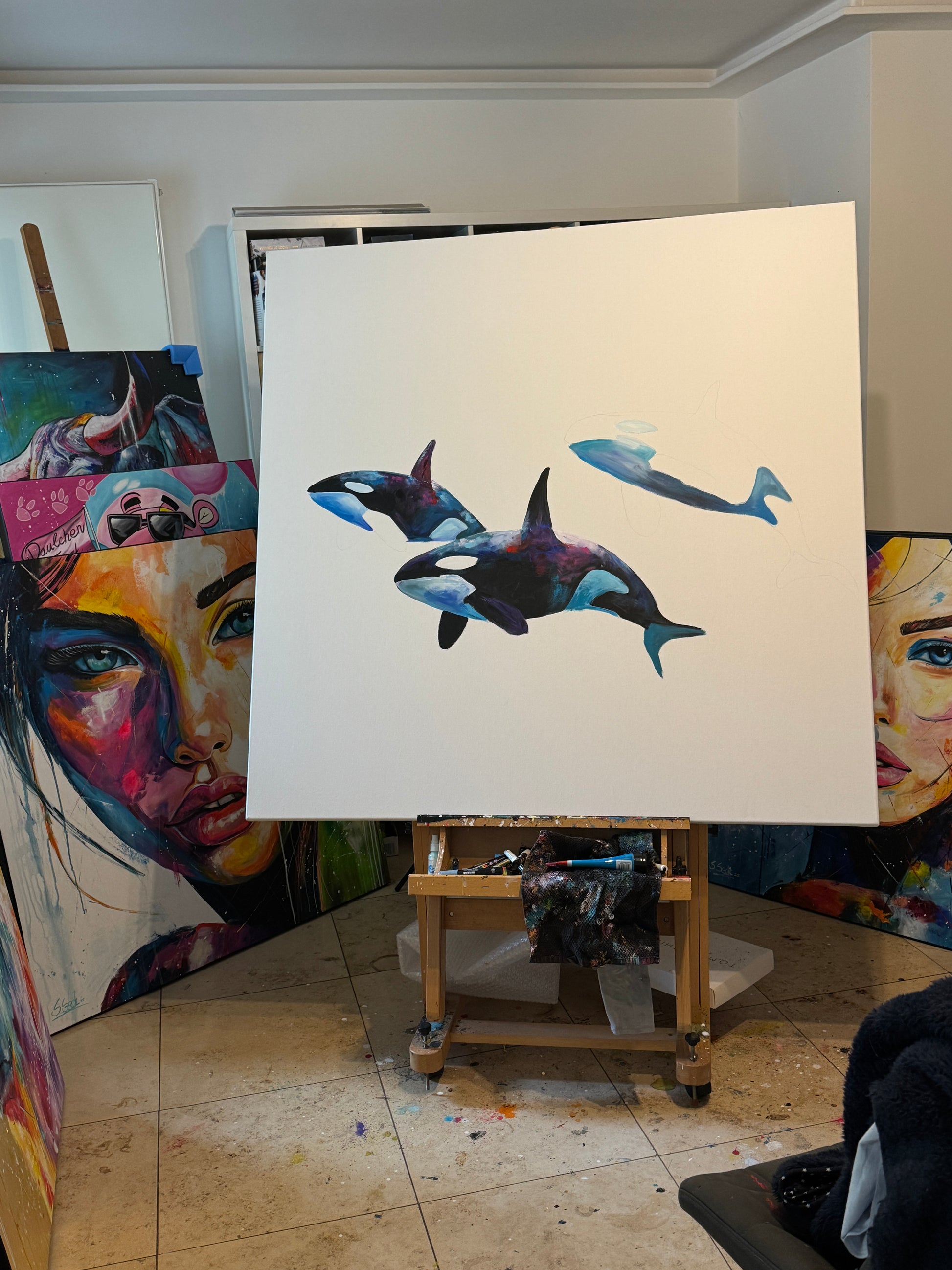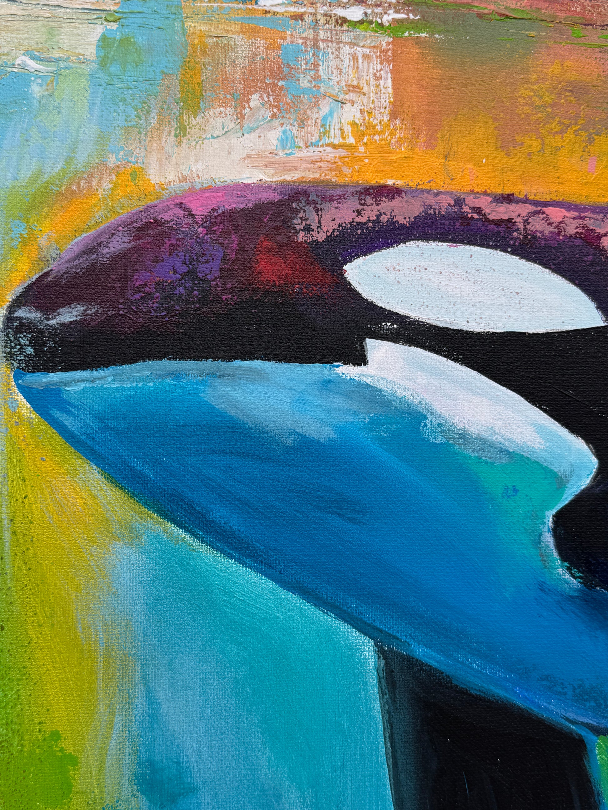 Diese Arbeit ist eine Verbindung von Freiheit und Dynamik. Mit Acrylfarben habe ich versucht, die kraftvolle Eleganz der Orcas im abstrakten, expressiven Stil zu zeigen.