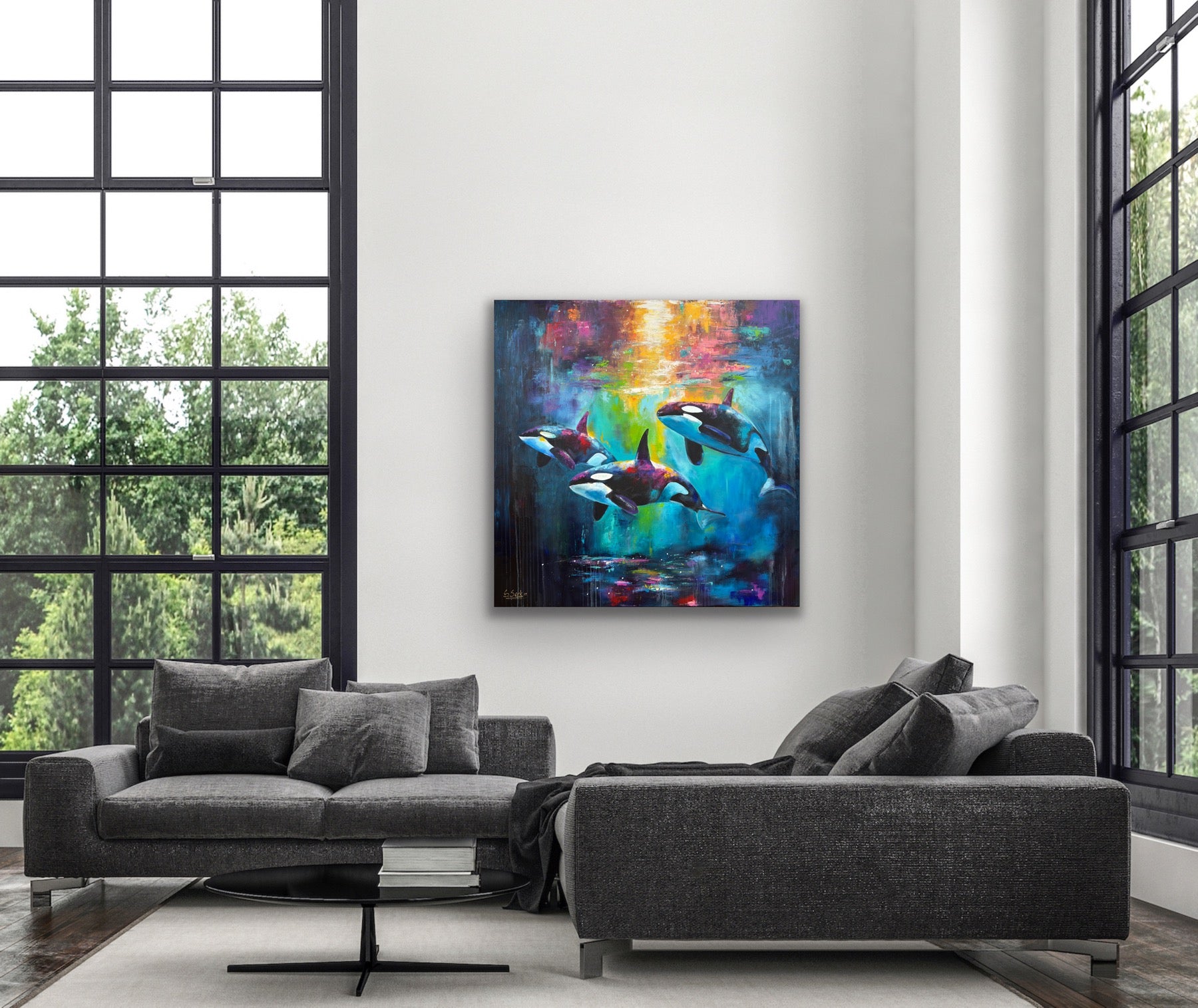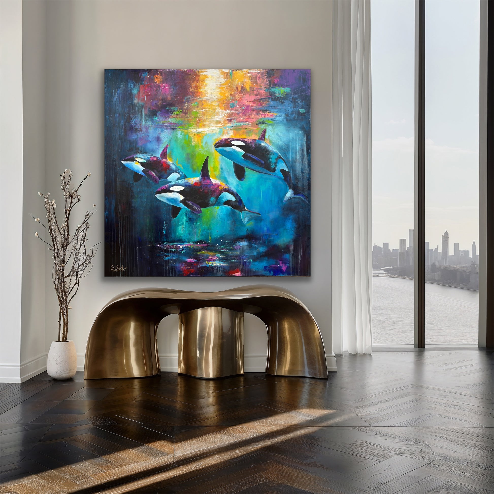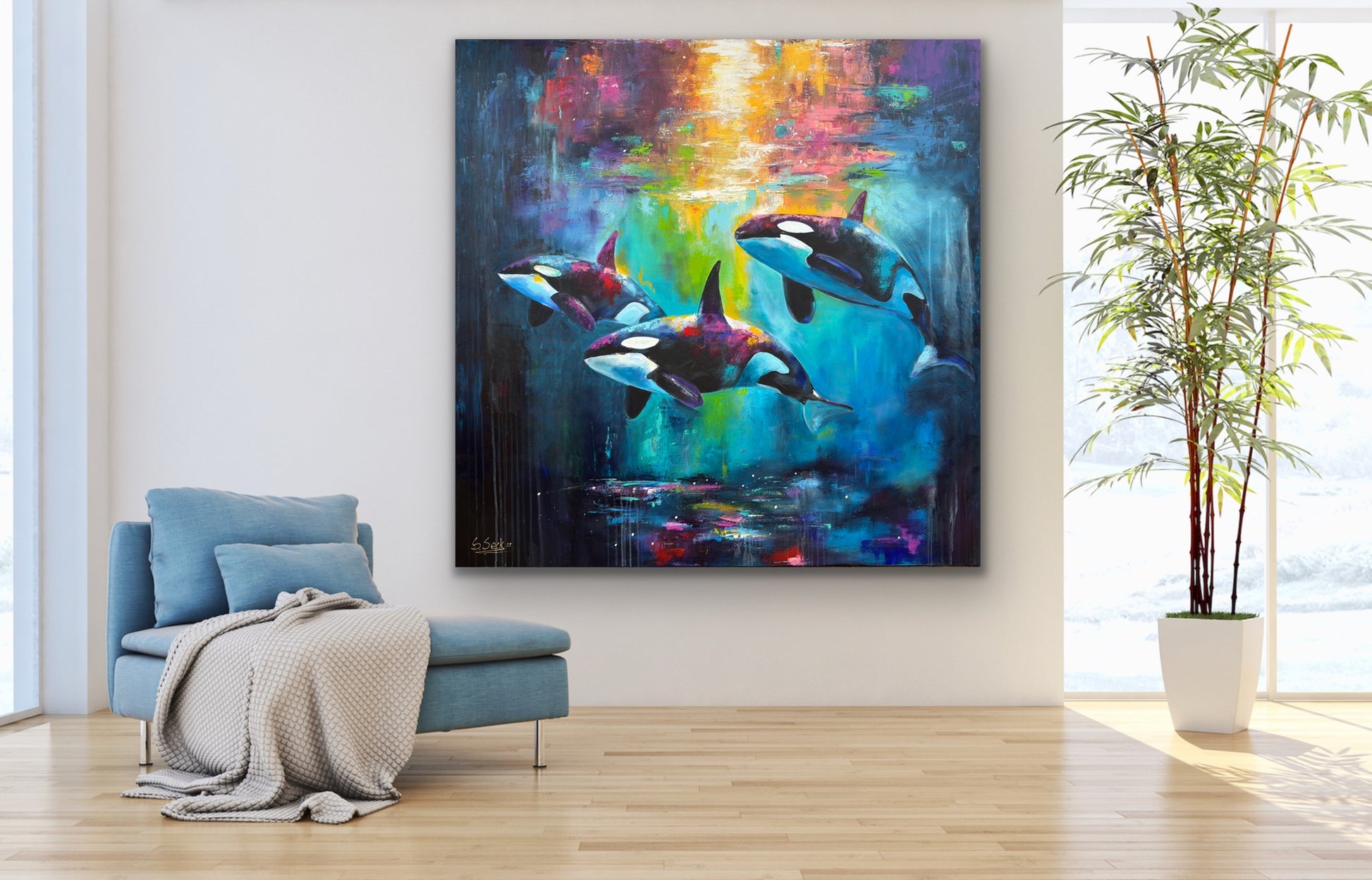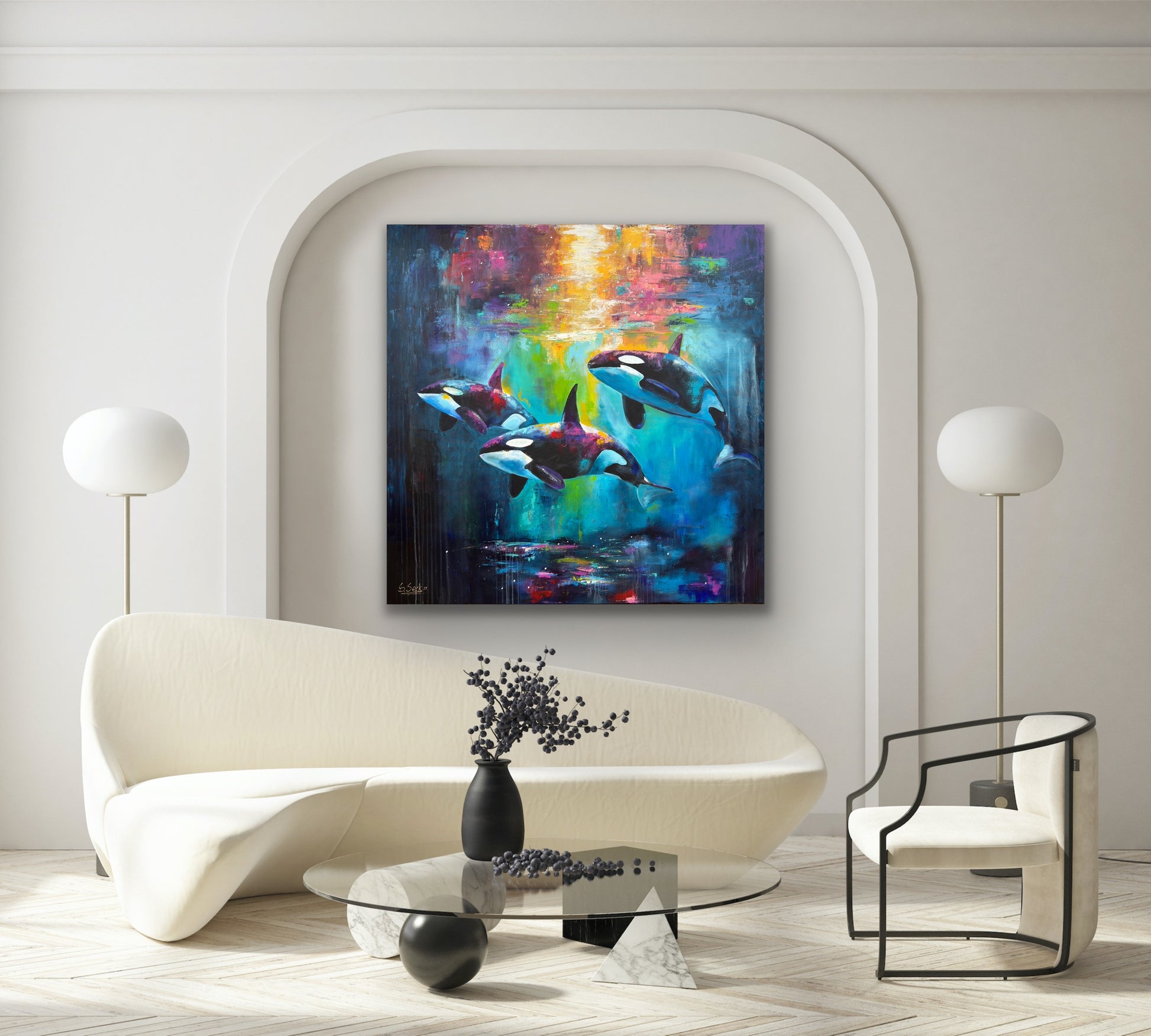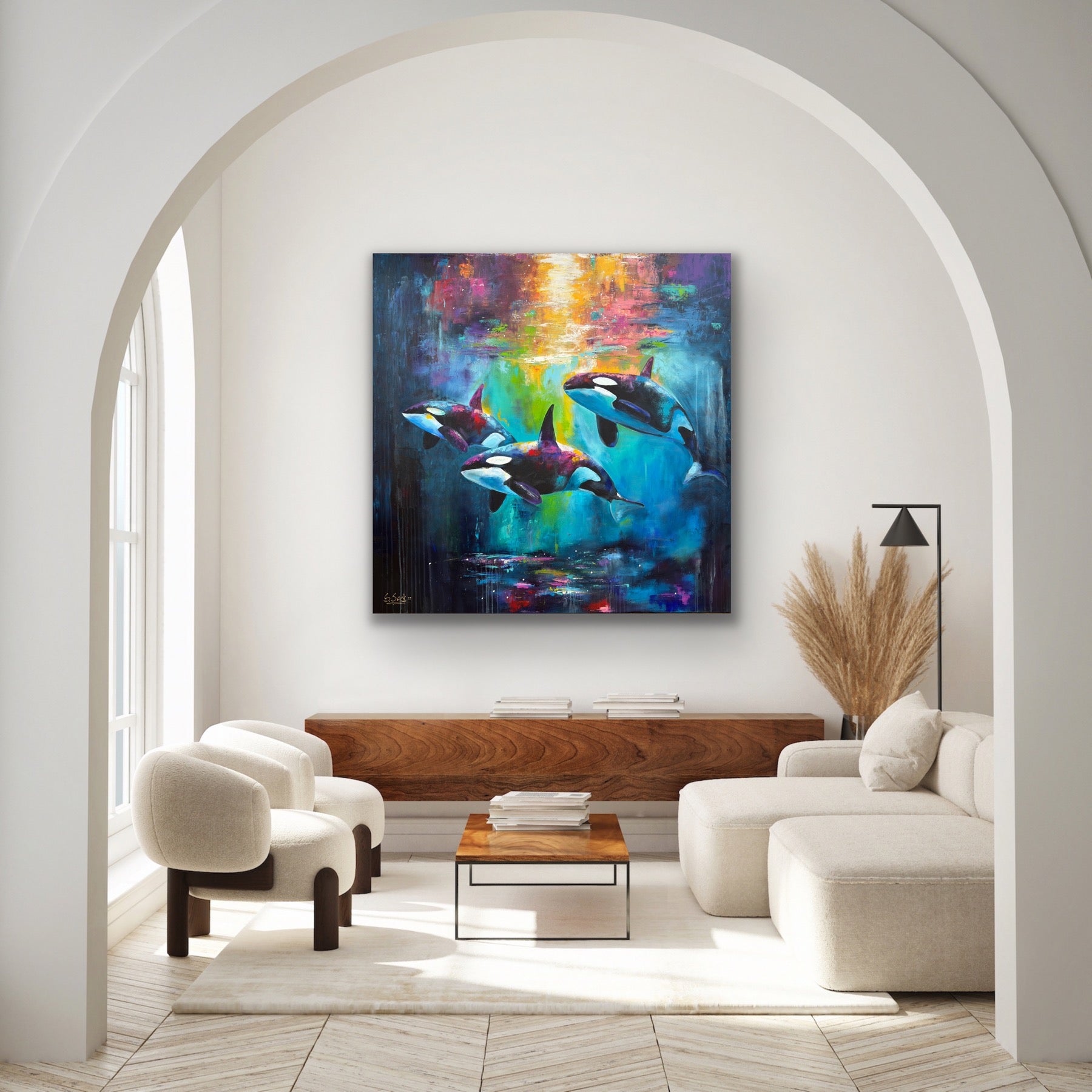 Diese Arbeit ist eine Verbindung von Freiheit und Dynamik. Mit Acrylfarben habe ich versucht, die kraftvolle Eleganz der Orcas im abstrakten, expressiven Stil zu zeigen.