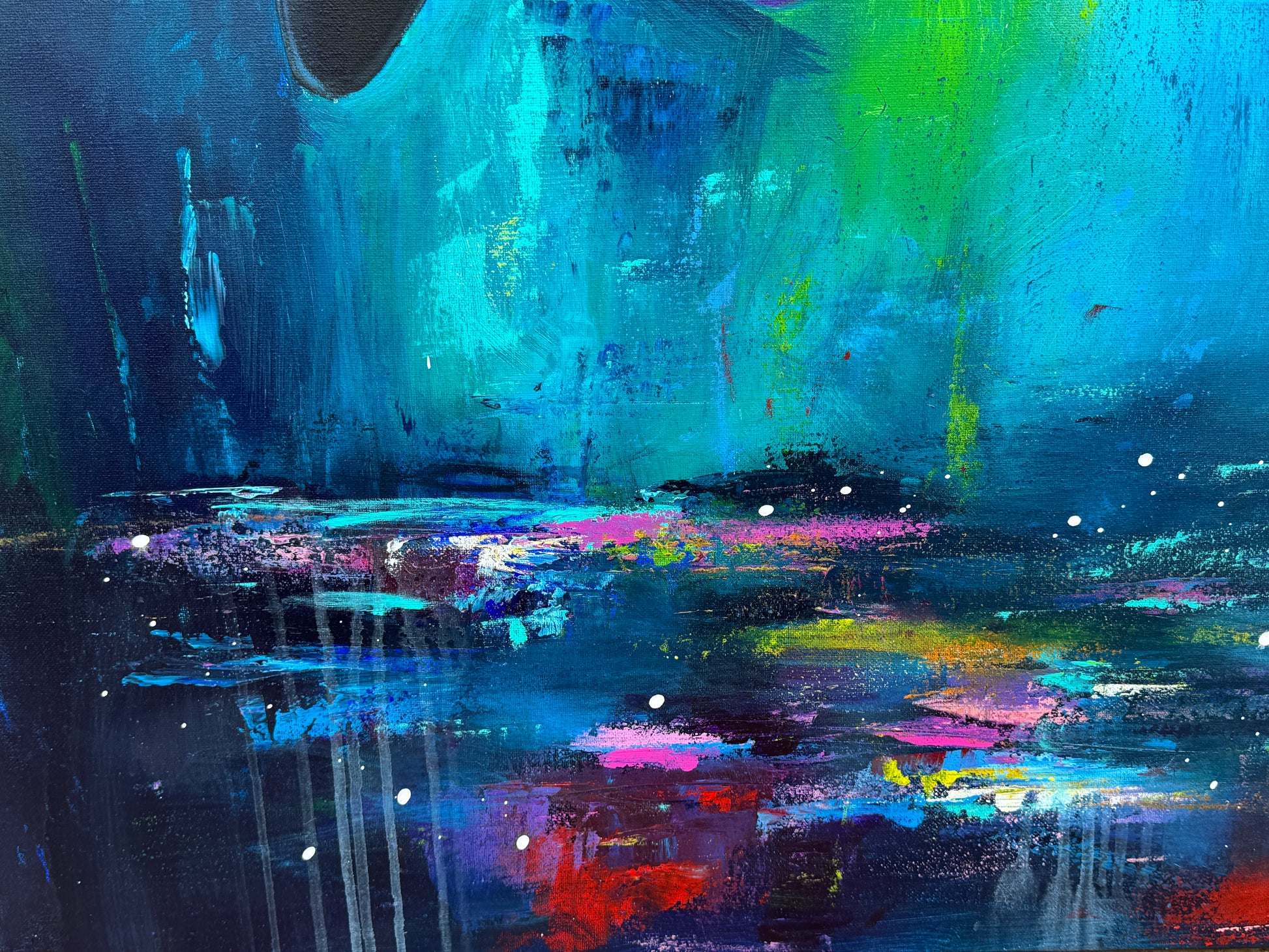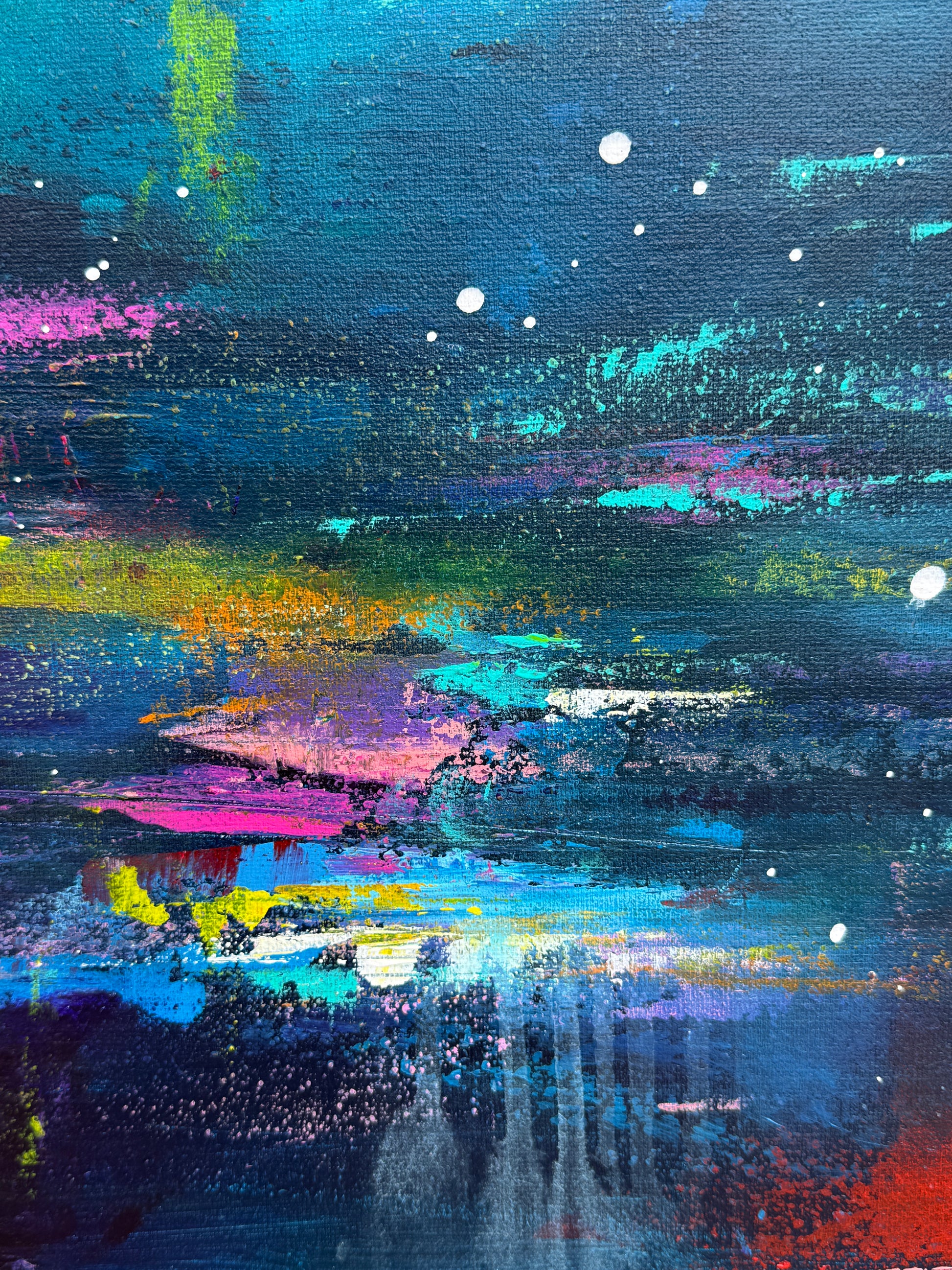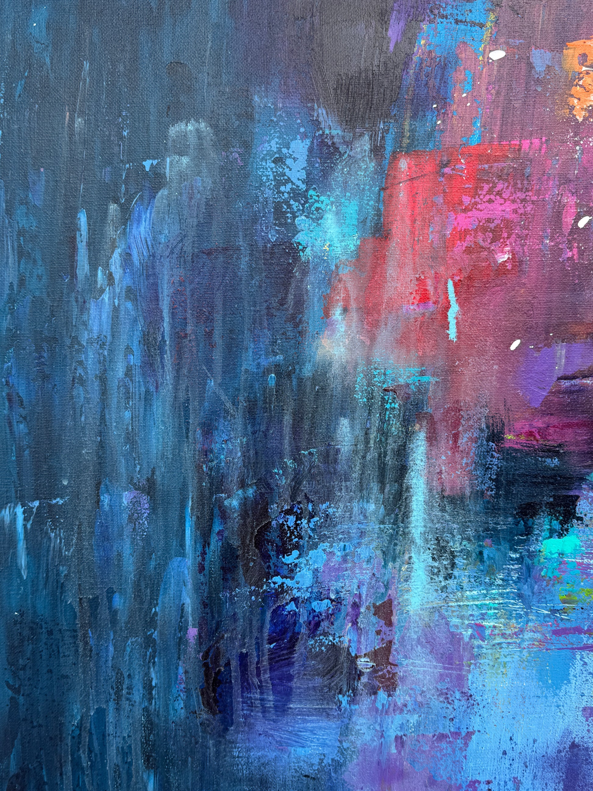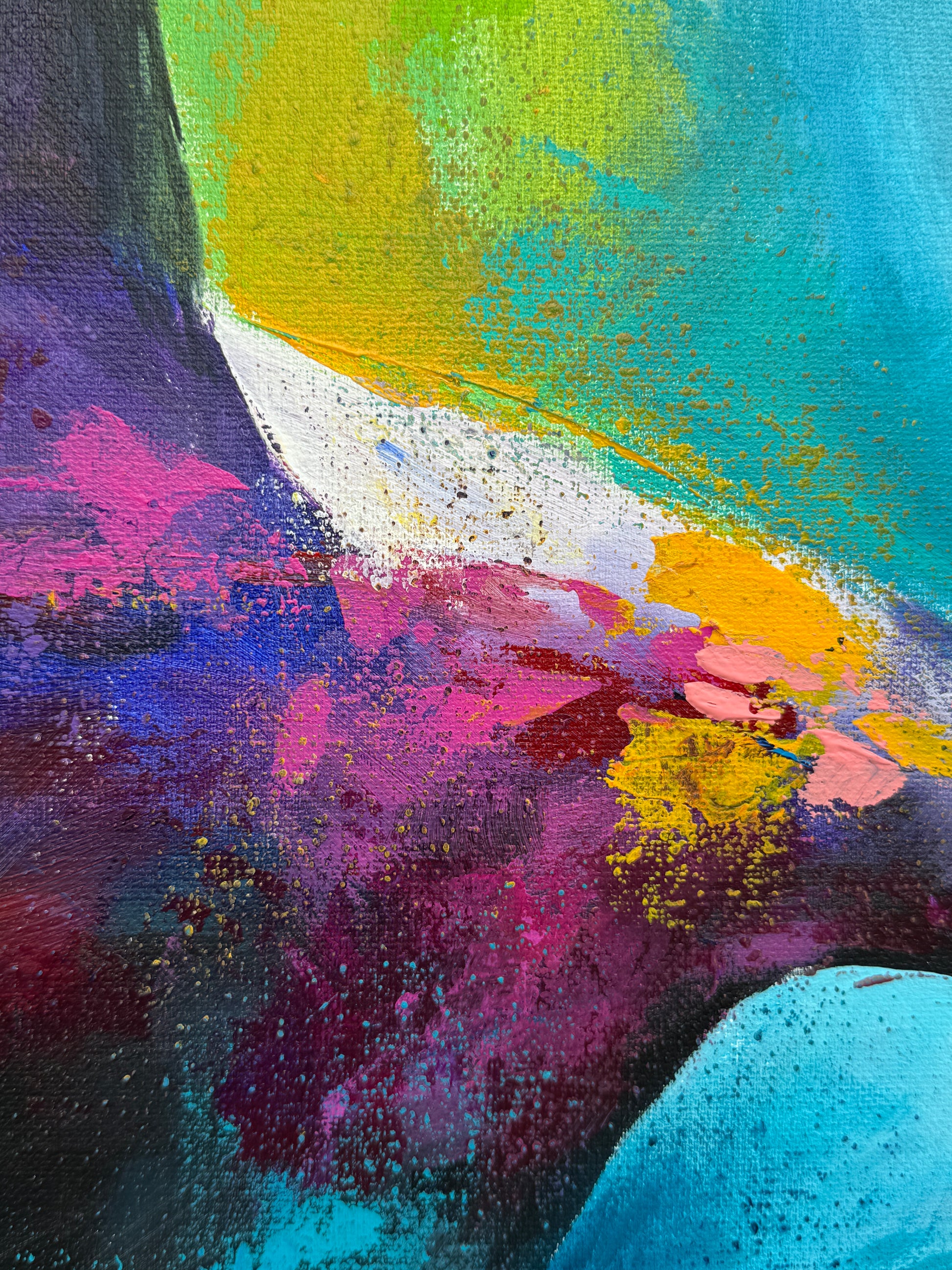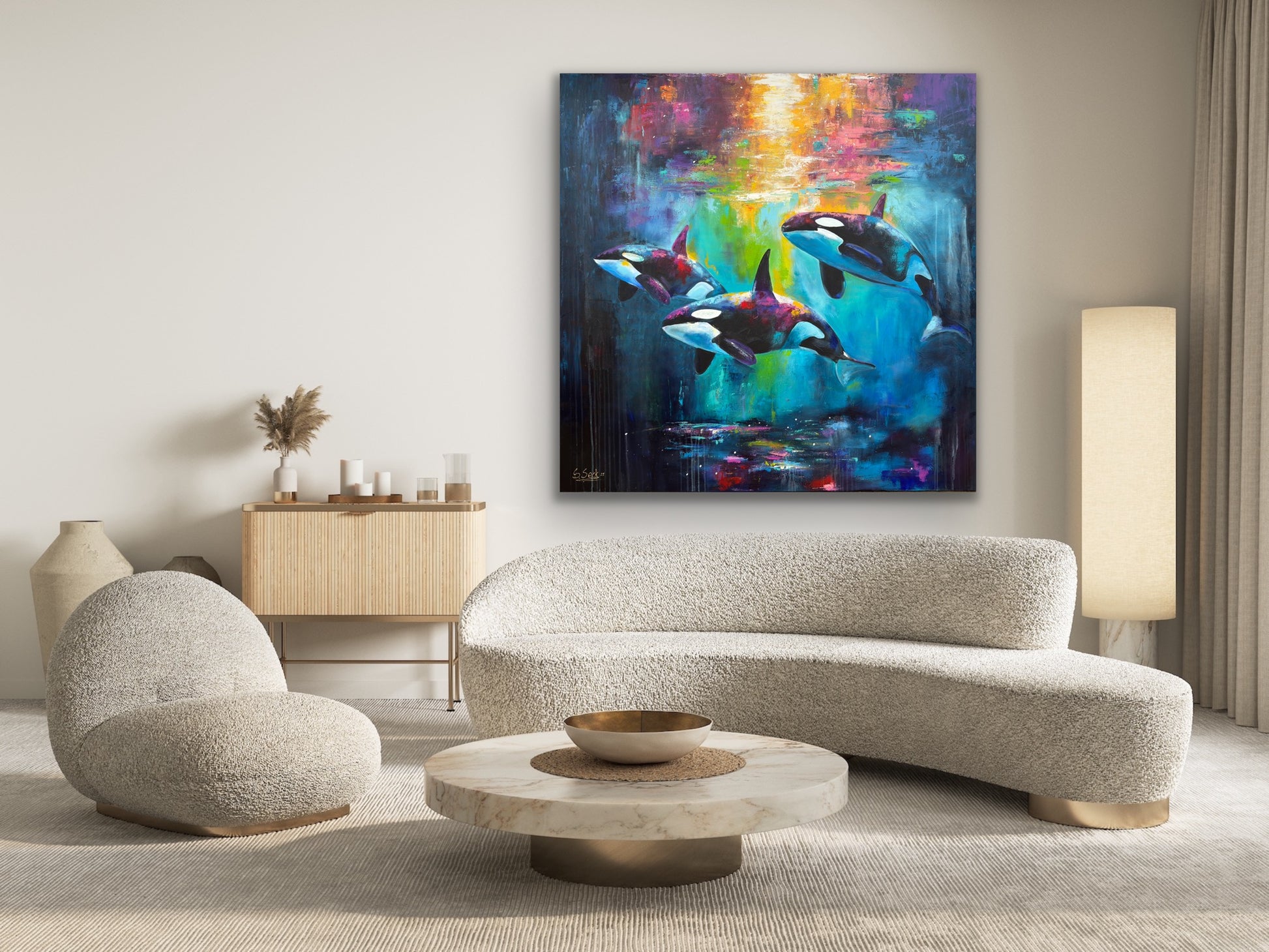 Diese Arbeit ist eine Verbindung von Freiheit und Dynamik. Mit Acrylfarben habe ich versucht, die kraftvolle Eleganz der Orcas im abstrakten, expressiven Stil zu zeigen.