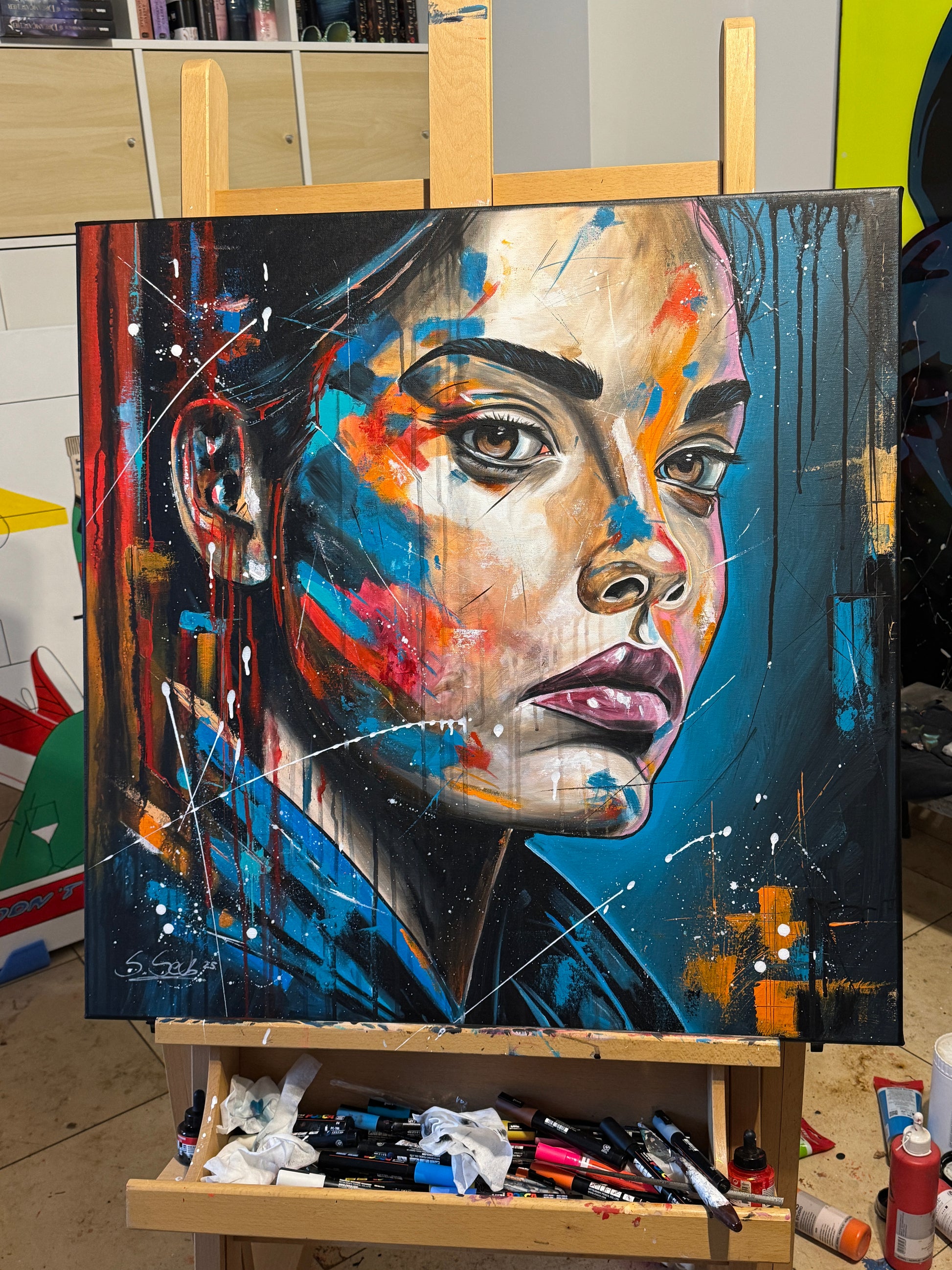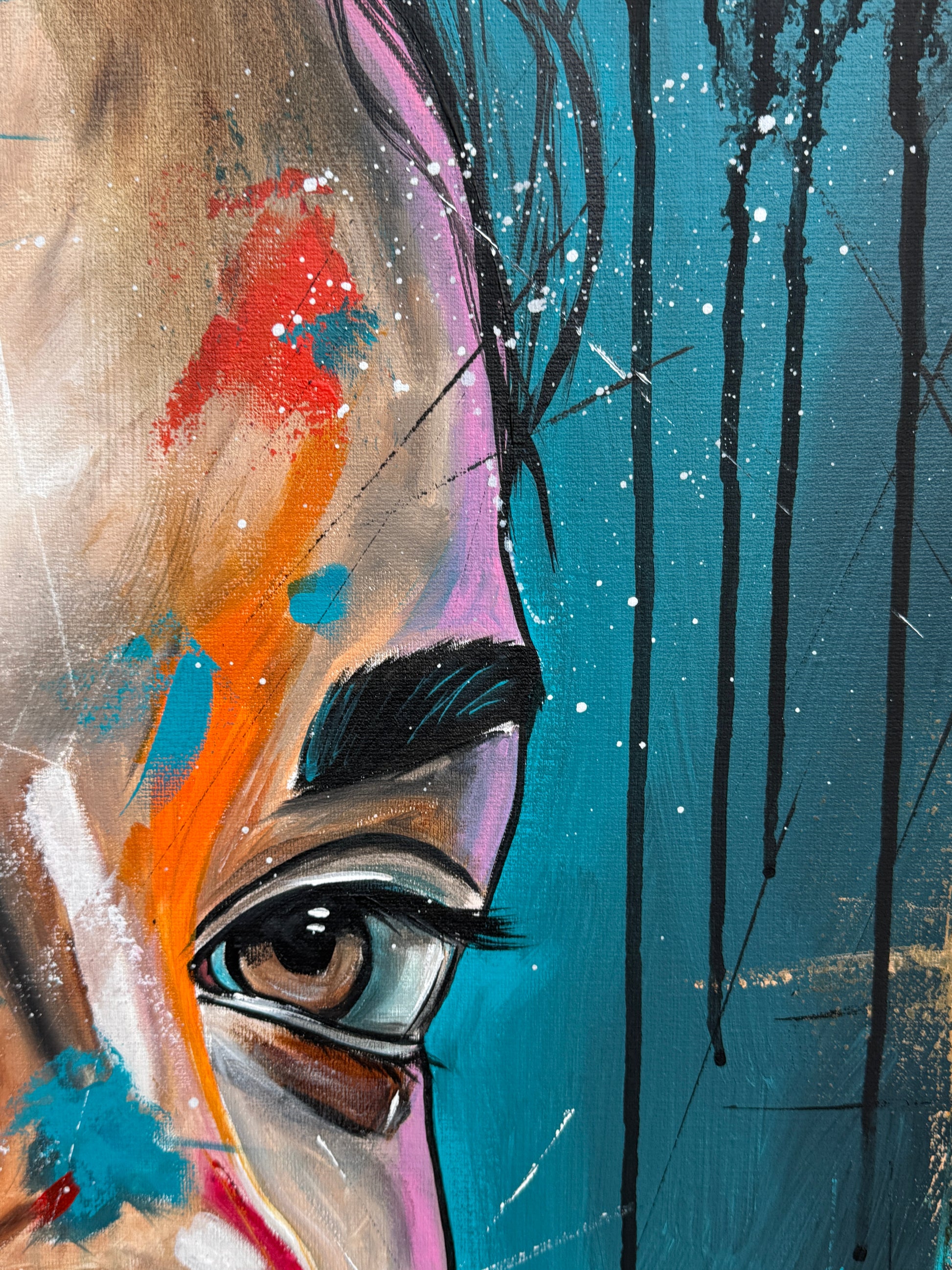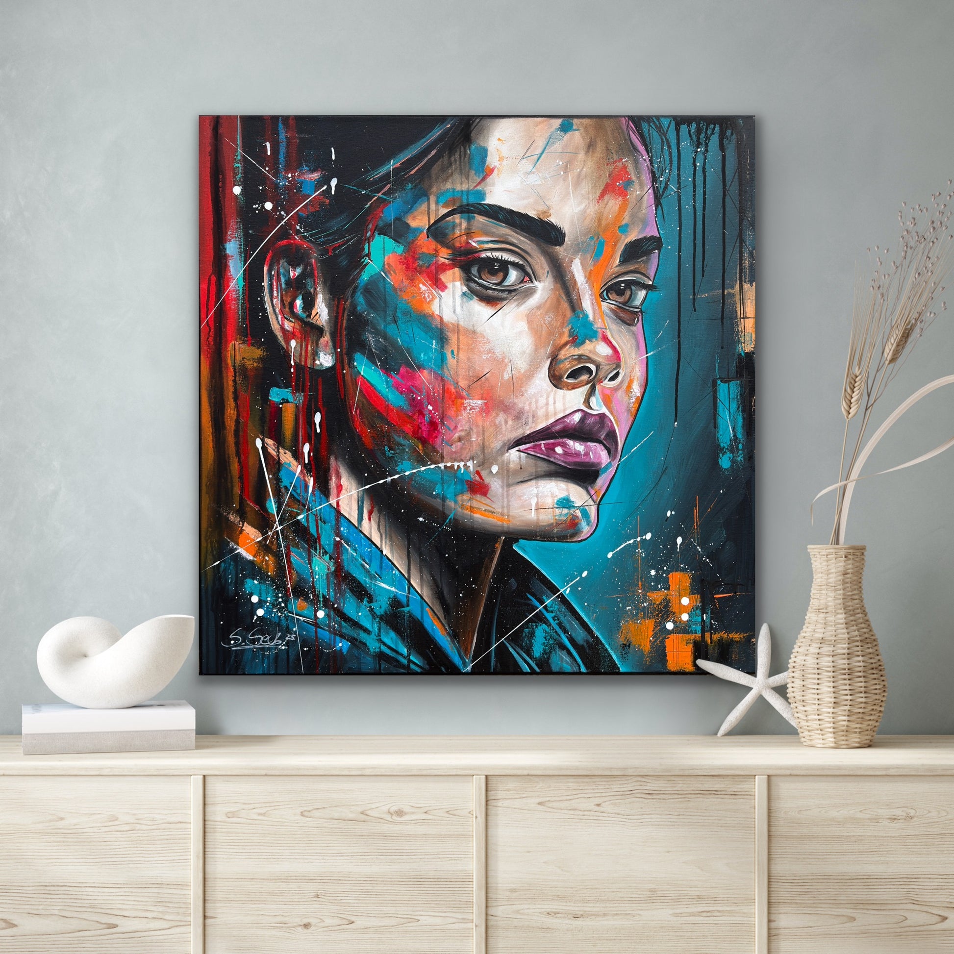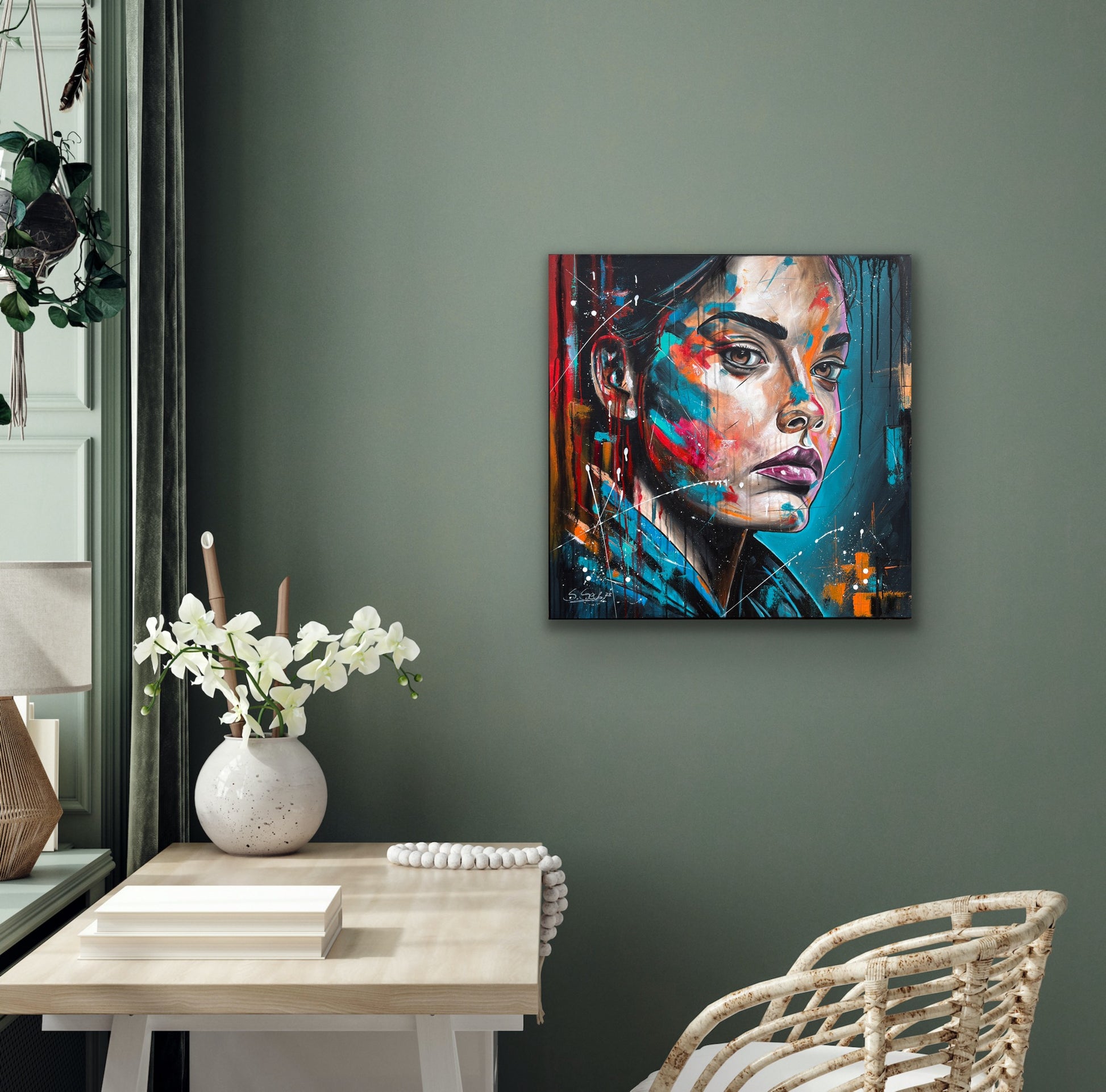 Janine ist eine starke Persönlichkeit und strotzt nur so vor Selbstbewusstsein. Ihre Ausdrucksstärke hebe ich mit pop-artigen Farbspritzern hervor, um die intensiven Emotionen und die innere Stärke zu erfassen, die aus tiefsten Überlegungen entstehen. Die kräftigen, lebendigen Farben gegen den dunklen Hintergrund symbolisieren die Licht- und Schattenseiten unserer Persönlichkeit. So hat auch Janine verschiedene Facetten, helle sowie dunkle. Welche jedoch überwiegen, weiß nur sie selbst.