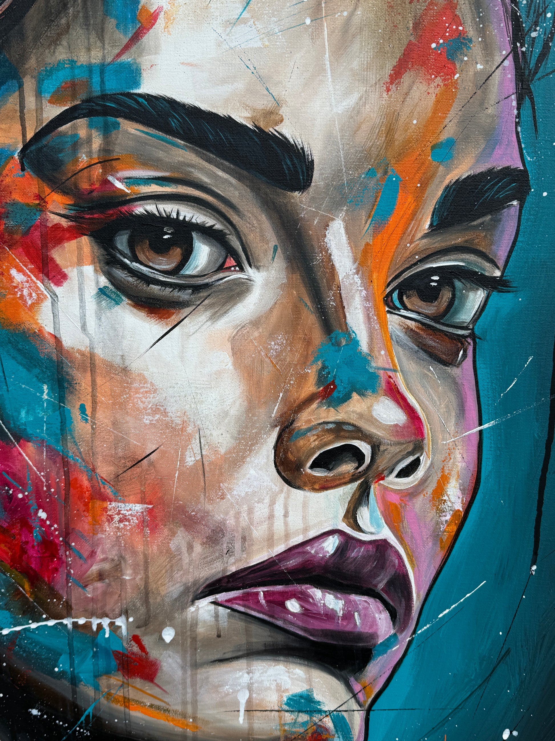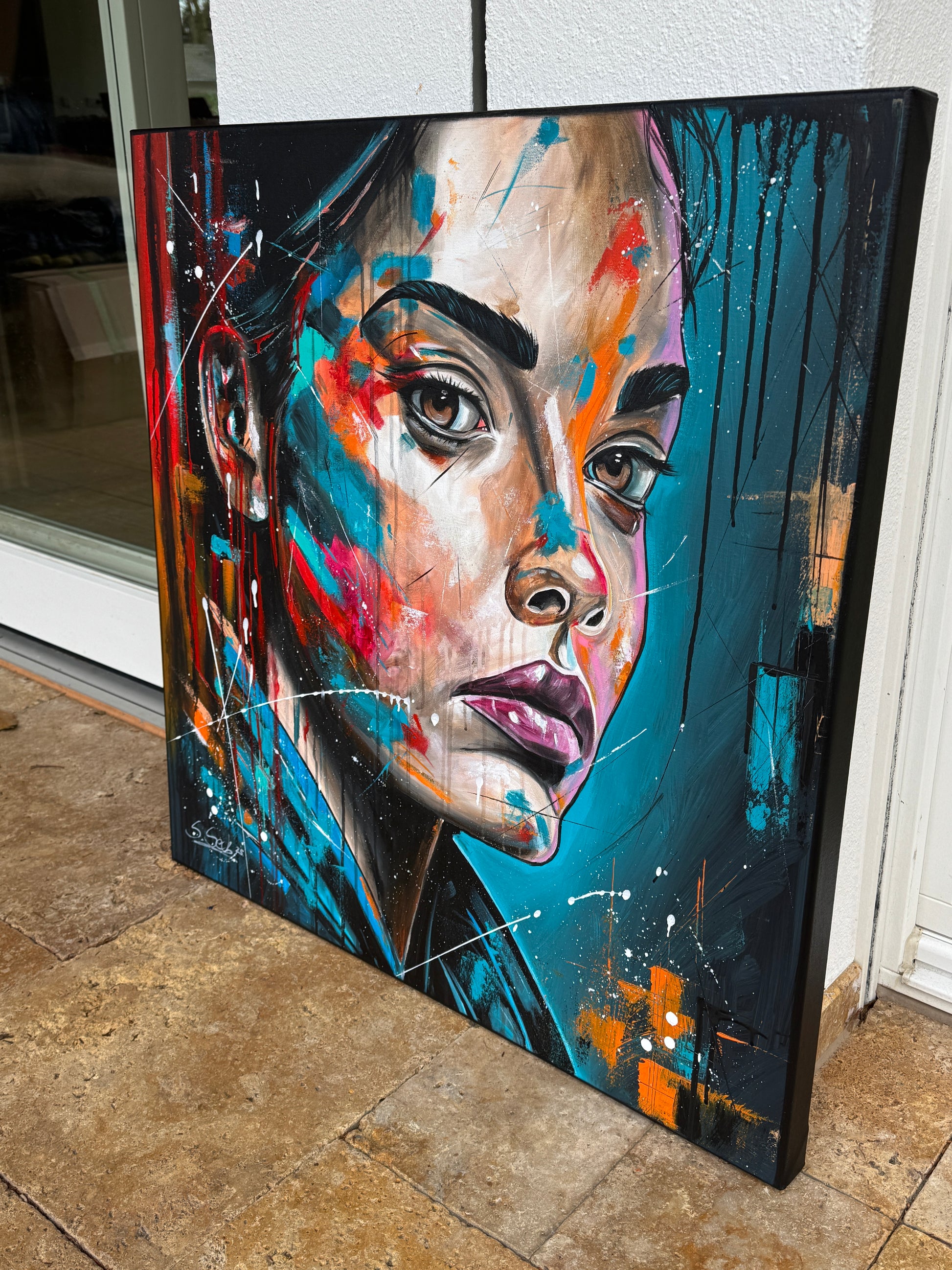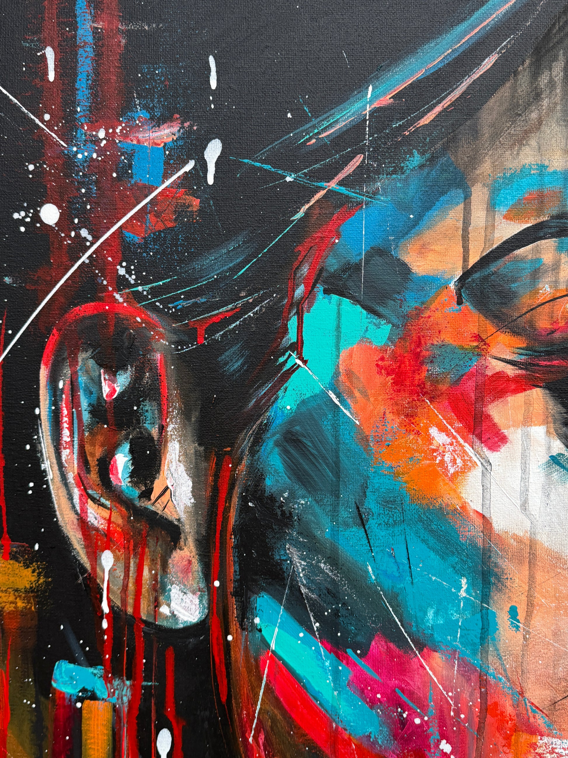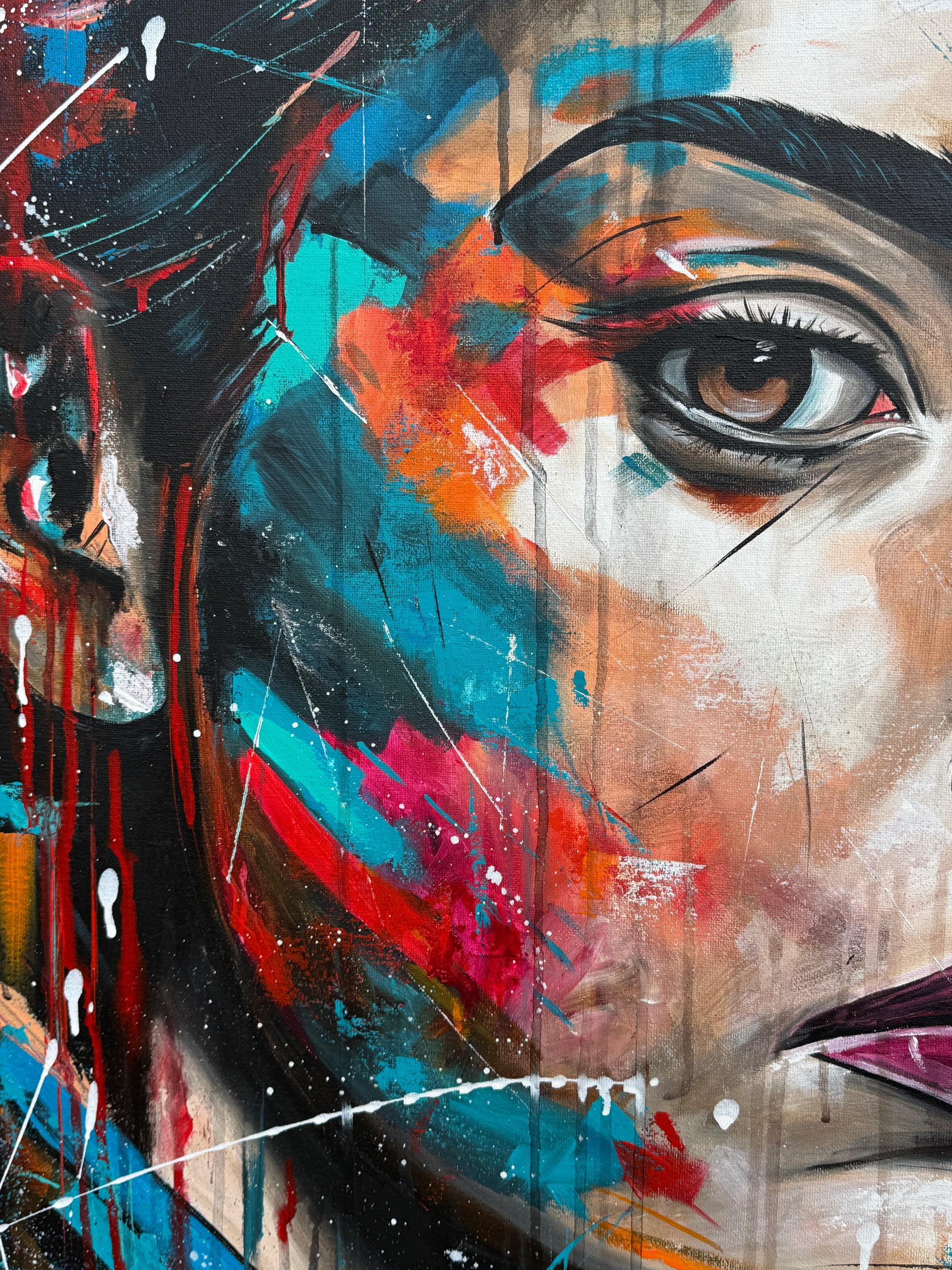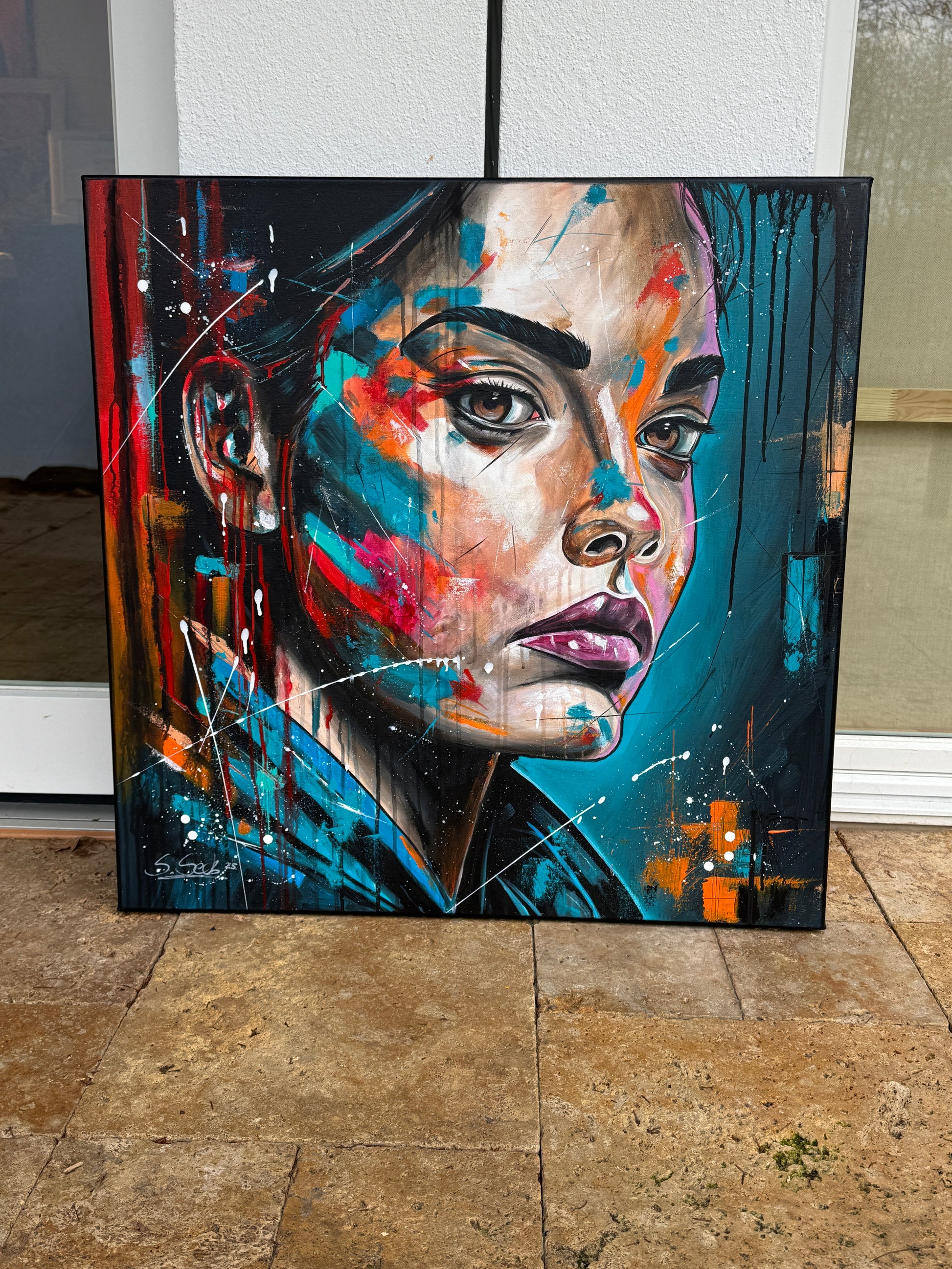 Janine ist eine starke Persönlichkeit und strotzt nur so vor Selbstbewusstsein. Ihre Ausdrucksstärke hebe ich mit pop-artigen Farbspritzern hervor, um die intensiven Emotionen und die innere Stärke zu erfassen, die aus tiefsten Überlegungen entstehen. Die kräftigen, lebendigen Farben gegen den dunklen Hintergrund symbolisieren die Licht- und Schattenseiten unserer Persönlichkeit. So hat auch Janine verschiedene Facetten, helle sowie dunkle. Welche jedoch überwiegen, weiß nur sie selbst.