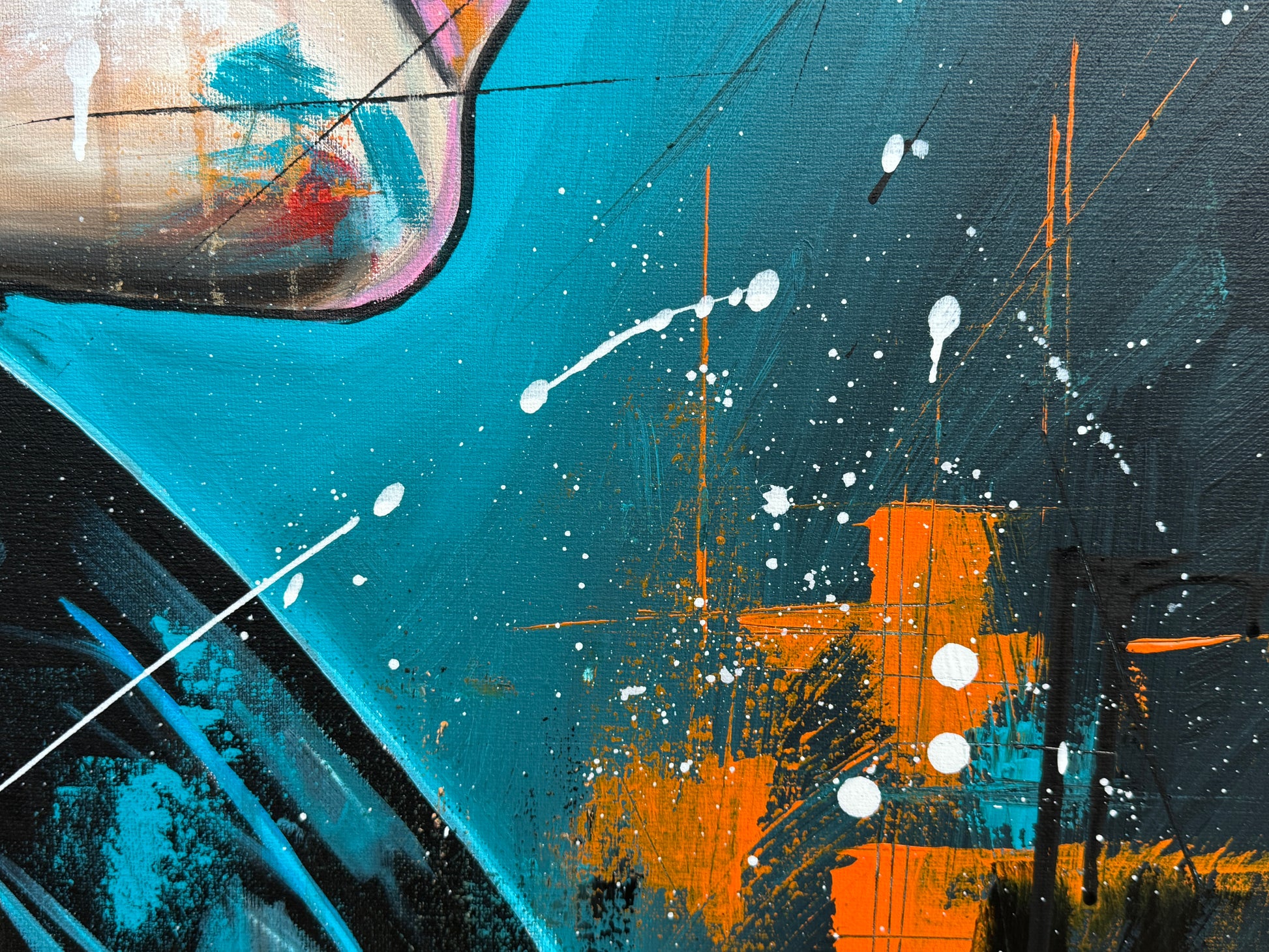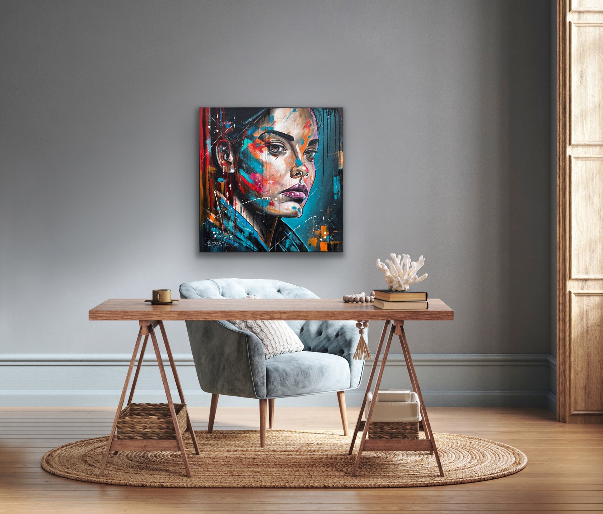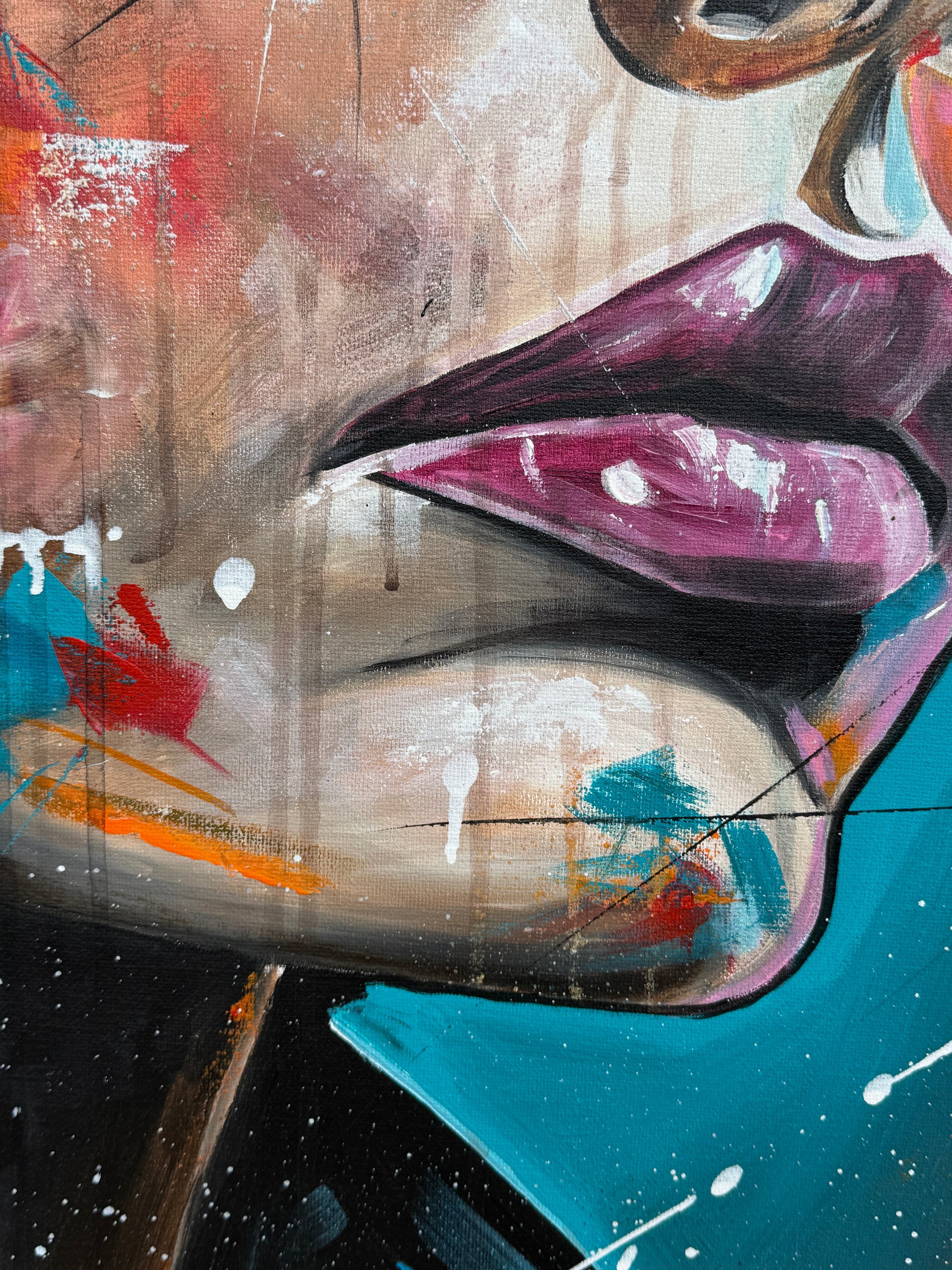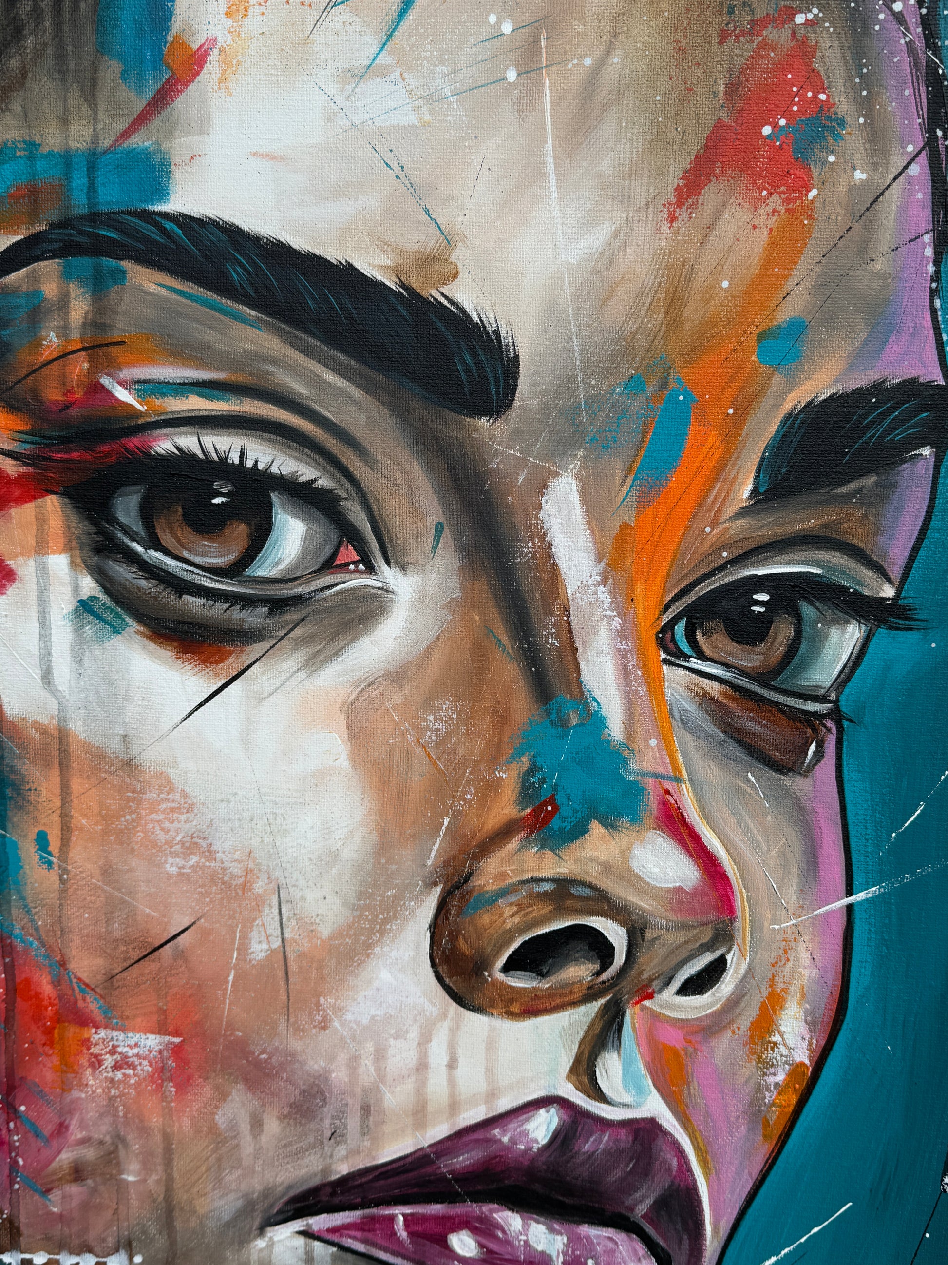 Janine ist eine starke Persönlichkeit und strotzt nur so vor Selbstbewusstsein. Ihre Ausdrucksstärke hebe ich mit pop-artigen Farbspritzern hervor, um die intensiven Emotionen und die innere Stärke zu erfassen, die aus tiefsten Überlegungen entstehen. Die kräftigen, lebendigen Farben gegen den dunklen Hintergrund symbolisieren die Licht- und Schattenseiten unserer Persönlichkeit. So hat auch Janine verschiedene Facetten, helle sowie dunkle. Welche jedoch überwiegen, weiß nur sie selbst.