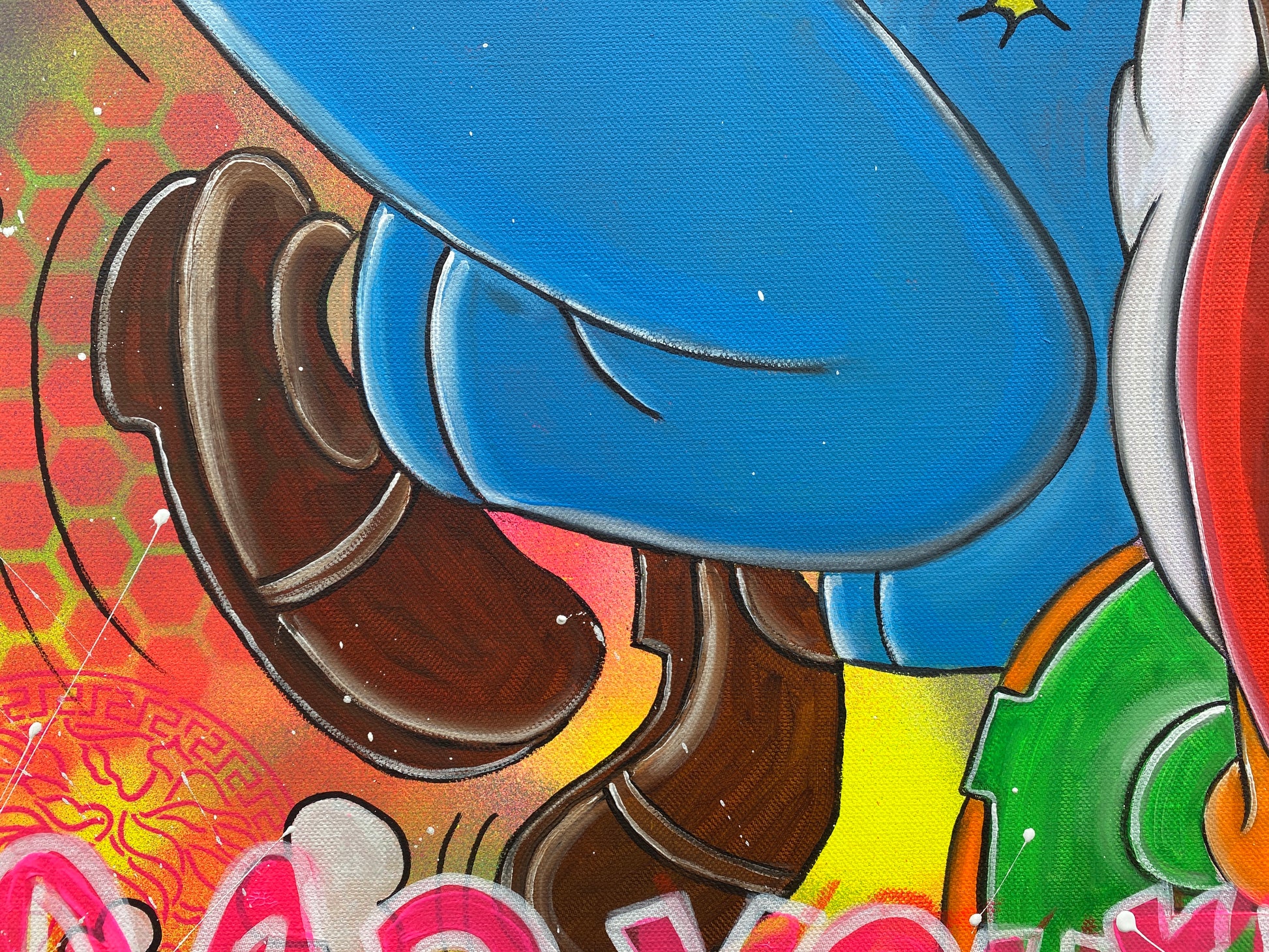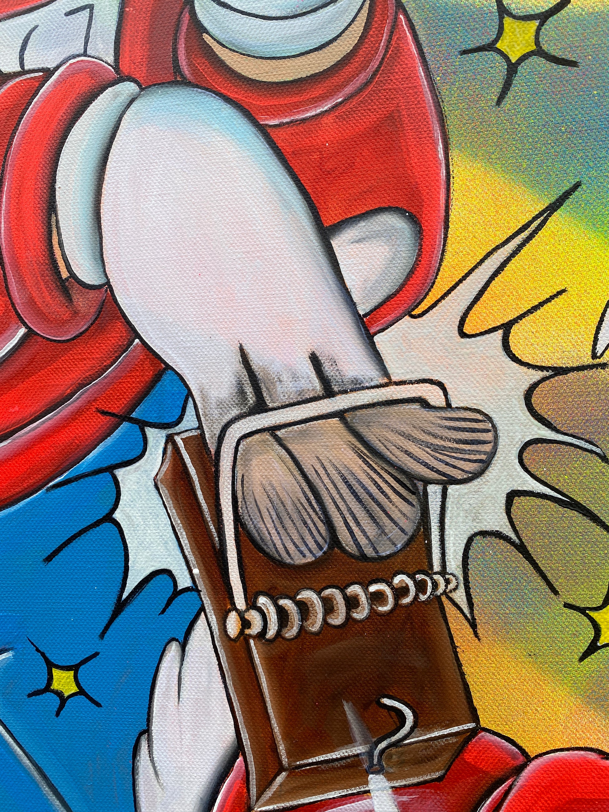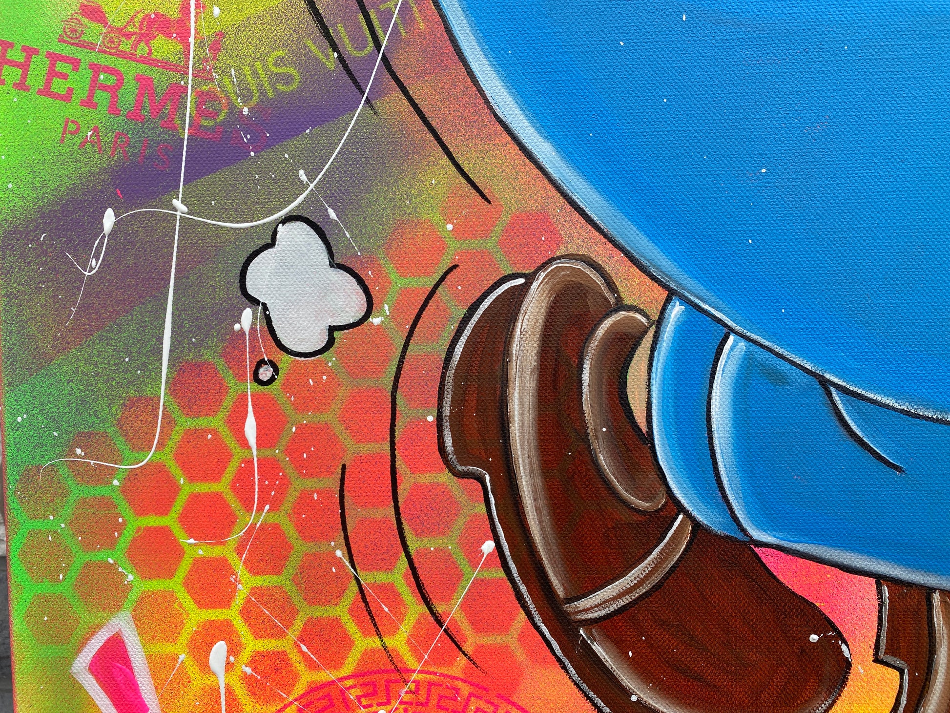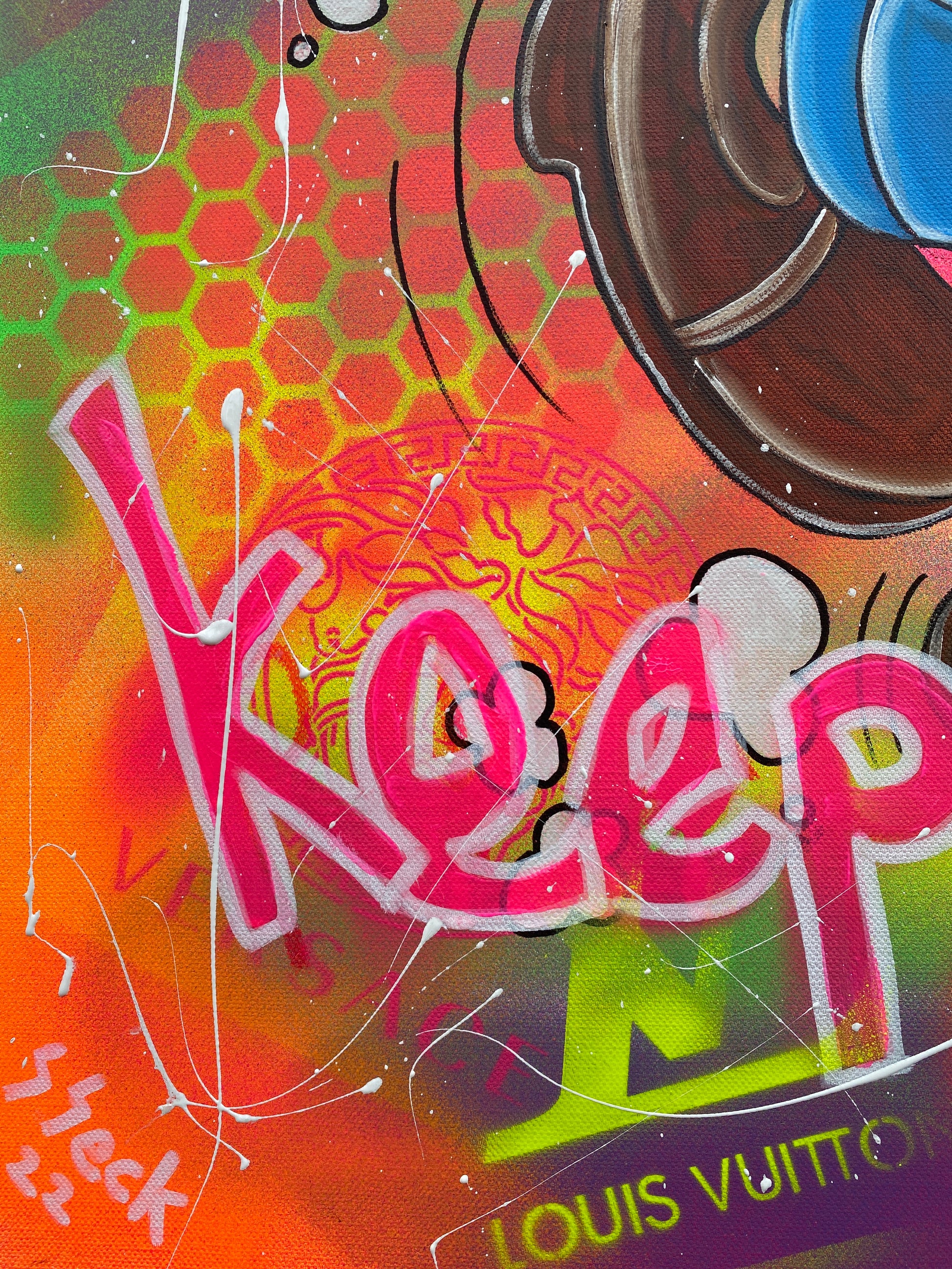 Das poppige Werk wurde mit Acrylfarben gemalt. Zum Einsatz kamen auch UV-Farben, die bei UV-Schwarzlicht Ihren Effekt preisgeben, sowie "dark in the glow" Farben, die auch ohne Licht im Dunkeln leuchten.