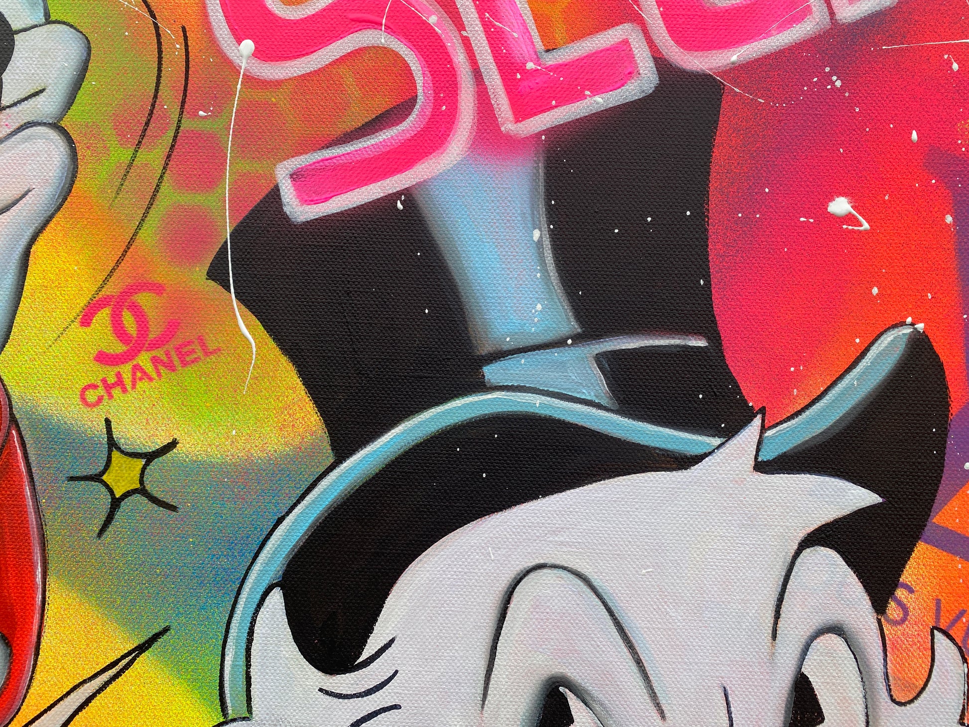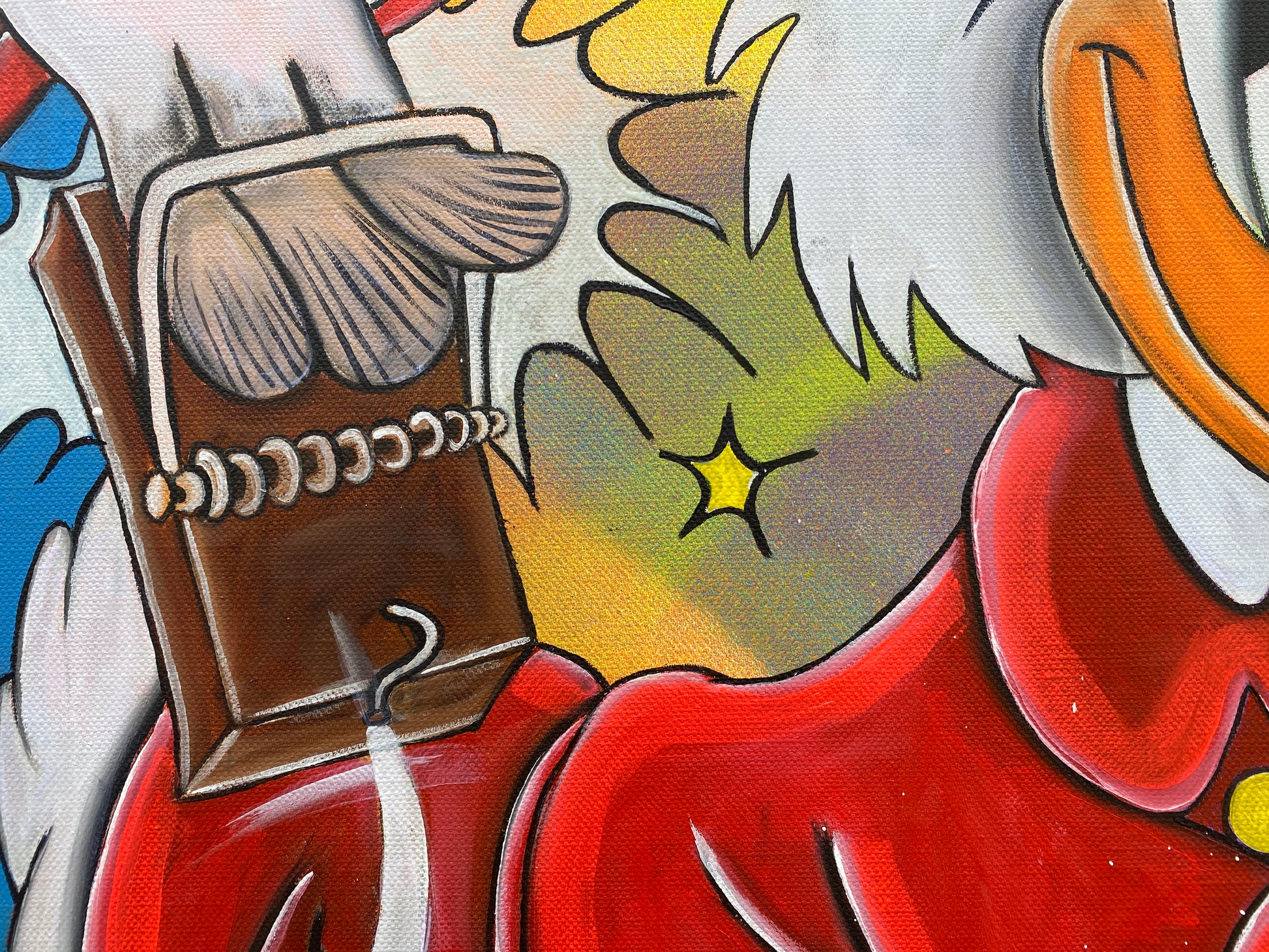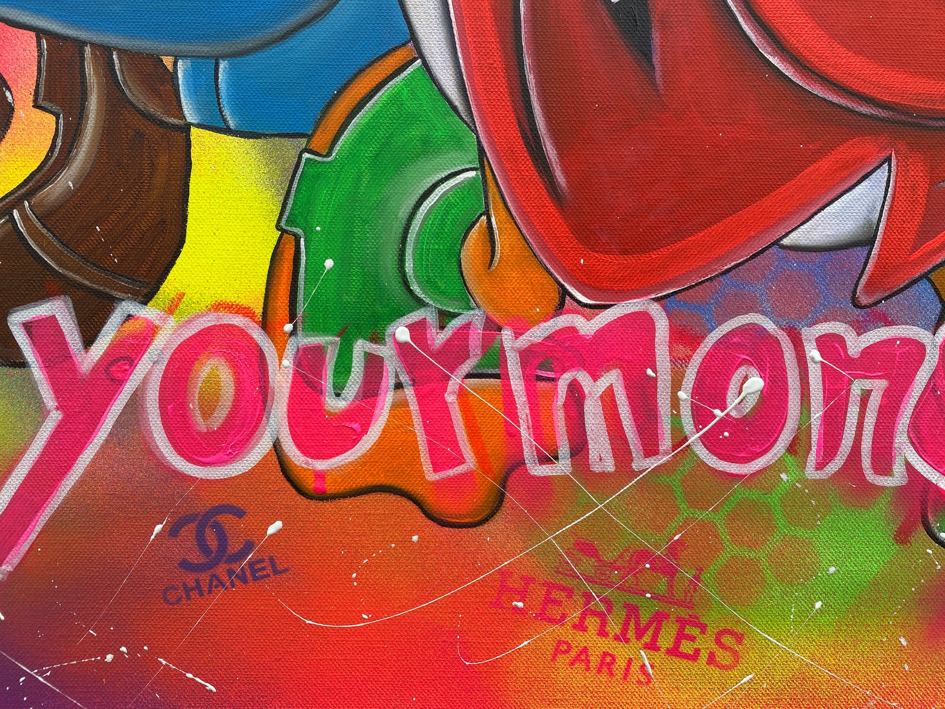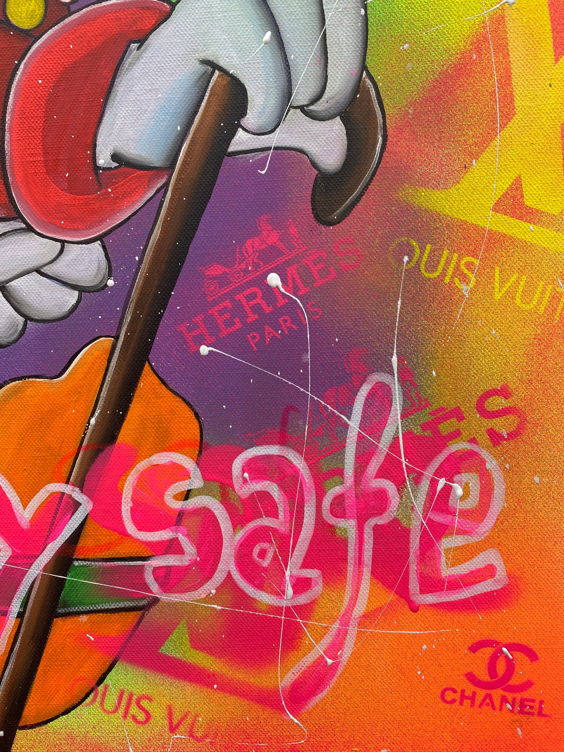 Das poppige Werk wurde mit Acrylfarben gemalt. Zum Einsatz kamen auch UV-Farben, die bei UV-Schwarzlicht Ihren Effekt preisgeben, sowie "dark in the glow" Farben, die auch ohne Licht im Dunkeln leuchten.