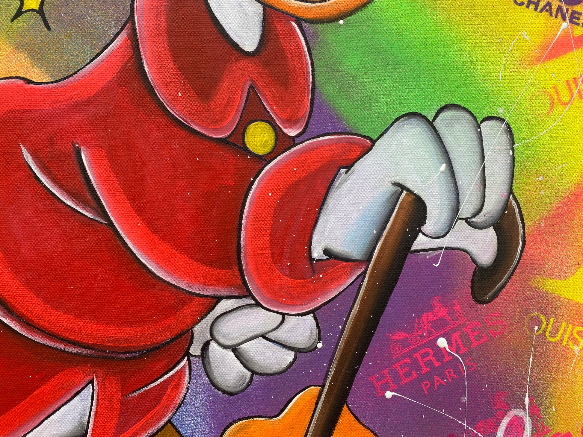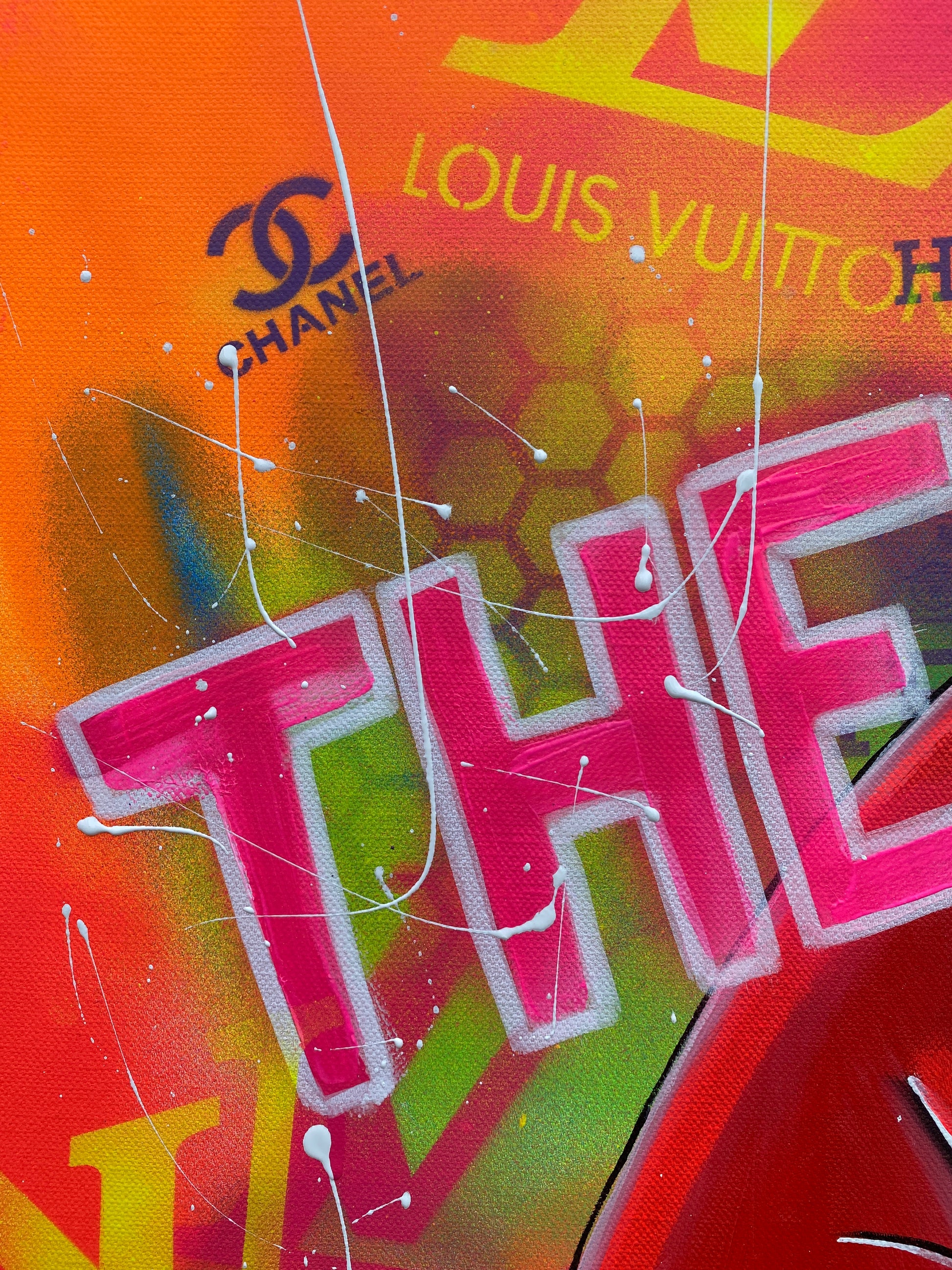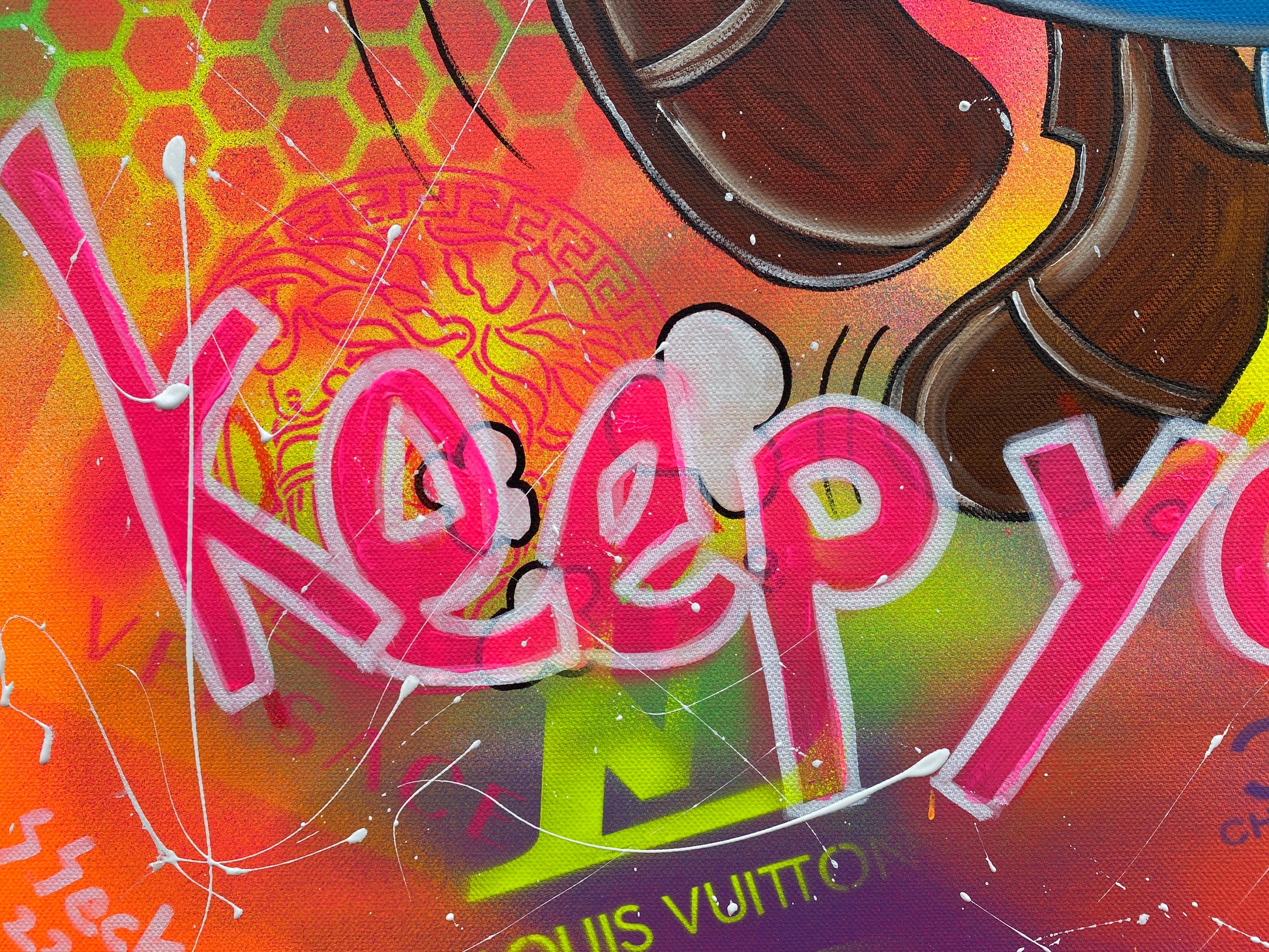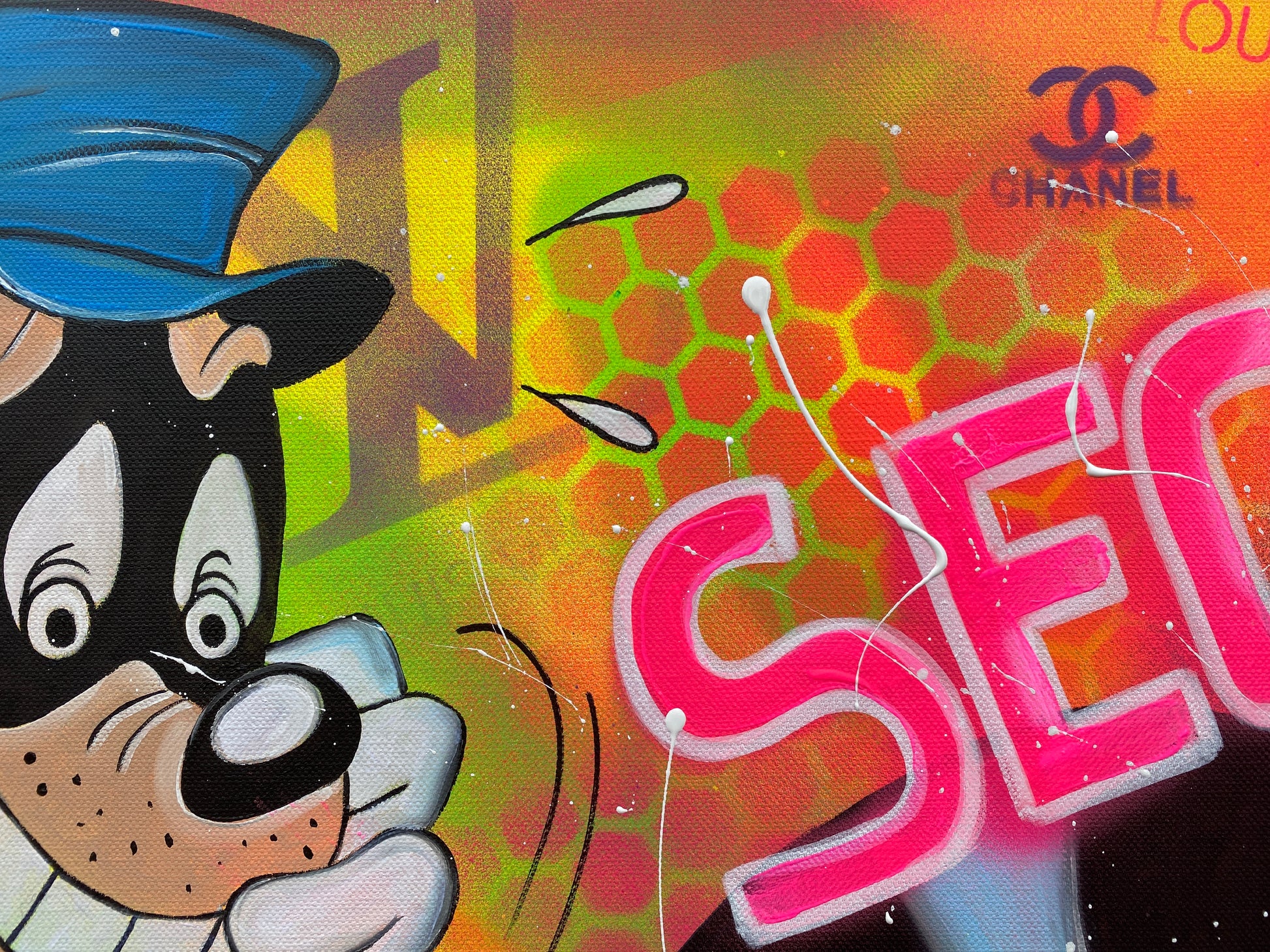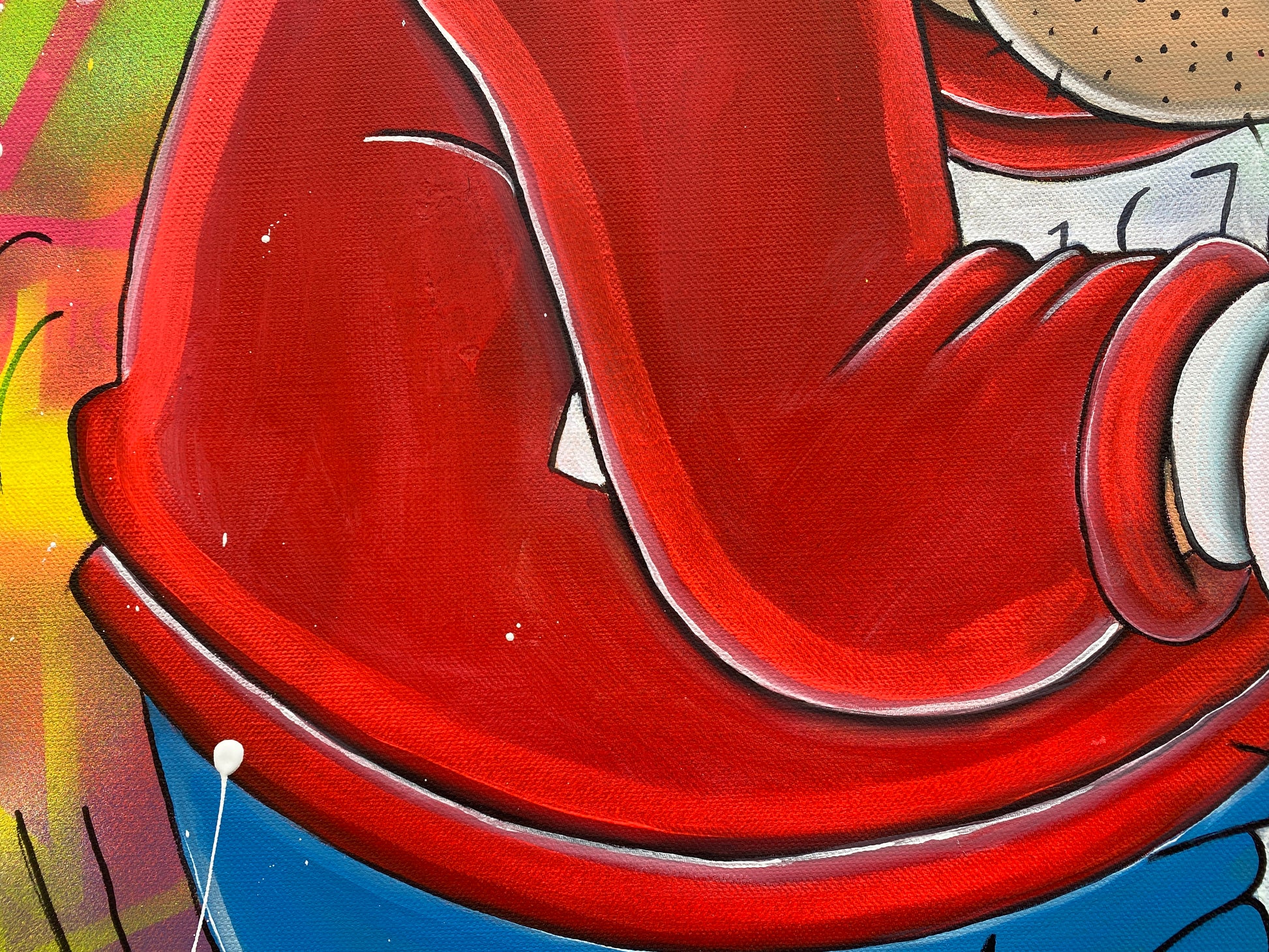 Das poppige Werk wurde mit Acrylfarben gemalt. Zum Einsatz kamen auch UV-Farben, die bei UV-Schwarzlicht Ihren Effekt preisgeben, sowie "dark in the glow" Farben, die auch ohne Licht im Dunkeln leuchten.