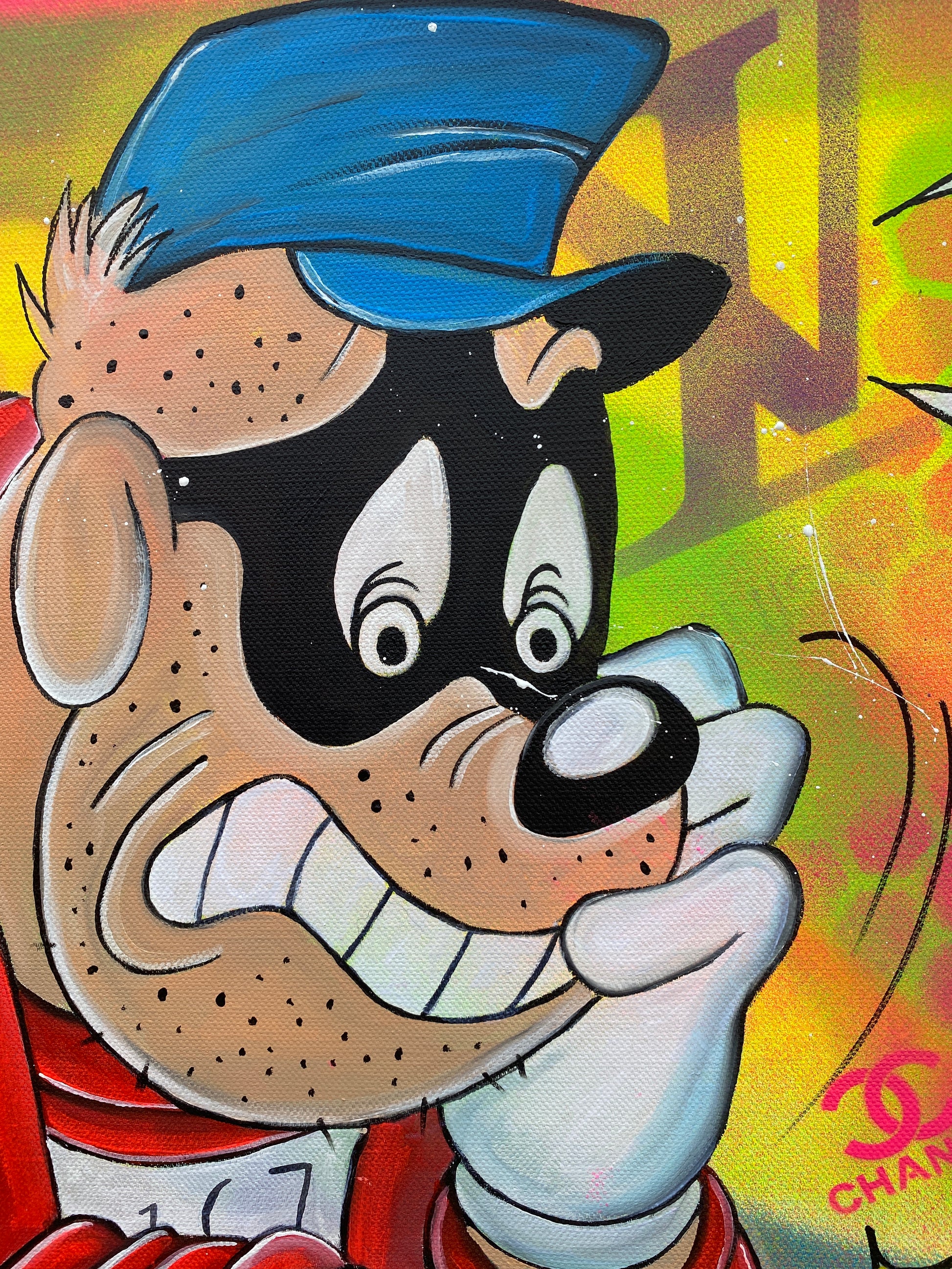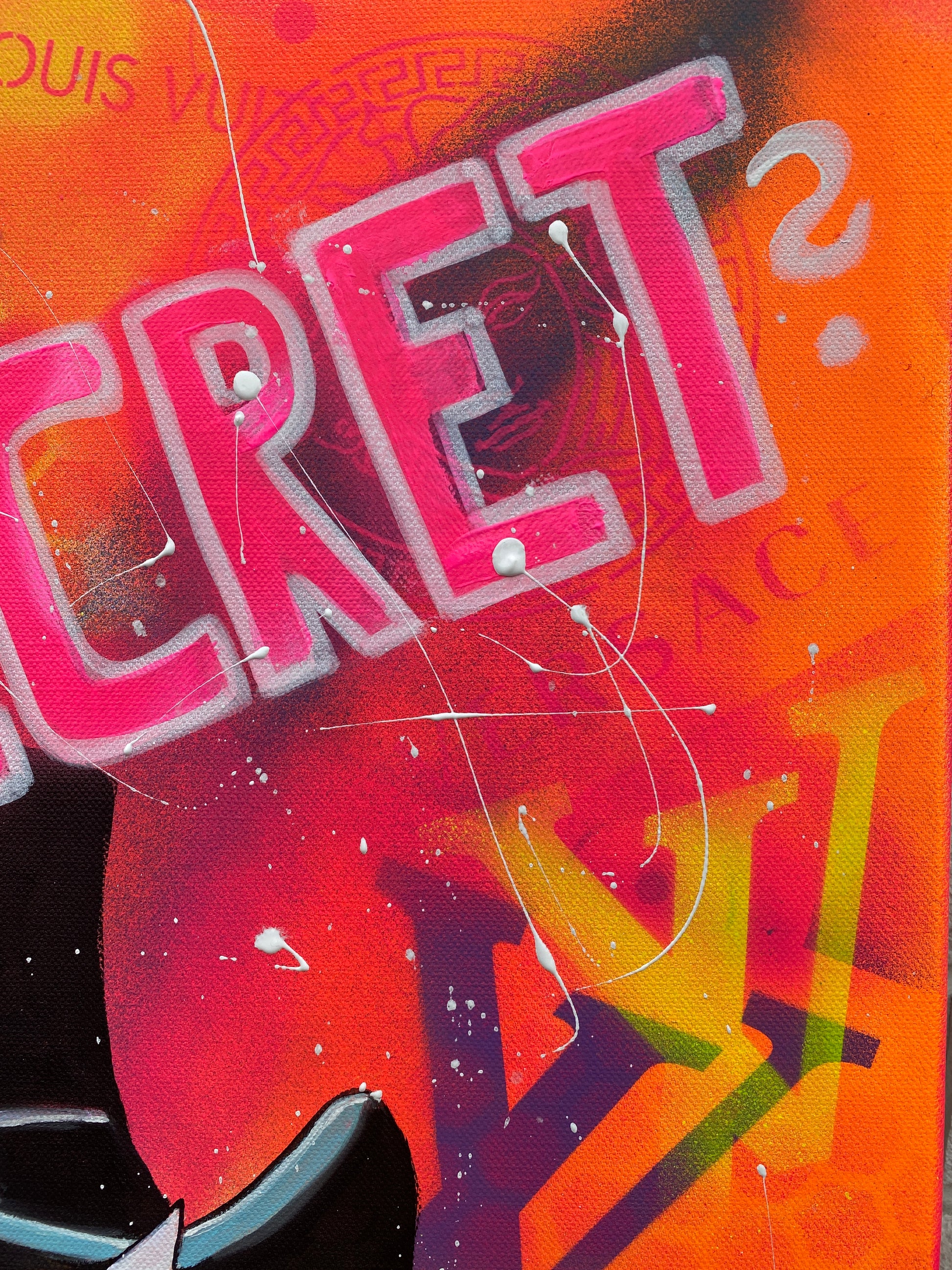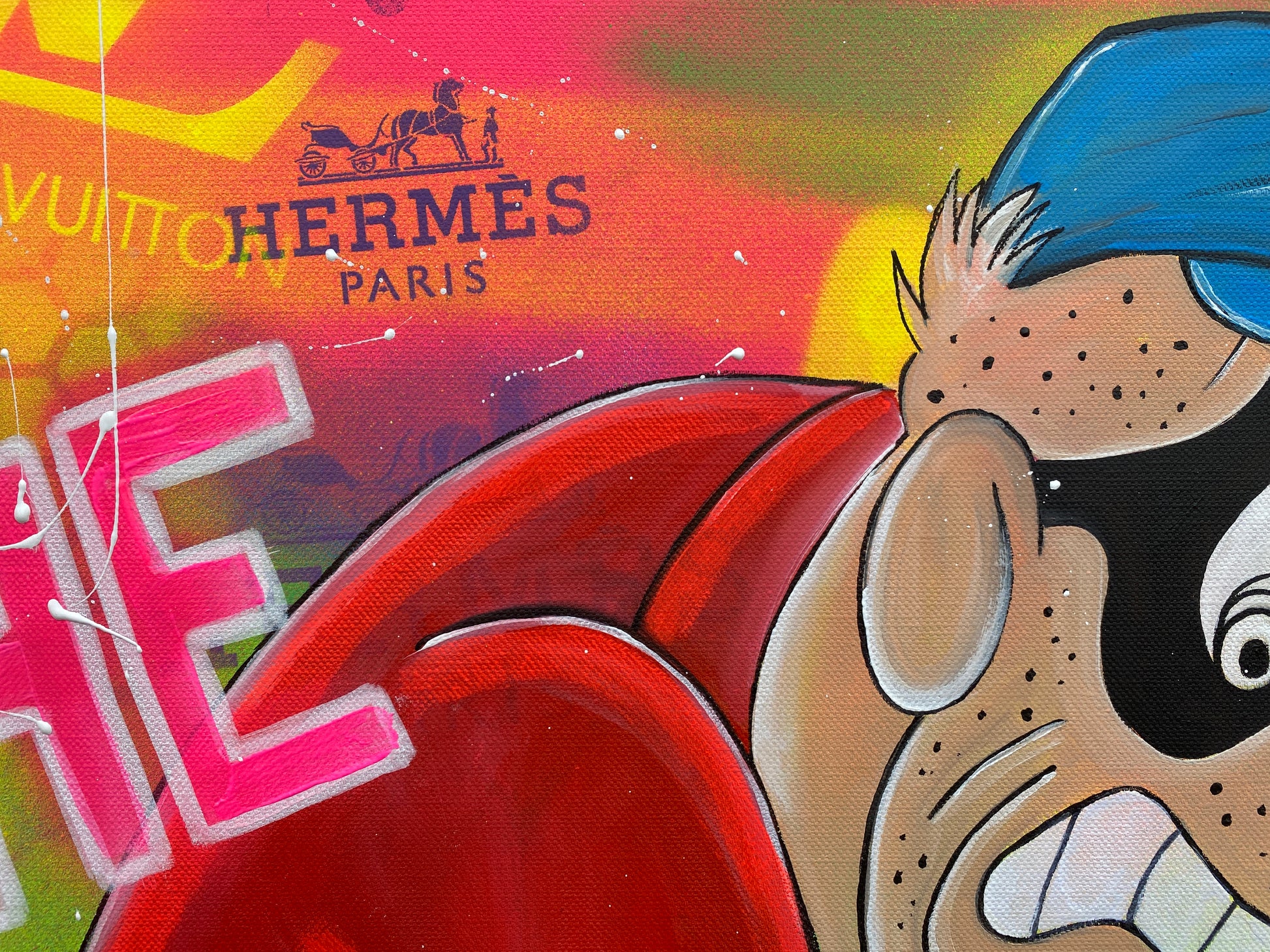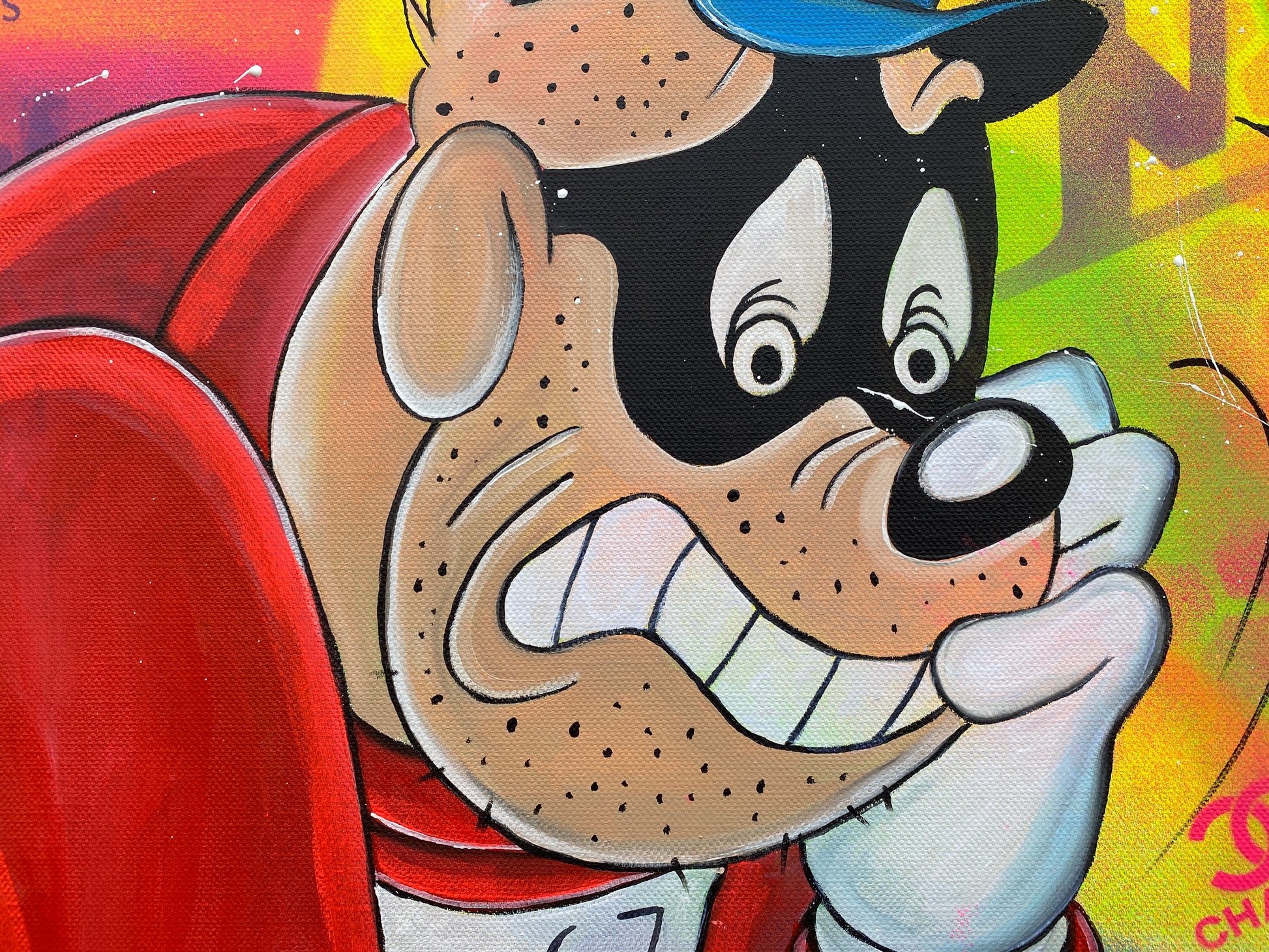 Das poppige Werk wurde mit Acrylfarben gemalt. Zum Einsatz kamen auch UV-Farben, die bei UV-Schwarzlicht Ihren Effekt preisgeben, sowie "dark in the glow" Farben, die auch ohne Licht im Dunkeln leuchten.