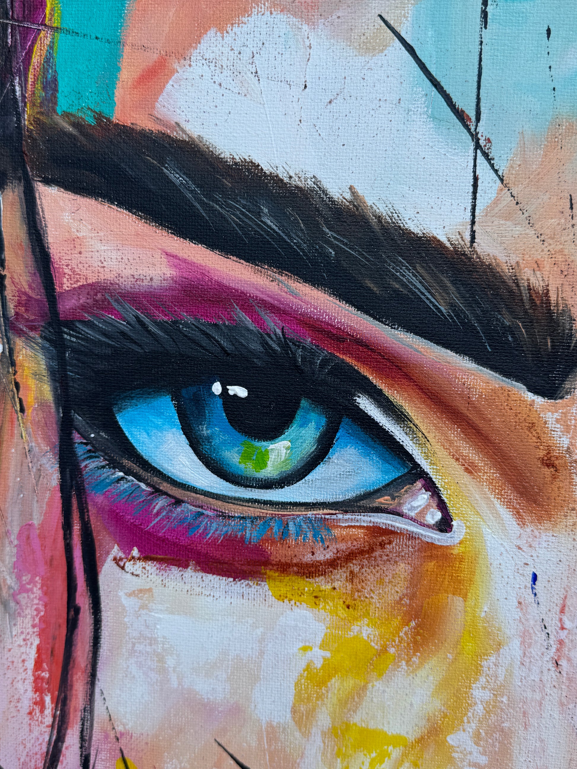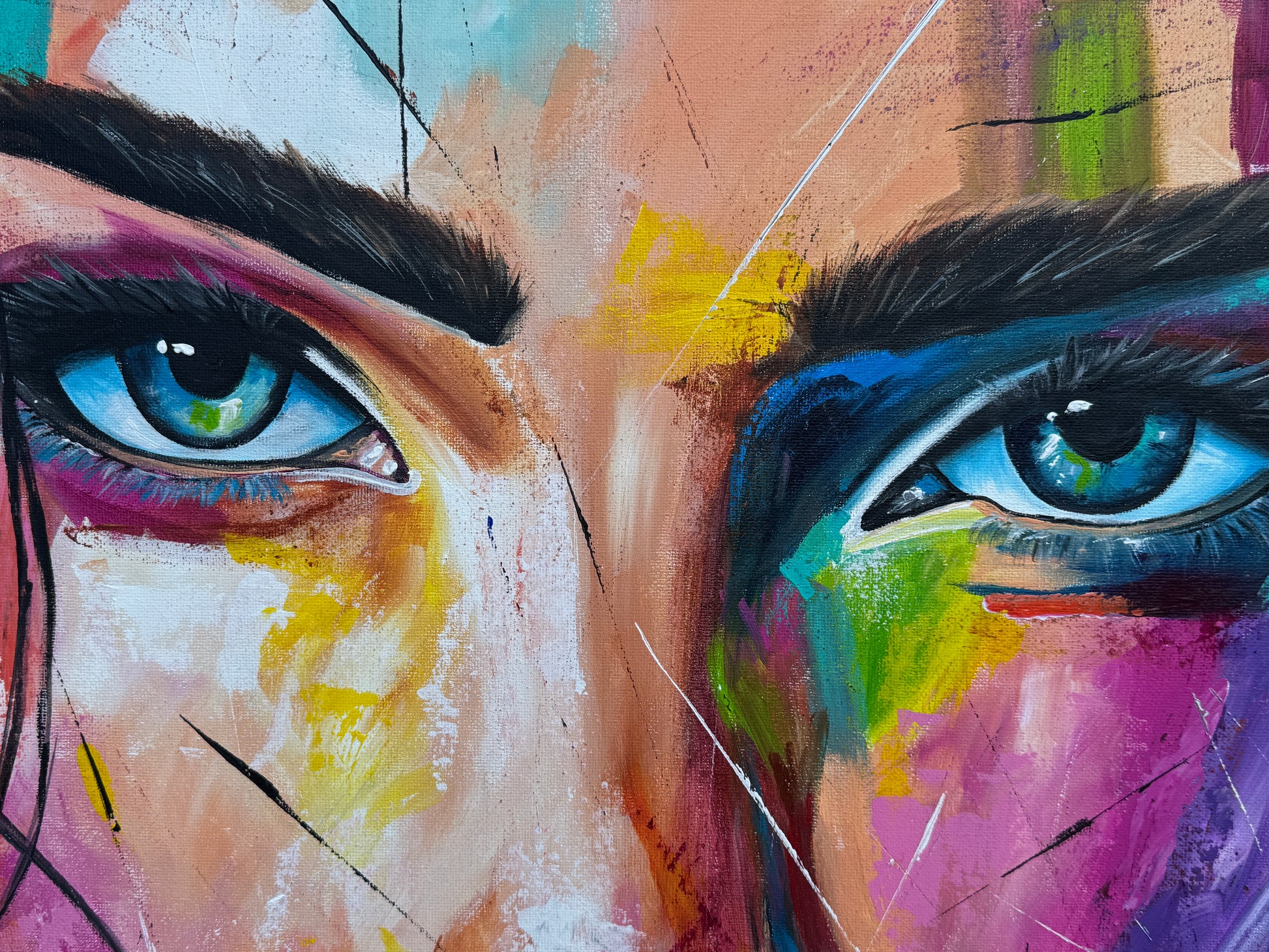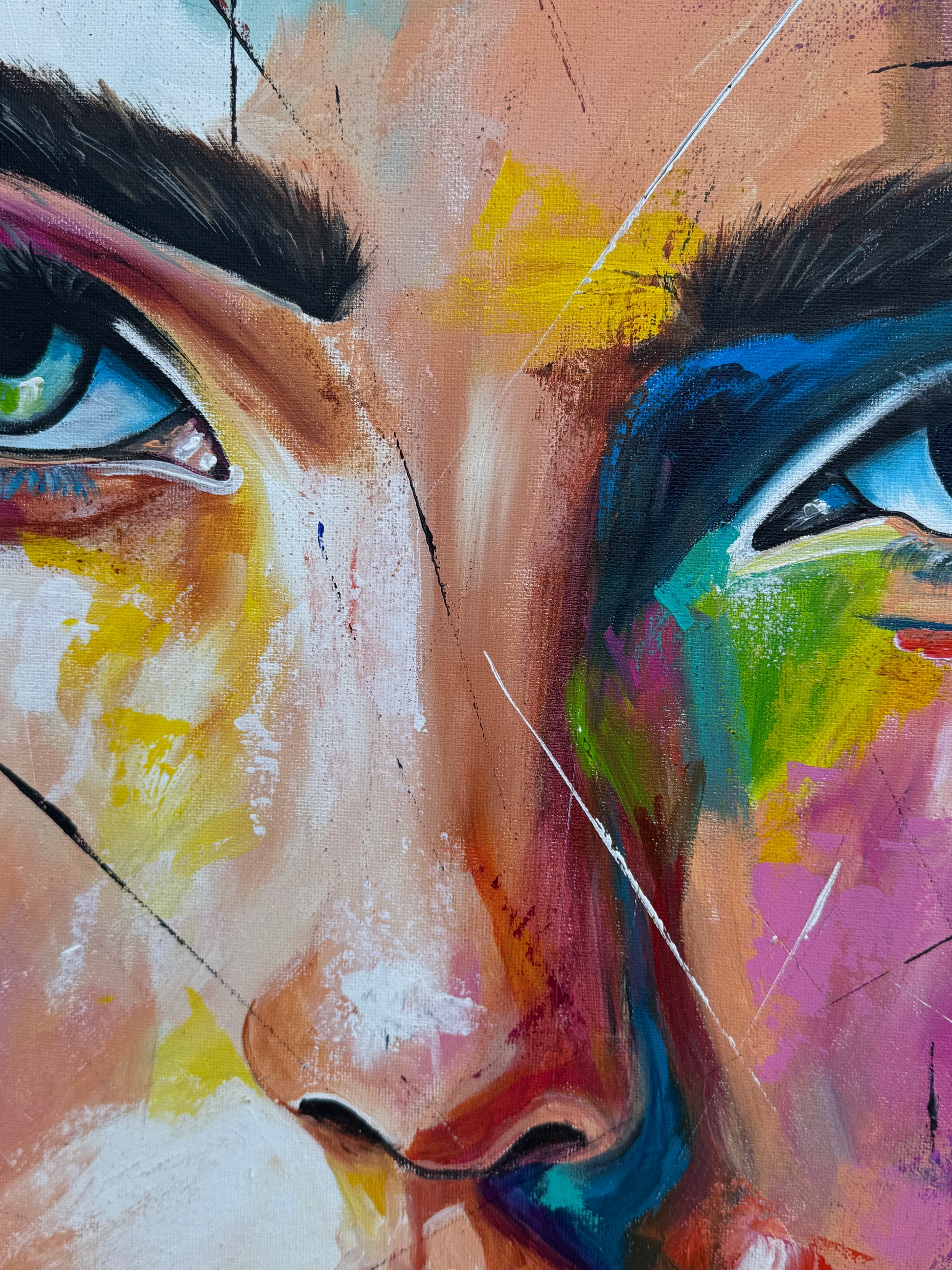 Die beeindruckenden Augen, unerschrocken und fesselnd, sind das Herzstück des Werks und verkörpern Mut und die Fähigkeit, Herausforderungen direkt zu begegnen. Denn jeder Mensch hat seine eigenen Kämpfe zu führen. Sei es mit sich selbst oder mit anderen. Die Meisten sind bereit für die, die sie lieben, alles zu tun. Dabei riskieren sie nicht immer wenig. Doch auch für sich selbst lohnt es sich zu kämpfen. Für seine Träume, für seinen Weg, seine Ziele. Um so zu sein, wie man ist. Um so zu bleiben, wie man ist. Um so zu werden, wie man es möchte. Um das Leben lebenswert zu machen. Doch egal für wen oder was wir bereit sind zu kämpfen, wofür wir stark sein wollen, in dem Moment sind wird Krieger.