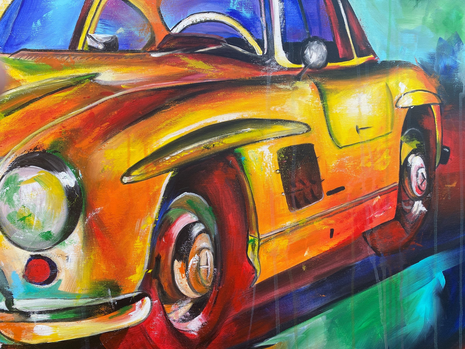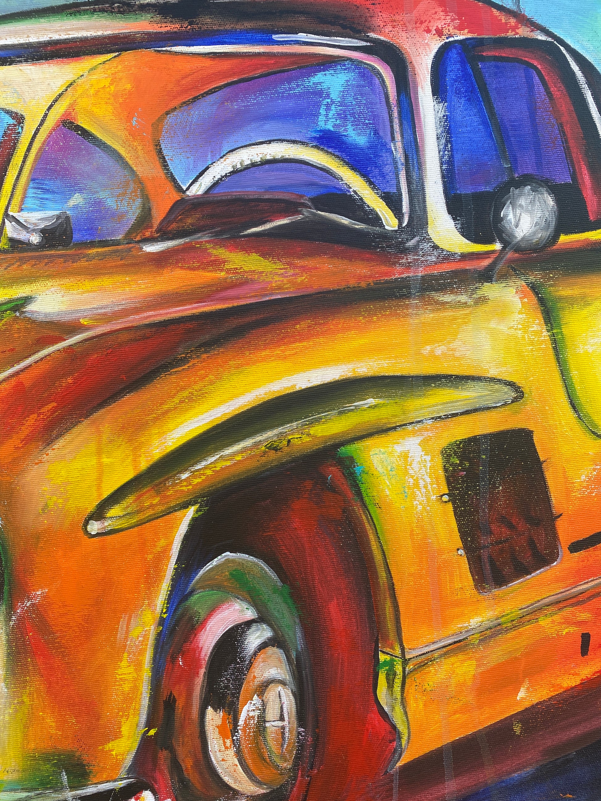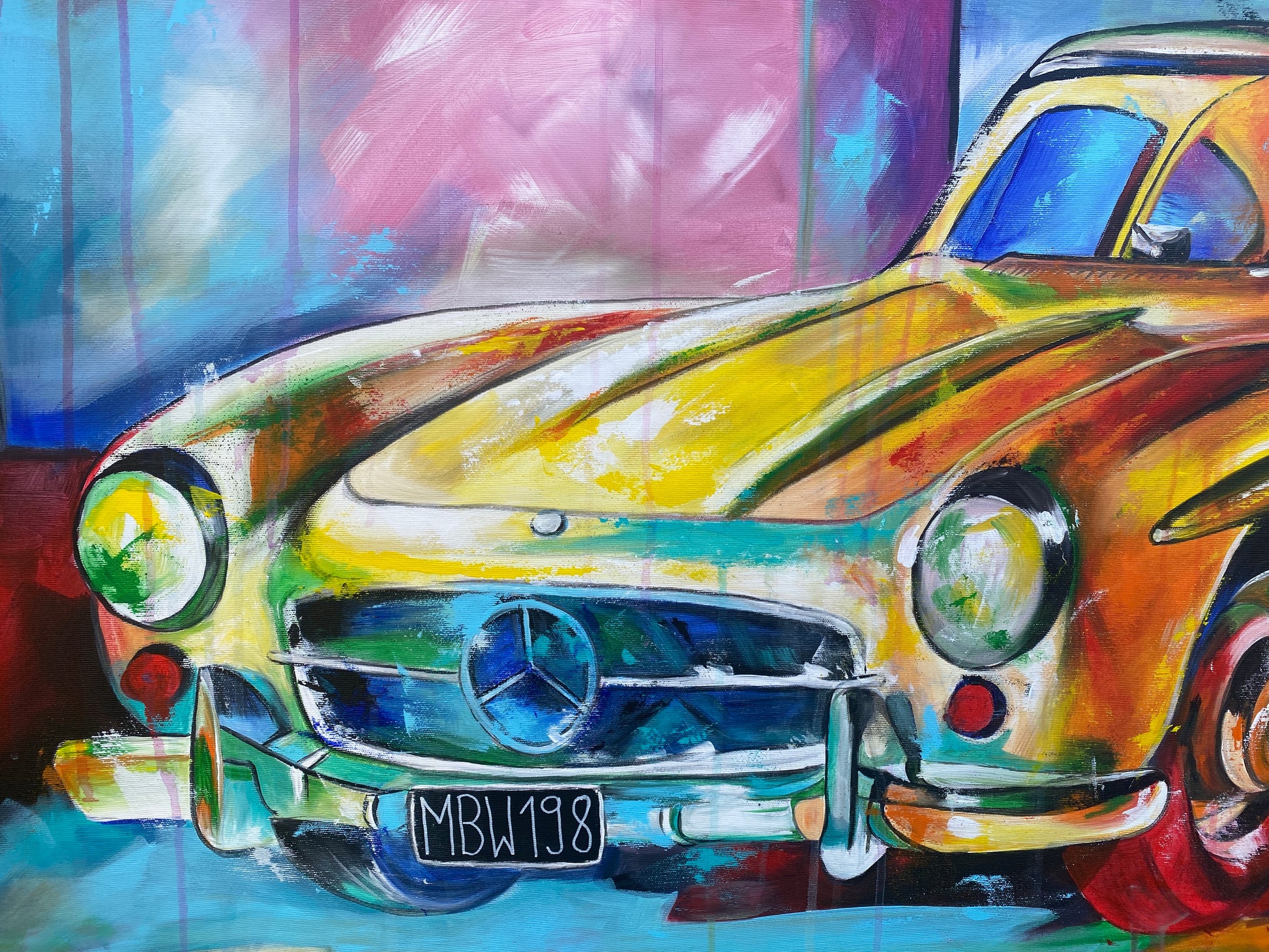 Mit diesem Werk habe ich die Energie und Eleganz des Wagens eingefangen, indem ich lebendige Farben und kraftvolle Pinselstriche kombiniere. Die Mischung aus Expressionismus, Pop Art und Realismus bringt den Klassiker in ein neues Licht und lässt ihn fast lebendig wirken. Dieses Bild bringt Schwung, Nostalgie und Lebensfreude in jeden Raum – ein leidenschaftliches Zusammenspiel von Bewegung und Stil.