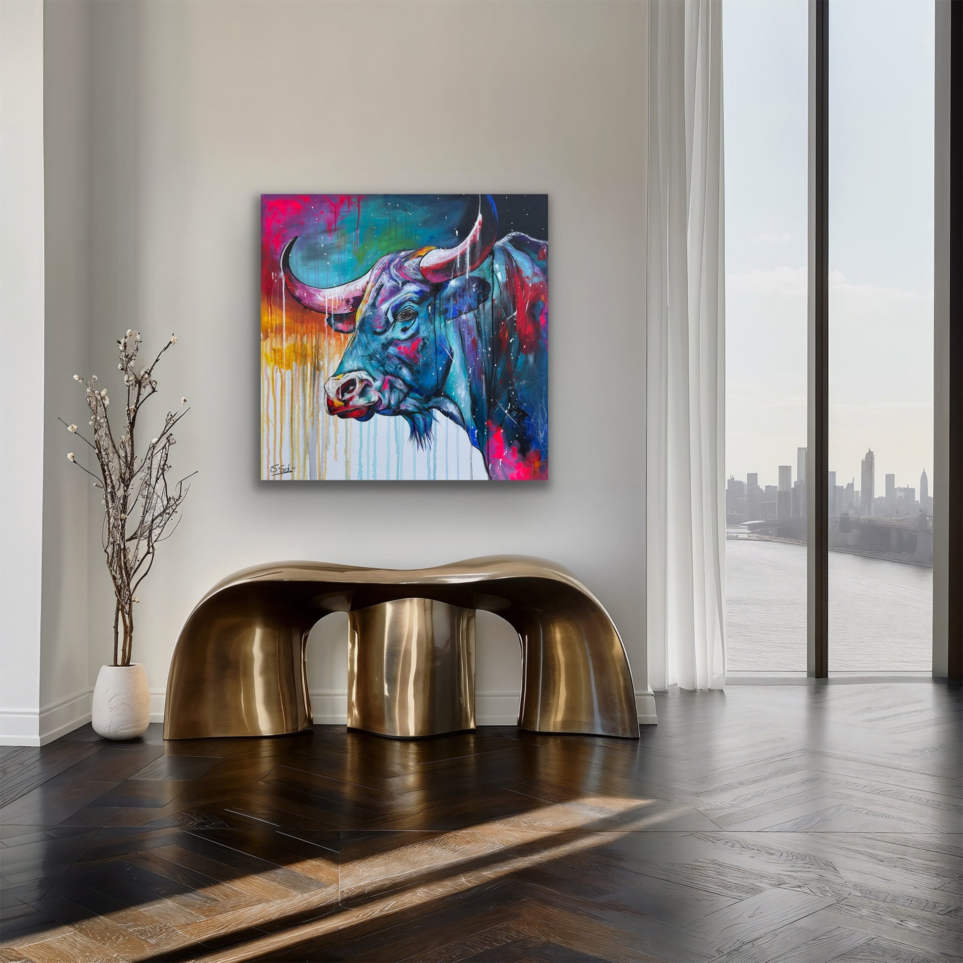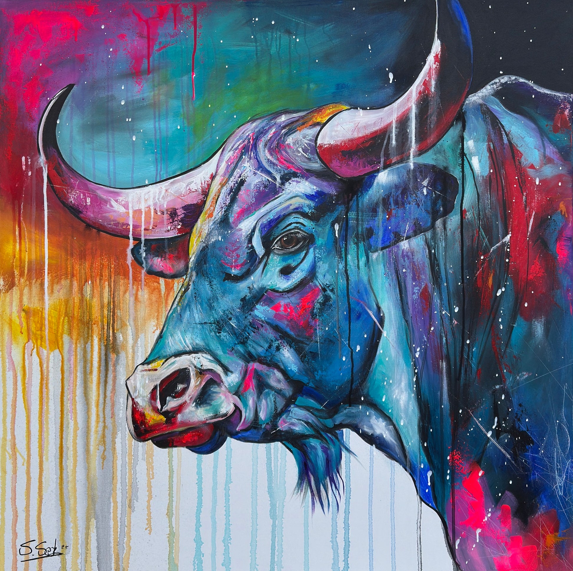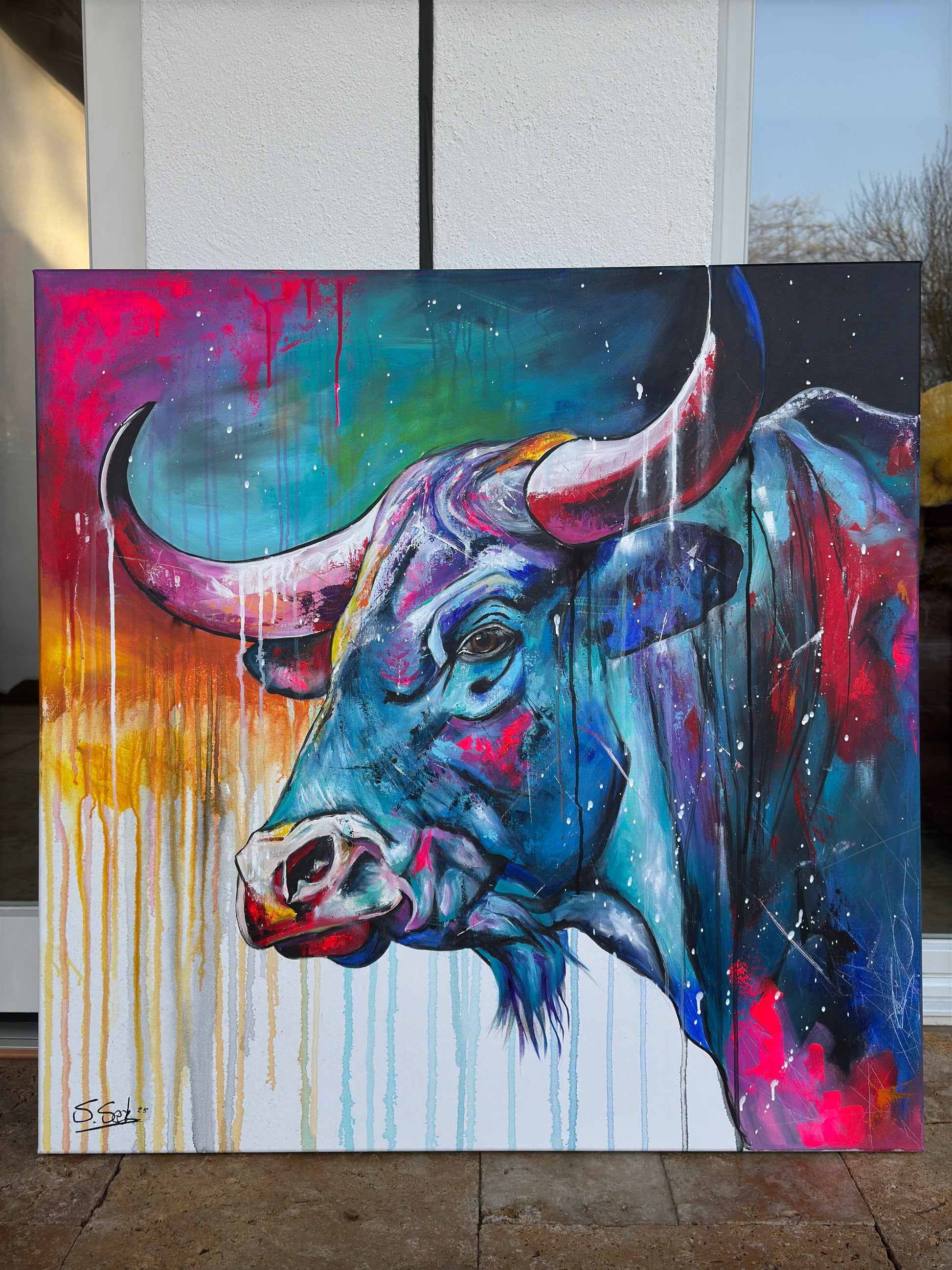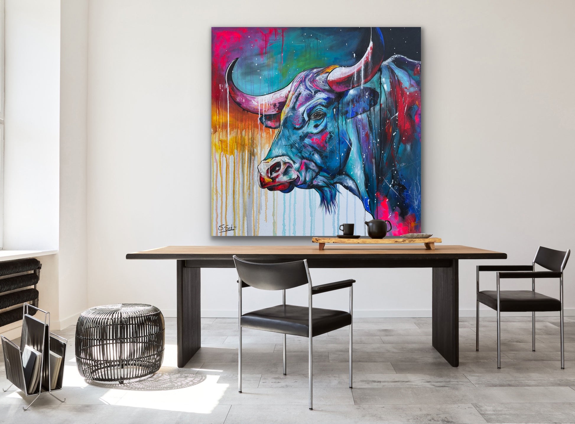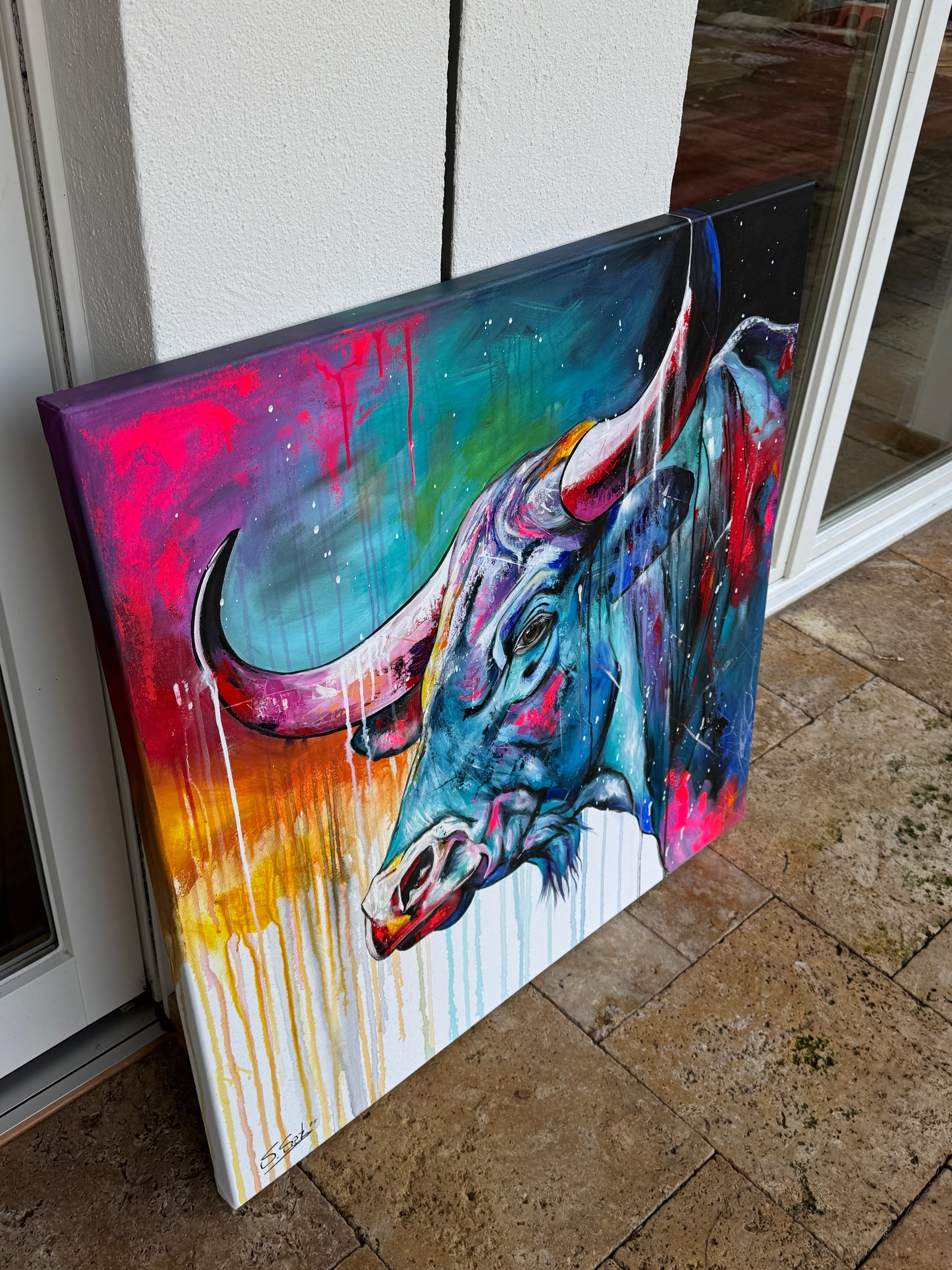 Milagro bedeutet "Wunder". Stiere sind imposante, kräftige und starke Tiere, gepaart mit innerer Ruhe und Freundlichkeit. Die Verwendung von kräftigen, leuchtenden Acrylfarben betont die rohe Energie und das unbändige Wesen des Tieres, spielerisch umgesetzt durch dynamische Farbspritzer und fließende Linien. Diese Komposition ist nicht einfach nur ein Bild; es ist ein Feuerwerk der Gefühle, das jede Umgebung mit Kraft und Farbe bereichert.