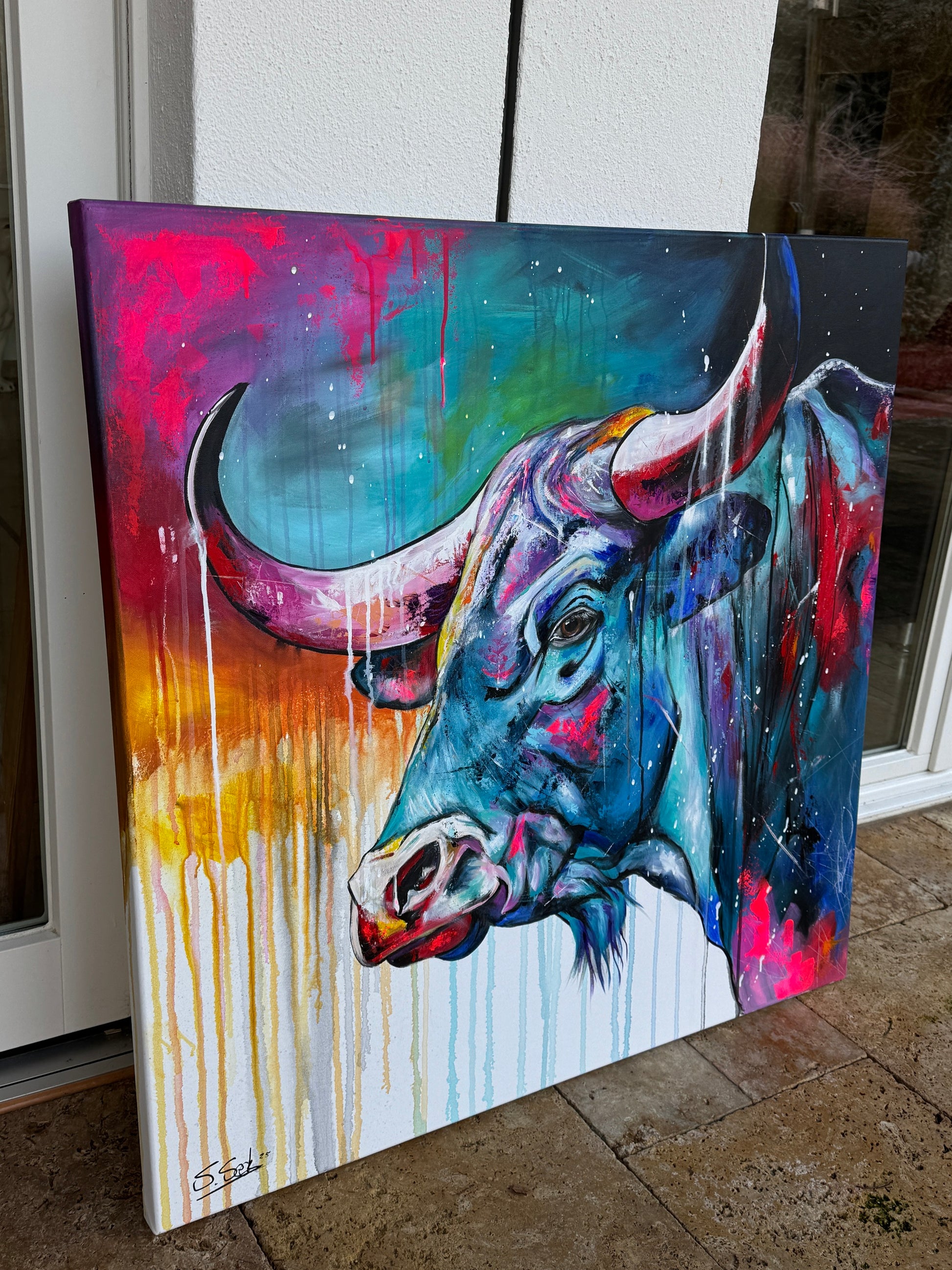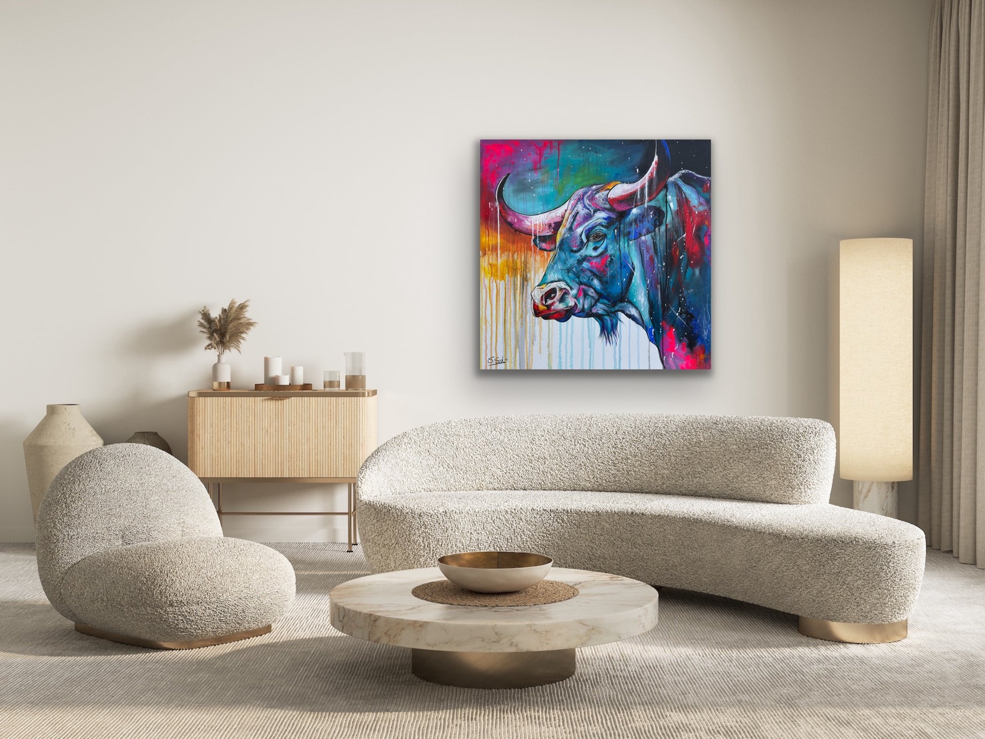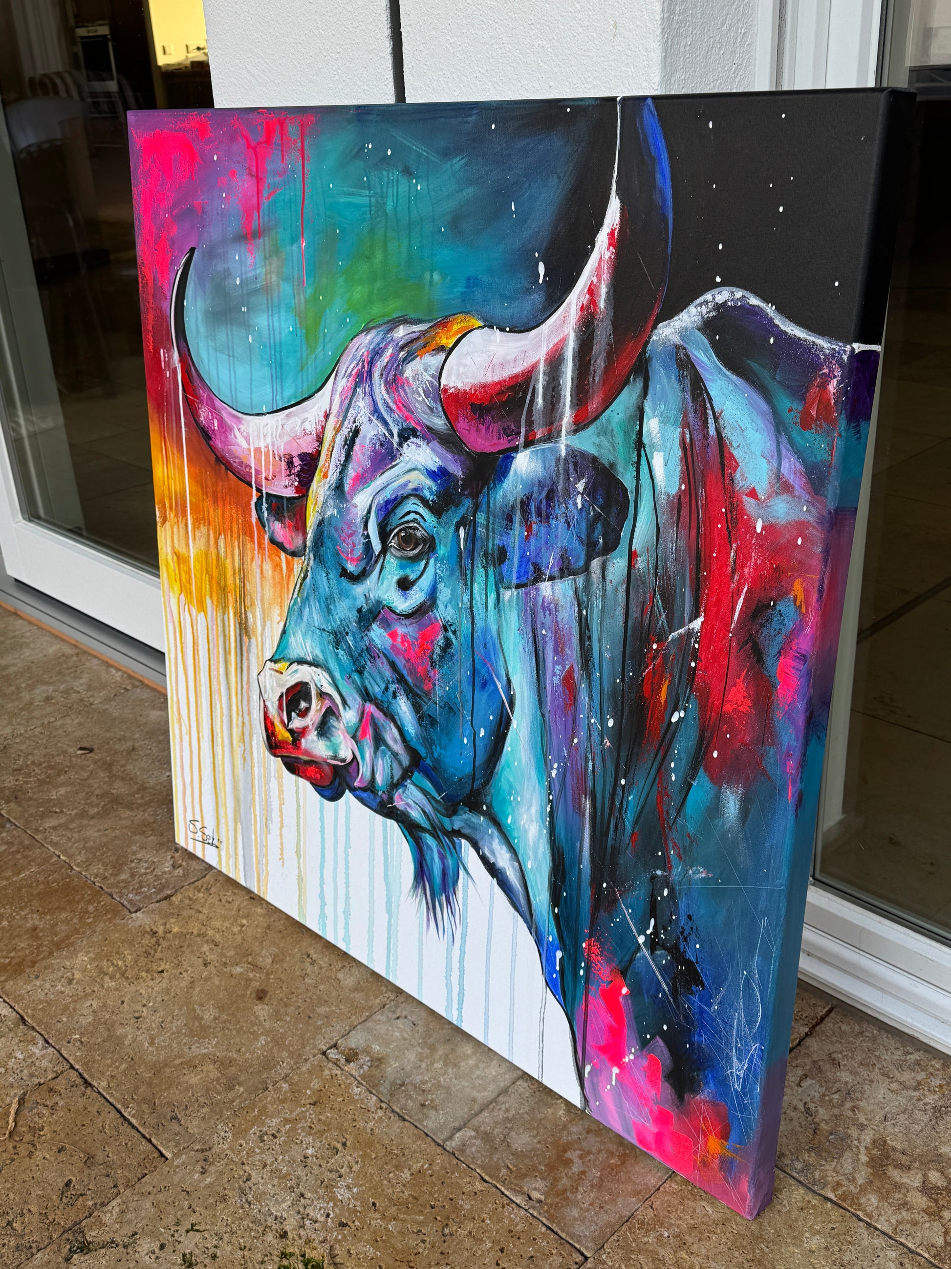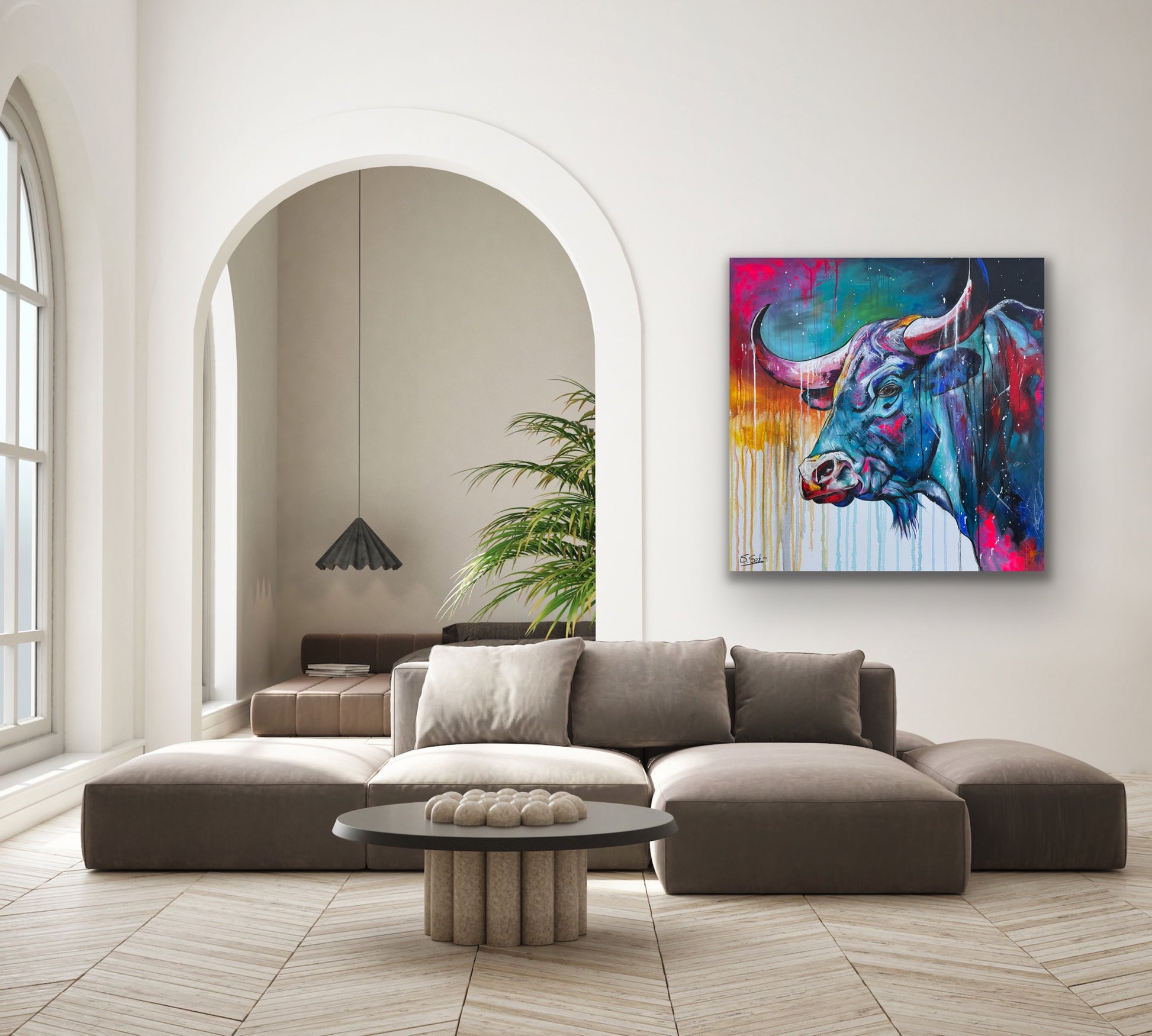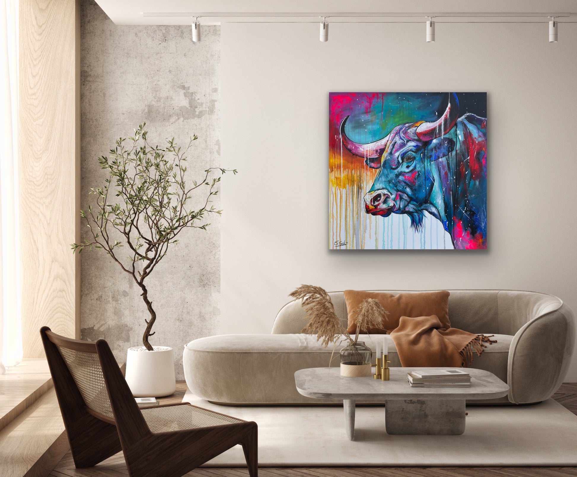 Milagro bedeutet "Wunder". Stiere sind imposante, kräftige und starke Tiere, gepaart mit innerer Ruhe und Freundlichkeit. Die Verwendung von kräftigen, leuchtenden Acrylfarben betont die rohe Energie und das unbändige Wesen des Tieres, spielerisch umgesetzt durch dynamische Farbspritzer und fließende Linien. Diese Komposition ist nicht einfach nur ein Bild; es ist ein Feuerwerk der Gefühle, das jede Umgebung mit Kraft und Farbe bereichert.