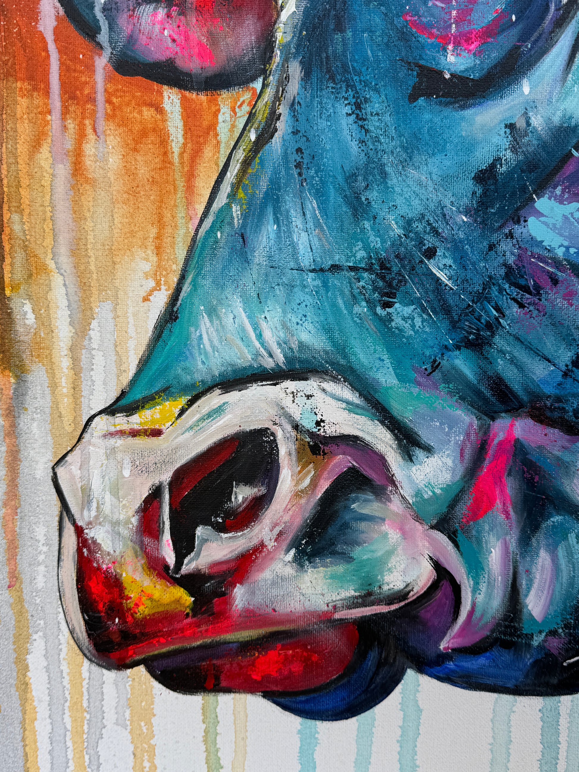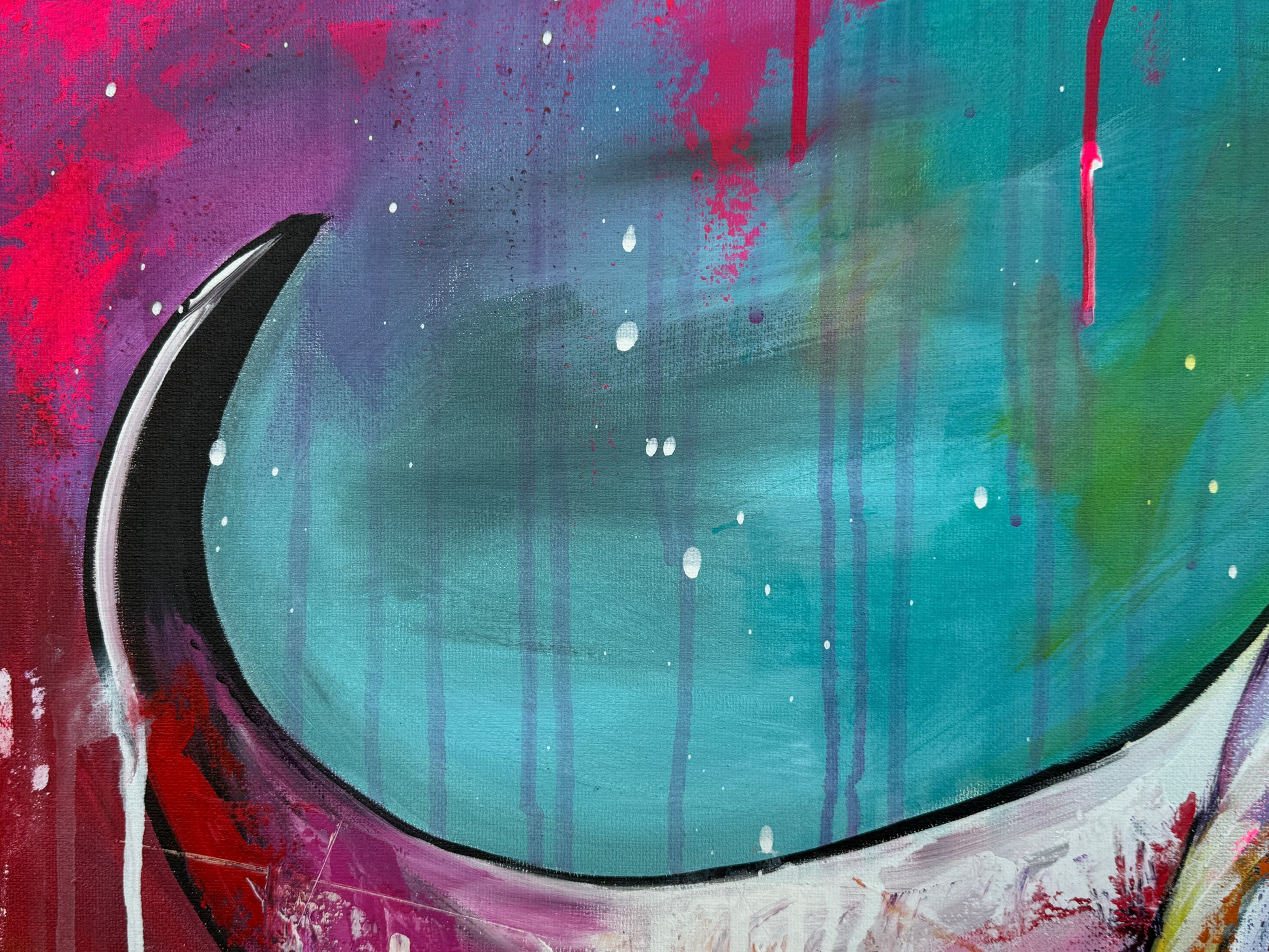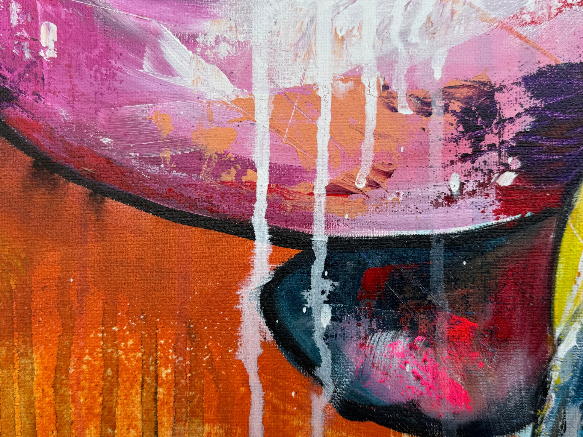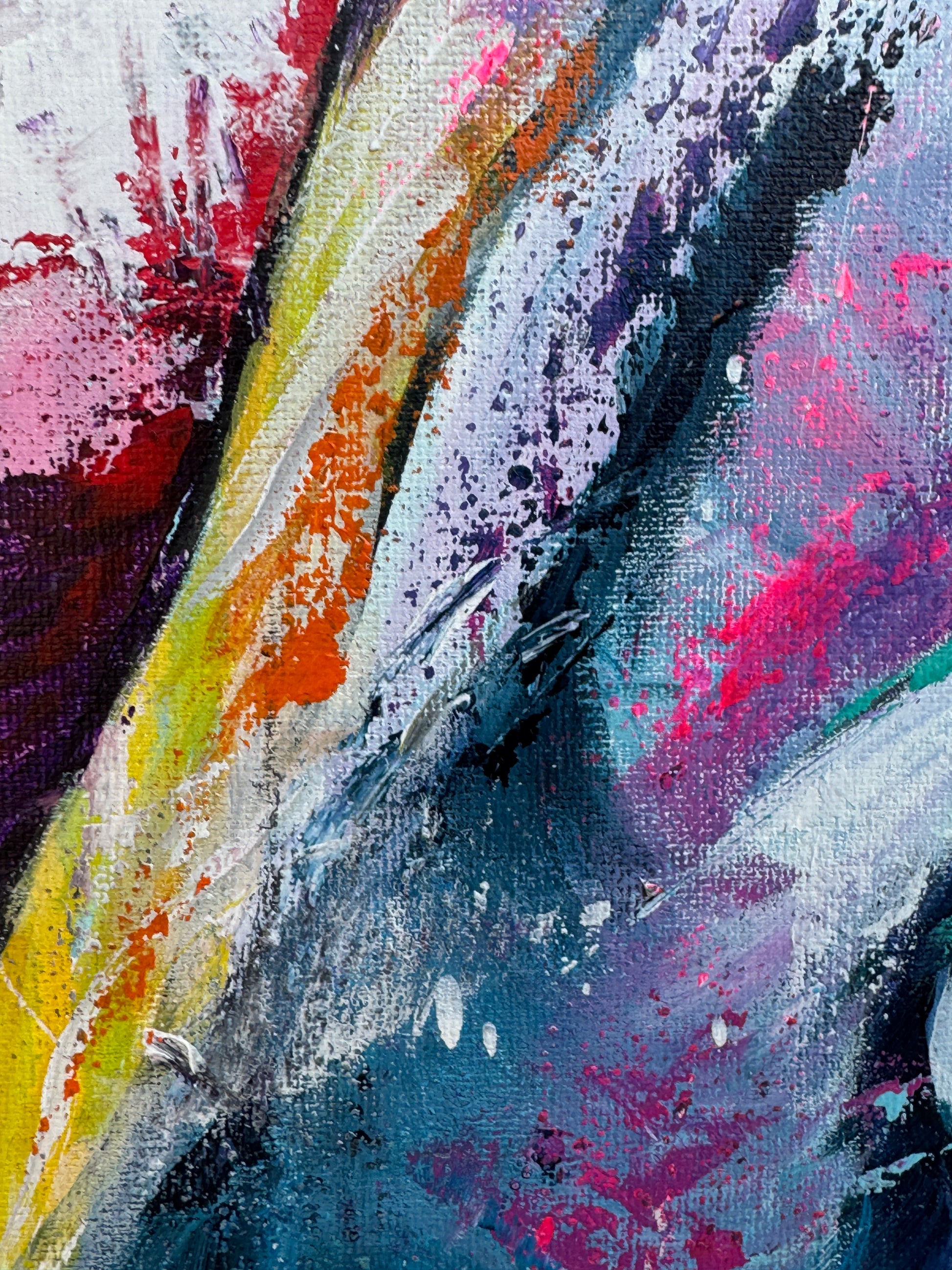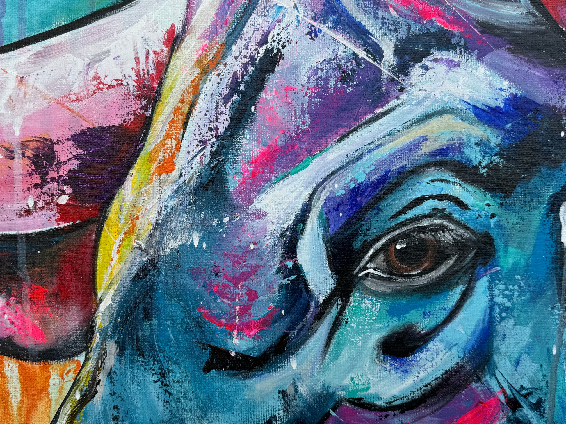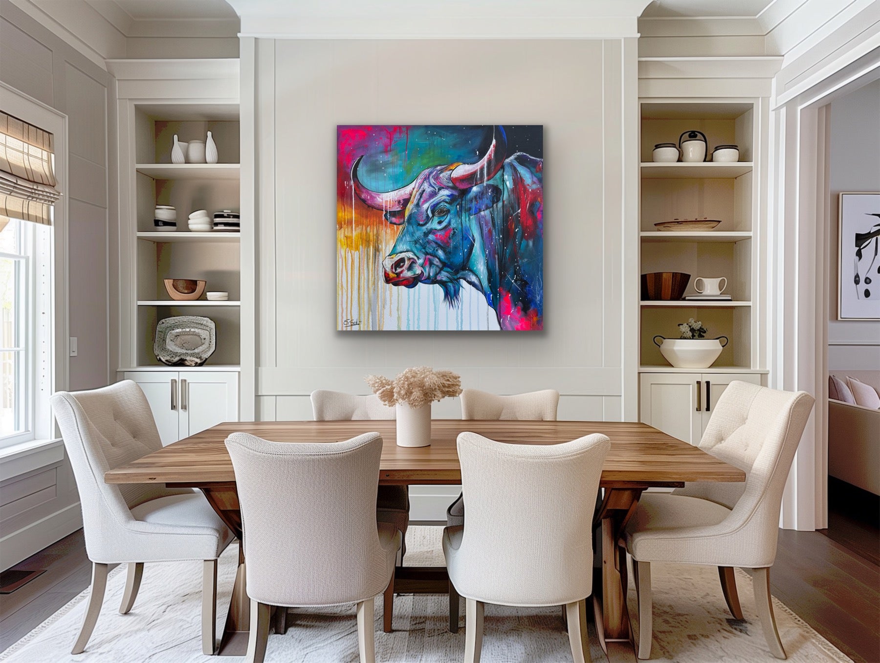 Milagro bedeutet "Wunder". Stiere sind imposante, kräftige und starke Tiere, gepaart mit innerer Ruhe und Freundlichkeit. Die Verwendung von kräftigen, leuchtenden Acrylfarben betont die rohe Energie und das unbändige Wesen des Tieres, spielerisch umgesetzt durch dynamische Farbspritzer und fließende Linien. Diese Komposition ist nicht einfach nur ein Bild; es ist ein Feuerwerk der Gefühle, das jede Umgebung mit Kraft und Farbe bereichert.