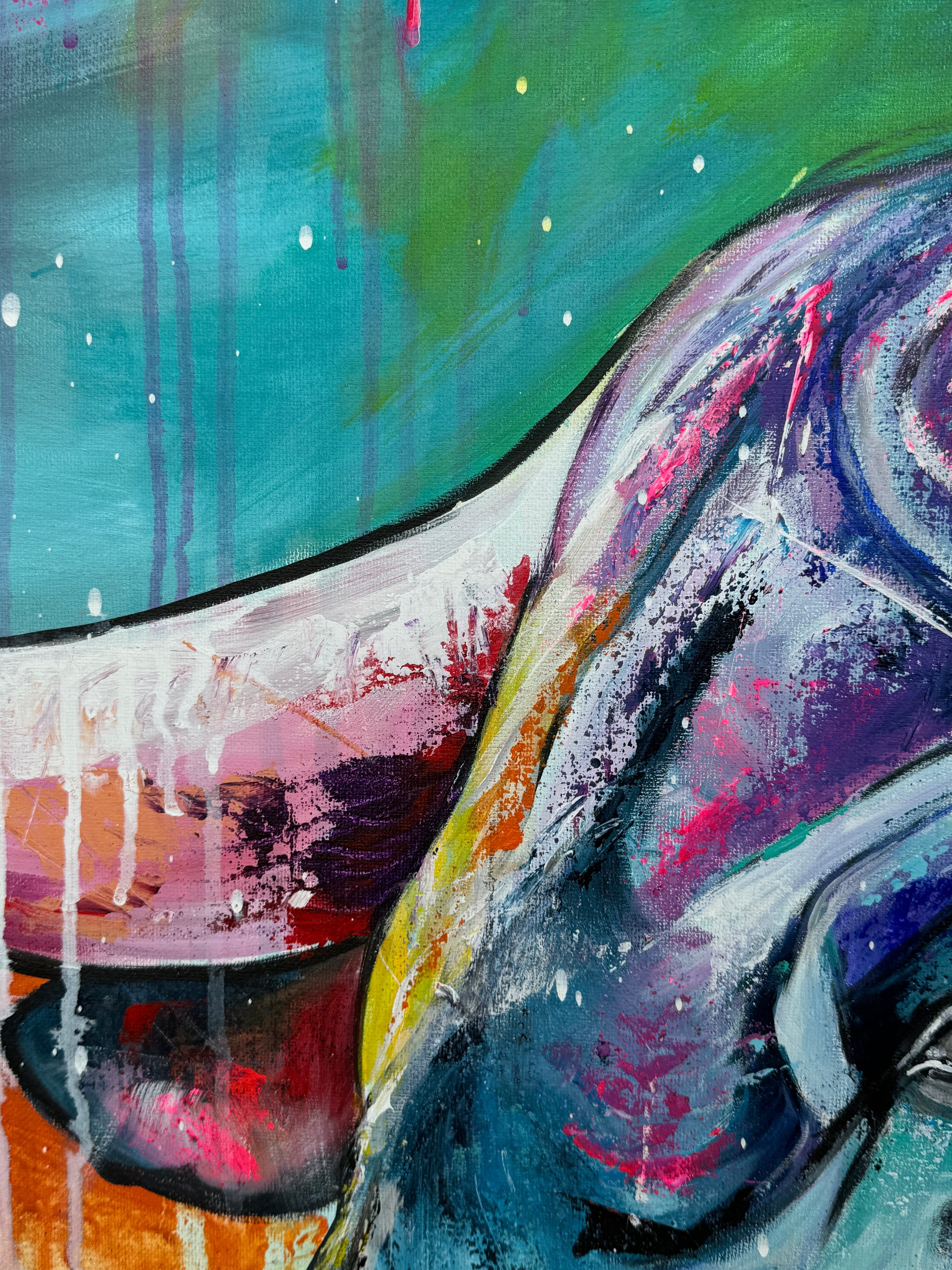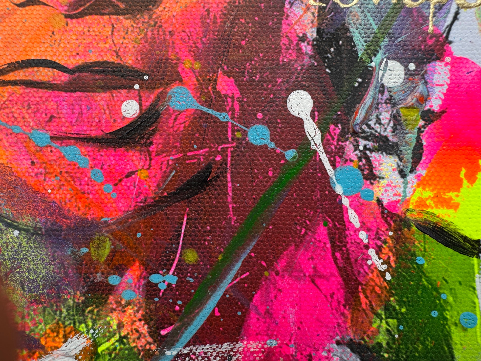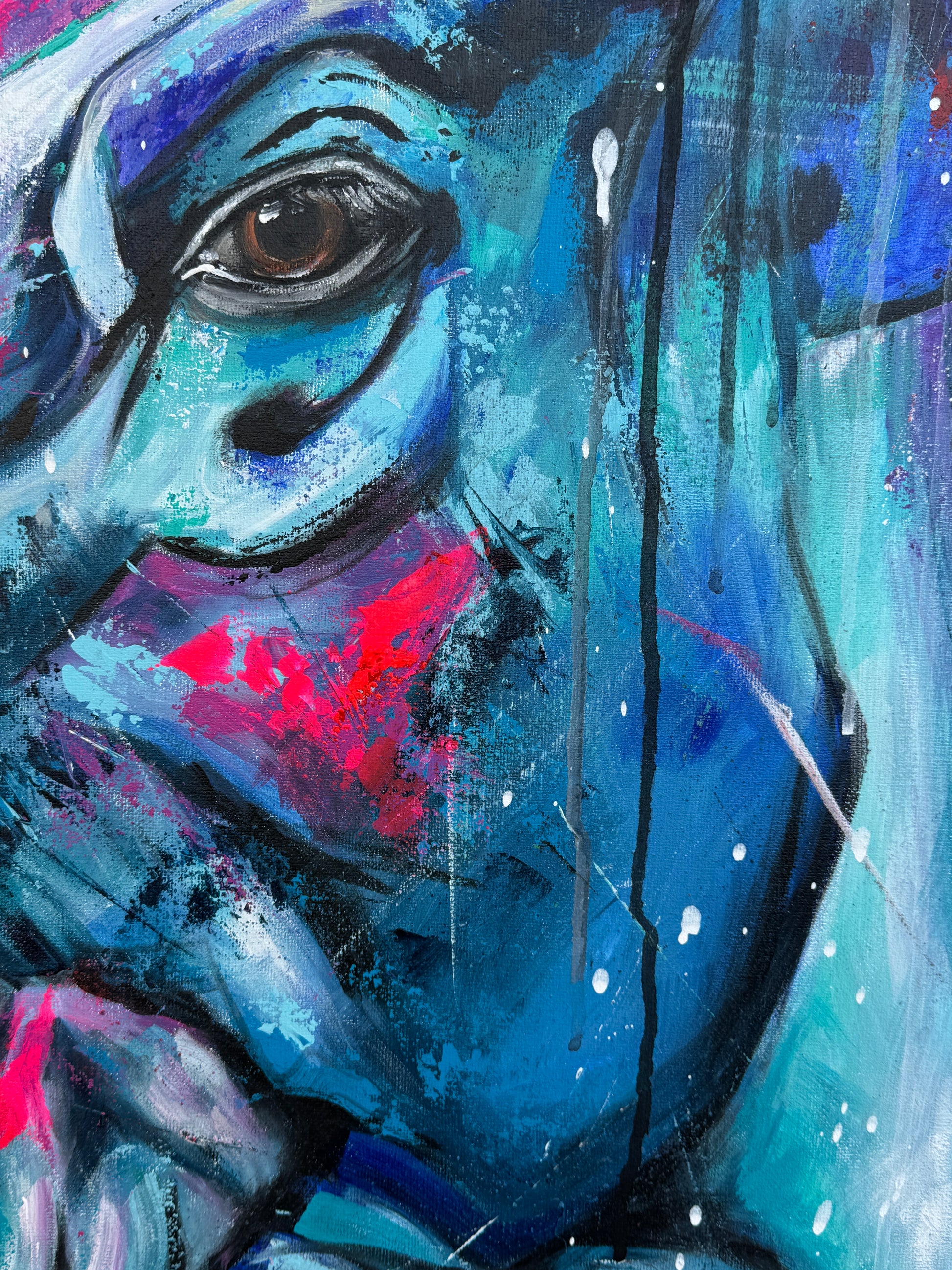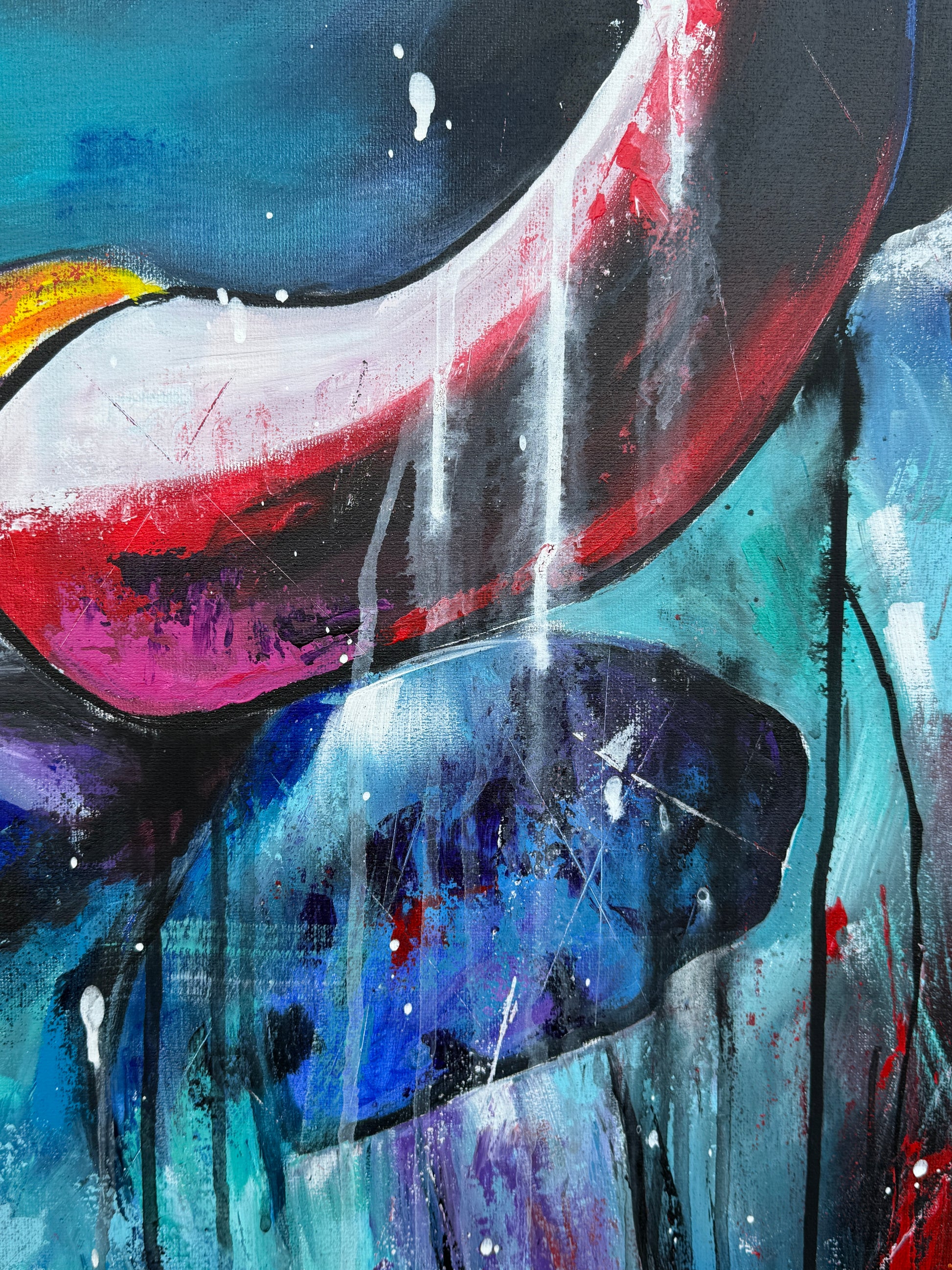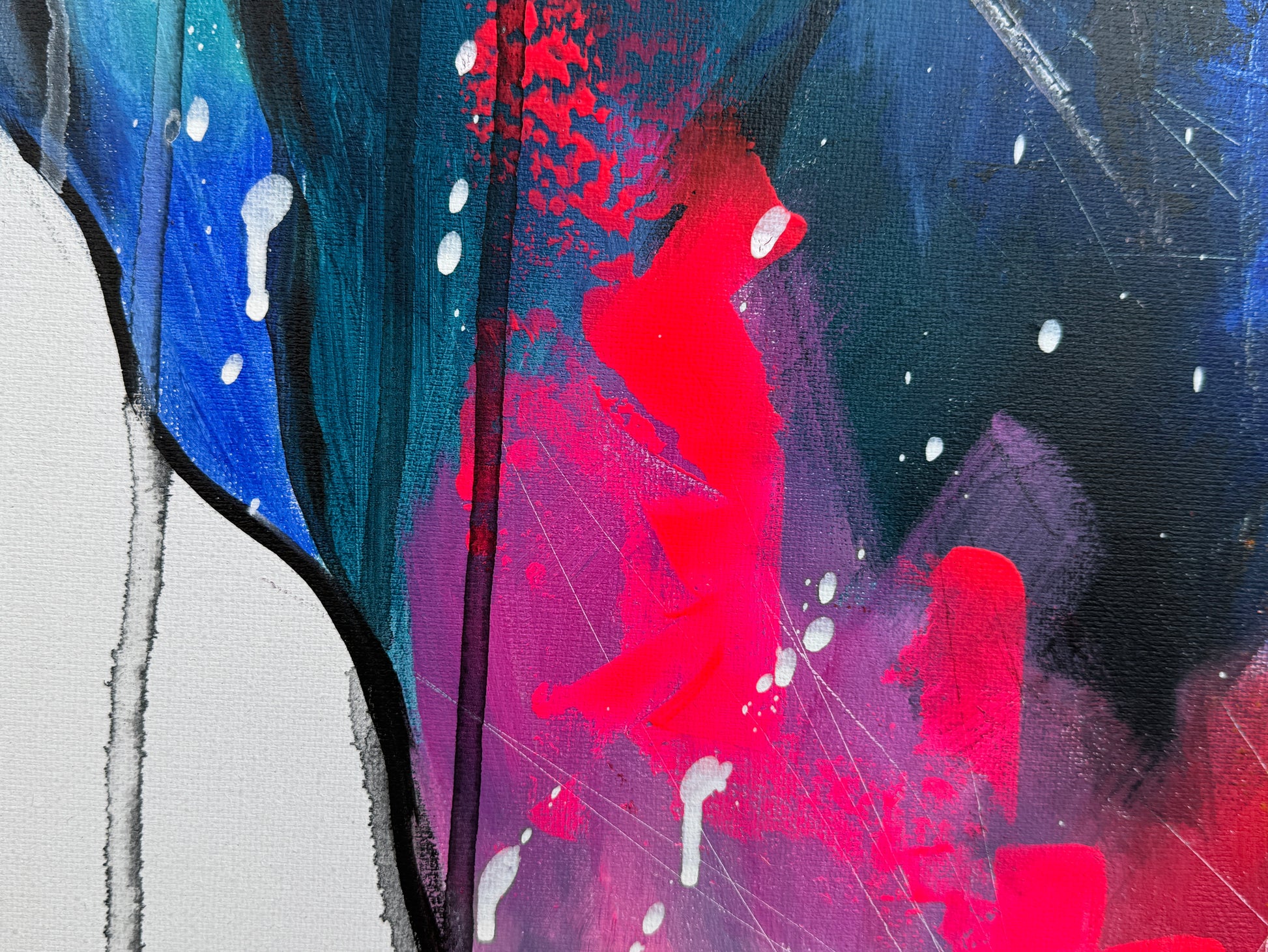 Milagro bedeutet "Wunder". Stiere sind imposante, kräftige und starke Tiere, gepaart mit innerer Ruhe und Freundlichkeit. Die Verwendung von kräftigen, leuchtenden Acrylfarben betont die rohe Energie und das unbändige Wesen des Tieres, spielerisch umgesetzt durch dynamische Farbspritzer und fließende Linien. Diese Komposition ist nicht einfach nur ein Bild; es ist ein Feuerwerk der Gefühle, das jede Umgebung mit Kraft und Farbe bereichert.