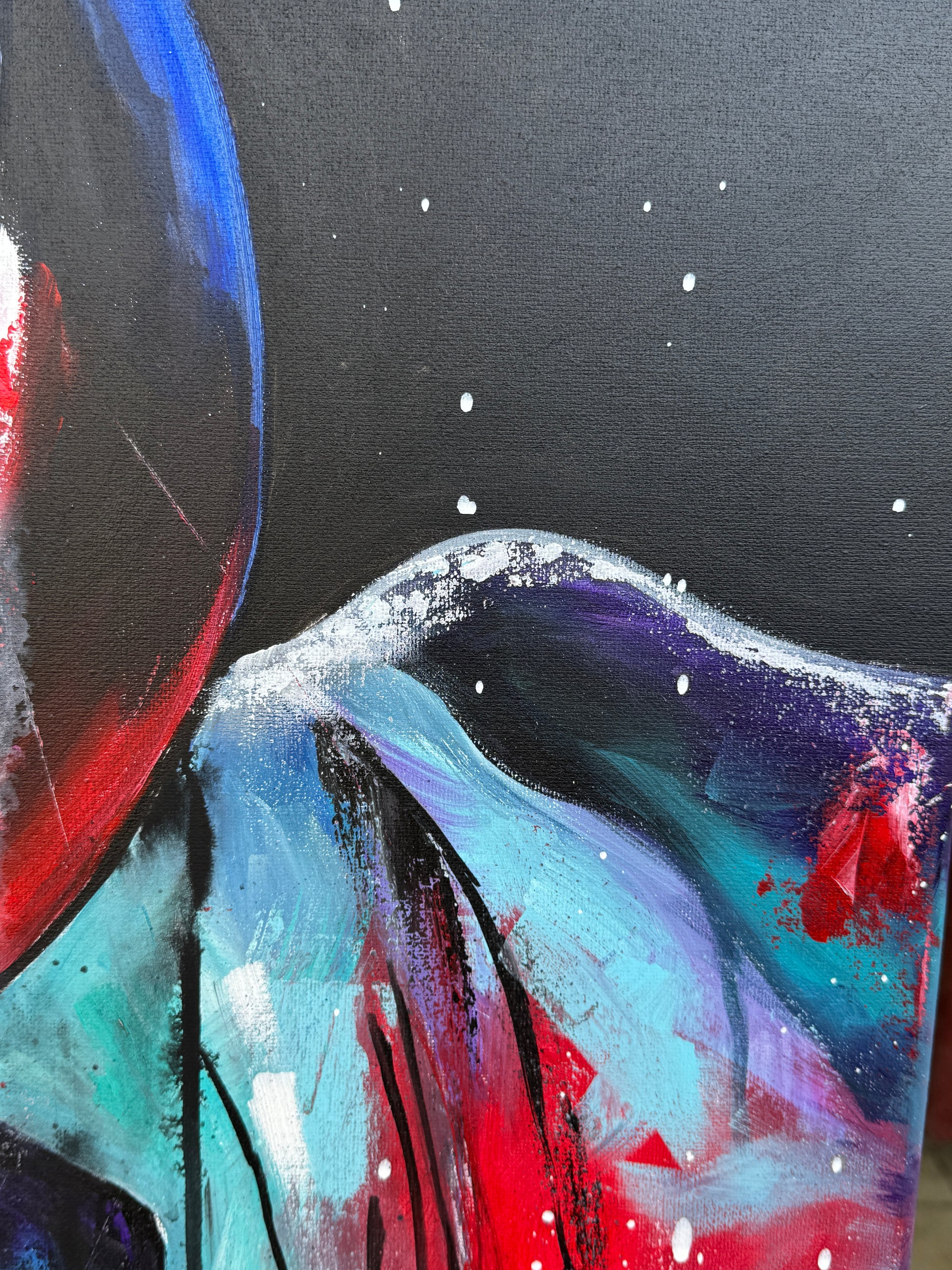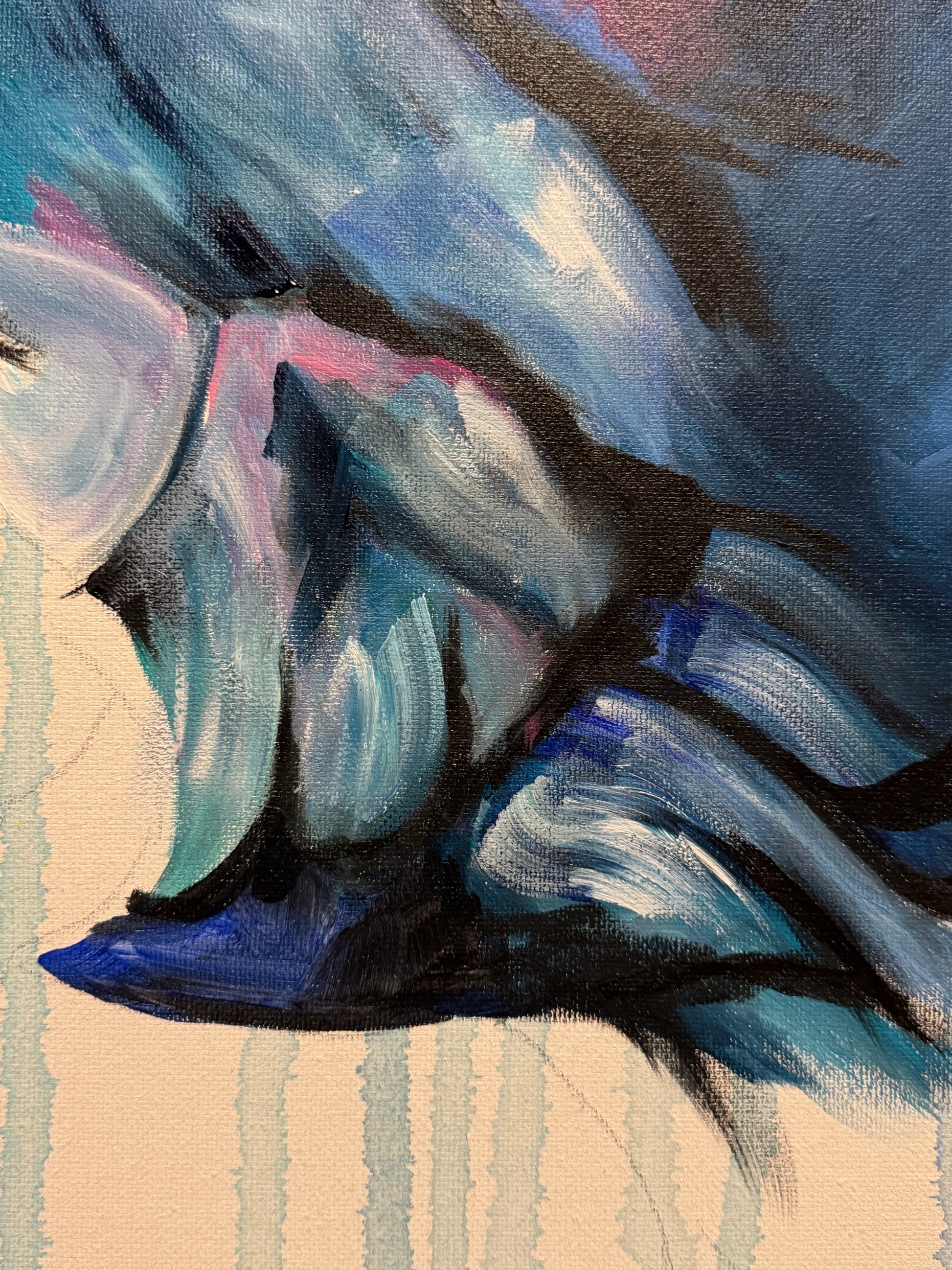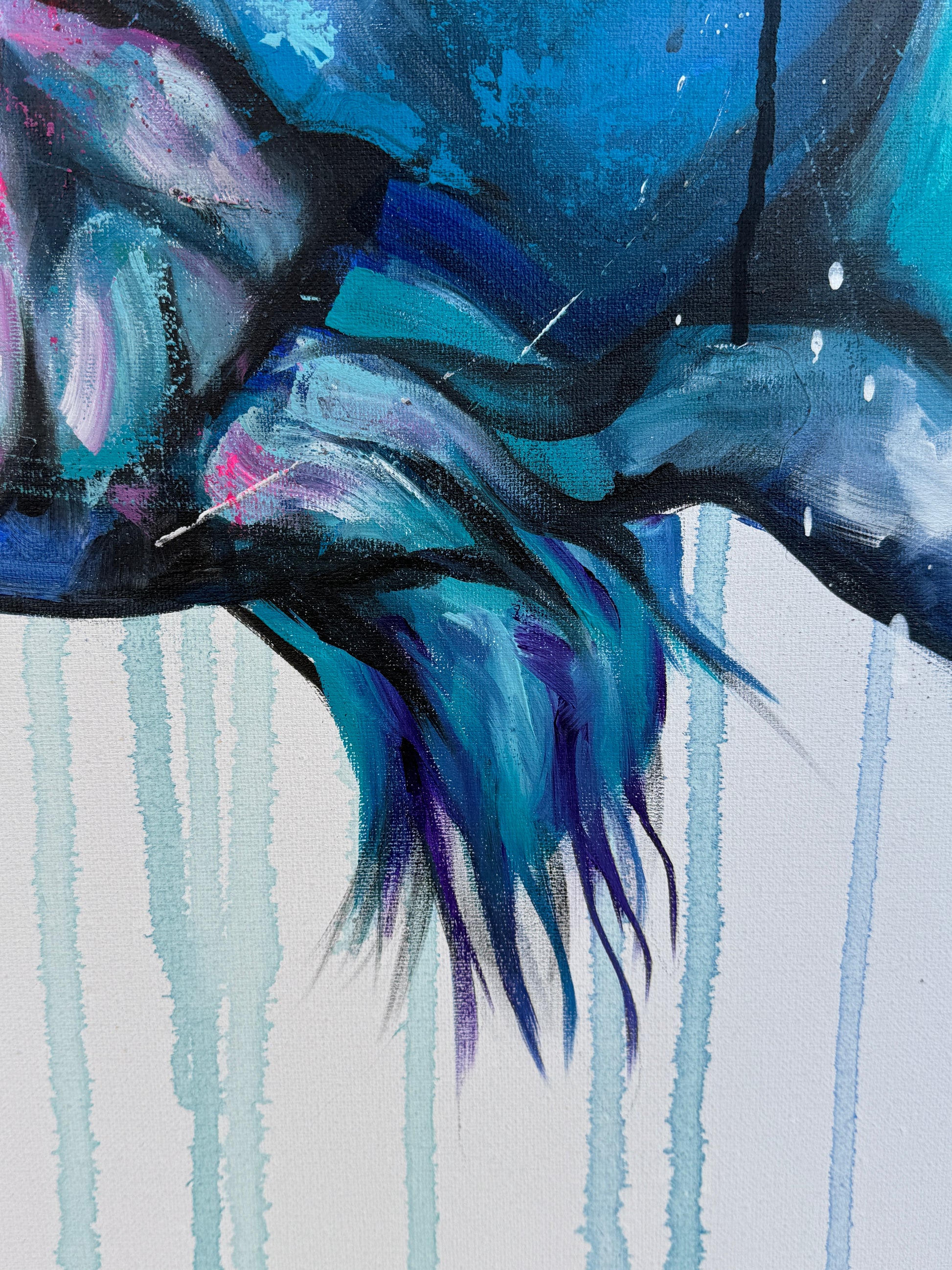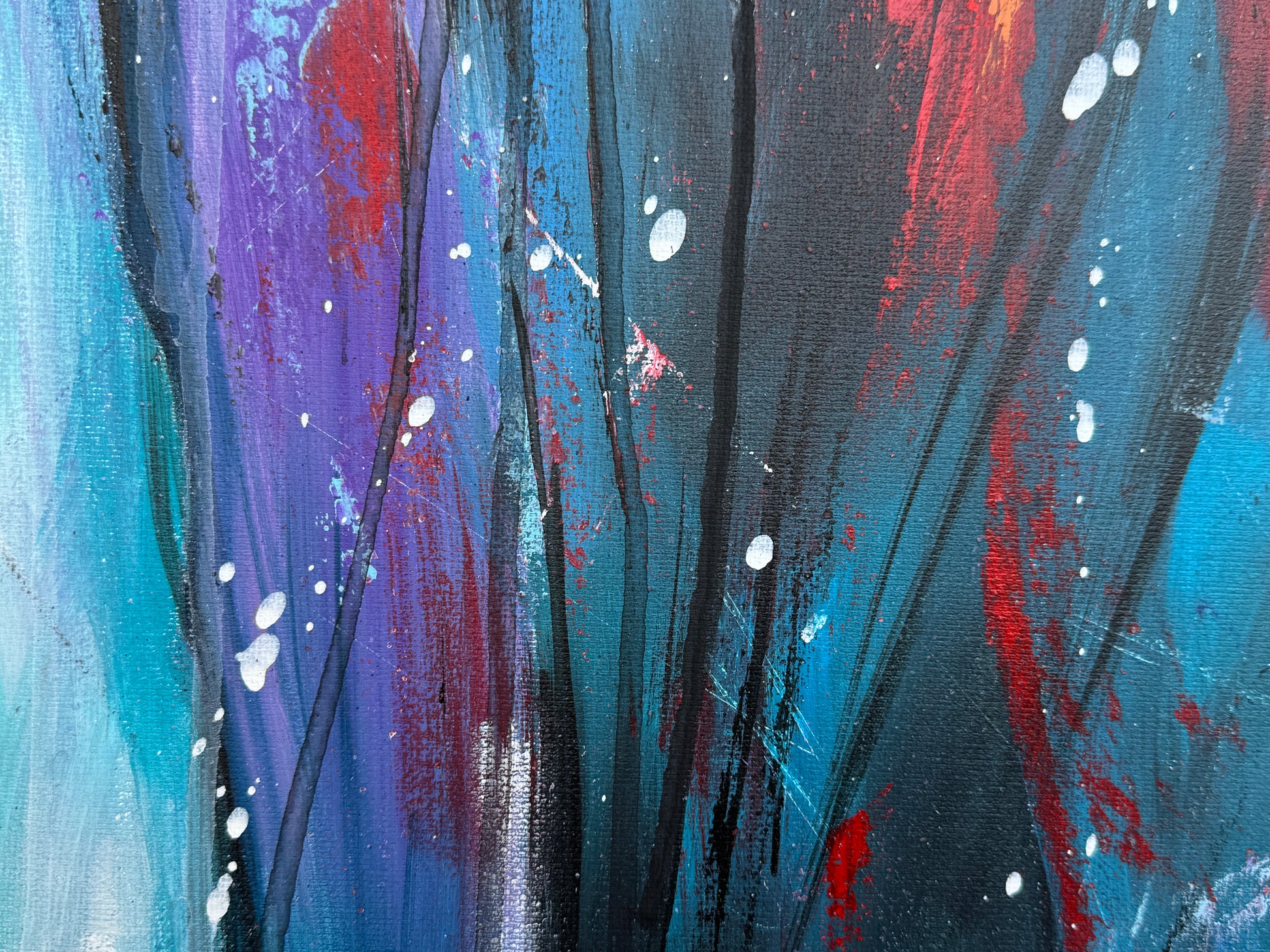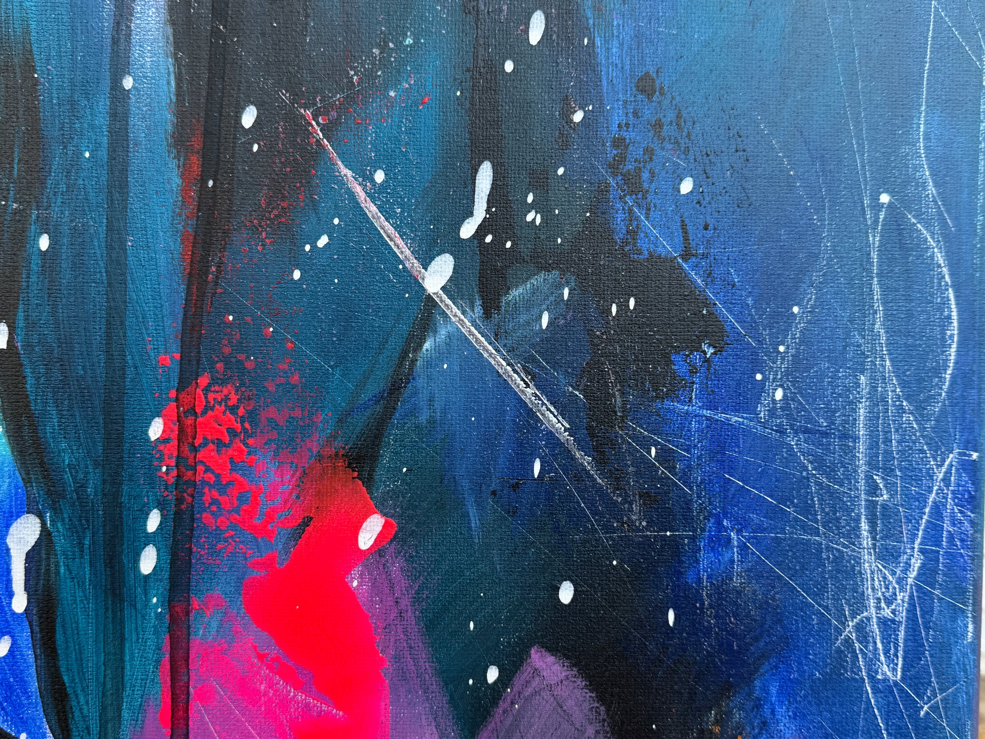 Milagro bedeutet "Wunder". Stiere sind imposante, kräftige und starke Tiere, gepaart mit innerer Ruhe und Freundlichkeit. Die Verwendung von kräftigen, leuchtenden Acrylfarben betont die rohe Energie und das unbändige Wesen des Tieres, spielerisch umgesetzt durch dynamische Farbspritzer und fließende Linien. Diese Komposition ist nicht einfach nur ein Bild; es ist ein Feuerwerk der Gefühle, das jede Umgebung mit Kraft und Farbe bereichert.