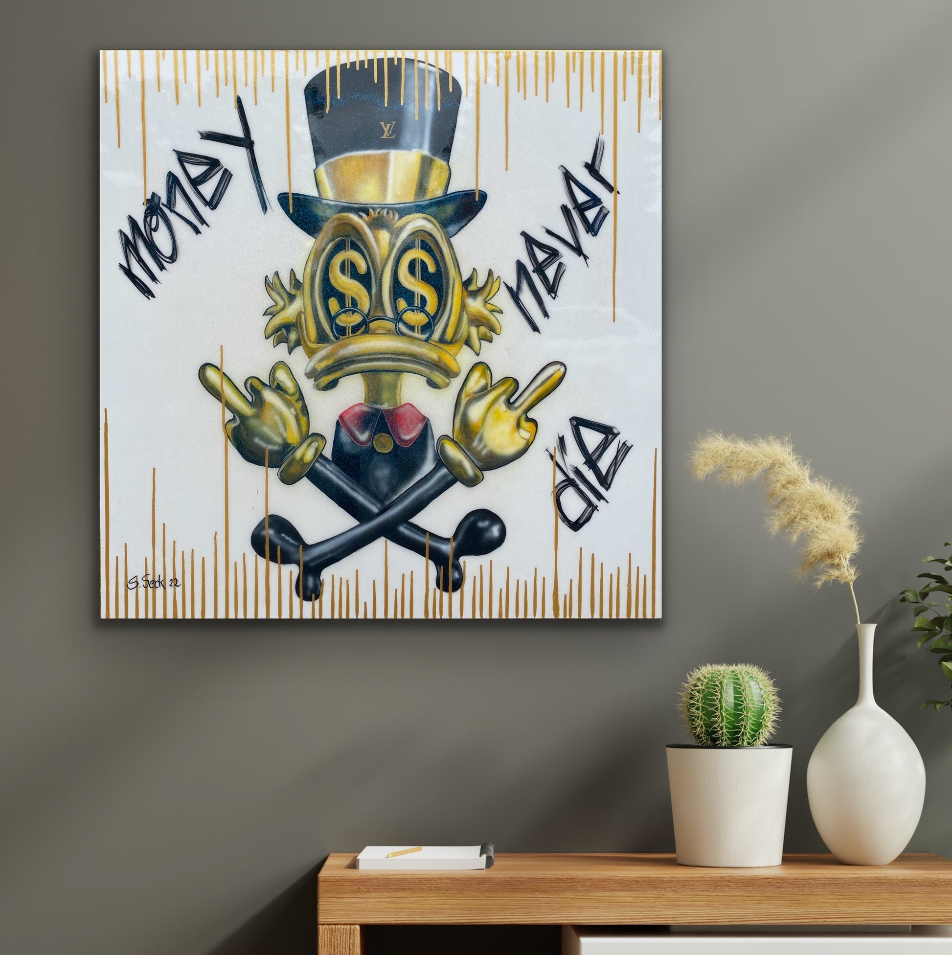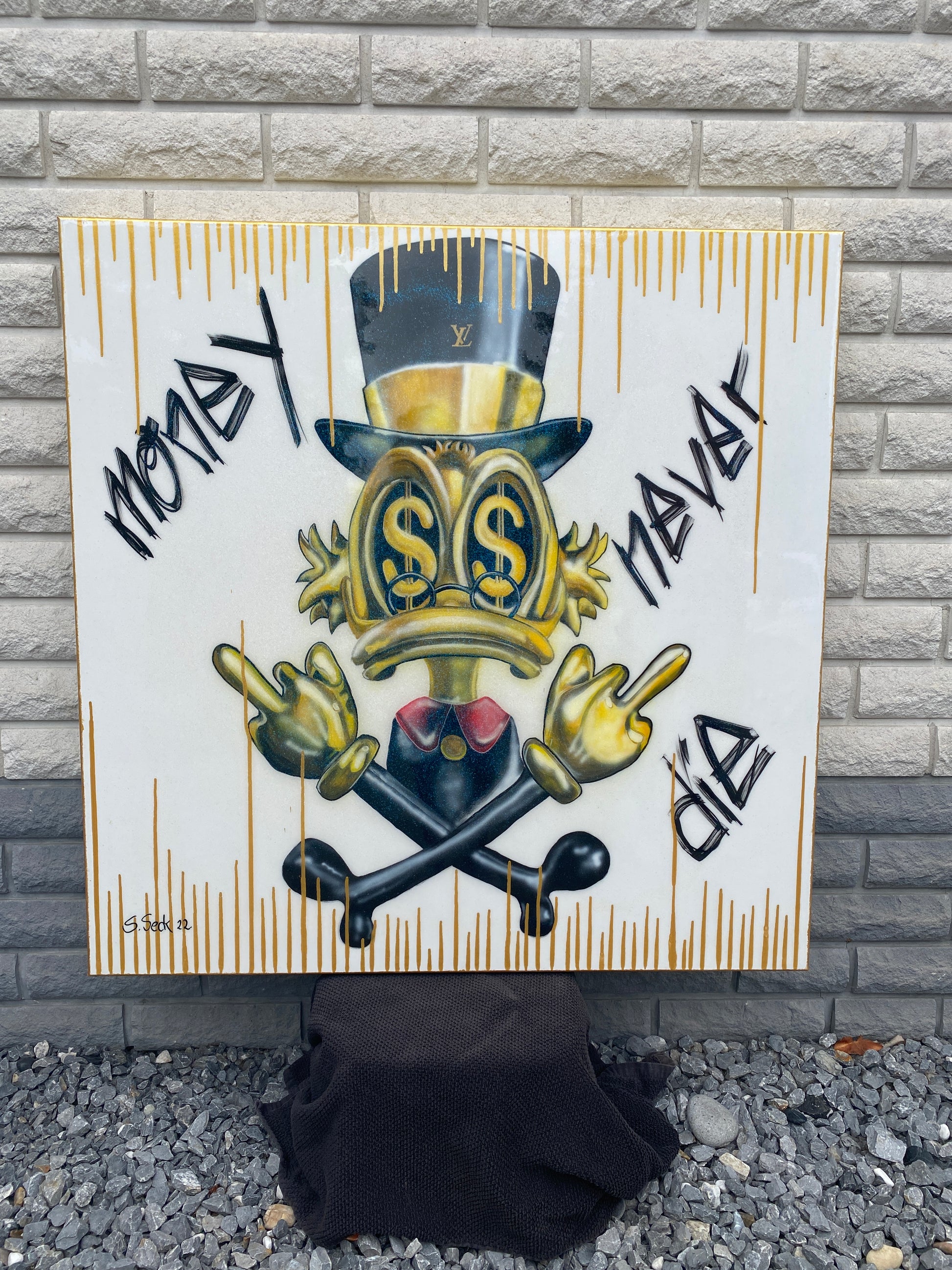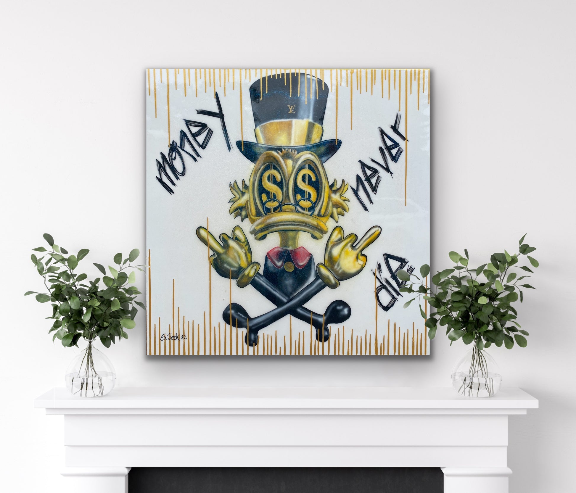 Das liebste der reichsten Ente aus Entenhausen war Geld. Er bewachte sein Vermögen mit allen Mitteln. Aber auch das letzte Hemd der beliebten Ente hat leider keine Taschen. Doch er wäre nicht die reichste Ente, wenn er nicht auch nach seinem Ableben die Dollarzeichen in den Augen hätte...:-)