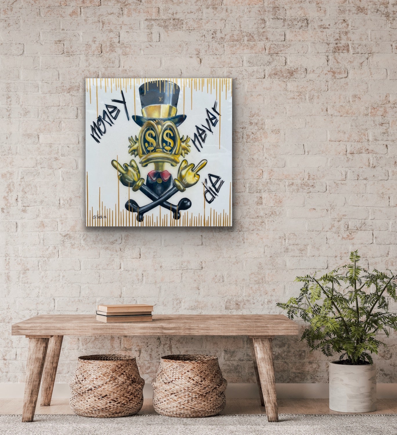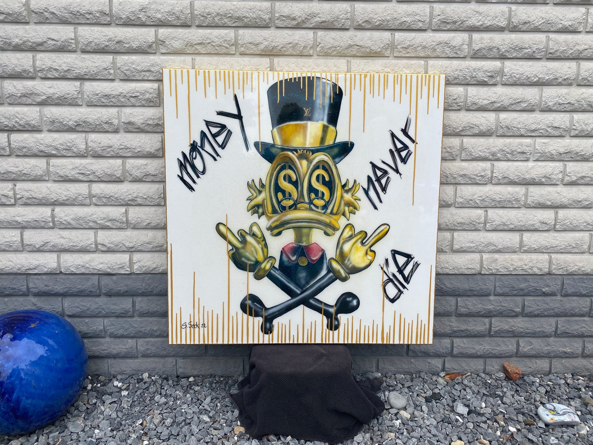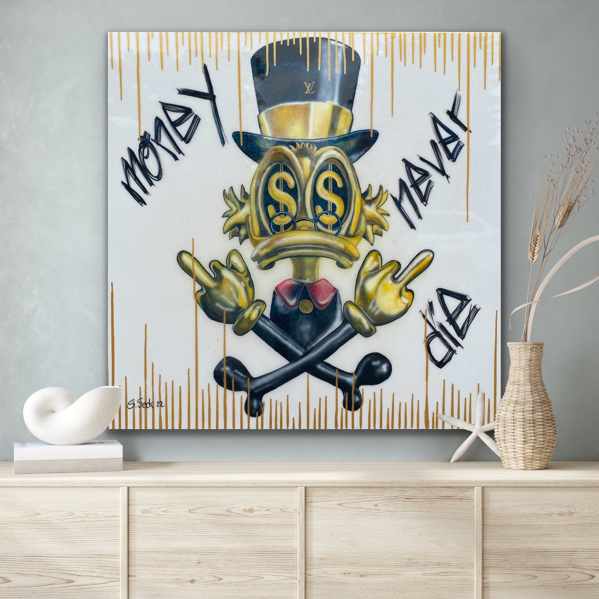 Das liebste der reichsten Ente aus Entenhausen war Geld. Er bewachte sein Vermögen mit allen Mitteln. Aber auch das letzte Hemd der beliebten Ente hat leider keine Taschen. Doch er wäre nicht die reichste Ente, wenn er nicht auch nach seinem Ableben die Dollarzeichen in den Augen hätte...:-)