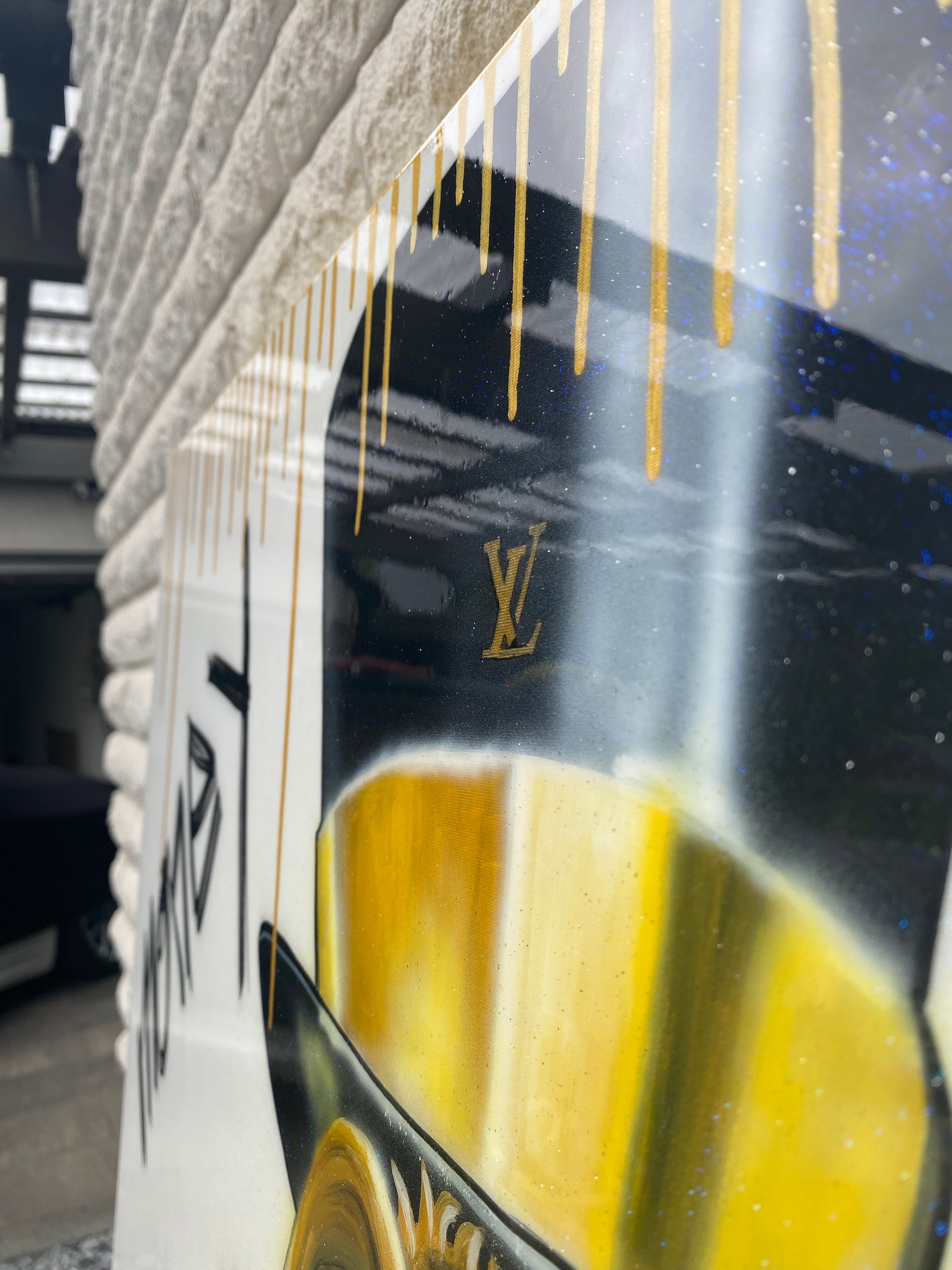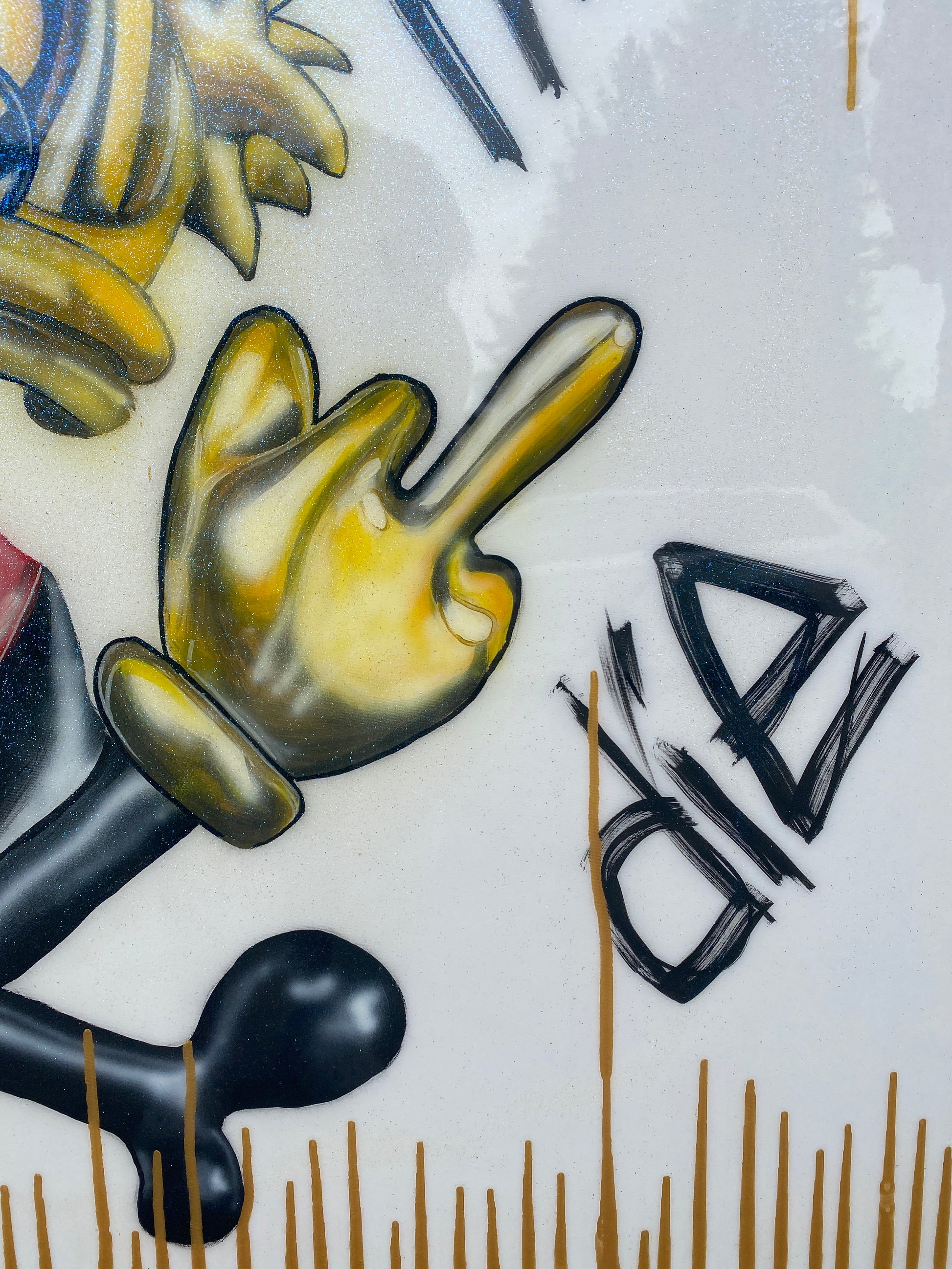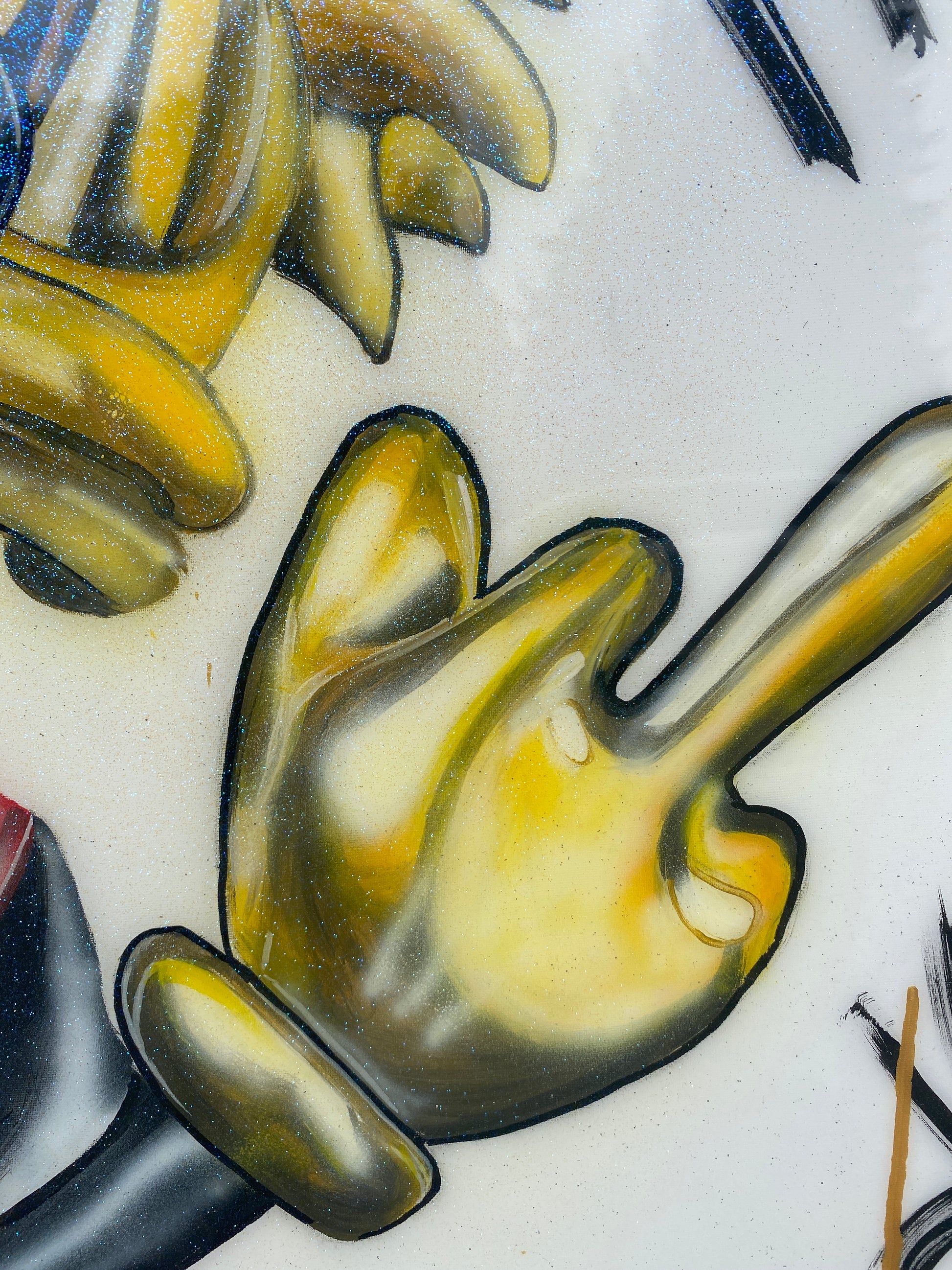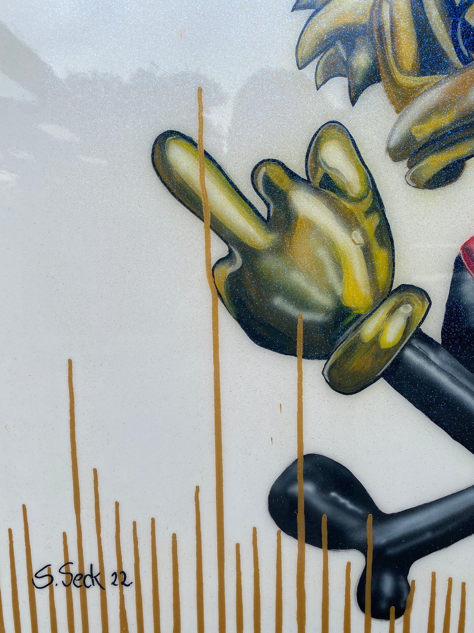 Das Werk wurde mit Acrylfarben in Verbindung mit Airbrush gemalt/gesprüht. Anschließend wurde es mit einer Epodex-Harzschicht überzogen. Diese Schicht hinterlässt einen wunderschönen, spiegelnden Glanz. Im Harz wurden Glitzerelemente eingearbeitet