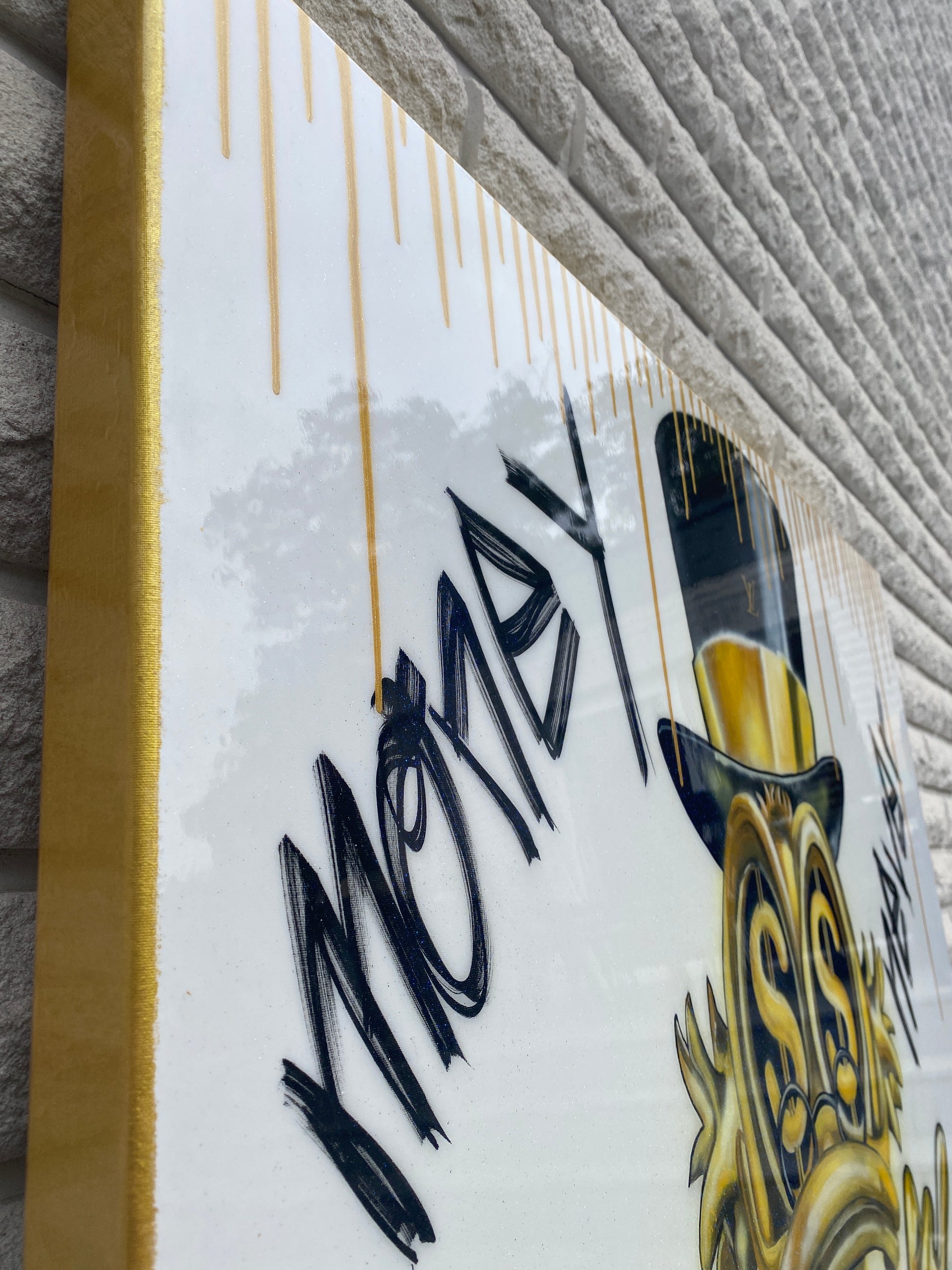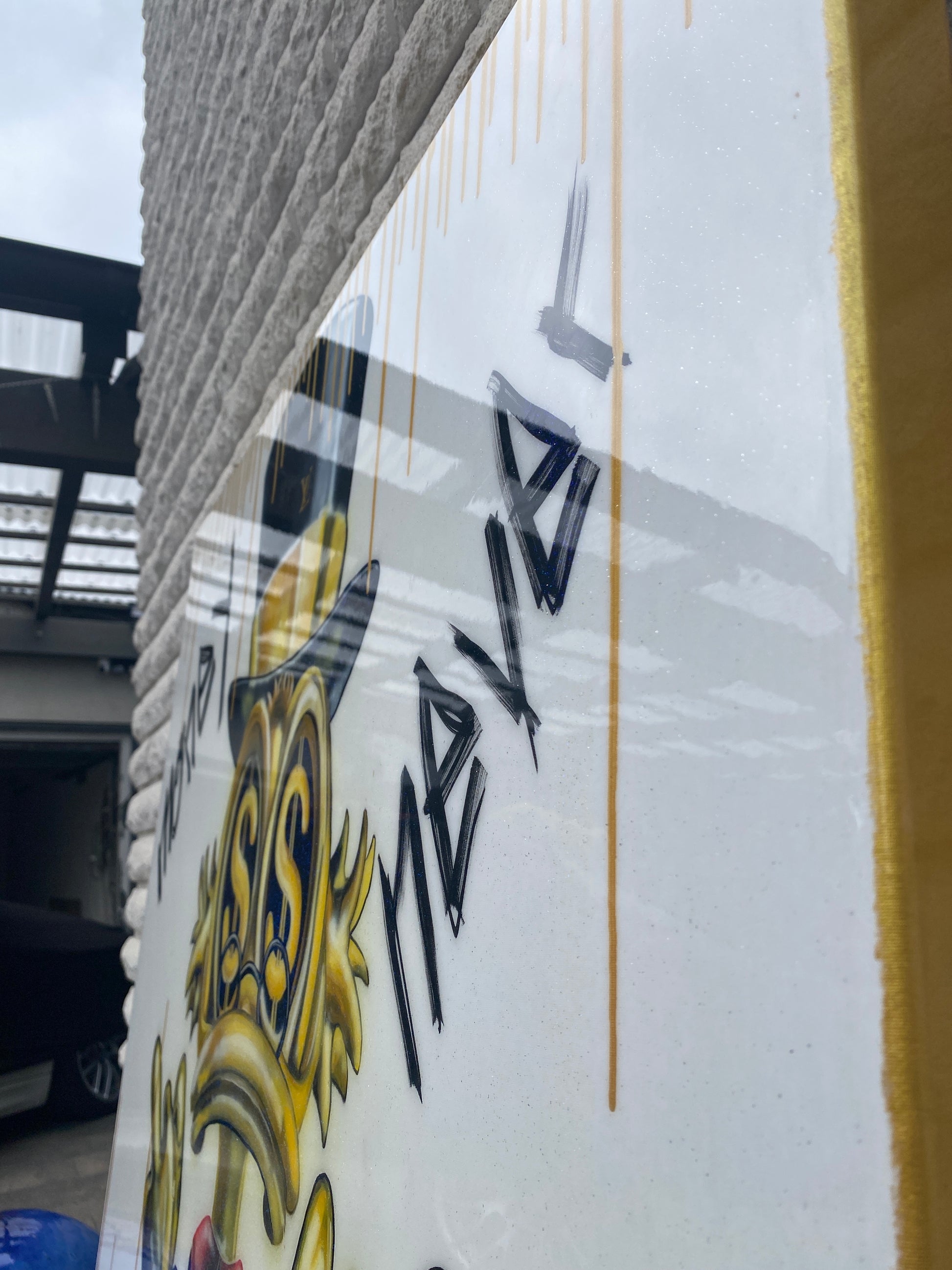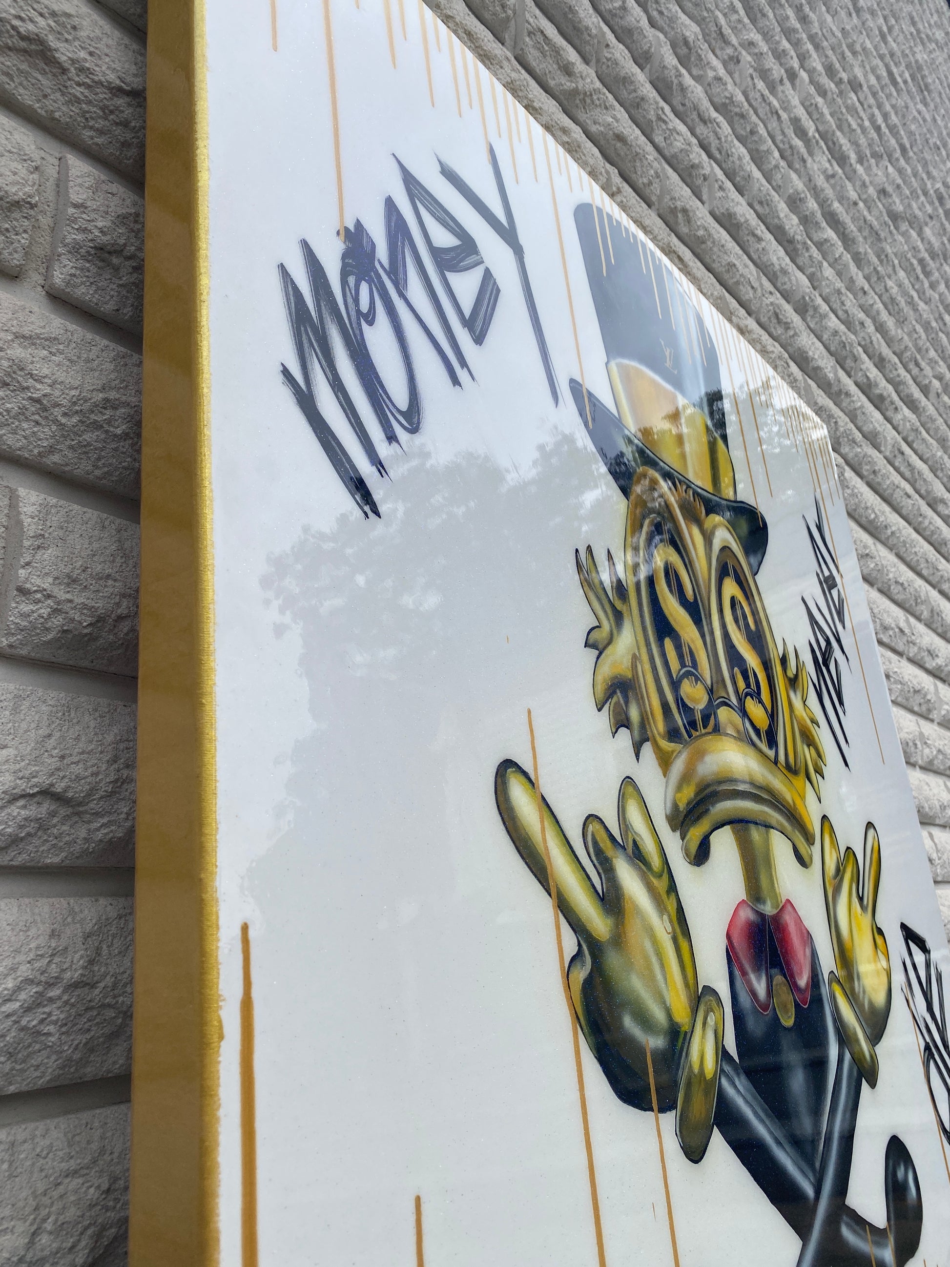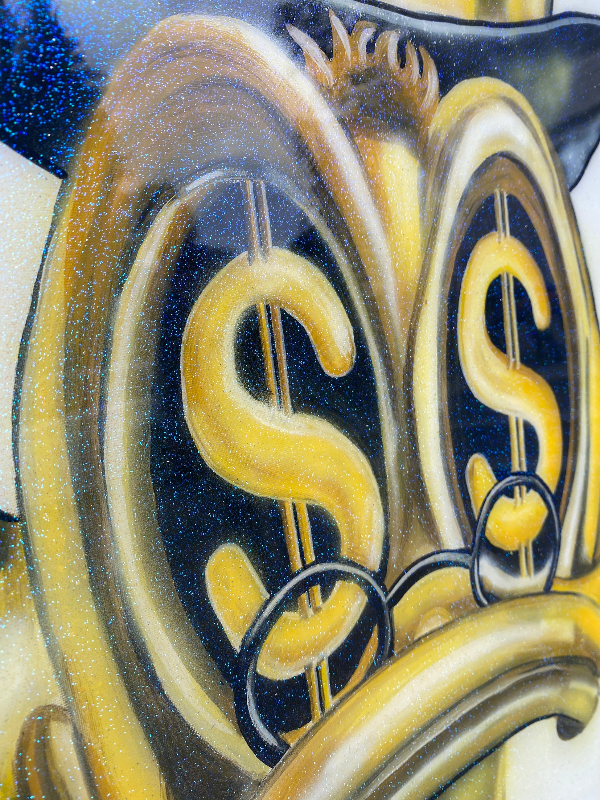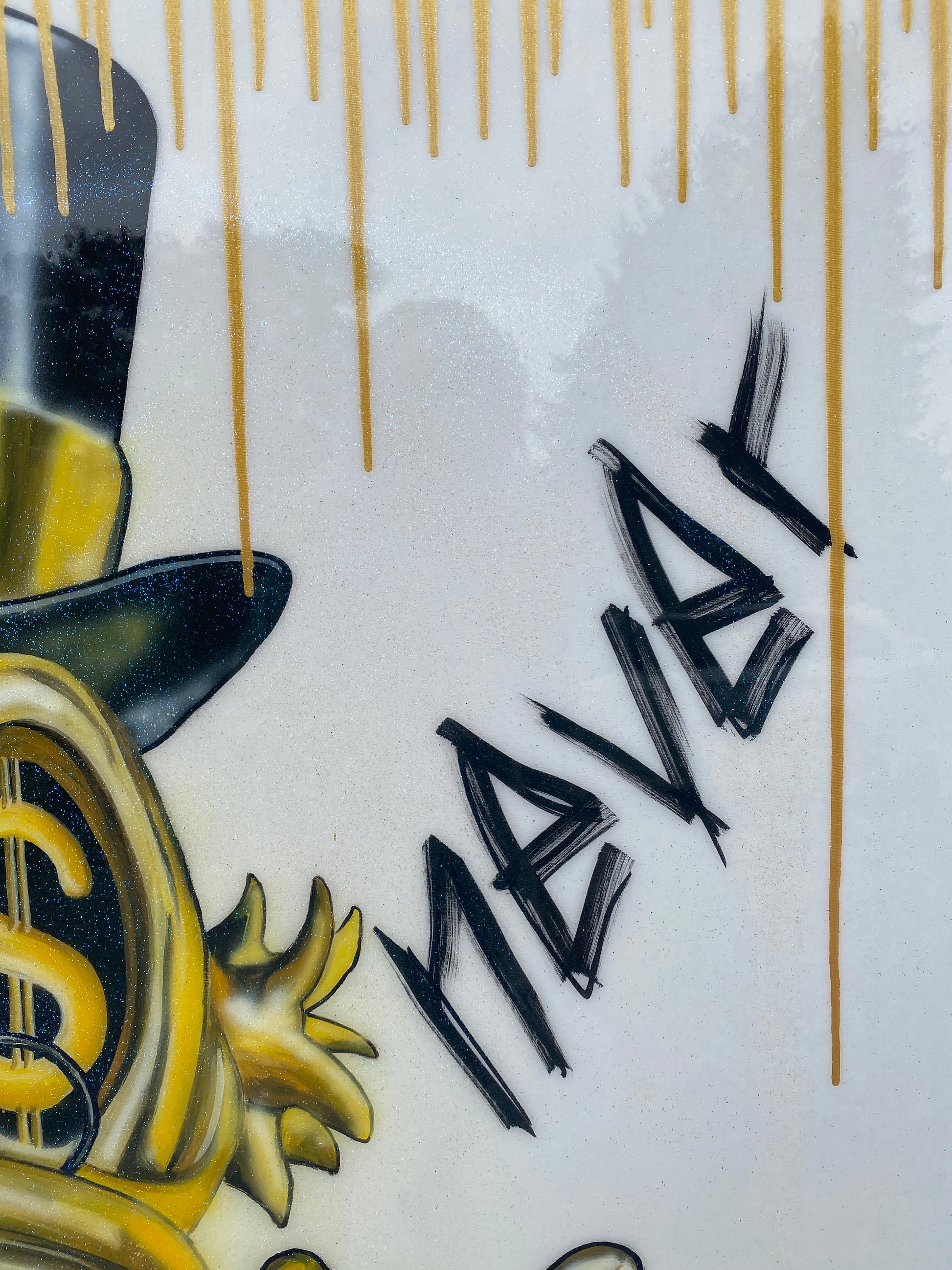 Das Werk wurde mit Acrylfarben in Verbindung mit Airbrush gemalt/gesprüht. Anschließend wurde es mit einer Epodex-Harzschicht überzogen. Diese Schicht hinterlässt einen wunderschönen, spiegelnden Glanz. Im Harz wurden Glitzerelemente eingearbeitet