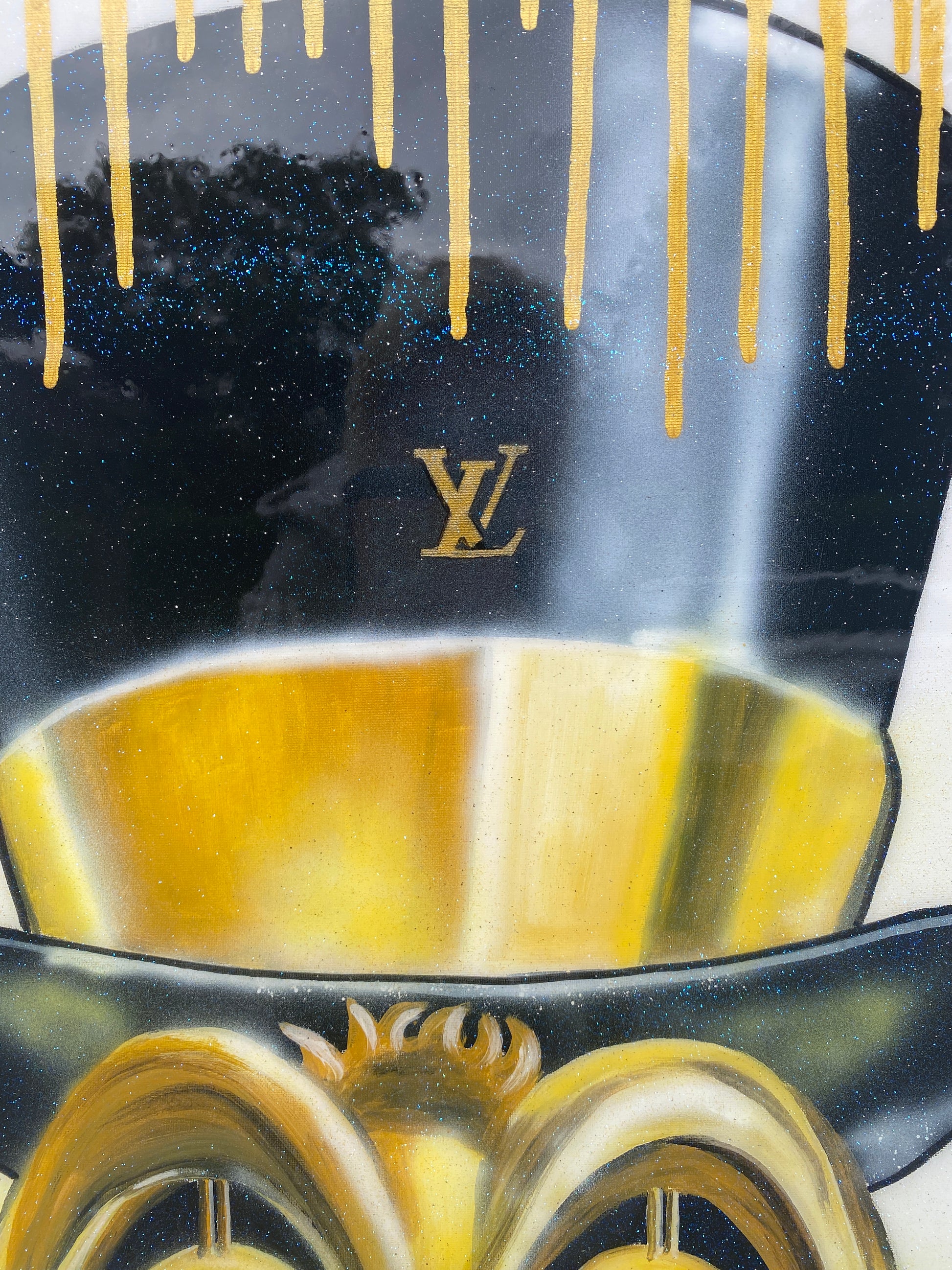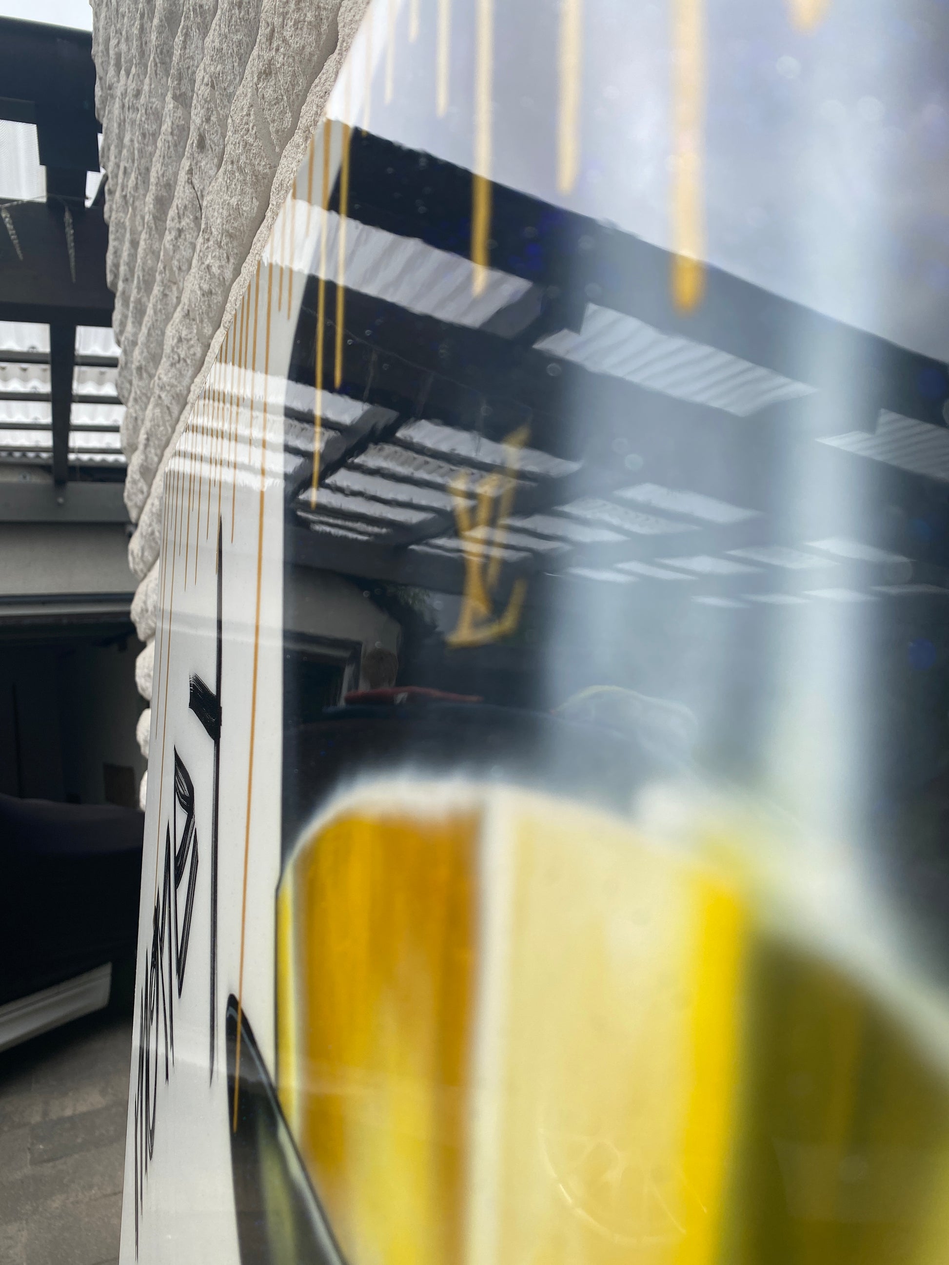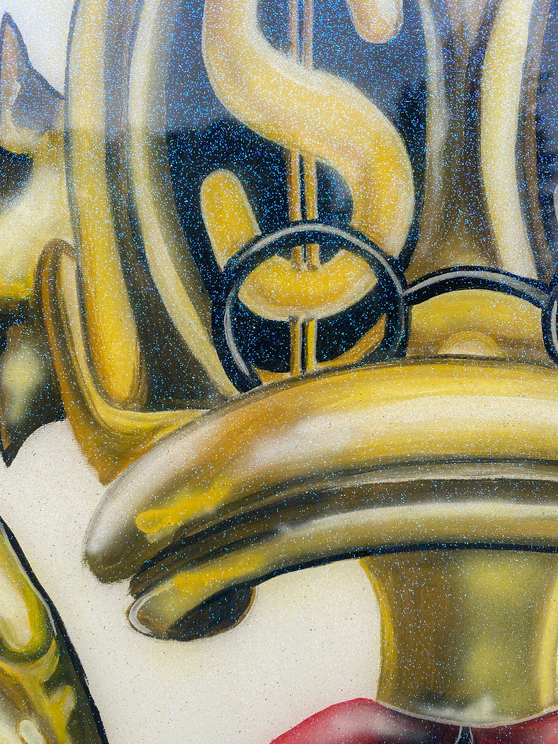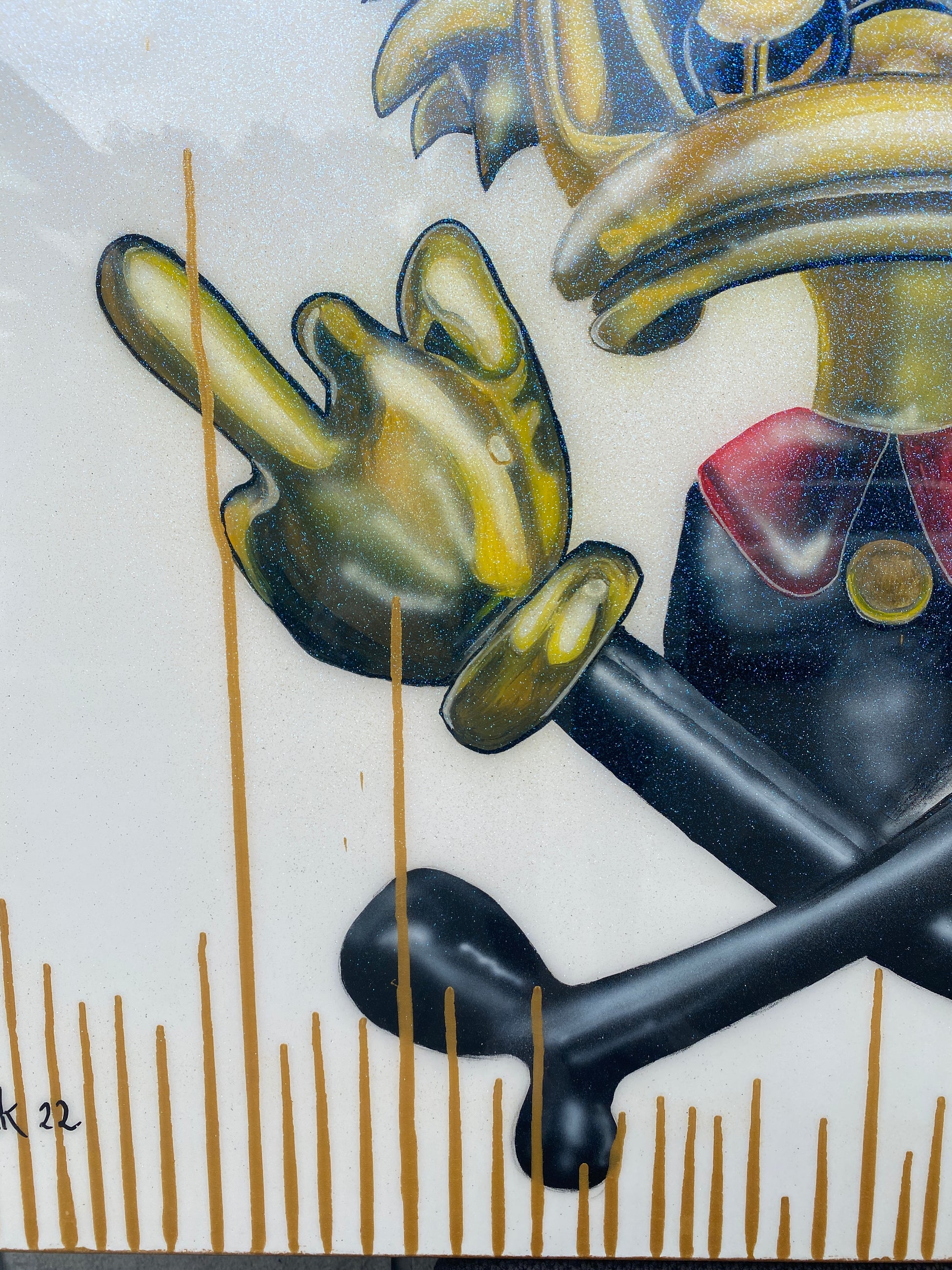 Das Werk wurde mit Acrylfarben in Verbindung mit Airbrush gemalt/gesprüht. Anschließend wurde es mit einer Epodex-Harzschicht überzogen. Diese Schicht hinterlässt einen wunderschönen, spiegelnden Glanz. Im Harz wurden Glitzerelemente eingearbeitet