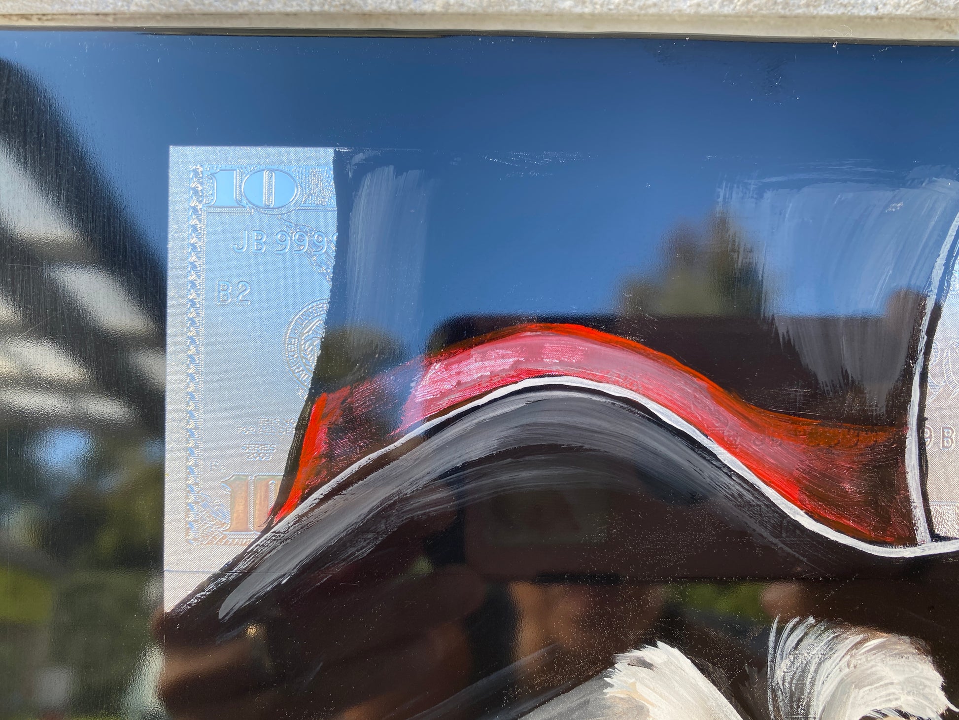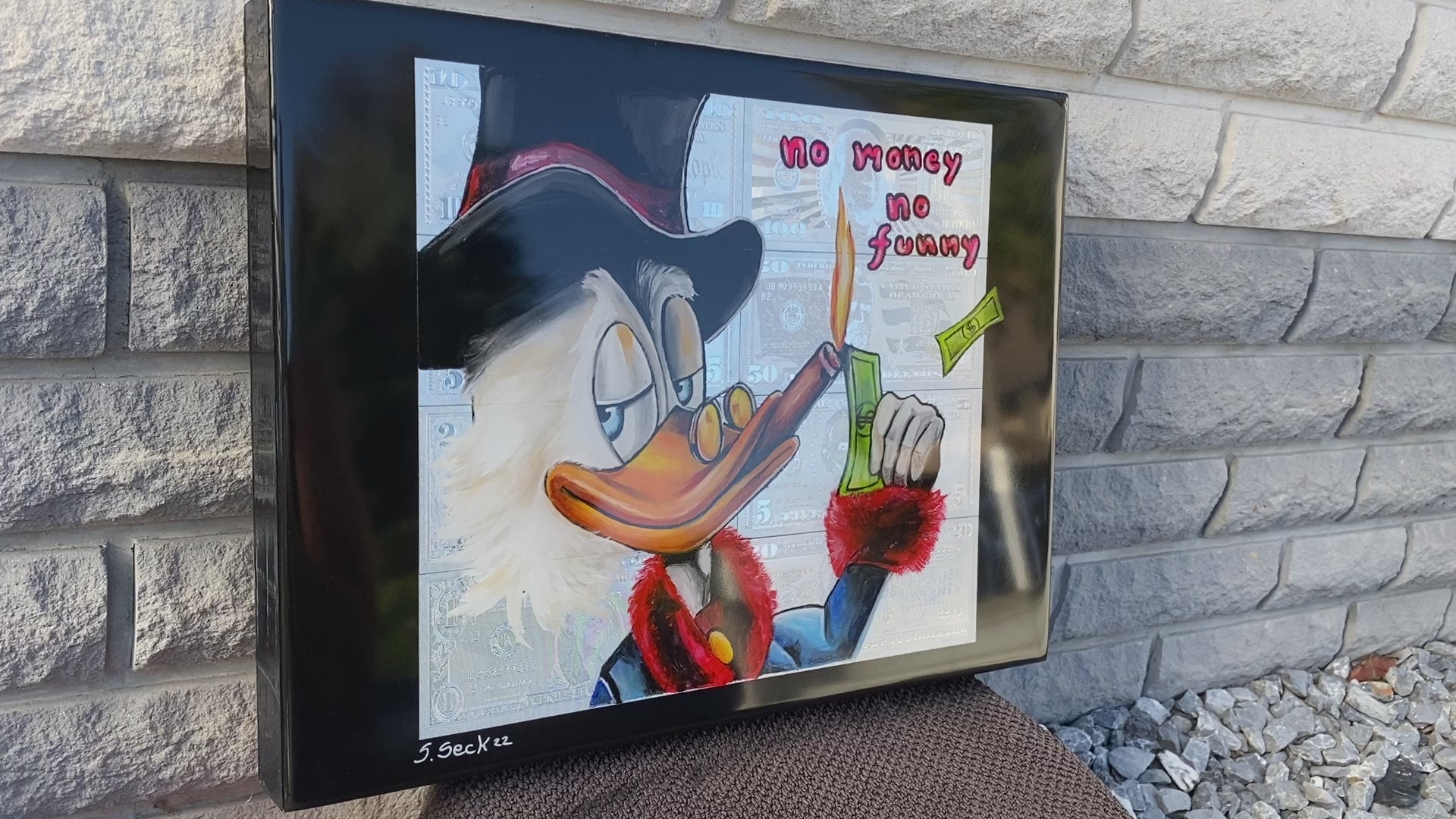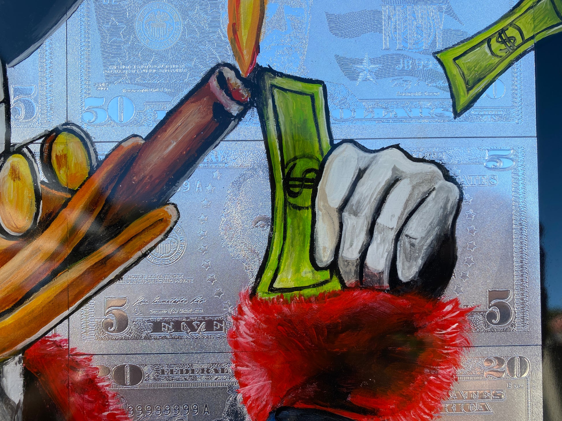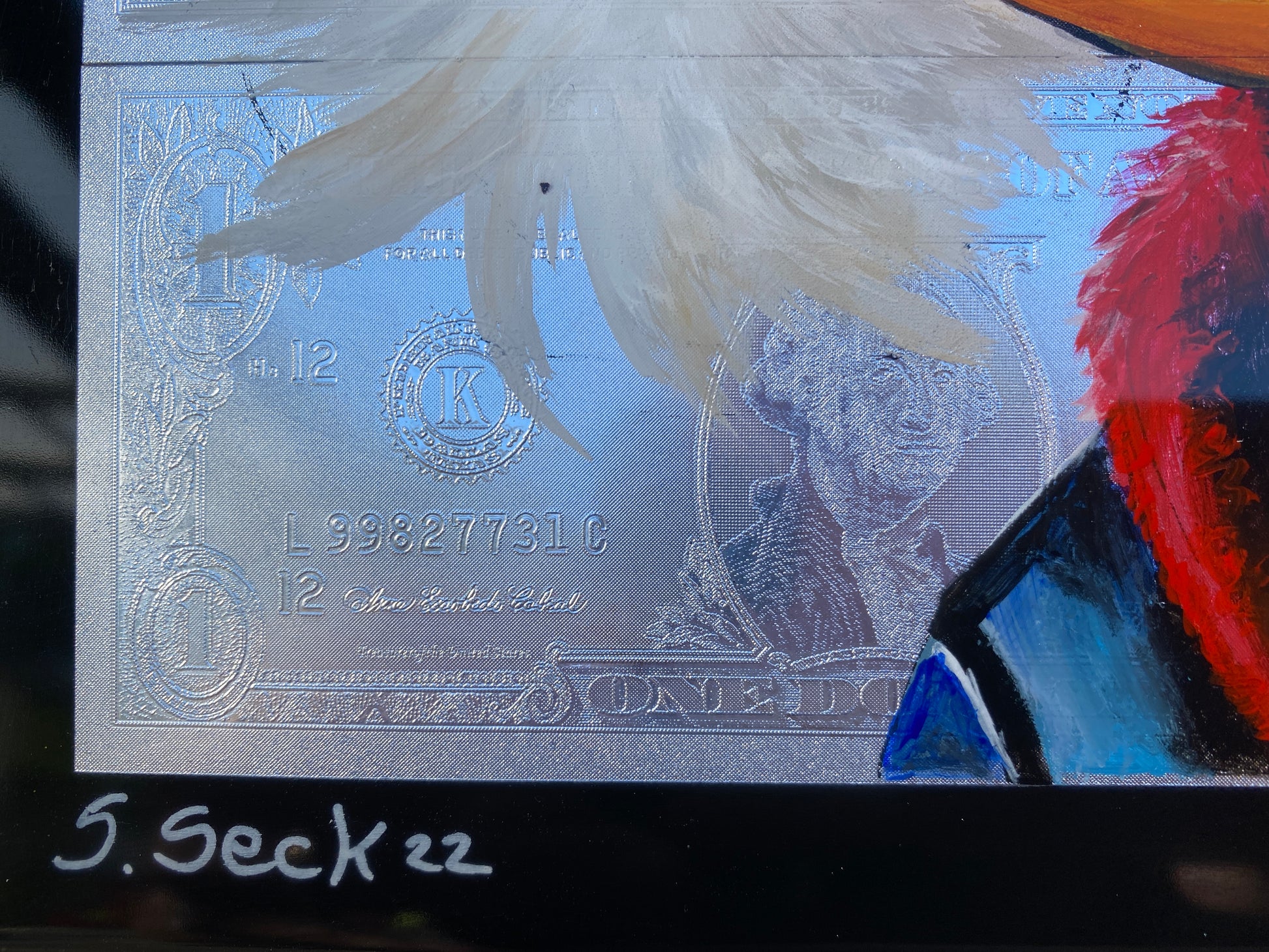 Dieses Werk wurde auf eine Holzleinwand gemalt. Der Hintergrund ist neben dem schwarz mit silbernen Dollarscheinen versehen, die je nach Lichteinfall schimmern.