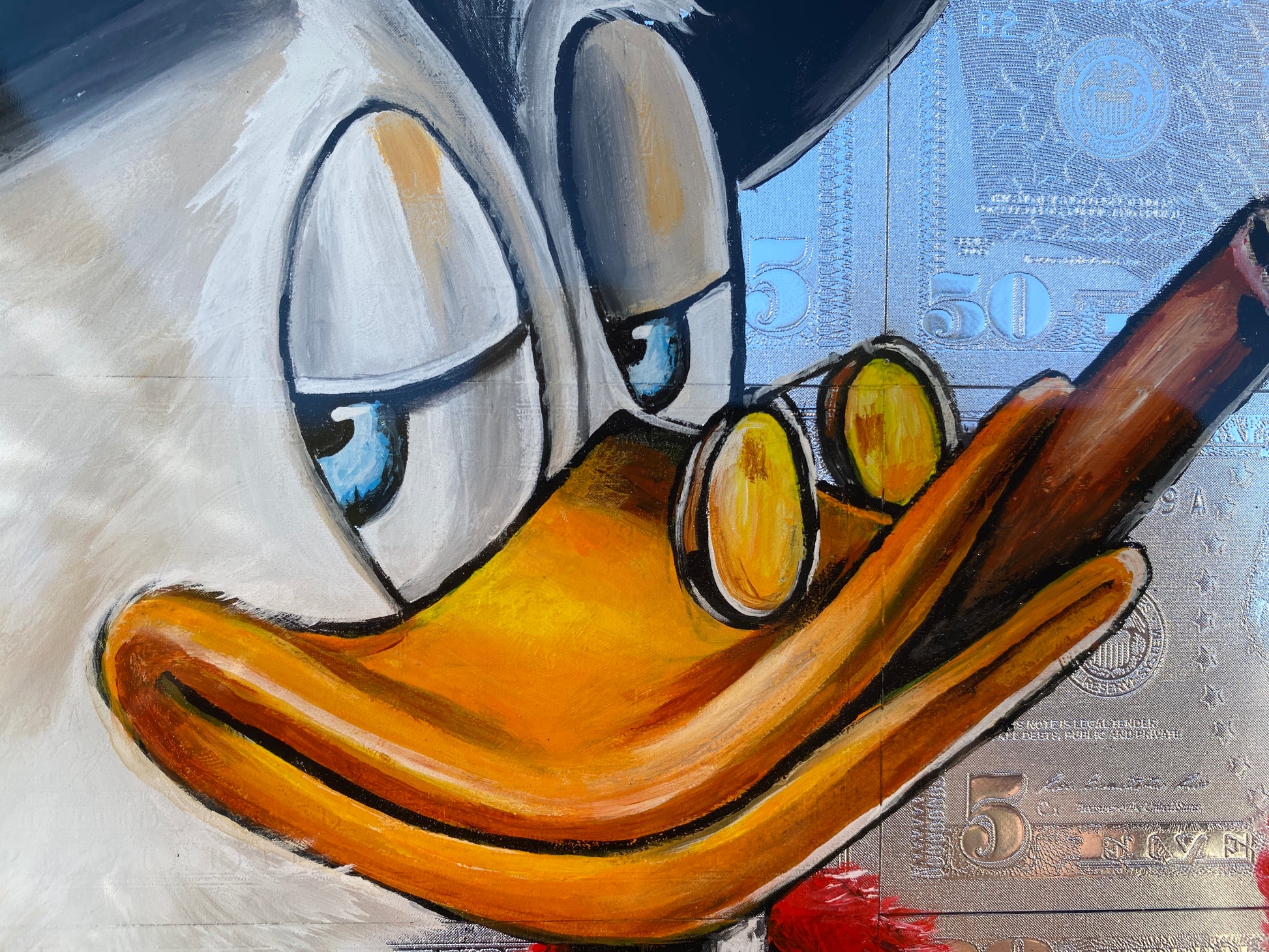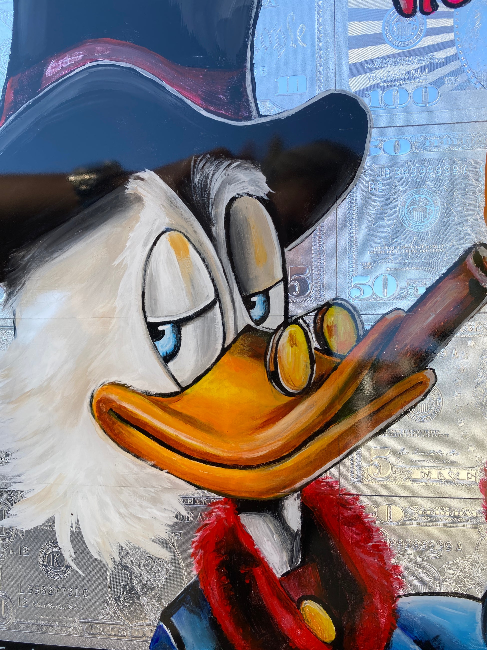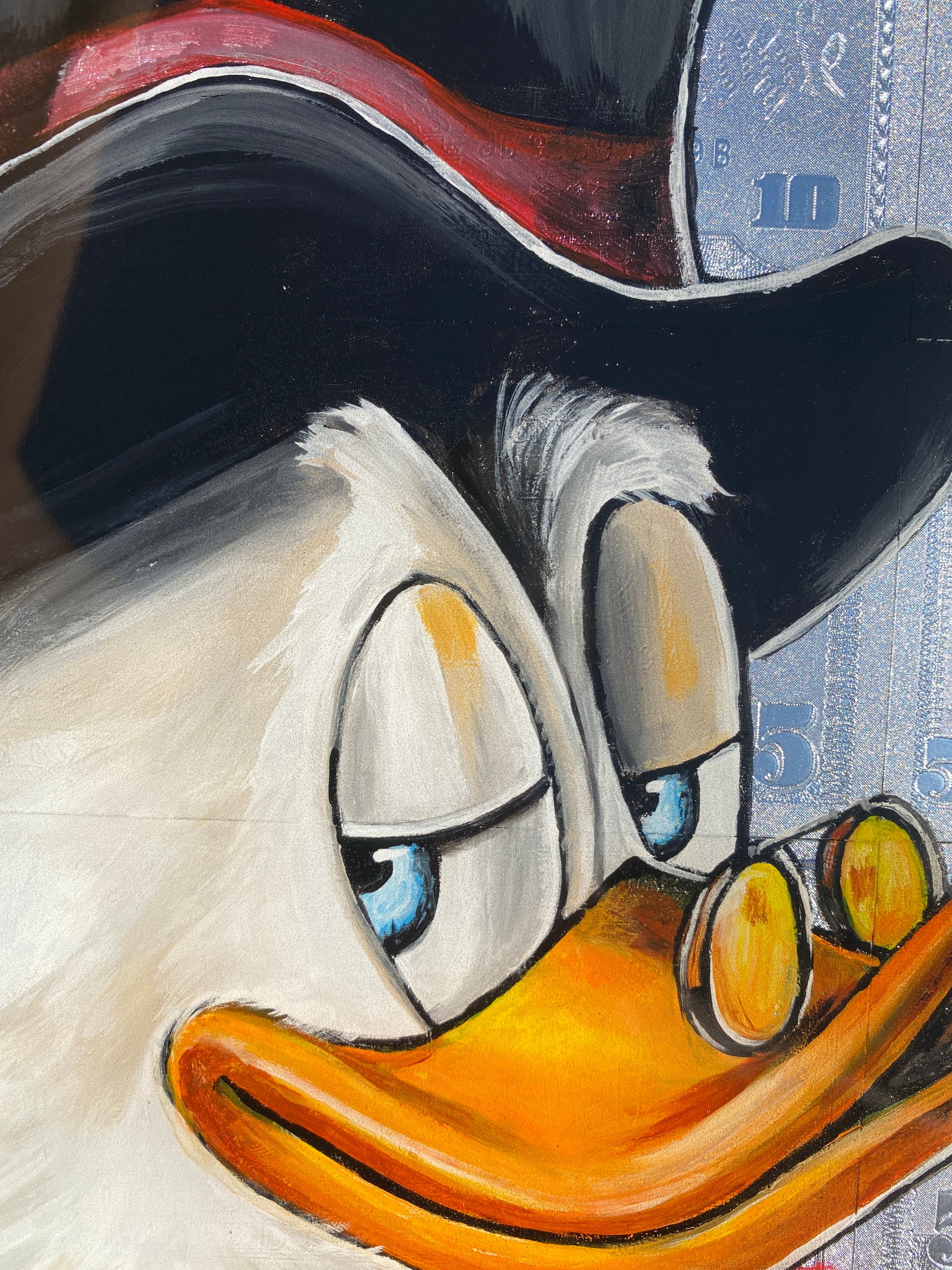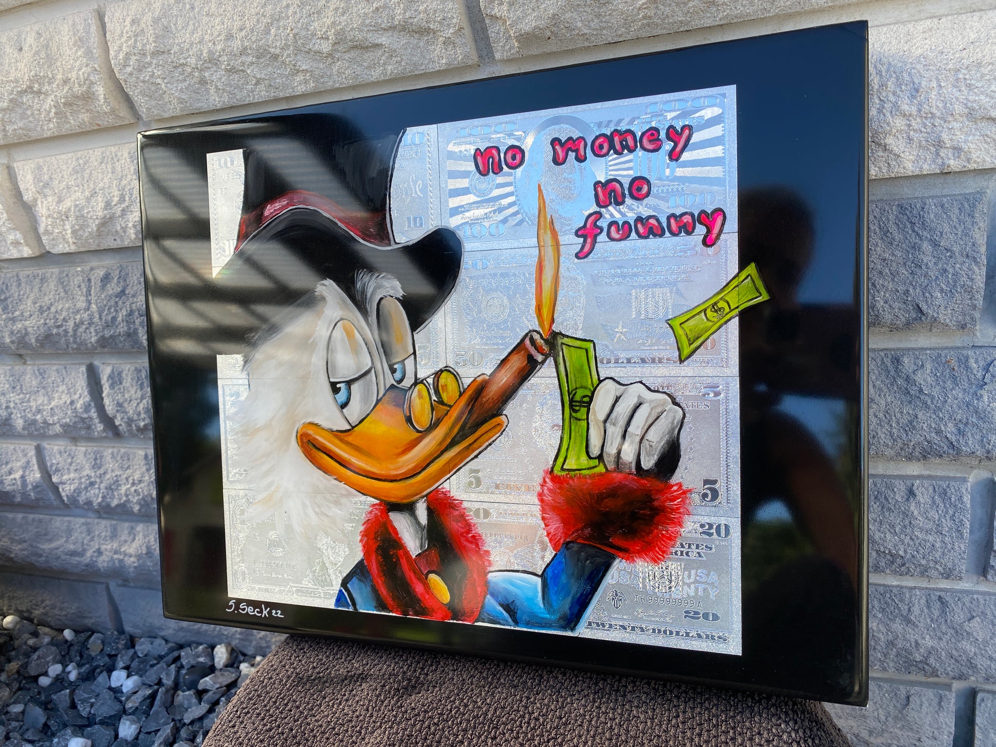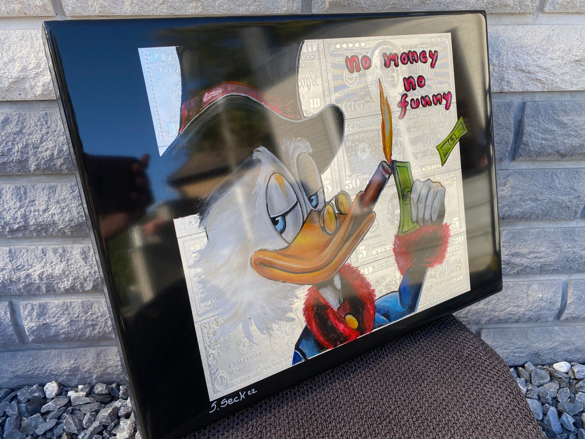 Dieses Werk wurde auf eine Holzleinwand gemalt. Der Hintergrund ist neben dem schwarz mit silbernen Dollarscheinen versehen, die je nach Lichteinfall schimmern.
